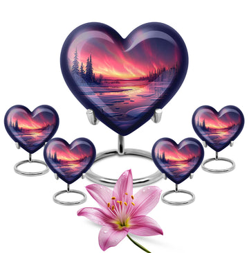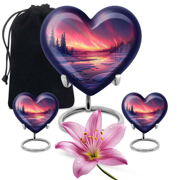 Preserve the memory of your loved ones with the large AURORA Urn, an abstractly themed, heart-shaped memorial urn beautifully created for an adult male. Standing at 10 inches in height and weighing a sturdy 3.3 pounds, it comes in a medium size and can contain up to 200 cubic inches of ashes. Constructed from durable aluminium material, it’s not just an urn, but a lifelong companion—symbolizing love and remembrance. Make it even more personal by adding engraved names, making it a unique touchstone that mirrors your sentiment. Every AURORA Urn comes impeccably packed in a velvet pouch, ensuring thoughtful containment of cremation remains. Thanks to its size, it's also an ideal choice as one of the companion cremation urns for 2 adults. Our AURORA Urns are also search-friendly for those seeking 'funeral medium size urns for human ashes' or 'urns for human ashes adult'.