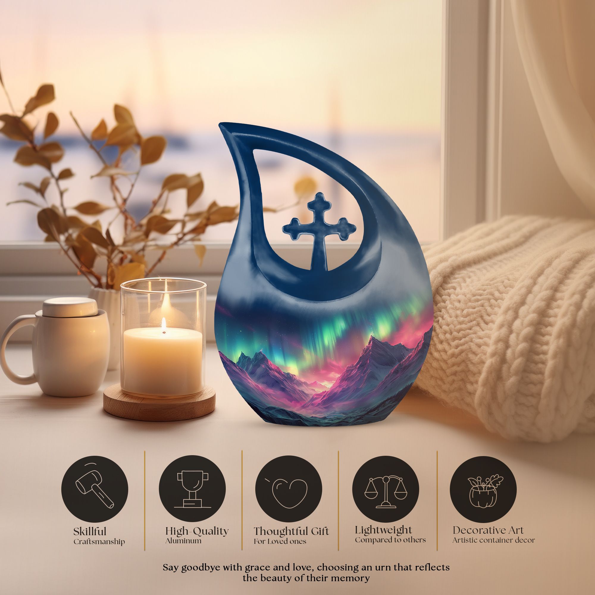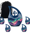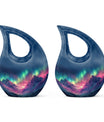 Immortalize the memory of your loved ones with the Arora Borealis Urn, a captivating and sublime choice from our collection of Personalized Urns For Ashes. Exquisitely crafted from sturdy aluminium, this large urn stands at 10 inches in height, weighing 3.3 pounds, and a size capable of holding up to 200 cubic inches of ashes. Its dramatic Cross Drop pattern distinctively reflects your tribute, echoing unique serenity. Inside the package, you'll find a velvety pouch to securely contain the ashes. We offer customization – make this memorial urn even more special by personalizing it with engraved names. Explore more options from our range, including Garden Urns For Ashes, Affordable Urns, Cremation Boxes, and Medium Urns. Thoughtful, encompassing, reverent – a respectful tribute to the departed.
