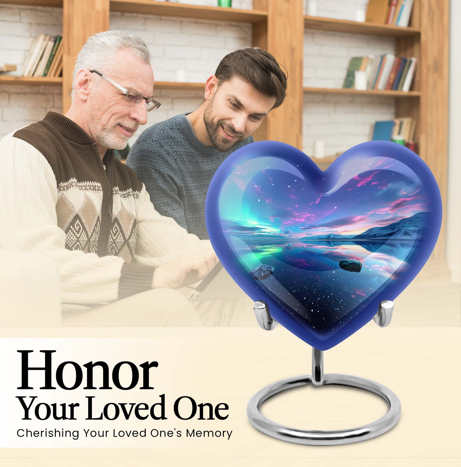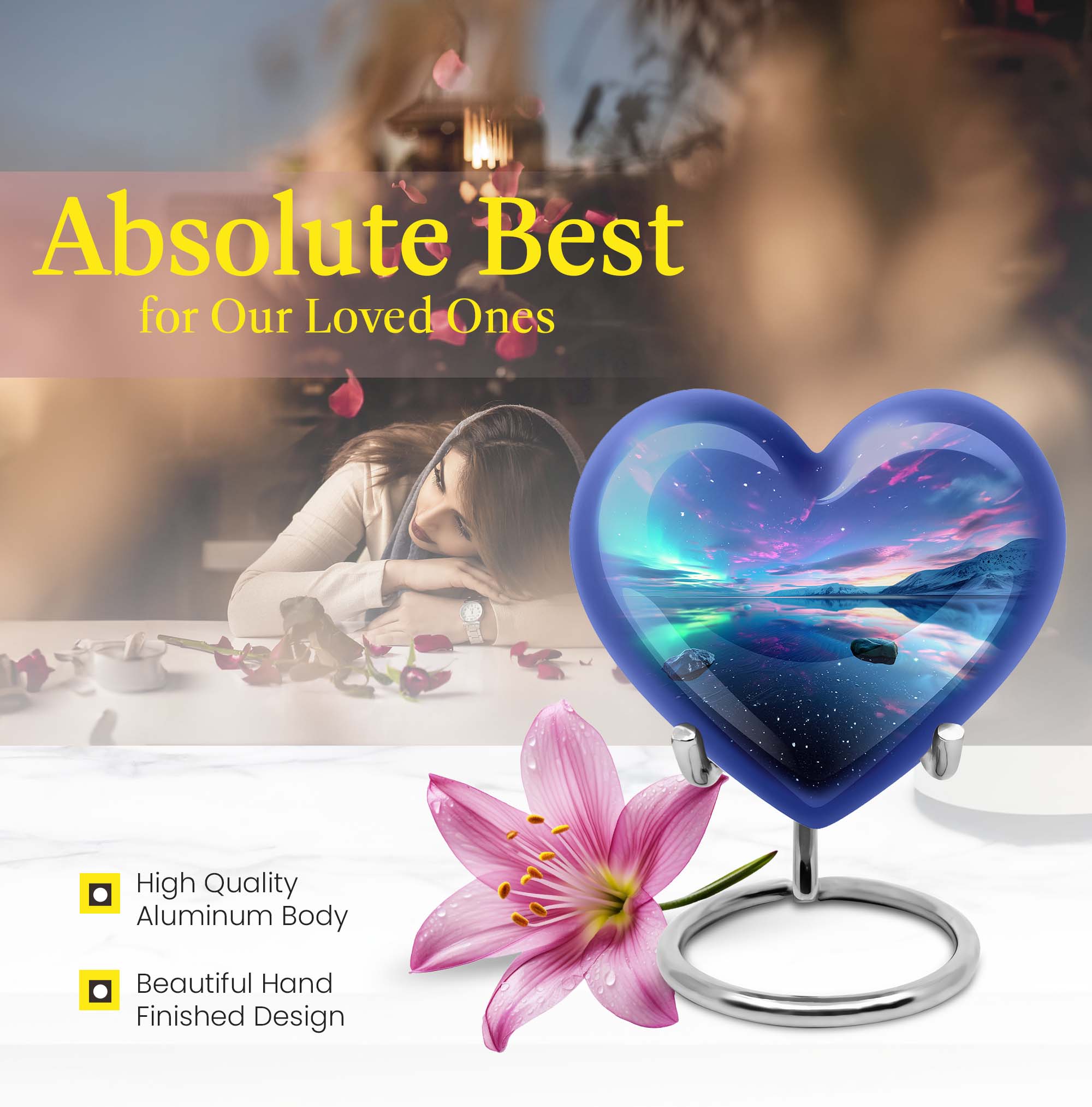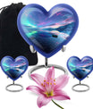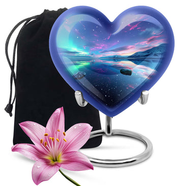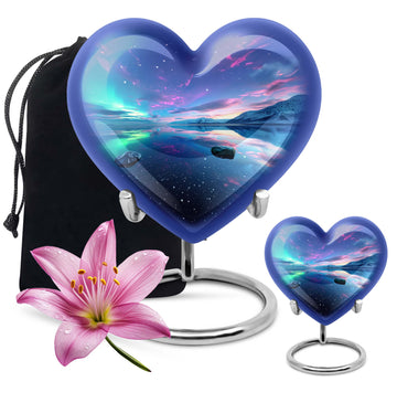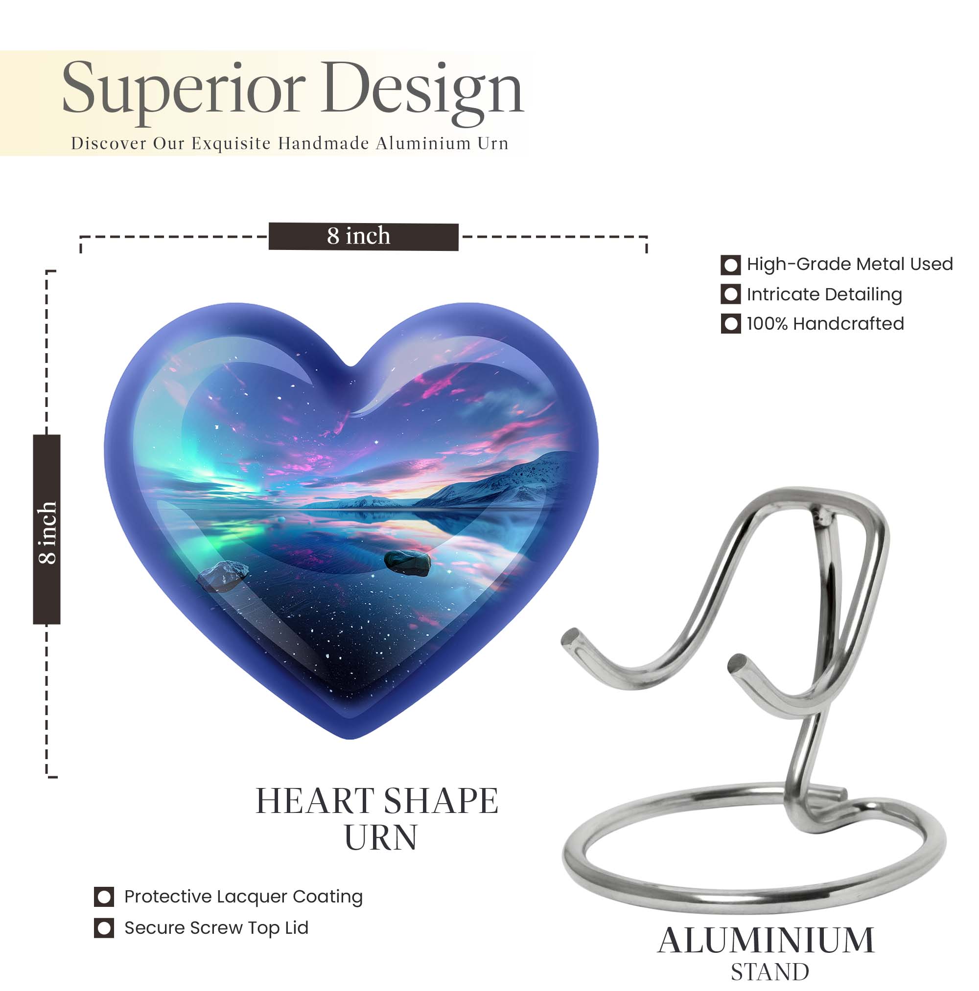 Pay your respects while keeping memories alive with this Aurora Borealis Heart Urn, an exquisite memorial urn carefully sized to a height of 10 inches with a weight of approximately 3.3 pounds. Constructed from durable aluminium, this cremation urn for ashes holds a generous 200 cubic inches capacity and is suitable for benignly holding ashes. Adorned with the timeless theme of a butterfly, the urn embodies a sense of peace and a promise of everlasting beauty. Each purchase includes a velvet pouch as an additional containment option for the stored ashes. As well as its principal use, this large urn can also serve as an elegant decorative piece in your living space. For an added personalized touch, you have the option to engrave names on the urn. This multi-purpose urn also boasts a unique feature which allows for the insertion of a photo frame, enriching your urn-worship experience. Celebrate your loved ones with this burial urn for cremation— a tasteful tribute and a testament of undying love.