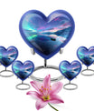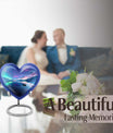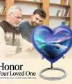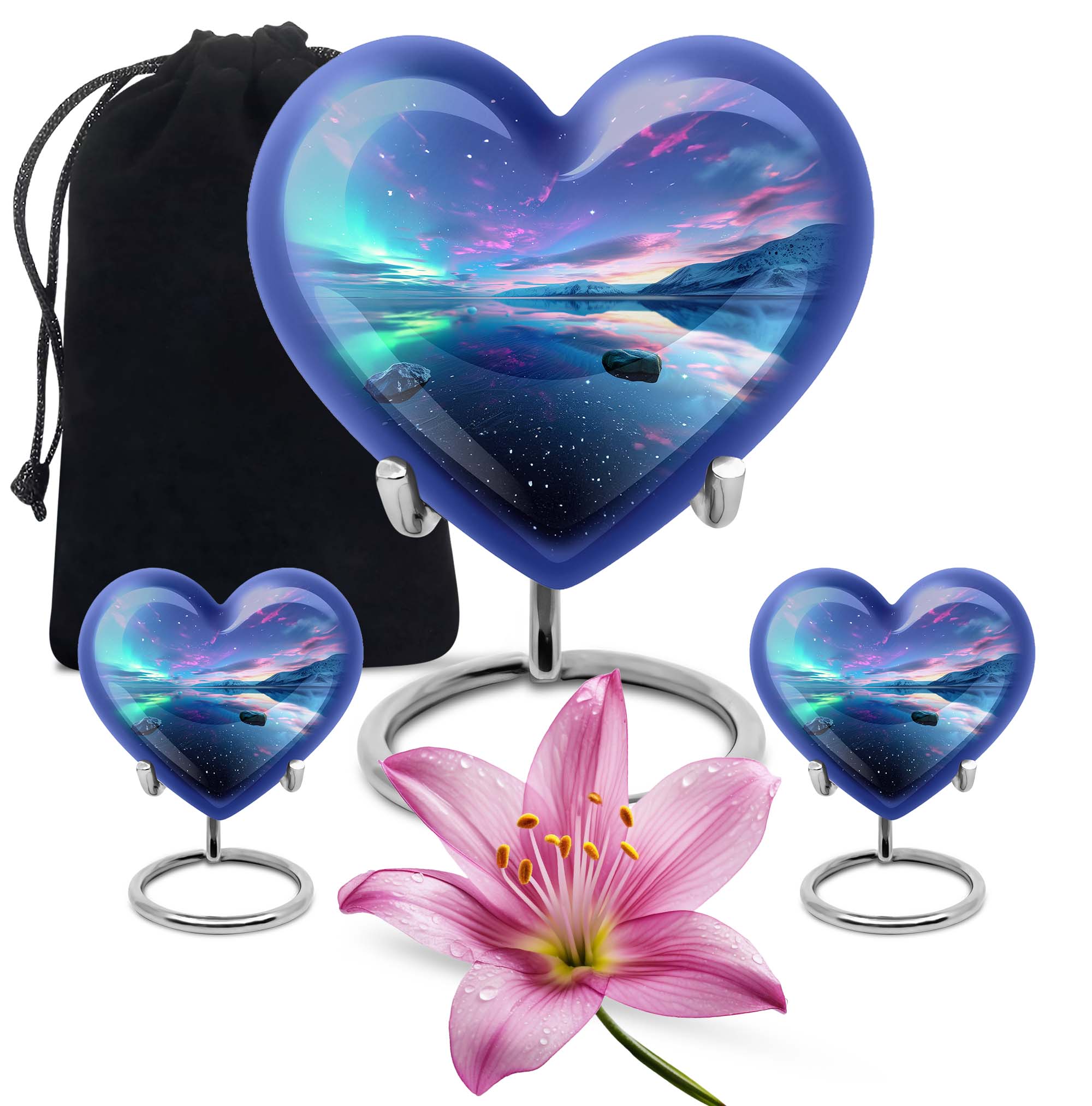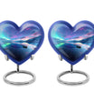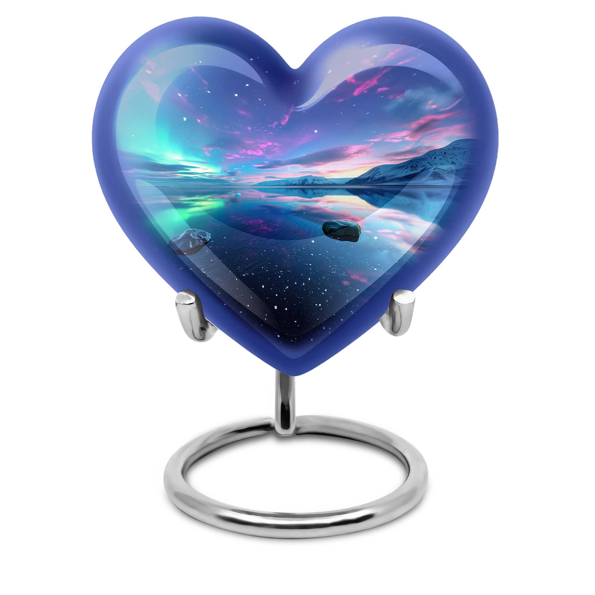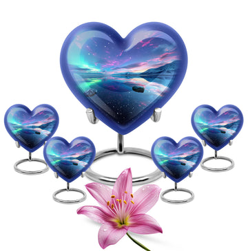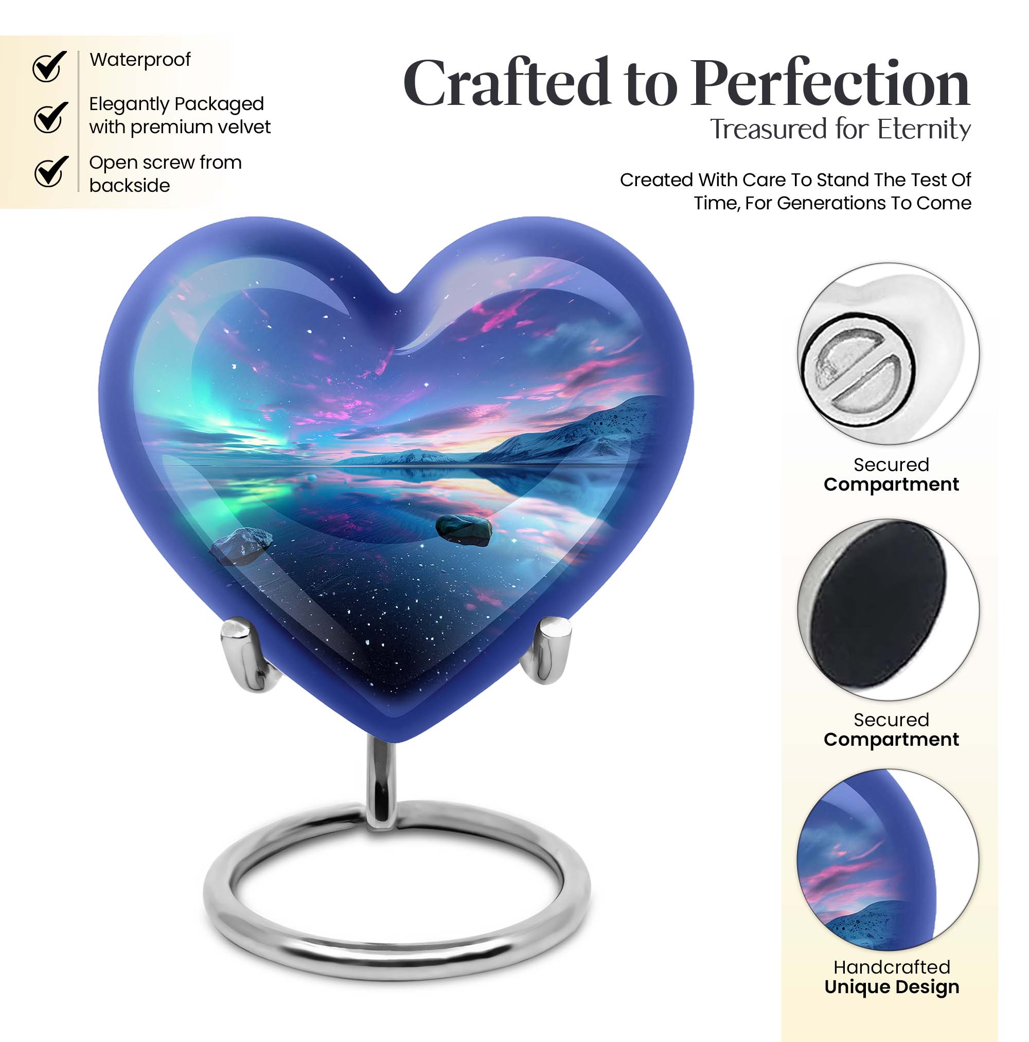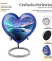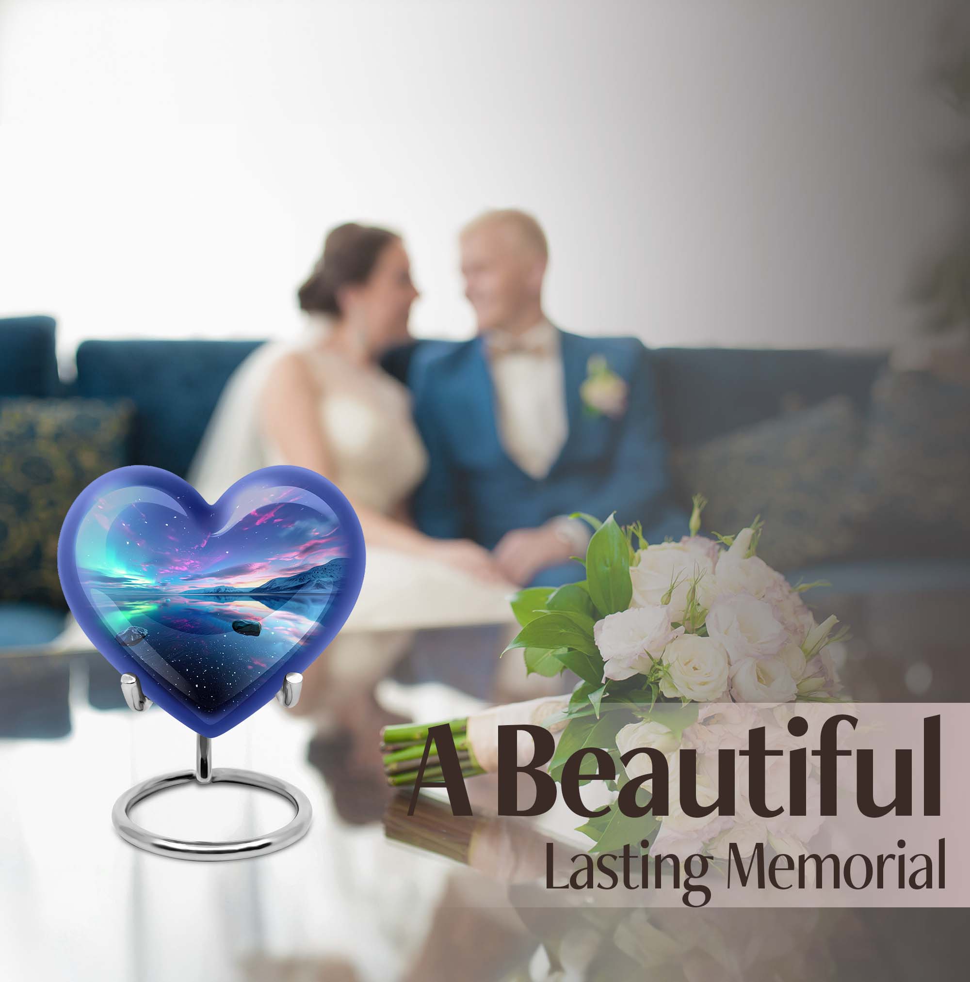 Pay your respects while keeping memories alive with this Aurora Borealis Heart Urn, an exquisite memorial urn carefully sized to a height of 10 inches with a weight of approximately 3.3 pounds. Constructed from durable aluminium, this cremation urn for ashes holds a generous 200 cubic inches capacity and is suitable for benignly holding ashes. Adorned with the timeless theme of a butterfly, the urn embodies a sense of peace and a promise of everlasting beauty. Each purchase includes a velvet pouch as an additional containment option for the stored ashes. As well as its principal use, this large urn can also serve as an elegant decorative piece in your living space. For an added personalized touch, you have the option to engrave names on the urn. This multi-purpose urn also boasts a unique feature which allows for the insertion of a photo frame, enriching your urn-worship experience. Celebrate your loved ones with this burial urn for cremation— a tasteful tribute and a testament of undying love.