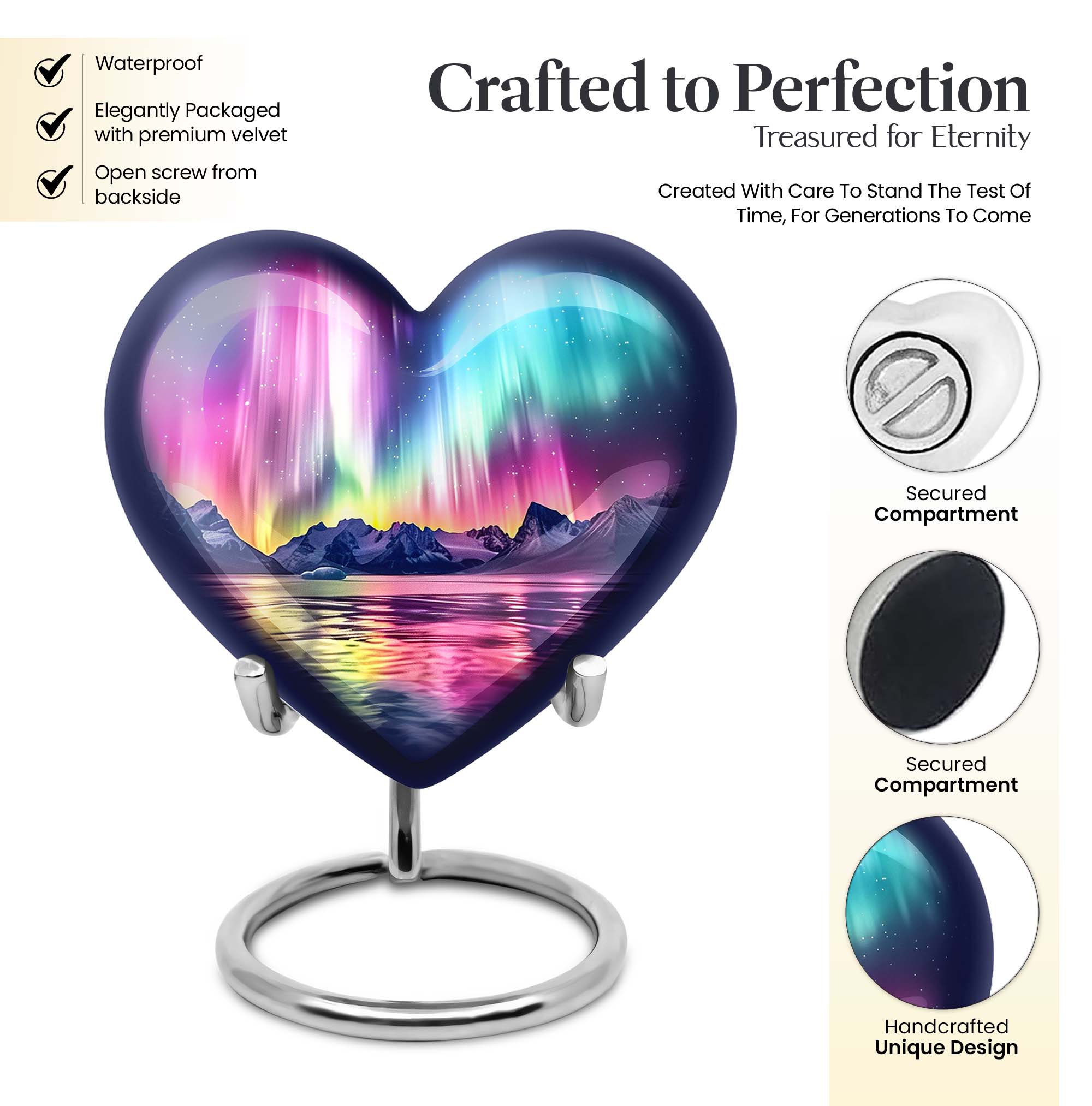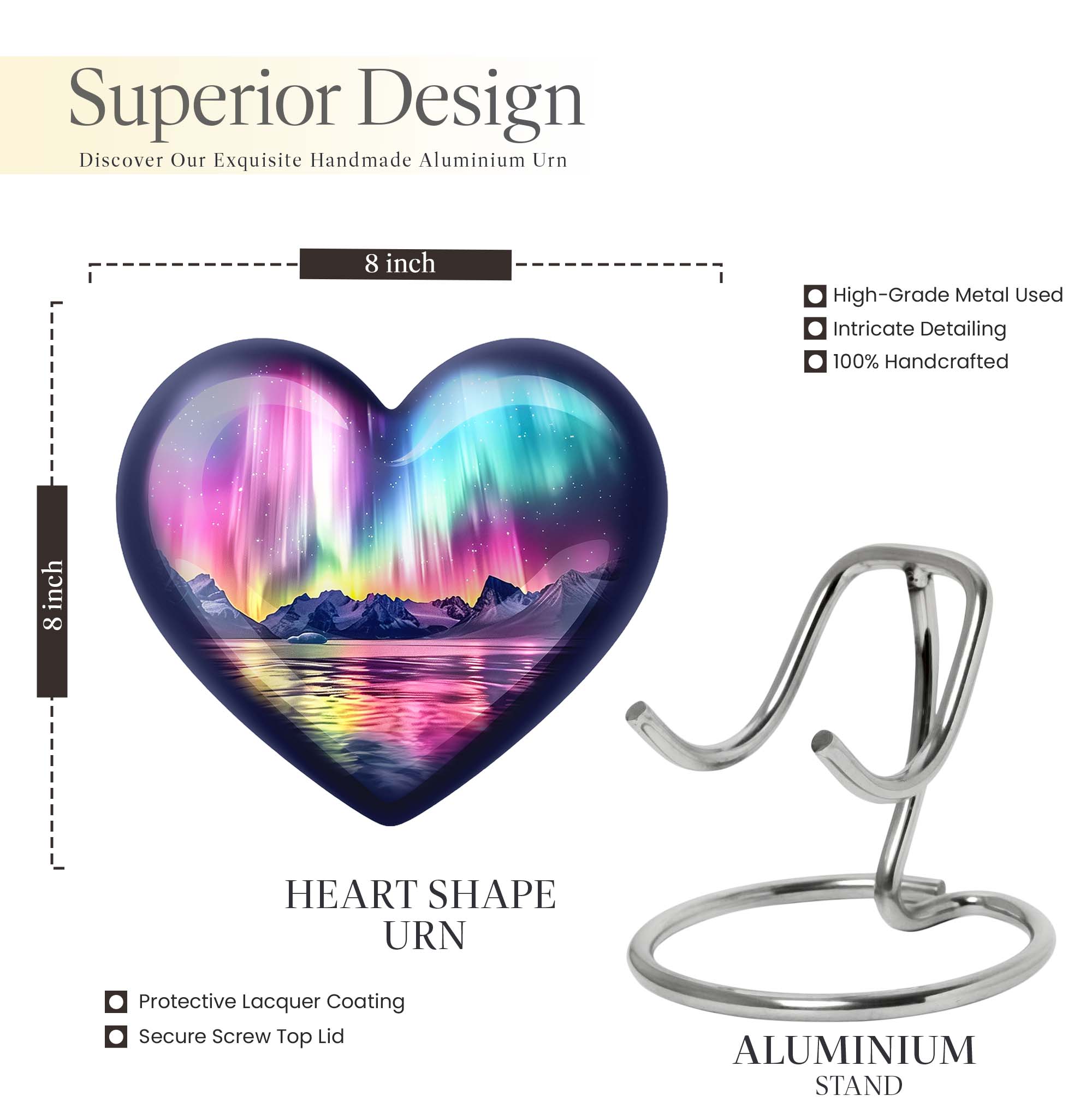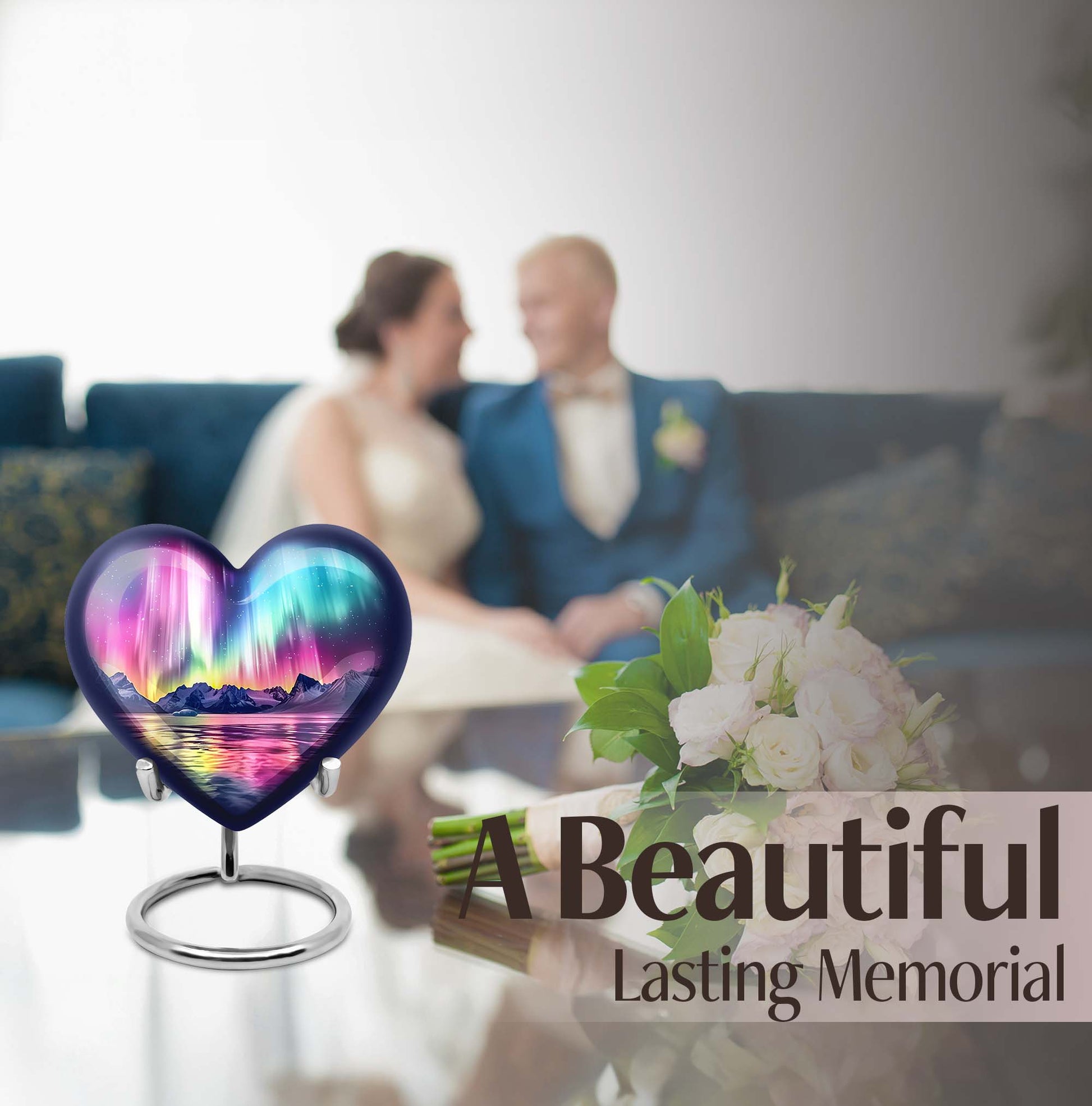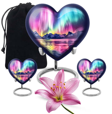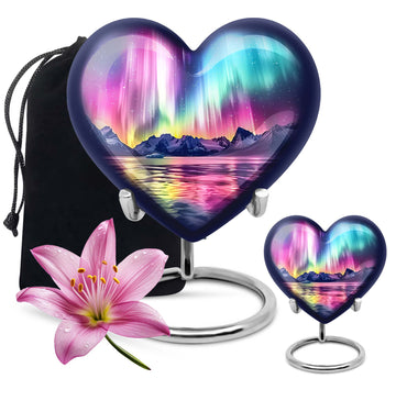 Honor and commemorate your cherished ones with the exquisite AURORA urn, an ideal choice for burial ashes Urns. Boasting an impressive size of 10 inches and a weight of 3.3 pounds, this cremation urn precisely leverages an abstract theme to pay tribute to your beloved in a dignified and respectful way. It’s meticulously crafted from high-quality aluminum, ensuring a balanced mix of durability and elegance. Built to hold up to 200 cubic inches, this spacious urn can comfortably accommodate adult-sized ashes. It further comes with a soft velvet pouch, safeguarding the precious specks of your loved ones. To add an intimate touch, this urn for humans presents you the option to personalize it with engraved names. It delights with an exceptional 'Heart Urn' design but stays versatile enough to blend with various memorials and observances. Elevate your memorial ceremony with this sophisticated urn, uniquely designed for those in search of cremation funeral urns, urns for cremation ashes, and large urns for human ashes.