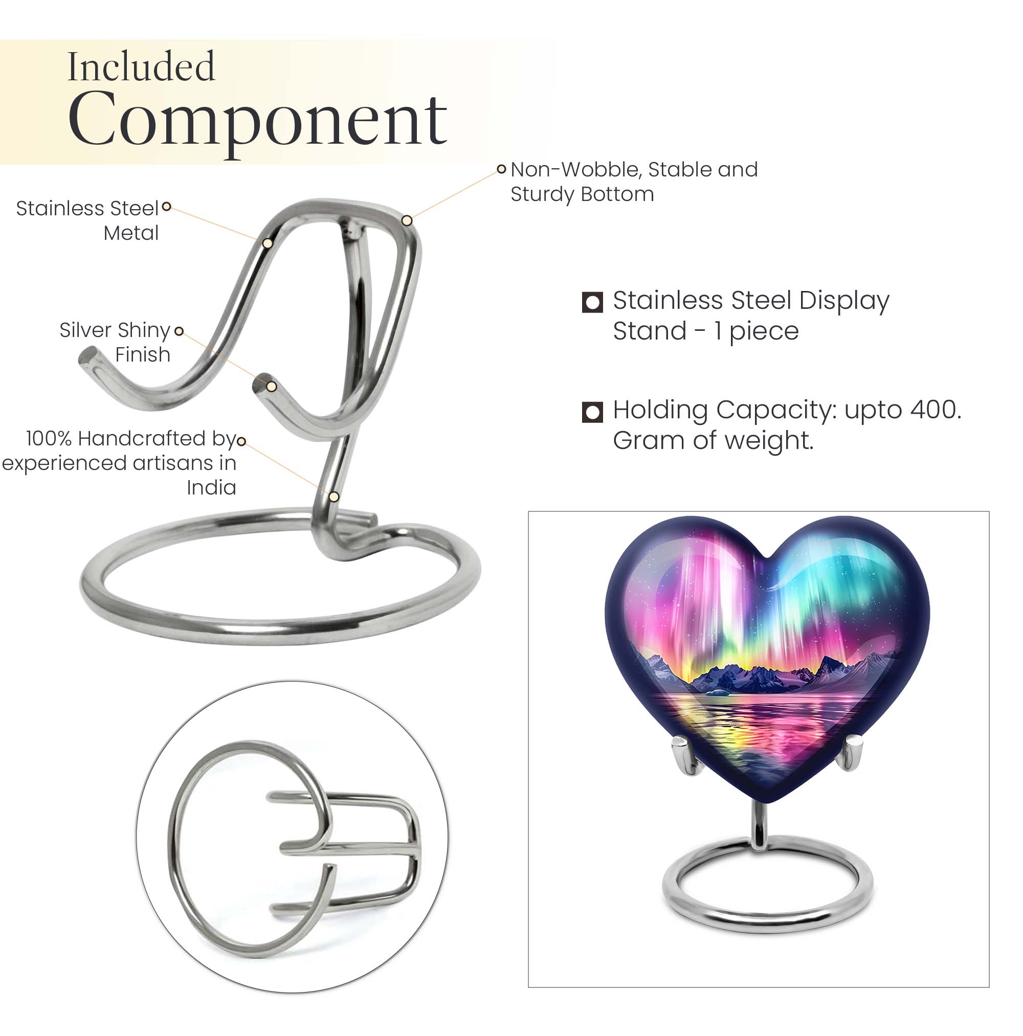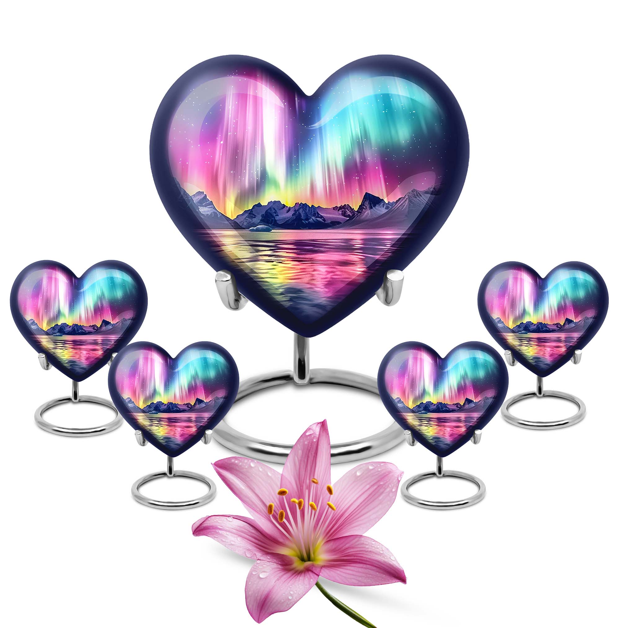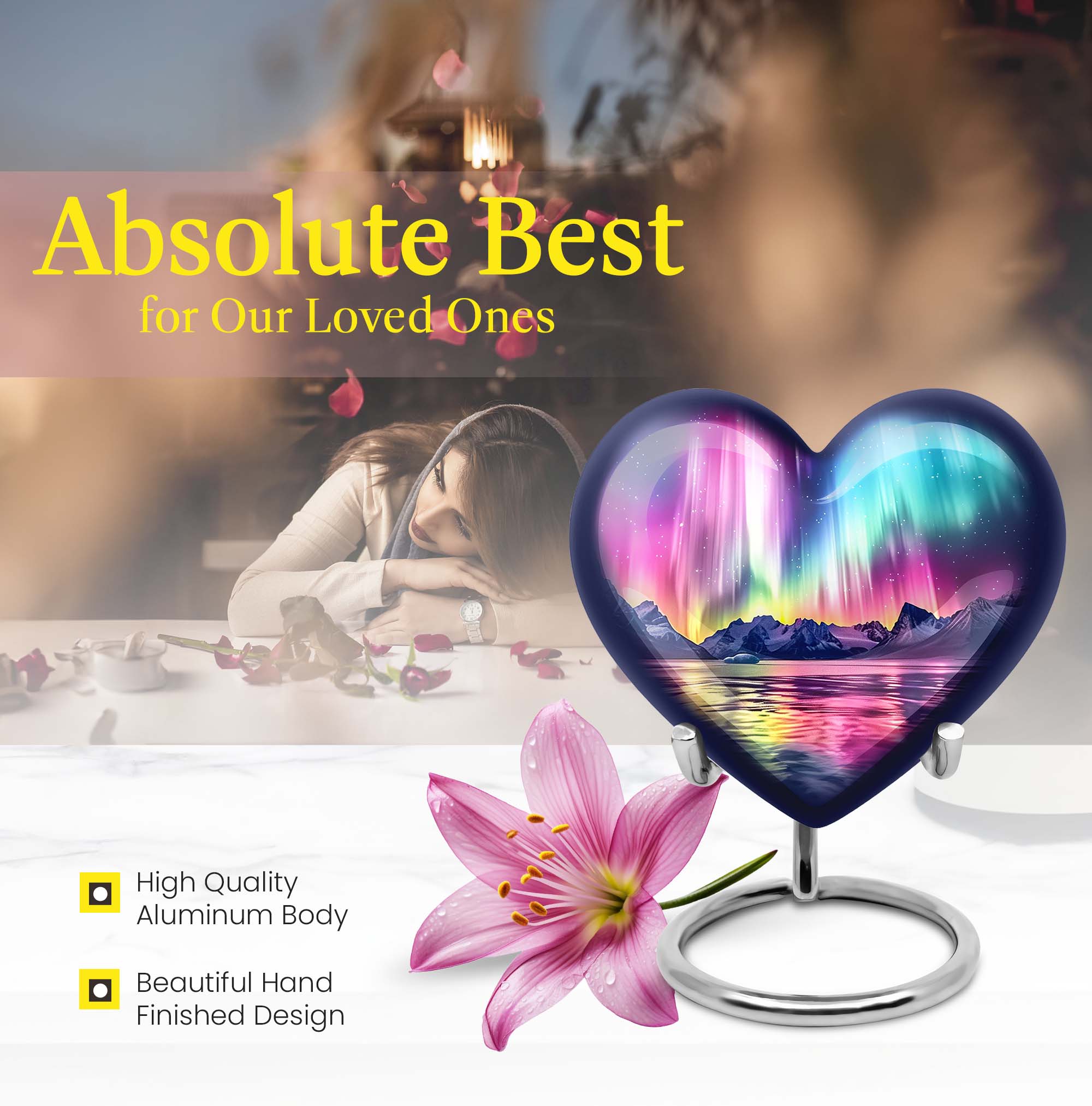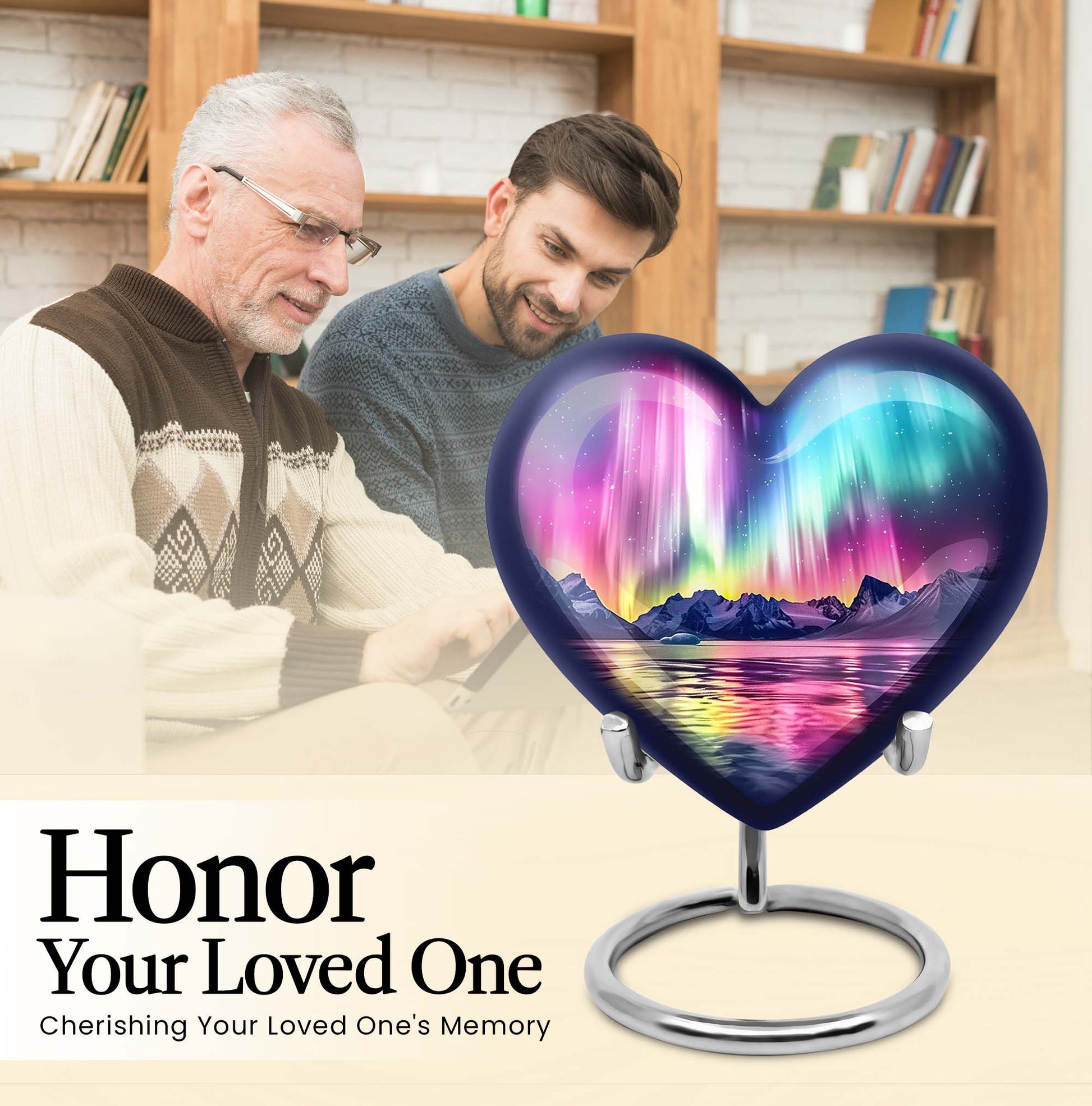 Honor and commemorate your cherished ones with the exquisite AURORA urn, an ideal choice for burial ashes Urns. Boasting an impressive size of 10 inches and a weight of 3.3 pounds, this cremation urn precisely leverages an abstract theme to pay tribute to your beloved in a dignified and respectful way. It’s meticulously crafted from high-quality aluminum, ensuring a balanced mix of durability and elegance. Built to hold up to 200 cubic inches, this spacious urn can comfortably accommodate adult-sized ashes. It further comes with a soft velvet pouch, safeguarding the precious specks of your loved ones. To add an intimate touch, this urn for humans presents you the option to personalize it with engraved names. It delights with an exceptional 'Heart Urn' design but stays versatile enough to blend with various memorials and observances. Elevate your memorial ceremony with this sophisticated urn, uniquely designed for those in search of cremation funeral urns, urns for cremation ashes, and large urns for human ashes.