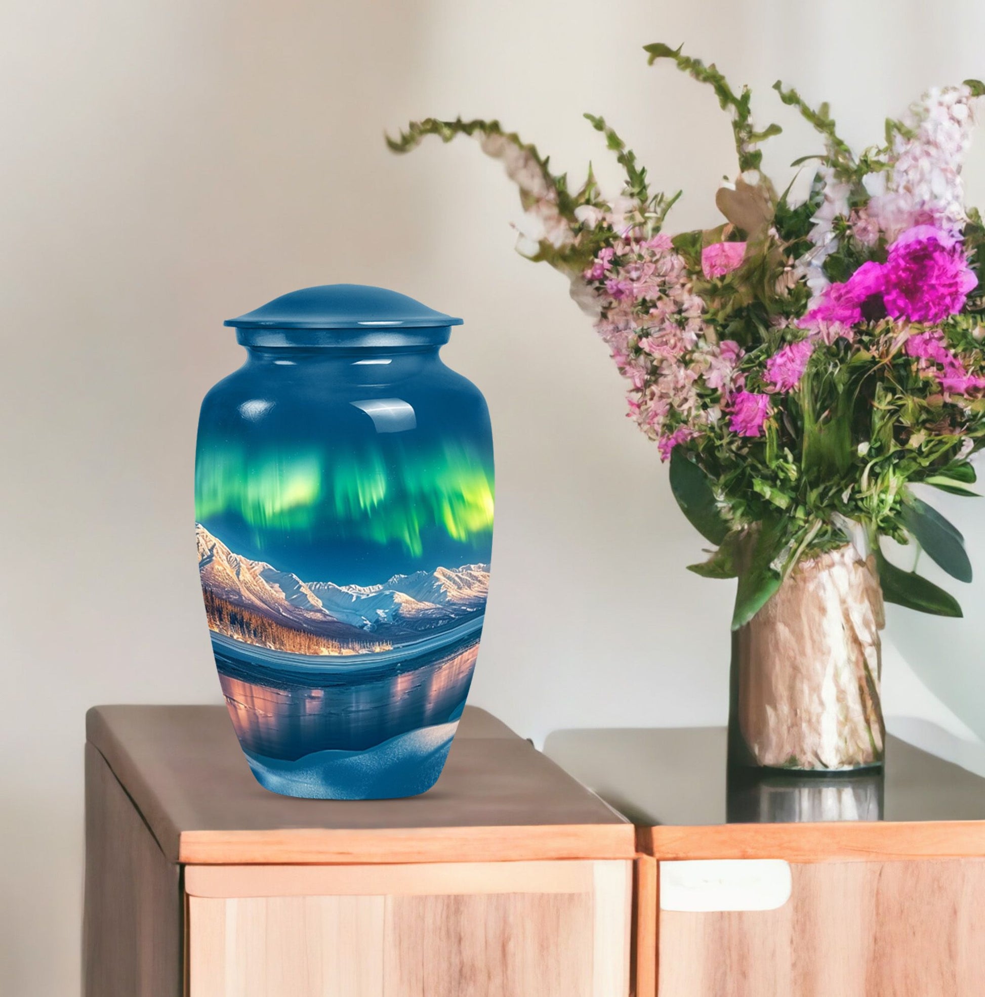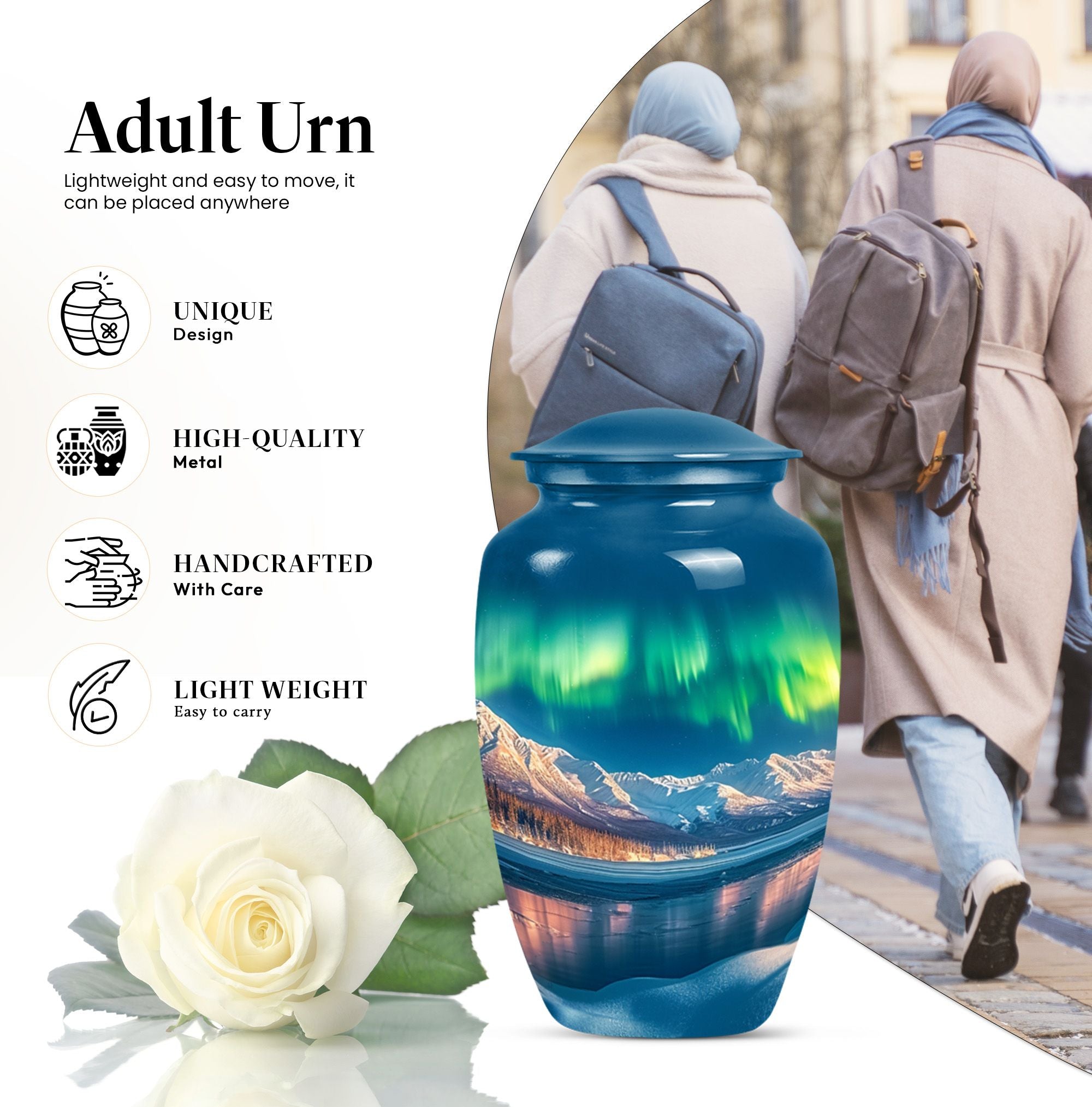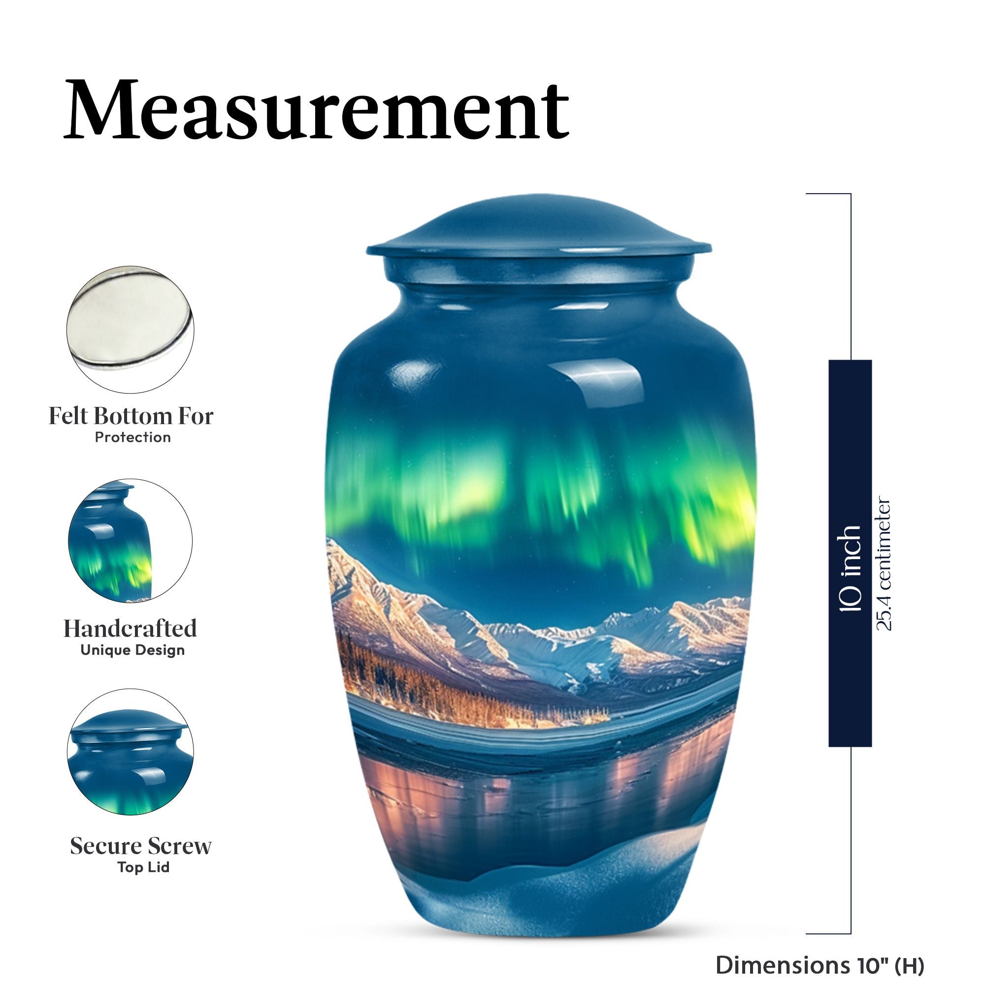 Honor your loved ones and cherish their memory with the uniquely crafted Arora Borealis Urn, a top-rated burial urn designed to fit comfortably within a 10-inch space. This majestic memorial urn, built from sturdy aluminium, weighs a solid 3.3 pounds, ensuring its durability while preserving its elegant appeal. The theme accents a delicate butterfly, adding a touch of softness to its classic urn shape. This large urn has the capacity to hold 200 cubic inches of contents, ideal for an adult male or female. A valuable addition, the product comes with an exquisite velvet pouch, perfect for the containment of ashes. You can also personalize this urn with engraved names to make it special and unique. This urn fits well for those searching 'urns for female adult', 'Metal urns for burial in ground large', and 'dual urn for adult male and female'. Celebrate the lives of those departed, remembering them in beauty and utmost respect.