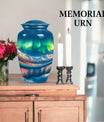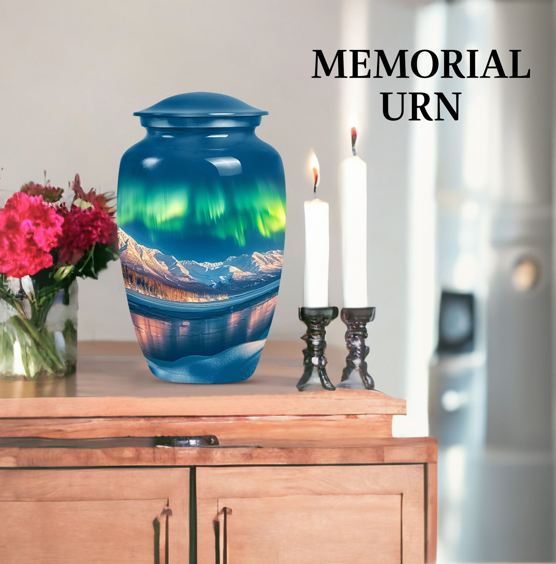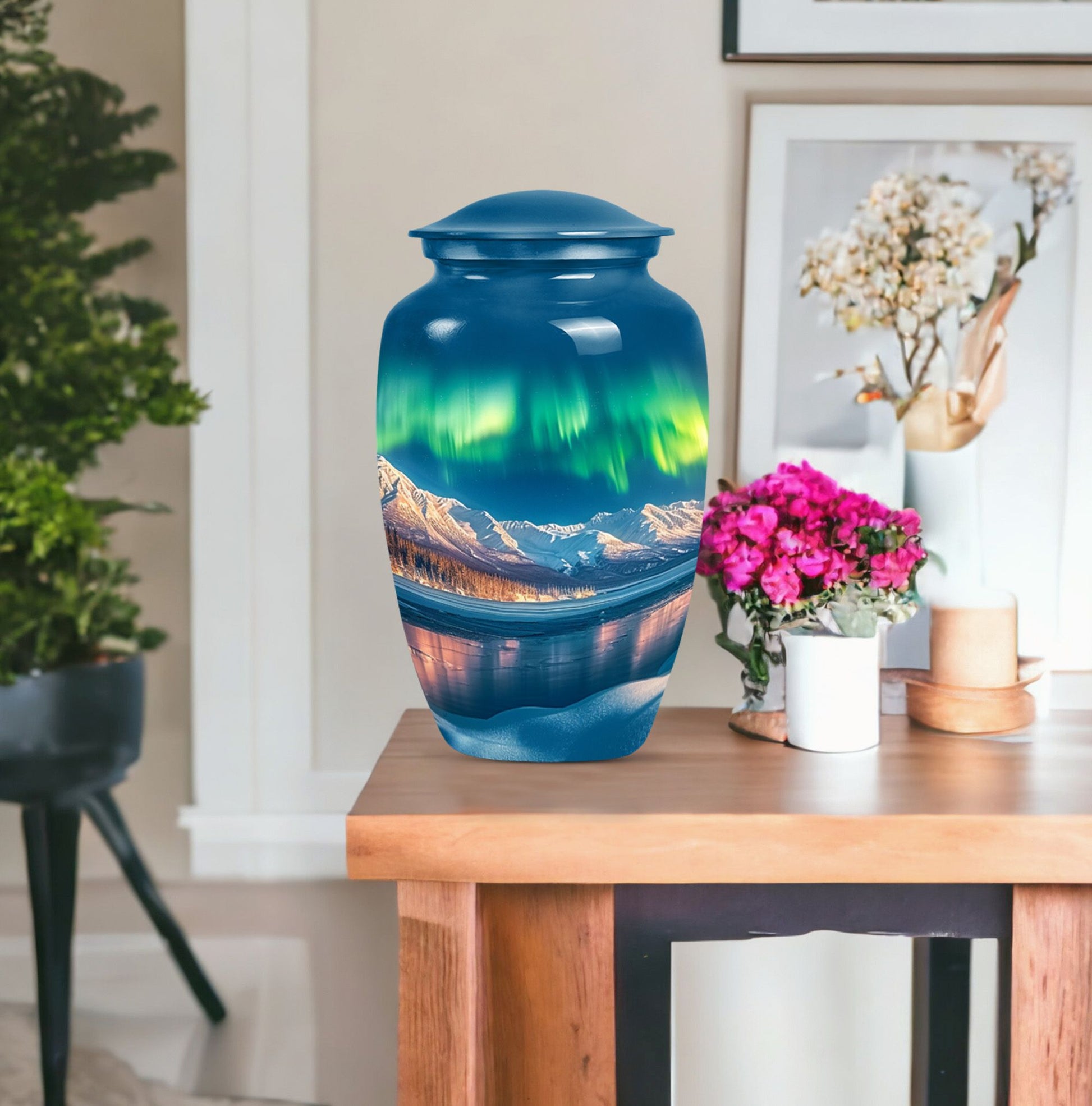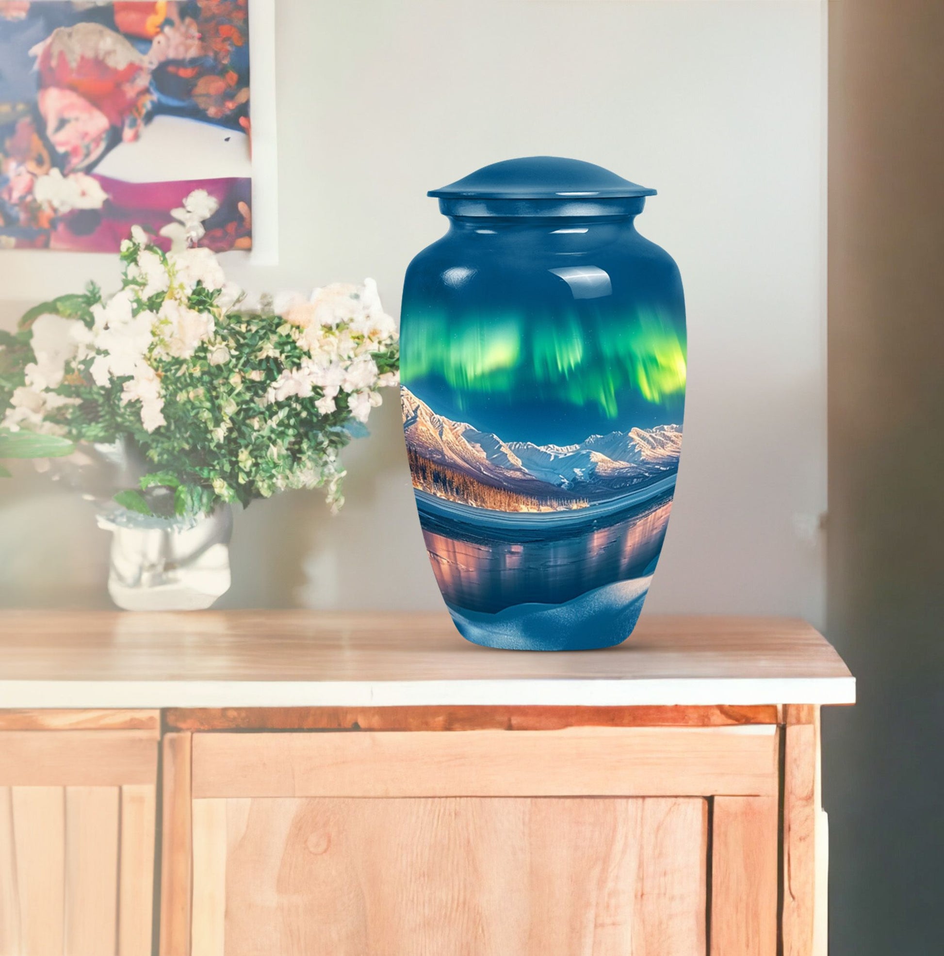 Honor your loved ones and cherish their memory with the uniquely crafted Arora Borealis Urn, a top-rated burial urn designed to fit comfortably within a 10-inch space. This majestic memorial urn, built from sturdy aluminium, weighs a solid 3.3 pounds, ensuring its durability while preserving its elegant appeal. The theme accents a delicate butterfly, adding a touch of softness to its classic urn shape. This large urn has the capacity to hold 200 cubic inches of contents, ideal for an adult male or female. A valuable addition, the product comes with an exquisite velvet pouch, perfect for the containment of ashes. You can also personalize this urn with engraved names to make it special and unique. This urn fits well for those searching 'urns for female adult', 'Metal urns for burial in ground large', and 'dual urn for adult male and female'. Celebrate the lives of those departed, remembering them in beauty and utmost respect.