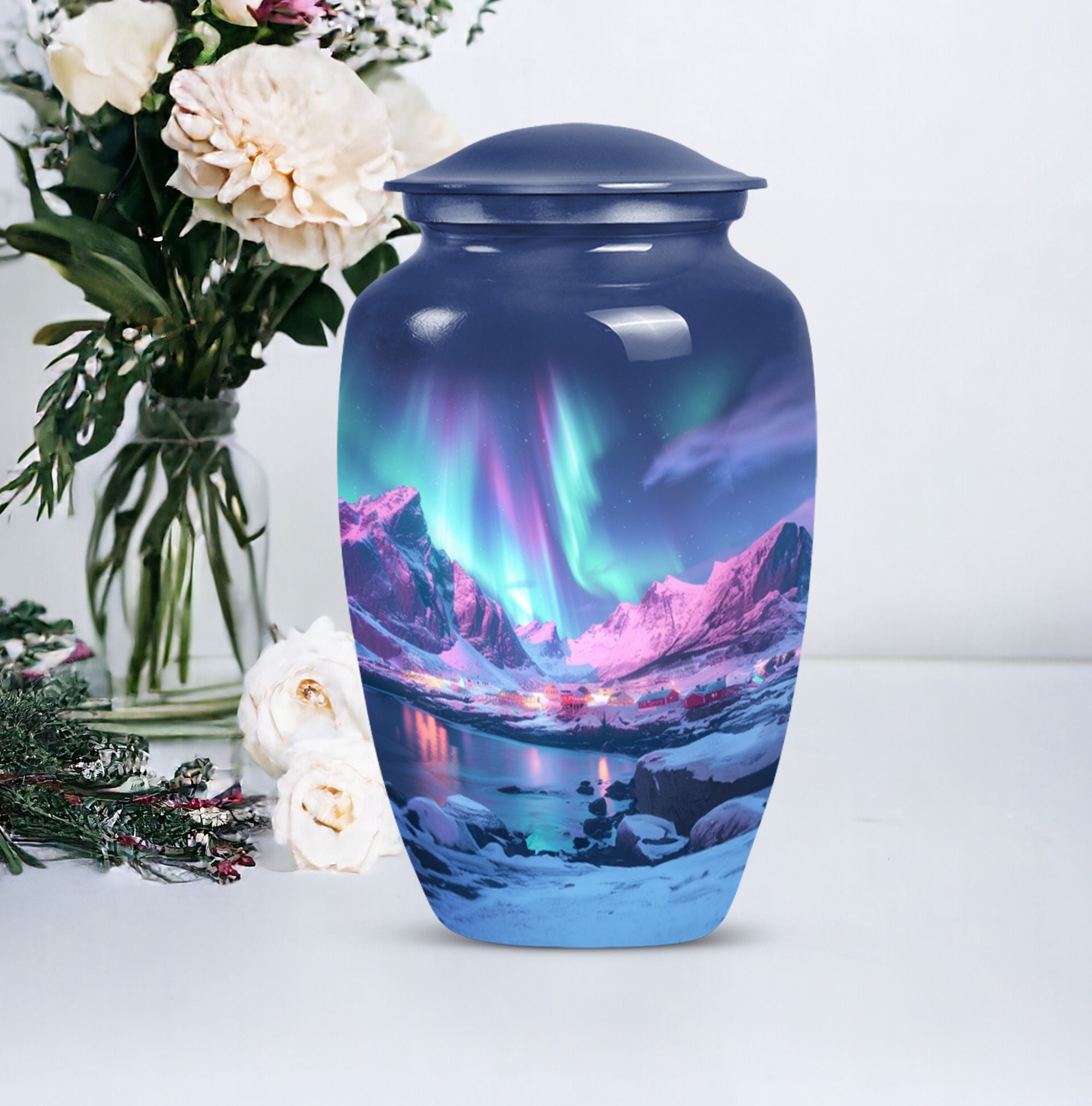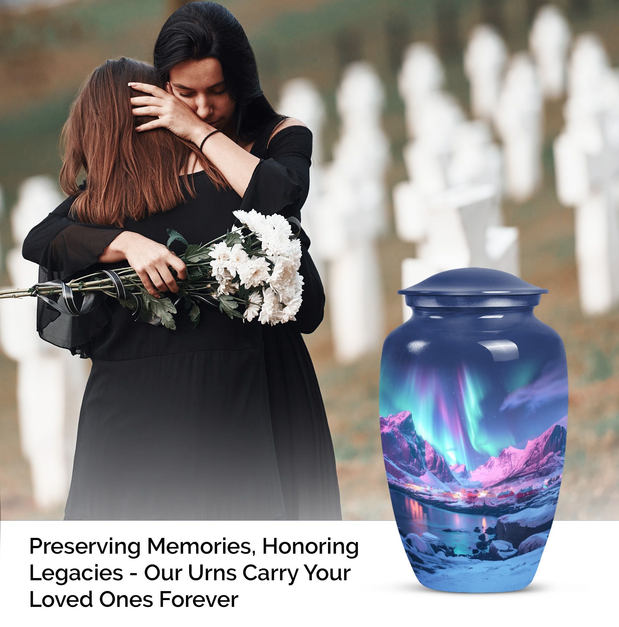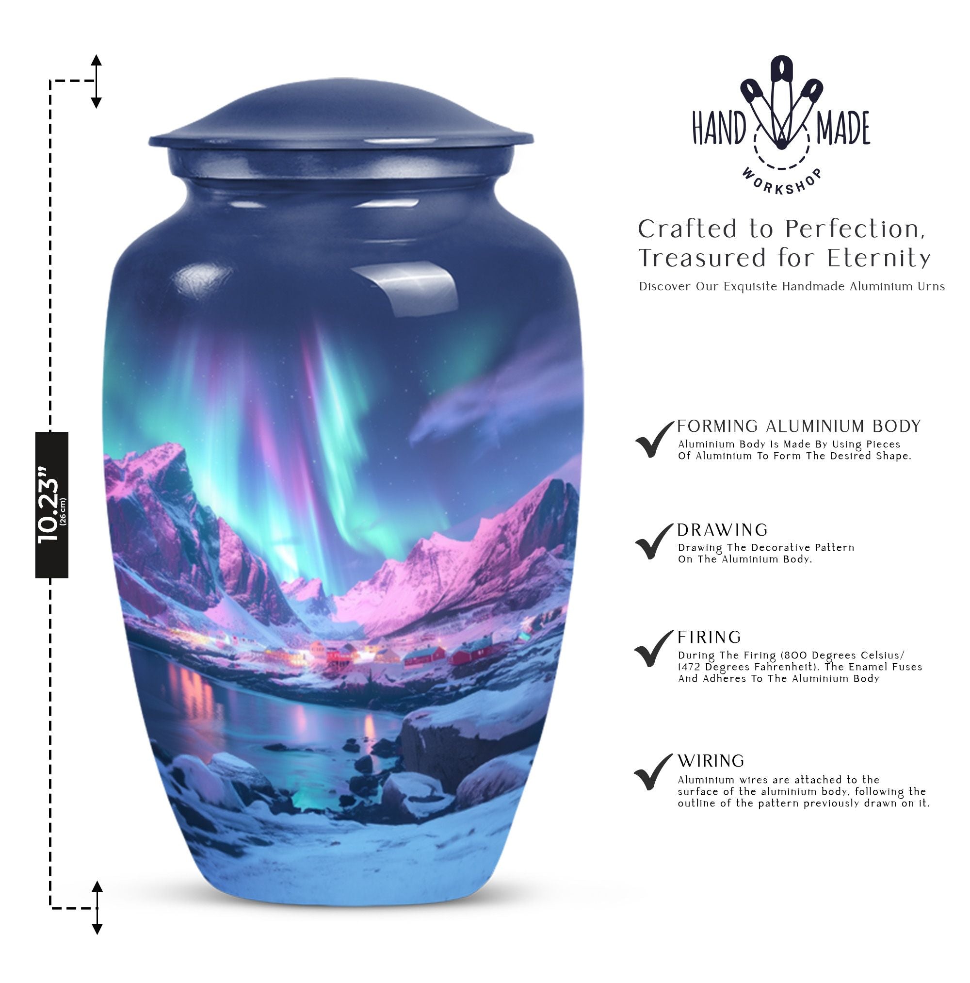 Feel at peace as you honor your loved ones with the AURORA Urn, a unique piece among memorial adult urns exuding grace and respect. At a size of 10 inches, the urn exhibits a distinct Abstract theme without compromising on the classic urn aesthetic. Crafted meticulously from durable aluminium, it strikes a balance between elegance and longevity. The urn proves its serviceability with its capacity to hold up to 200 cubic inches of ashes. This Large Urn weighs 3.3 pounds, underlining its sturdy build. Prioritizing personal sentiment, we offer the option to personalize this urn with engraved names, making the remembrance truly intimate and unique. The purchase includes a velvet pouch tailored for the containment of ashes, promoting secure and dignified preservation. Eschewing the commonplace designs typically associated with cremation urns for burial in ground, this adult human urn stands out rightfully as a modern yet respectful nod to the inevitable farewell we all must render.