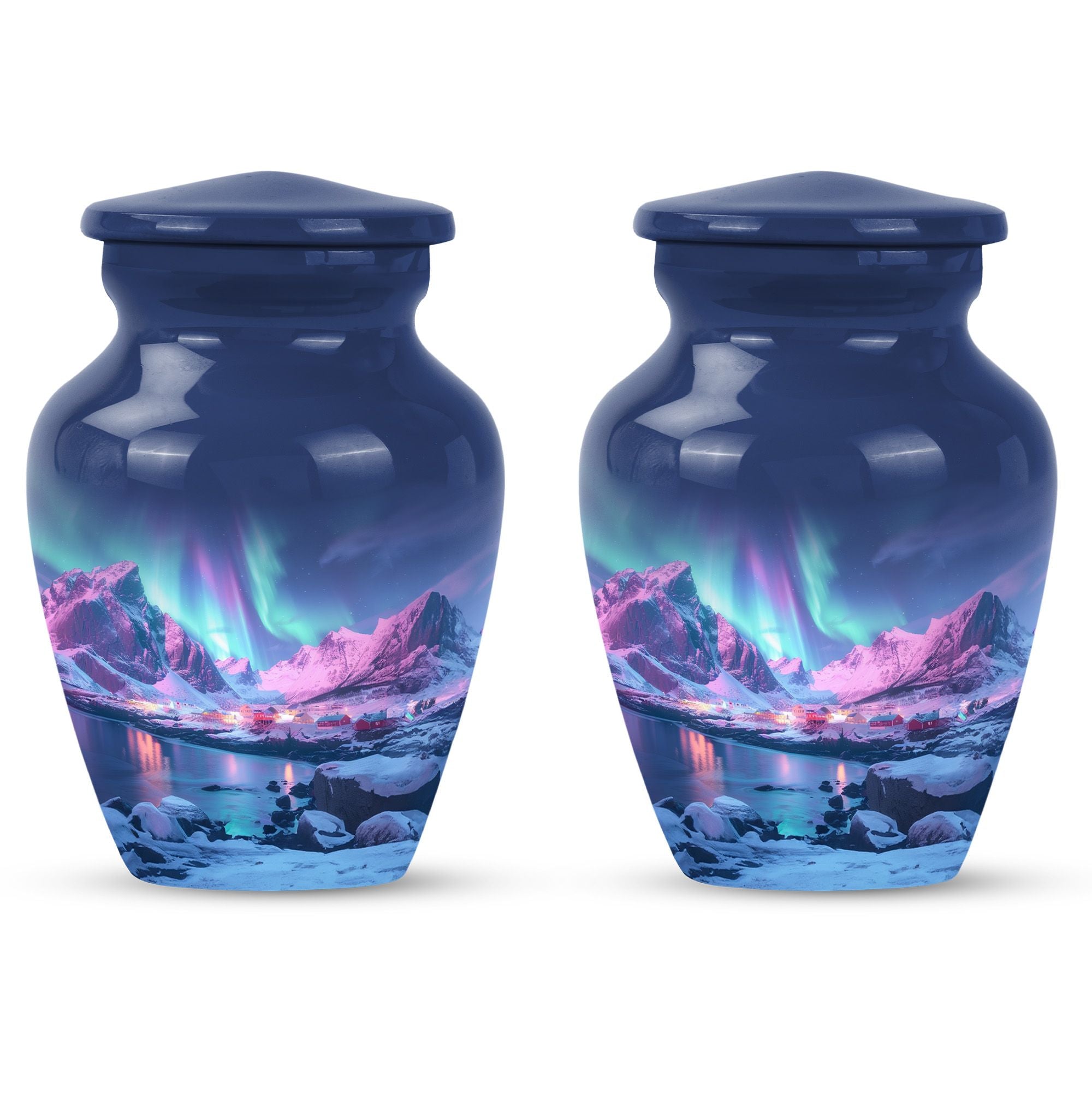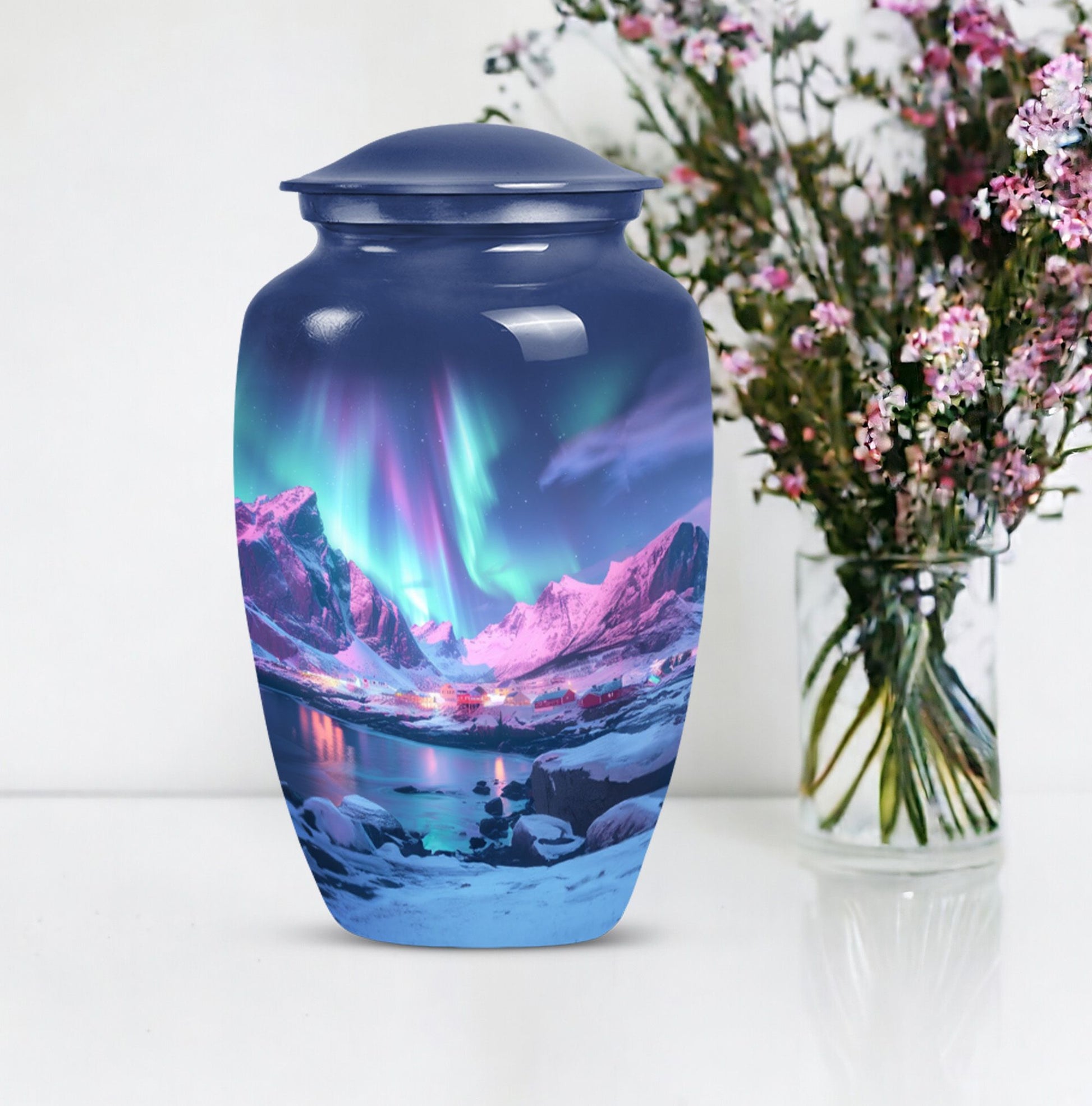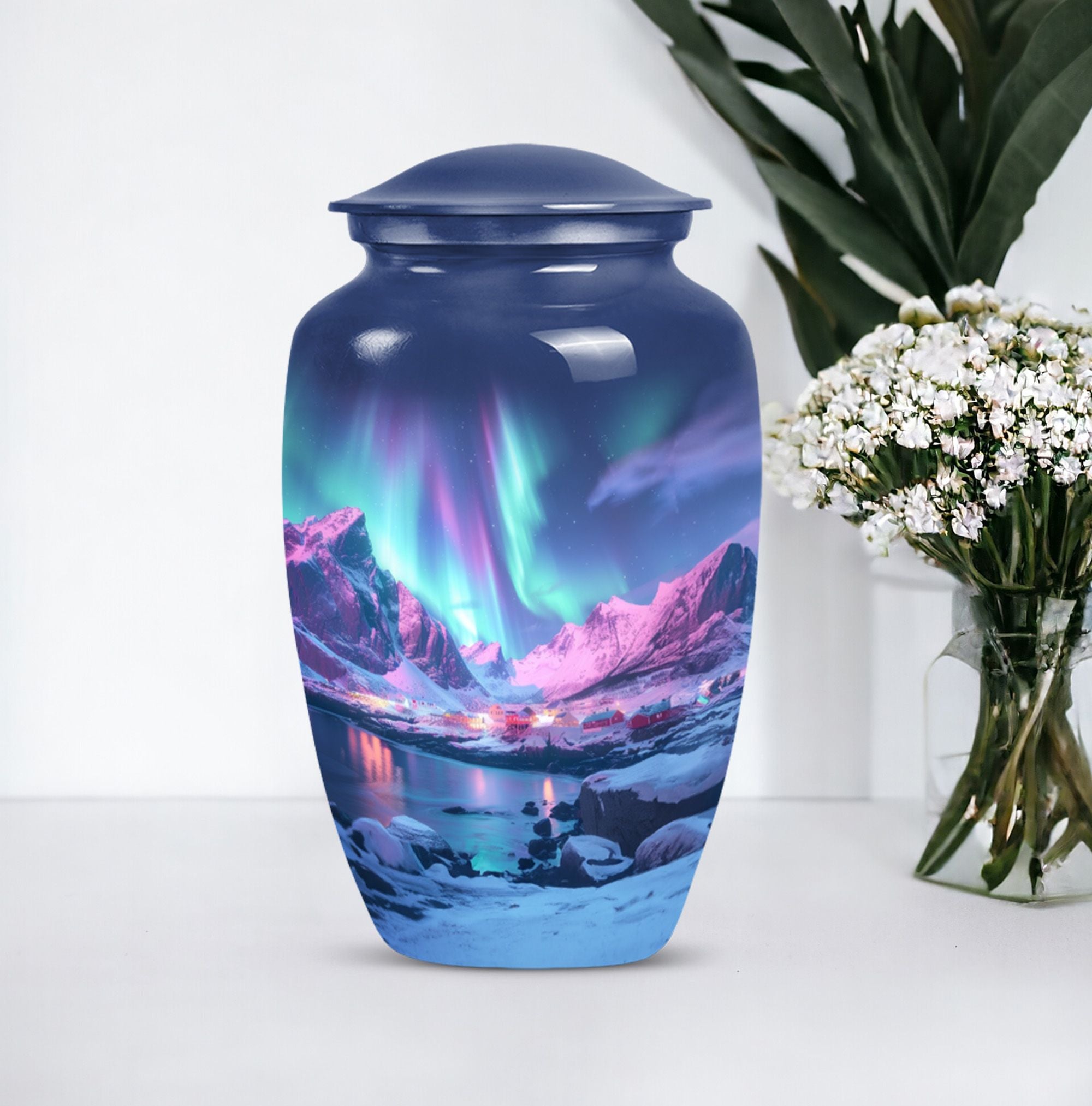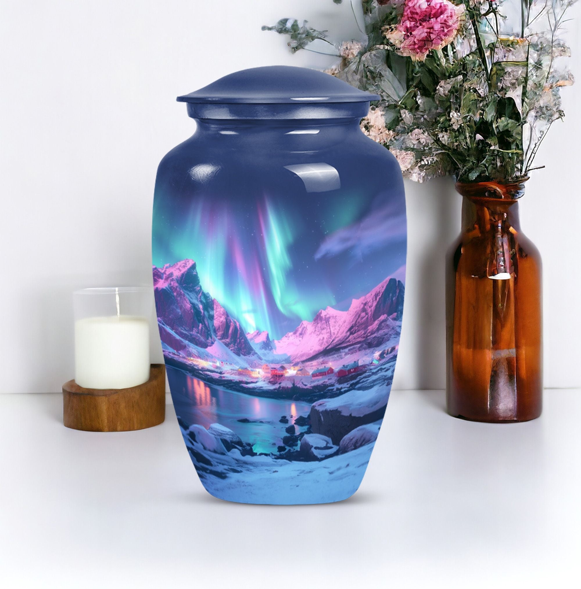 Feel at peace as you honor your loved ones with the AURORA Urn, a unique piece among memorial adult urns exuding grace and respect. At a size of 10 inches, the urn exhibits a distinct Abstract theme without compromising on the classic urn aesthetic. Crafted meticulously from durable aluminium, it strikes a balance between elegance and longevity. The urn proves its serviceability with its capacity to hold up to 200 cubic inches of ashes. This Large Urn weighs 3.3 pounds, underlining its sturdy build. Prioritizing personal sentiment, we offer the option to personalize this urn with engraved names, making the remembrance truly intimate and unique. The purchase includes a velvet pouch tailored for the containment of ashes, promoting secure and dignified preservation. Eschewing the commonplace designs typically associated with cremation urns for burial in ground, this adult human urn stands out rightfully as a modern yet respectful nod to the inevitable farewell we all must render.