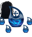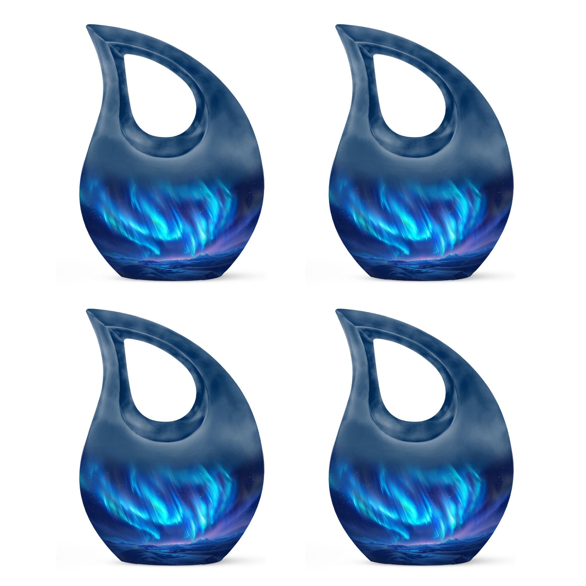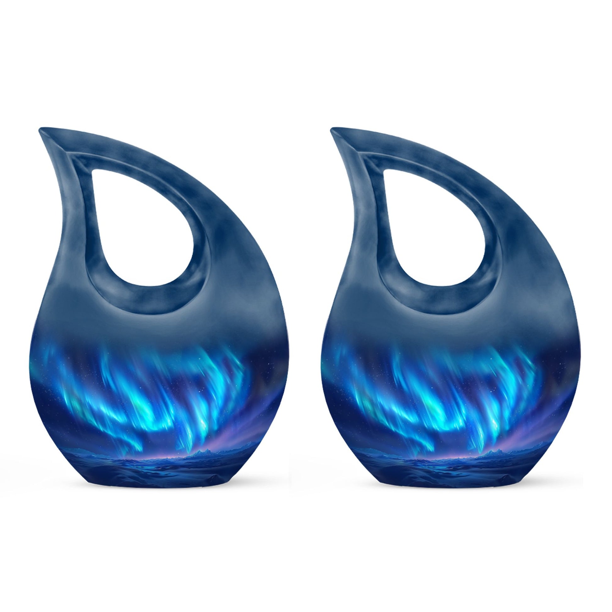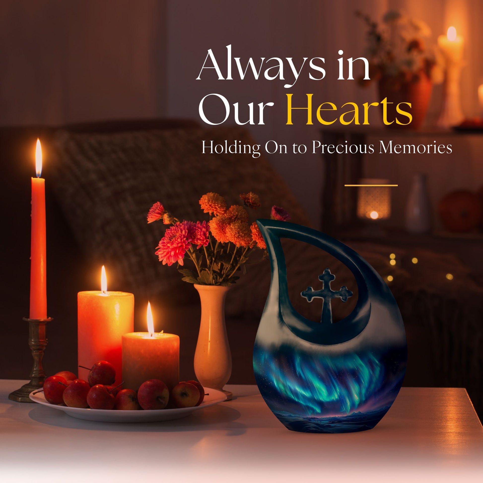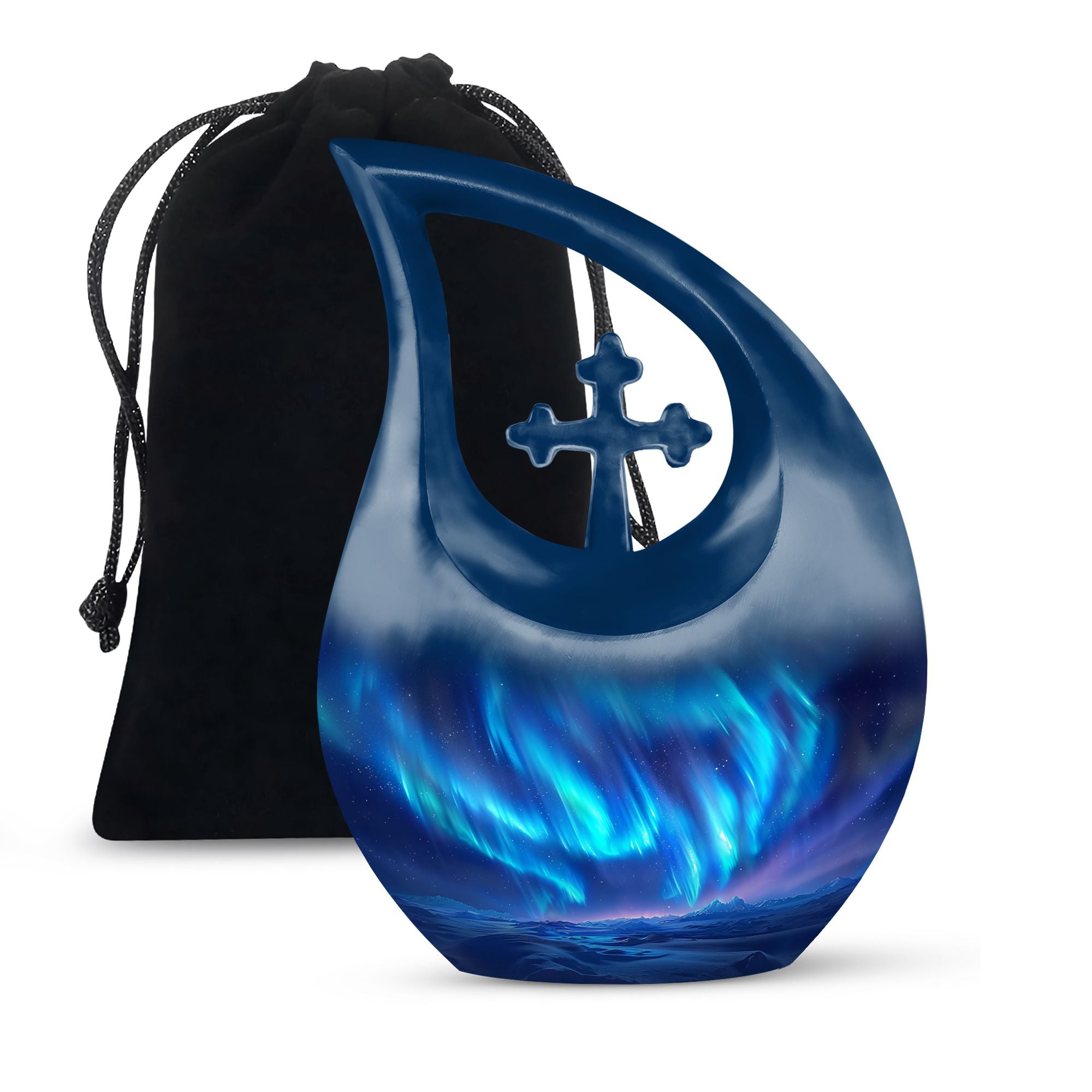 Experience the serenity and comfort with this magnificent Aurora Borealis Urn. An ideal choice among memorial urns, this Large Urn has an exclusive 'Cross Drop' Theme. Handcrafted with the finest aluminium, this urn measures 10 inches in height and weighs simply 3.3 pounds. It's Extra Large Urn size has a capacity of 200 cubic inches, ensuring ample space for containment of ashes, safely enveloped in a complementary velvet pouch. Add a personal touch by engraving names, making it custom made urns for ashes. Echoing hues of Aurora Borealis, this distinct metal cremation urn assures an honorable way to remember your departed loved ones. This masterpiece is exclusively available for those searching for high-quality ashes urns for sale that blend beauty, durability, and functionality differentiating it from quotidian memorials.
