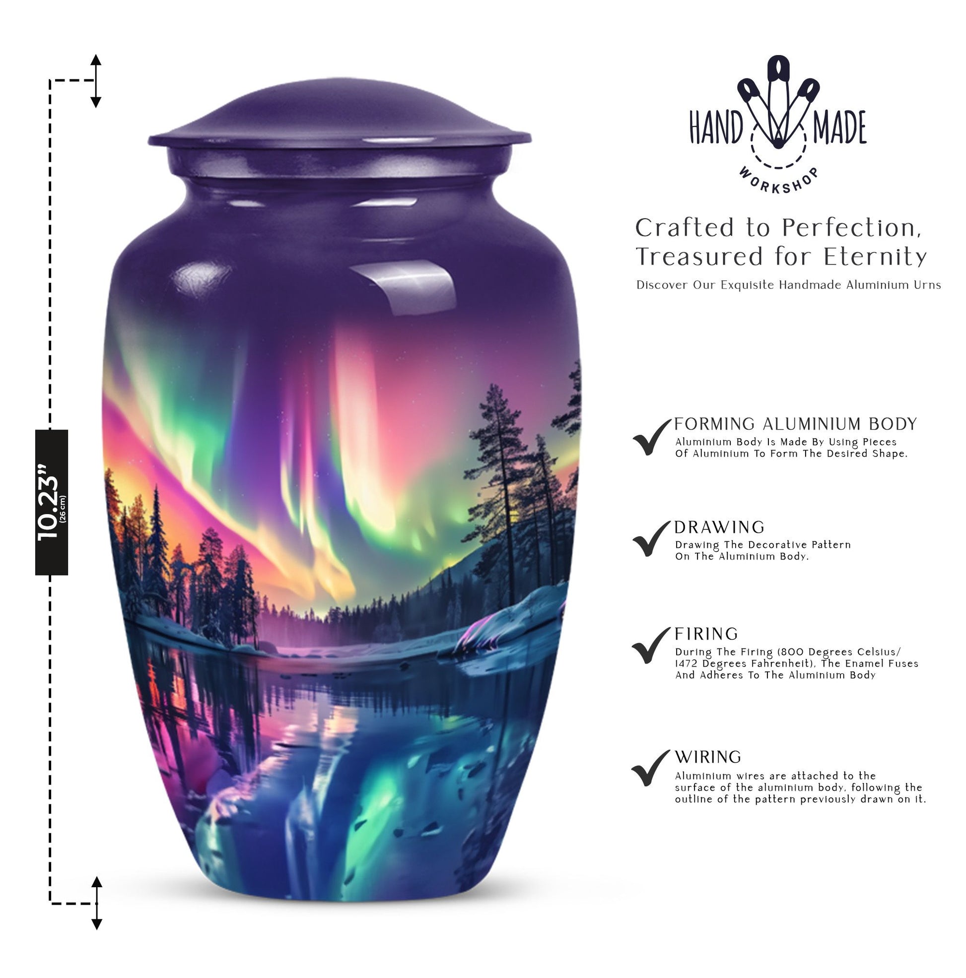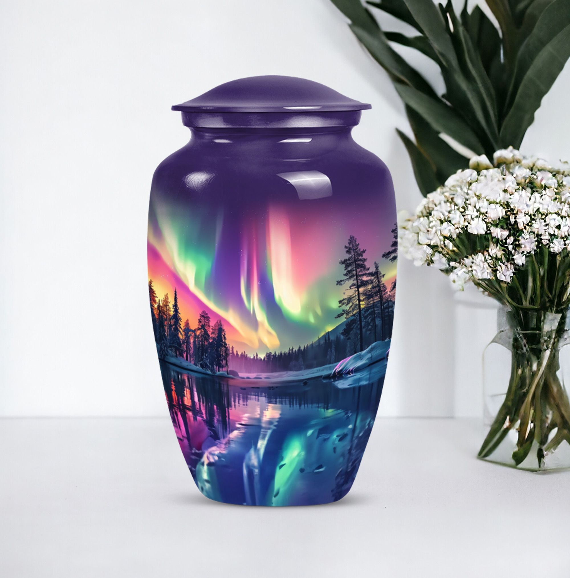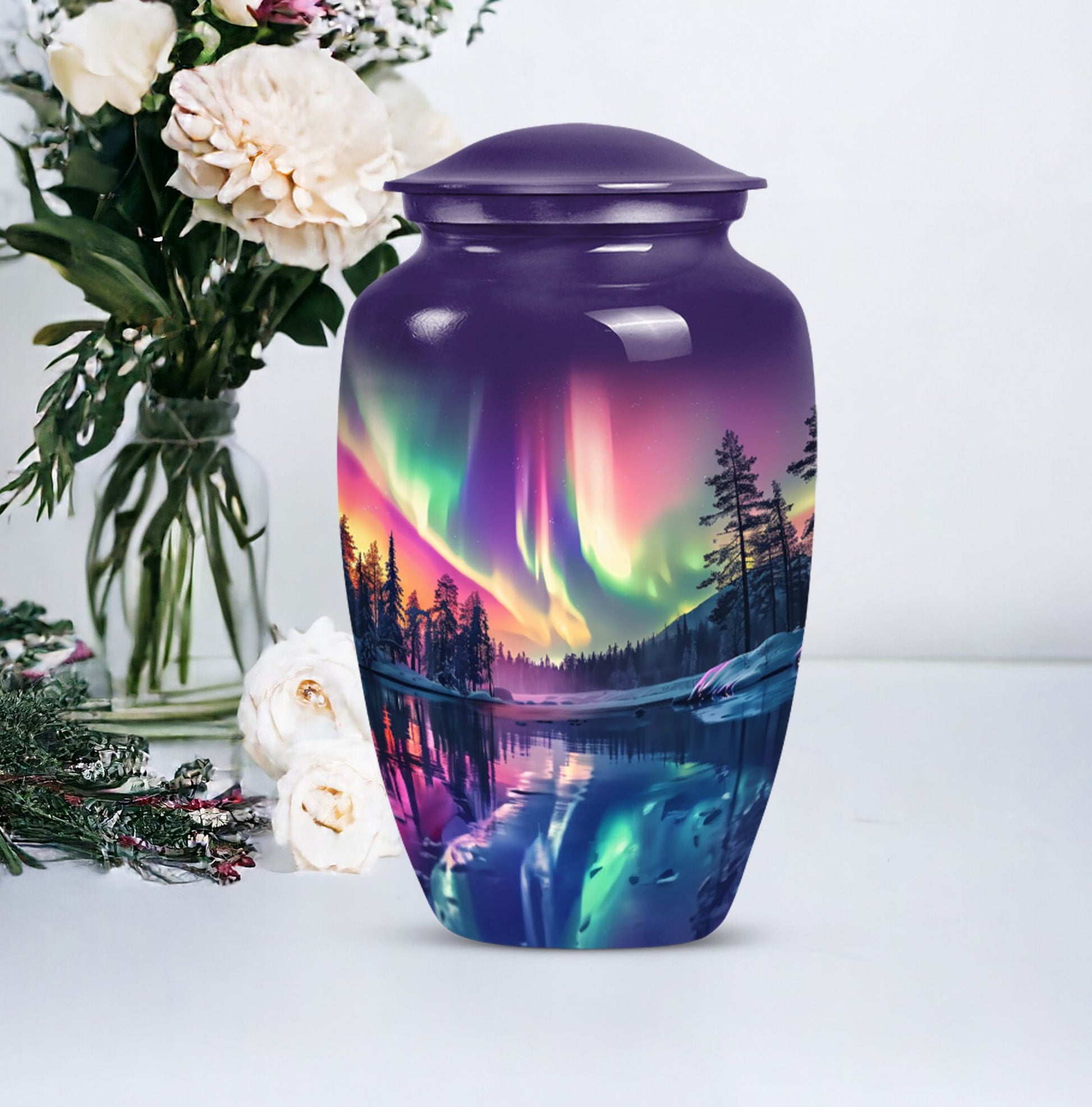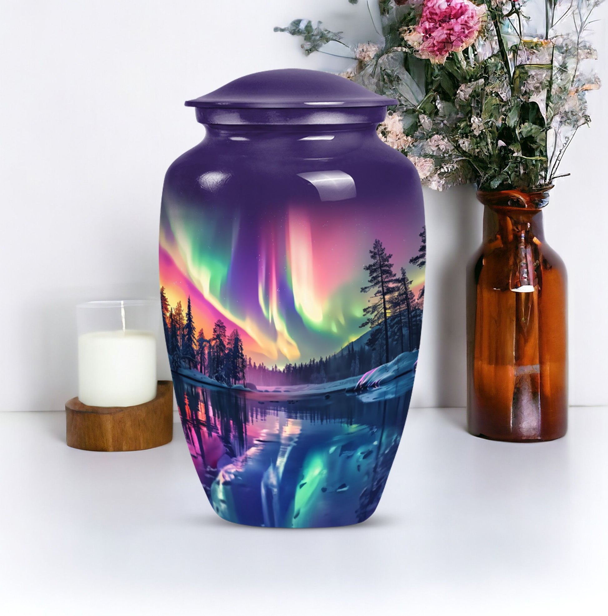 Gracefully crafted from strong aluminum, the AURORA Urn is the epitome of elegant and sophisticated simplicity. Serving as an ideal memorial adult urn, this cremation urn, measuring 10 inches, possesses a weight of 3.3 pounds and the capacity to hold up to 200 cubic inches. This size is perfectly suited for adults, making it applicable for large urns category. The urn is elegantly packaged in a velvet pouch for graceful containment and protection of the cherished ashes. One of the key features is the opportunity for personalization - you can engrave names on it to preserve the memory of your loved ones in more than spirit. Exhibiting an abstract theme, it combines the high-quality contemporary materials with a timeless classic urn design that doesn't fade or lose its touch over the years. With appropriate keywords such as funeral burial urns, human ash urns, ashes urn, and cremation containers for human ashes, this urn distinctly stands out with its impeccable features and purposeful simplicity.