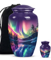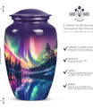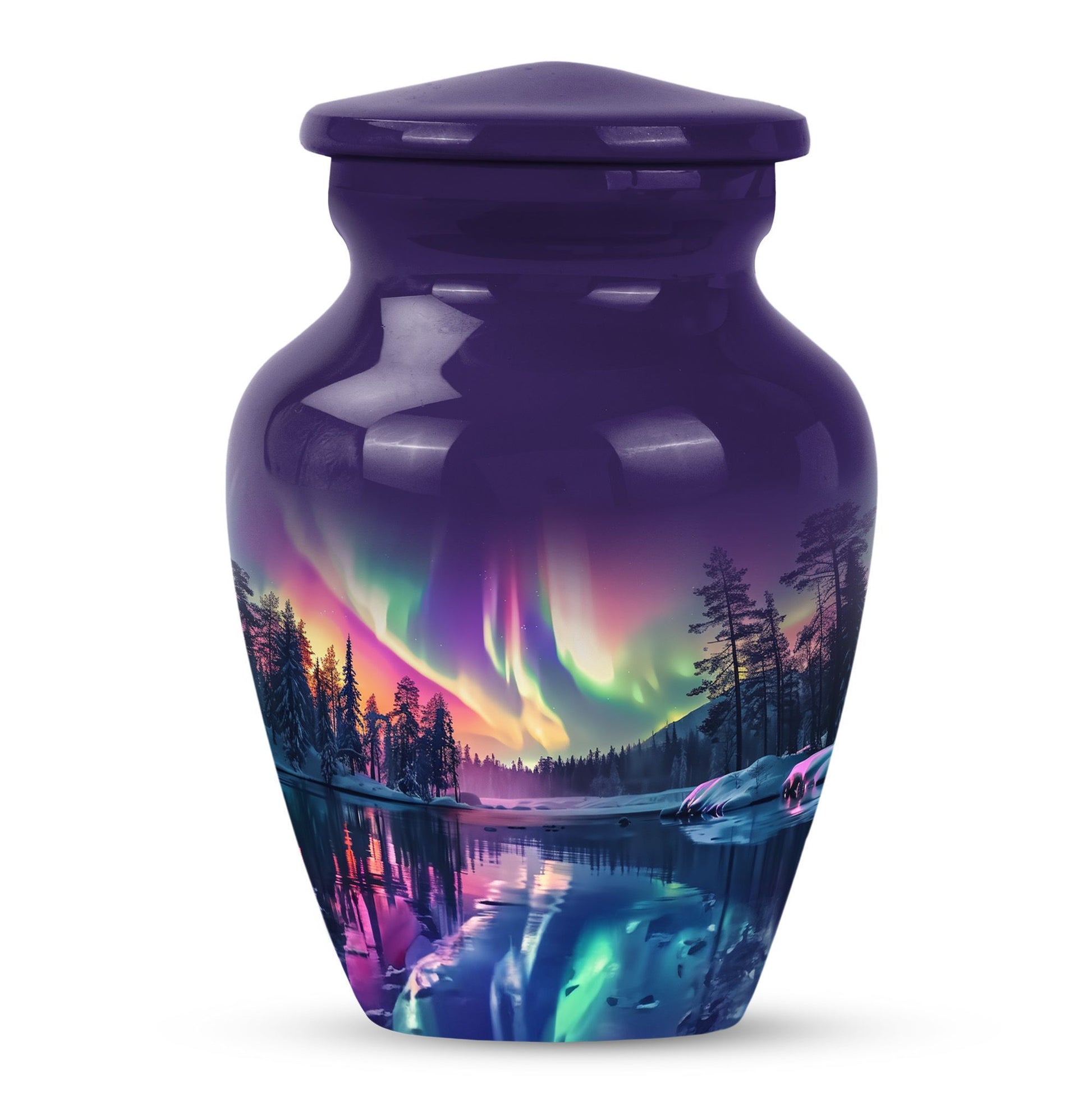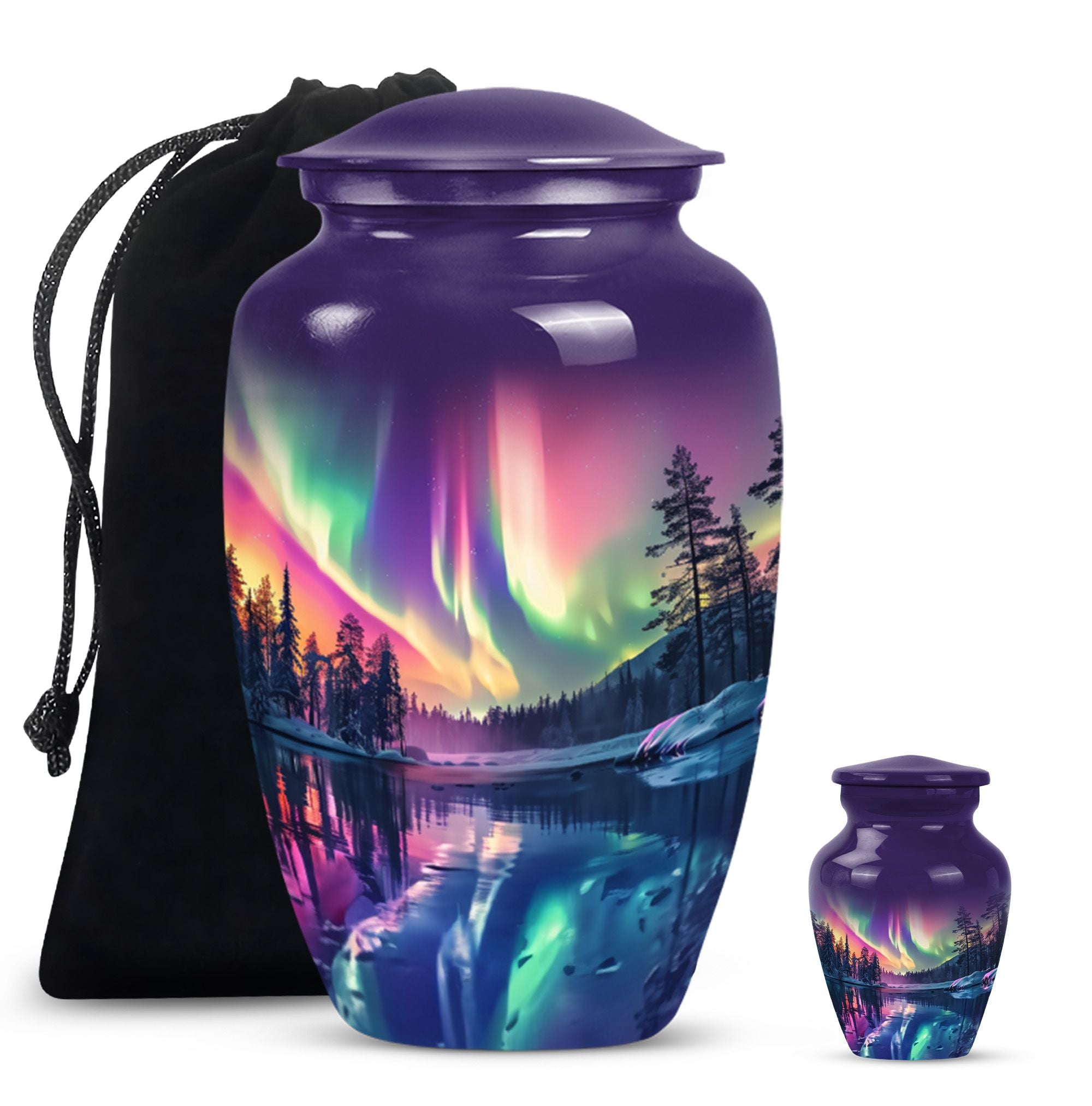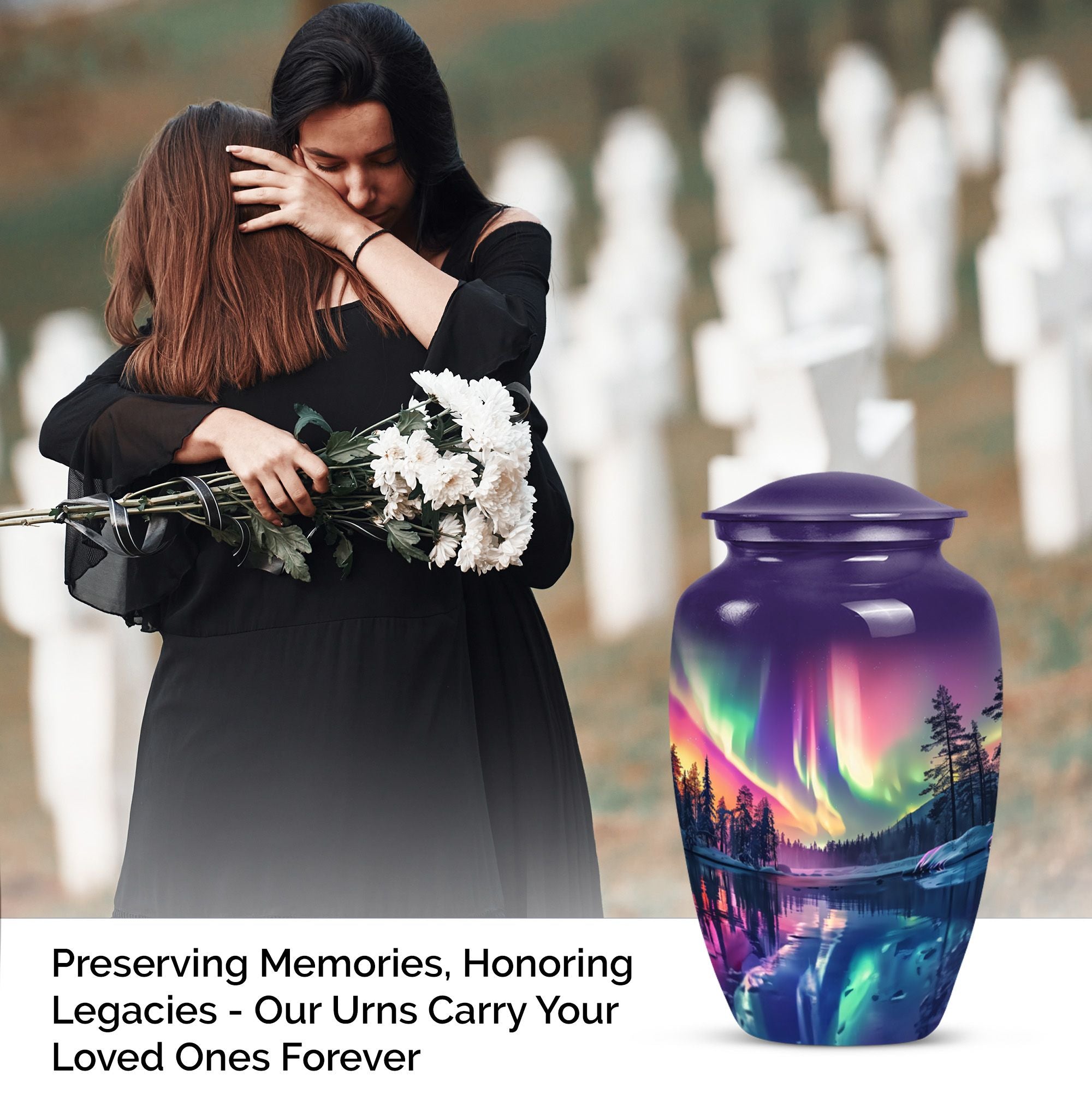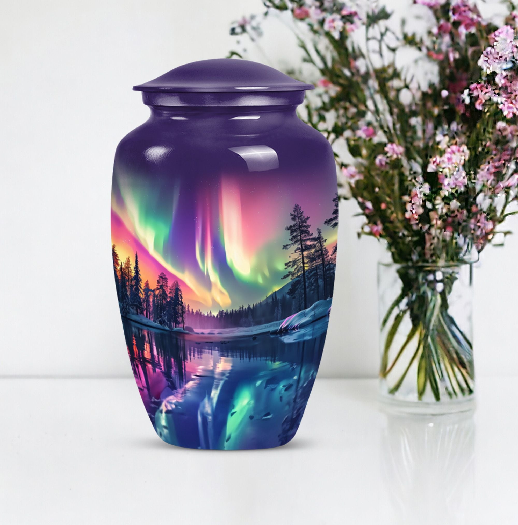 Gracefully crafted from strong aluminum, the AURORA Urn is the epitome of elegant and sophisticated simplicity. Serving as an ideal memorial adult urn, this cremation urn, measuring 10 inches, possesses a weight of 3.3 pounds and the capacity to hold up to 200 cubic inches. This size is perfectly suited for adults, making it applicable for large urns category. The urn is elegantly packaged in a velvet pouch for graceful containment and protection of the cherished ashes. One of the key features is the opportunity for personalization - you can engrave names on it to preserve the memory of your loved ones in more than spirit. Exhibiting an abstract theme, it combines the high-quality contemporary materials with a timeless classic urn design that doesn't fade or lose its touch over the years. With appropriate keywords such as funeral burial urns, human ash urns, ashes urn, and cremation containers for human ashes, this urn distinctly stands out with its impeccable features and purposeful simplicity.