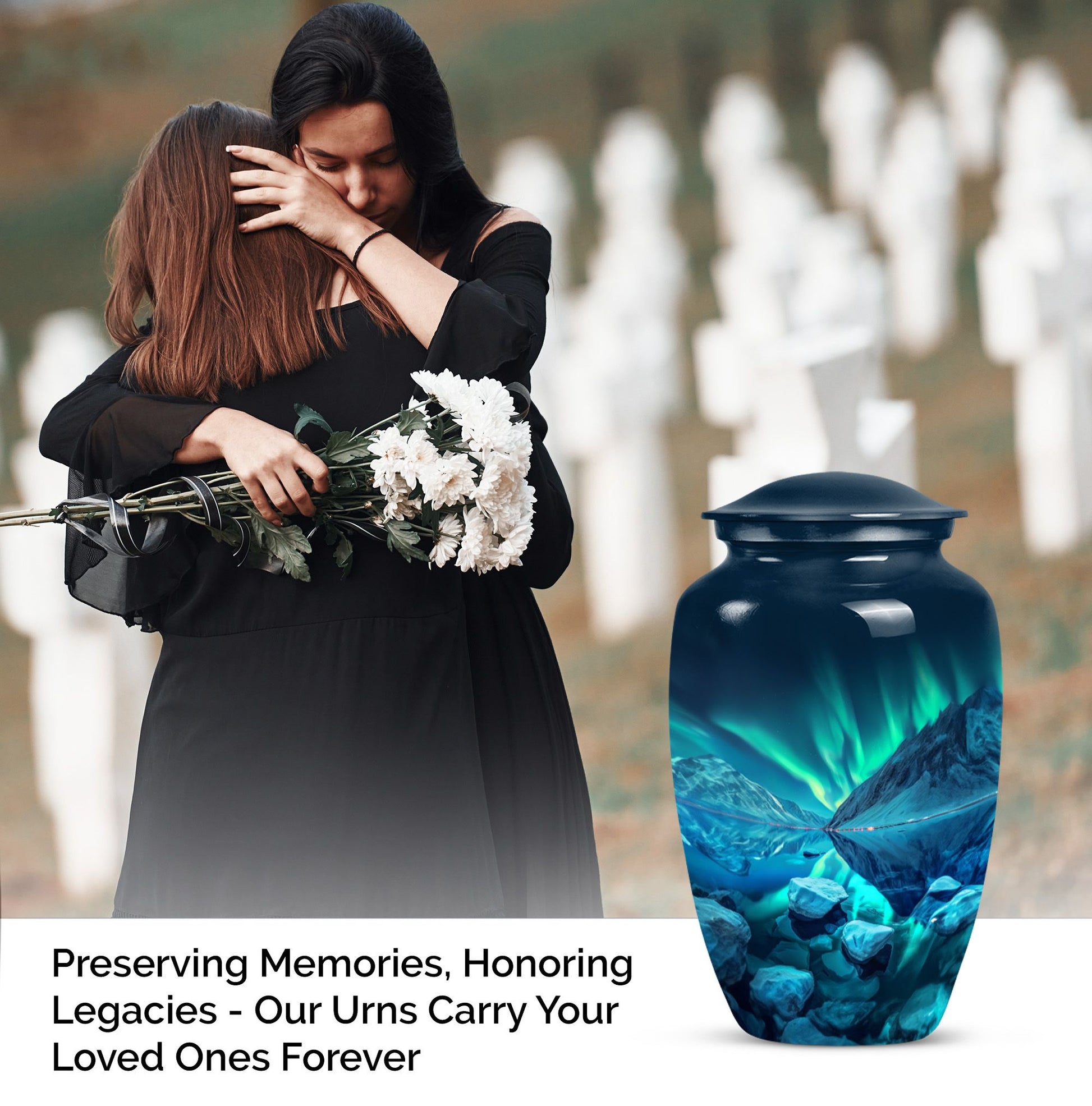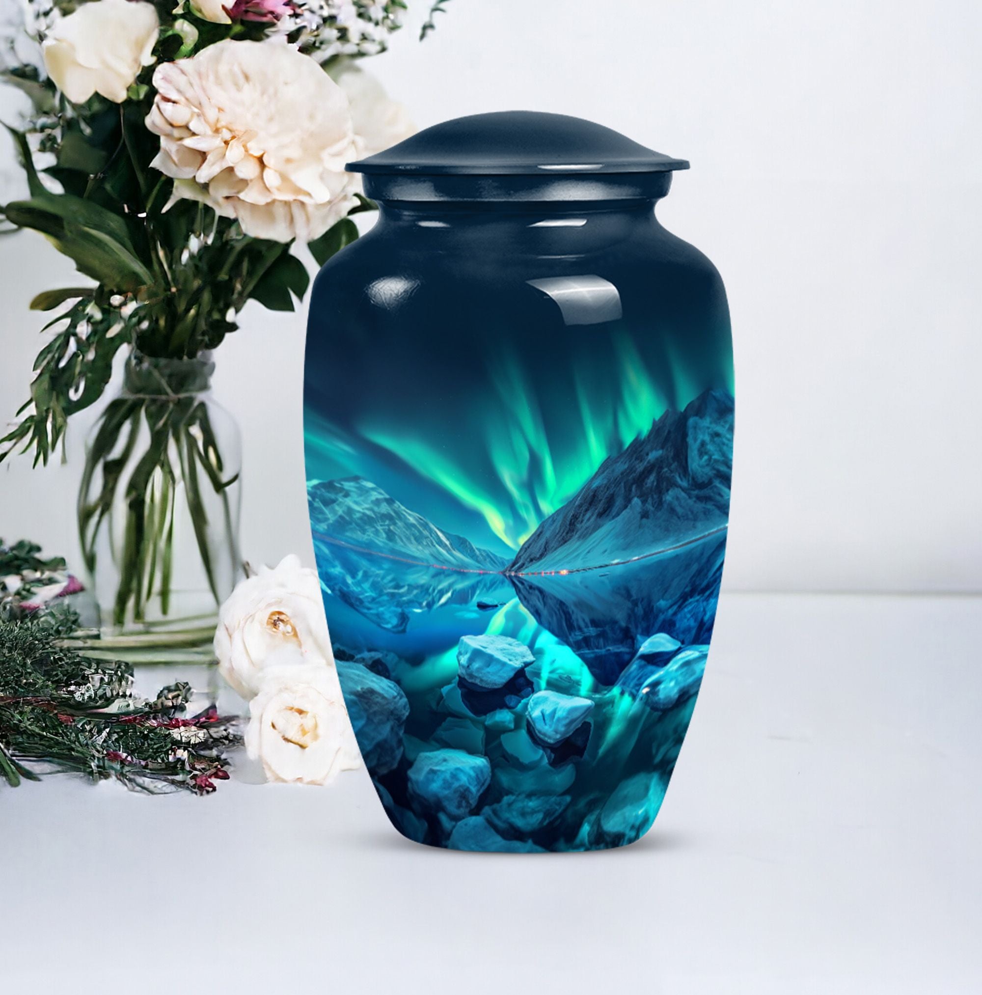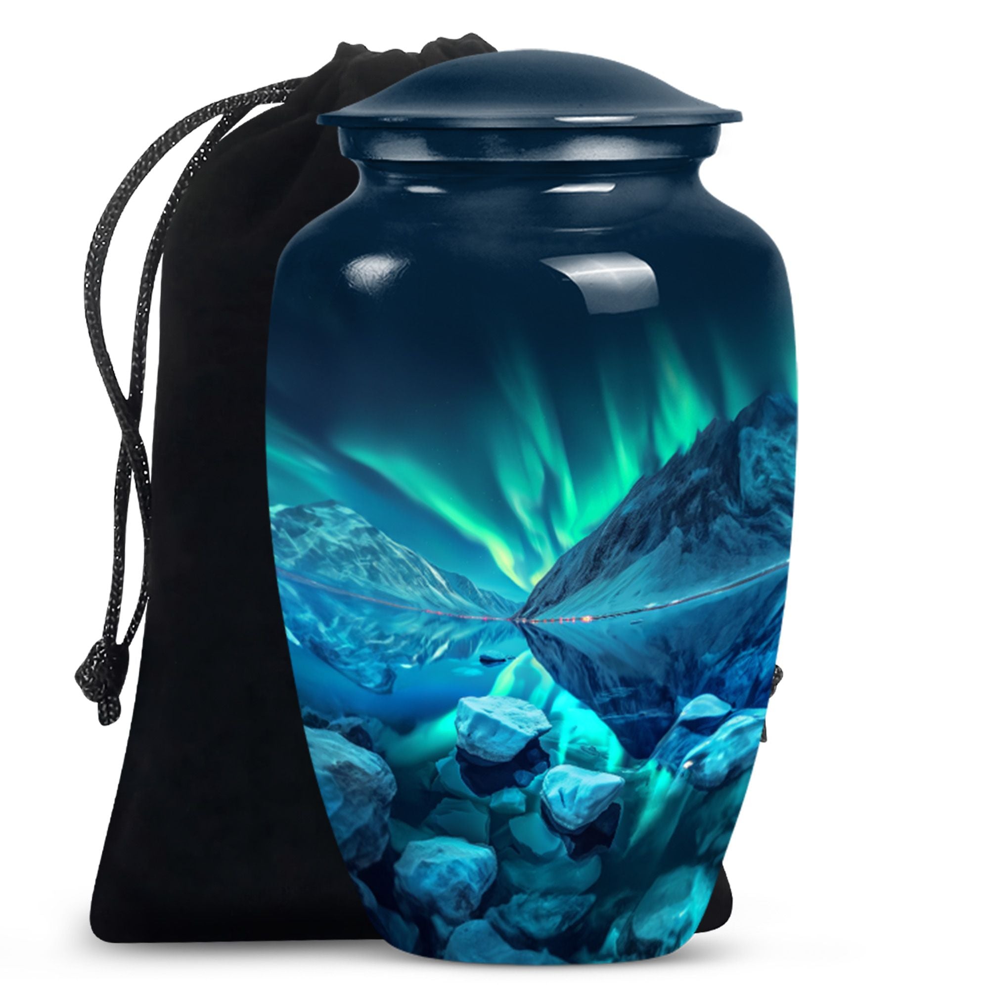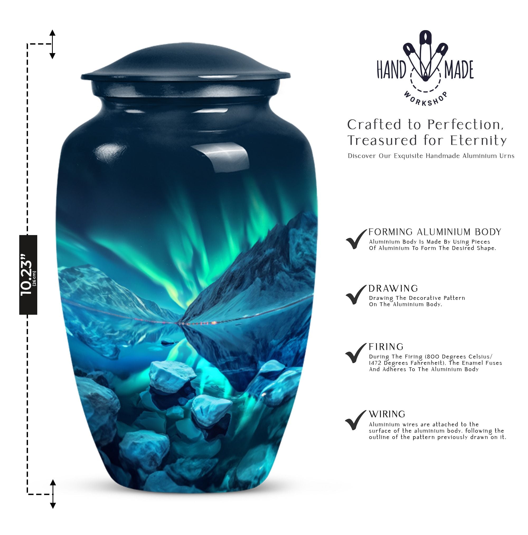 Introducing the AURORA Urn, an exemplar of a beautifully sculptured memorial medium urns for ashes. This religious and ceremonial urn tailored for adults and seniors is fashioned with an abstract theme and meticulously crafted from robust but lightweight aluminium. While it weighs only 3.3 pounds, its dimensions offer an ample capacity, standing at 10 inches with a volume to comfortably hold up to 200 cubic inches. Besides, AURORA has uniquely addressed personalization needs with a choice for engraved names, creating a tribute that is intimately personal. The cremation urn, included with a luxuriously soft velvet pouch, ensures respectful containment of ashes. The AURORA Urn; it's more than an urn for dad or a burial urn for human ashes adult. It's a touching, tangible reminder of your loved ones.
