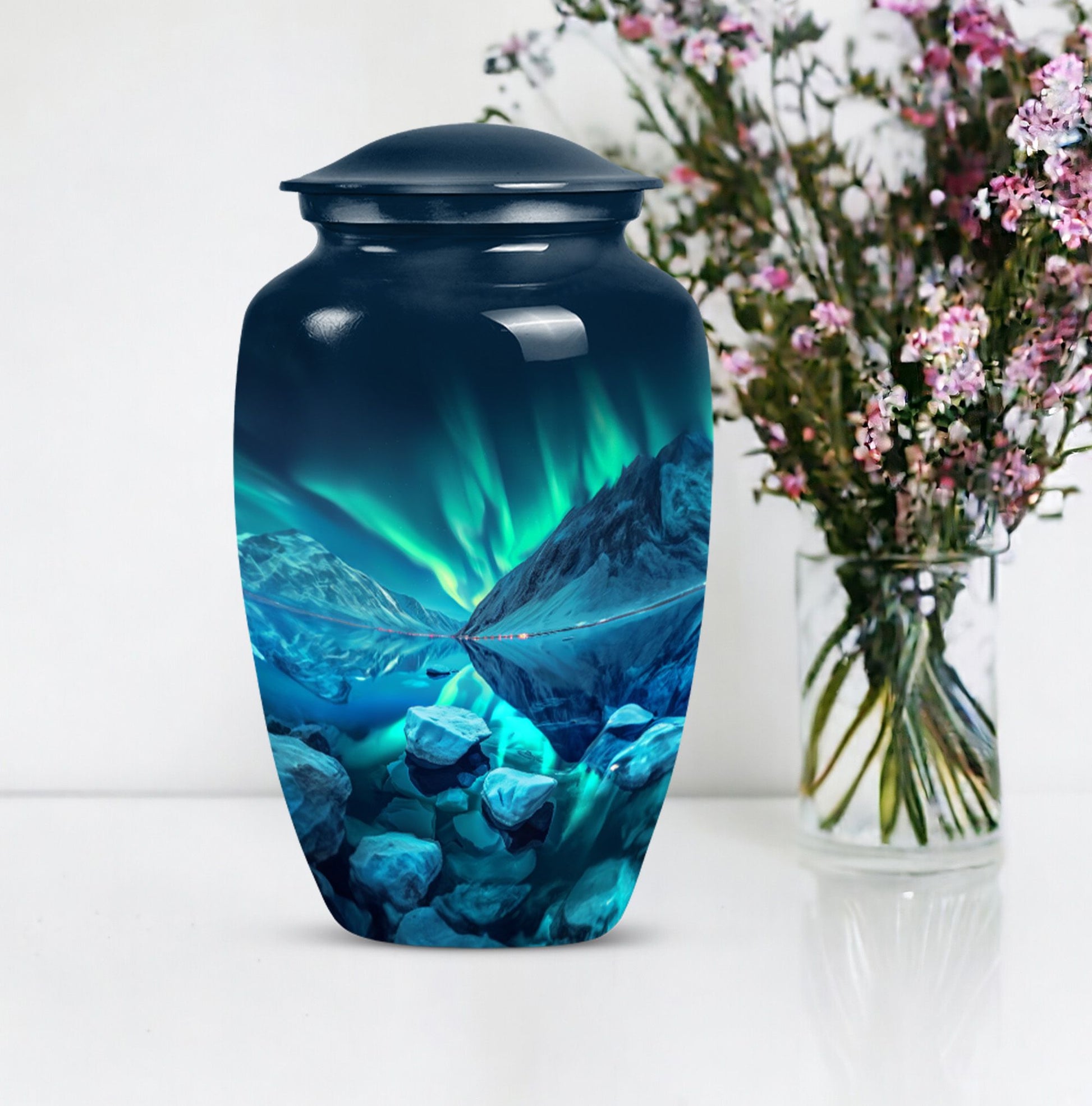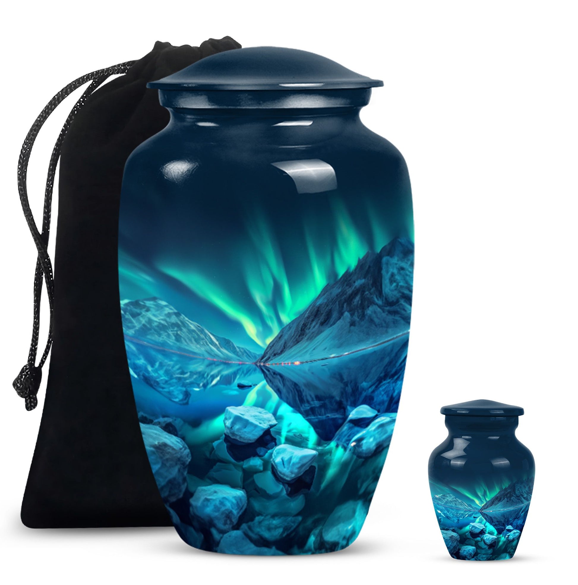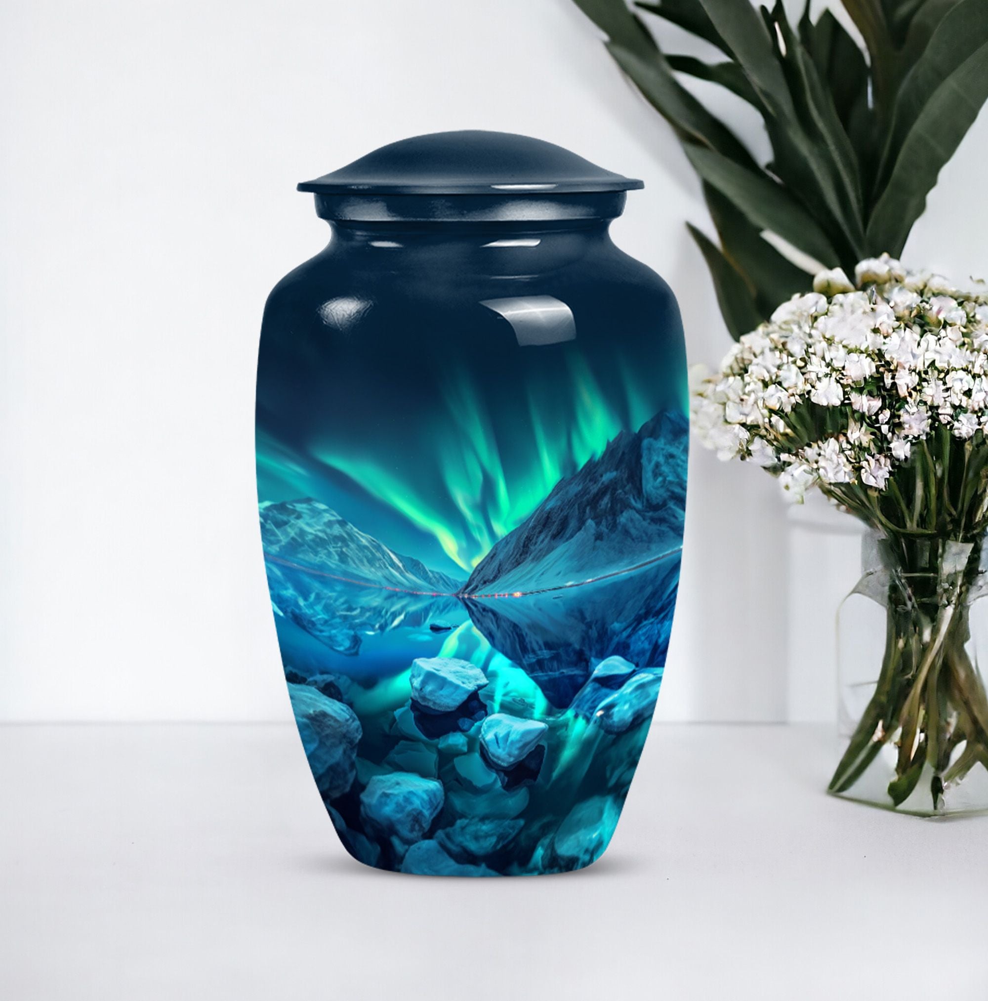 Introducing the AURORA Urn, an exemplar of a beautifully sculptured memorial medium urns for ashes. This religious and ceremonial urn tailored for adults and seniors is fashioned with an abstract theme and meticulously crafted from robust but lightweight aluminium. While it weighs only 3.3 pounds, its dimensions offer an ample capacity, standing at 10 inches with a volume to comfortably hold up to 200 cubic inches. Besides, AURORA has uniquely addressed personalization needs with a choice for engraved names, creating a tribute that is intimately personal. The cremation urn, included with a luxuriously soft velvet pouch, ensures respectful containment of ashes. The AURORA Urn; it's more than an urn for dad or a burial urn for human ashes adult. It's a touching, tangible reminder of your loved ones.
