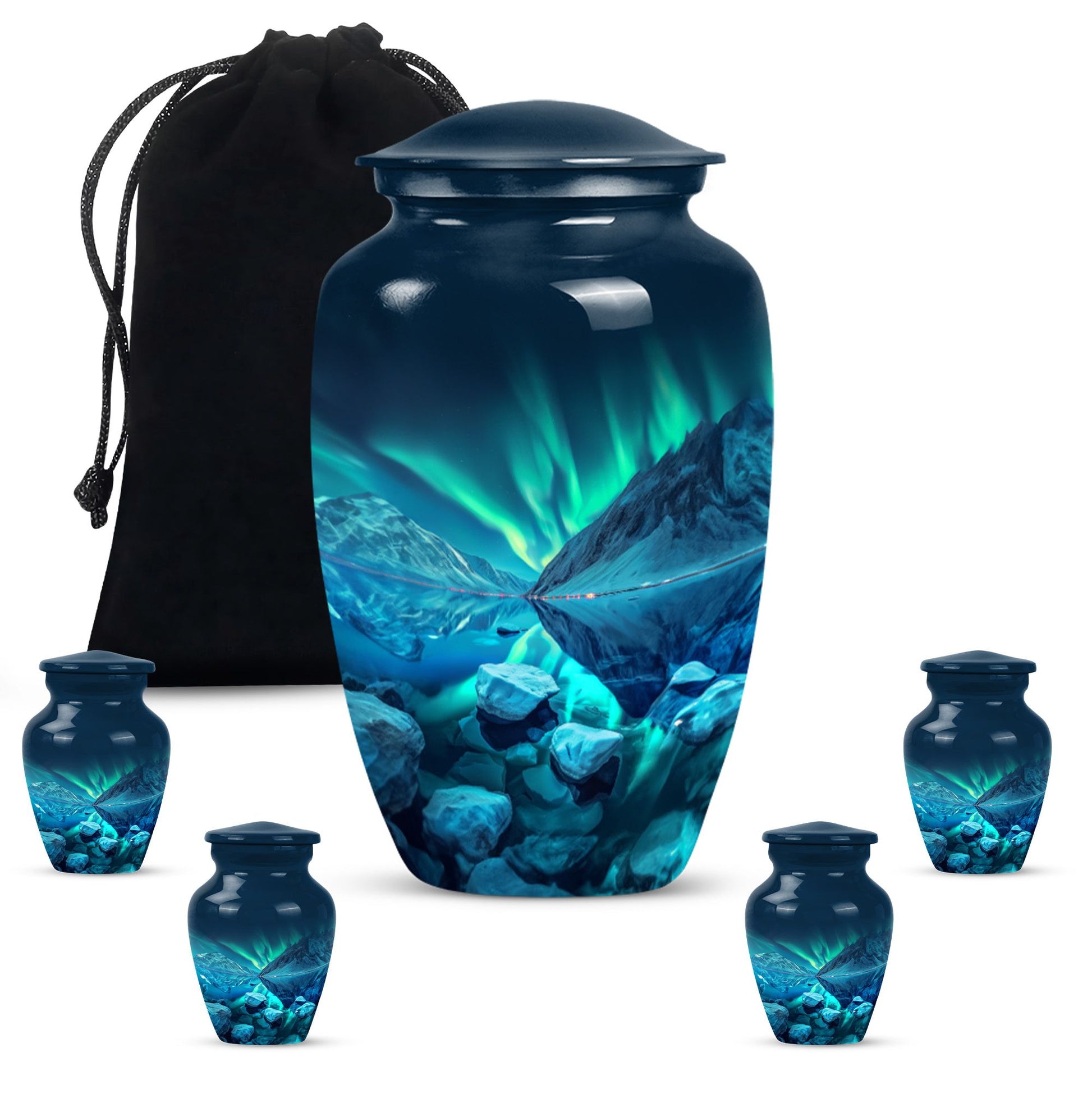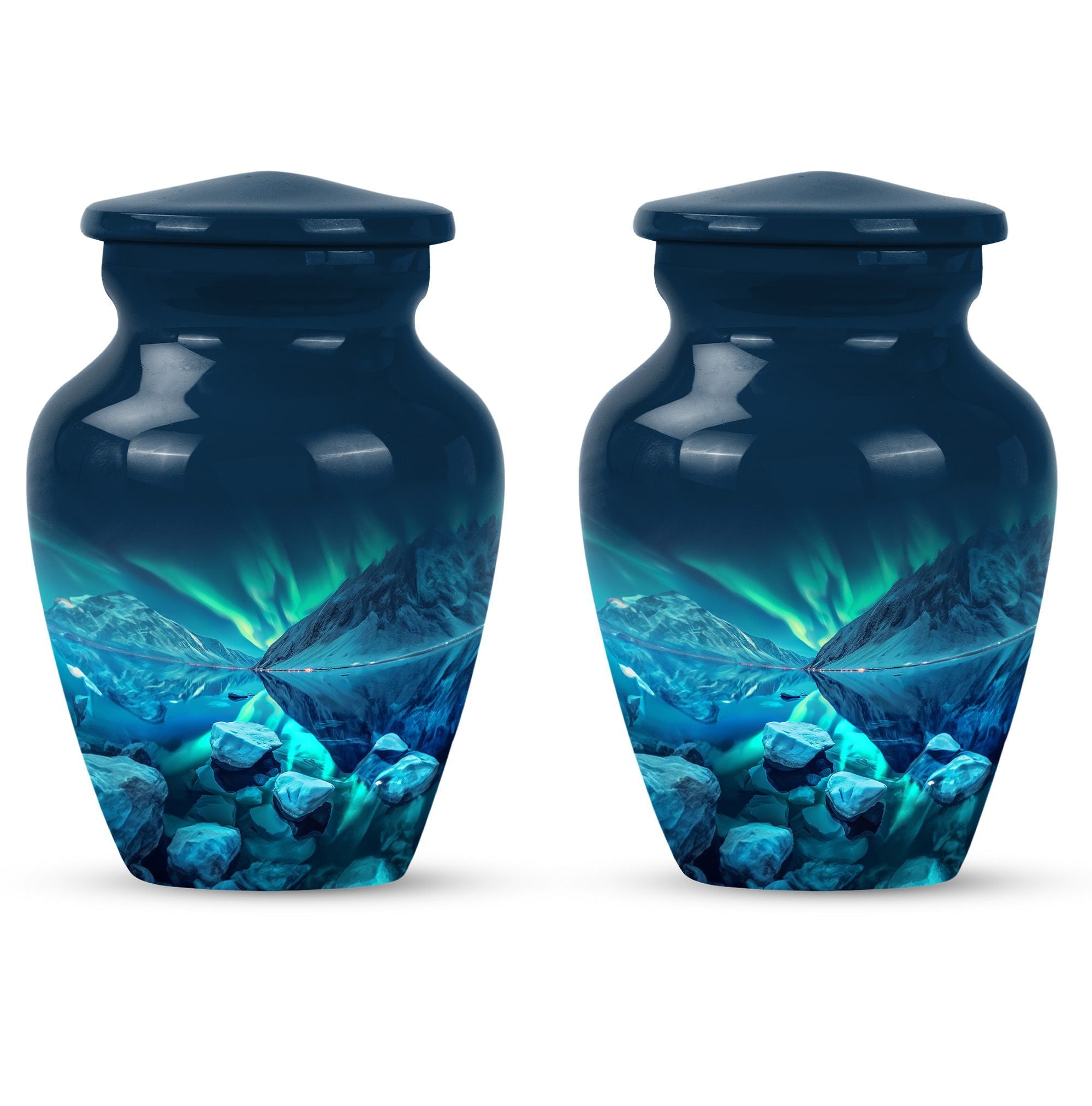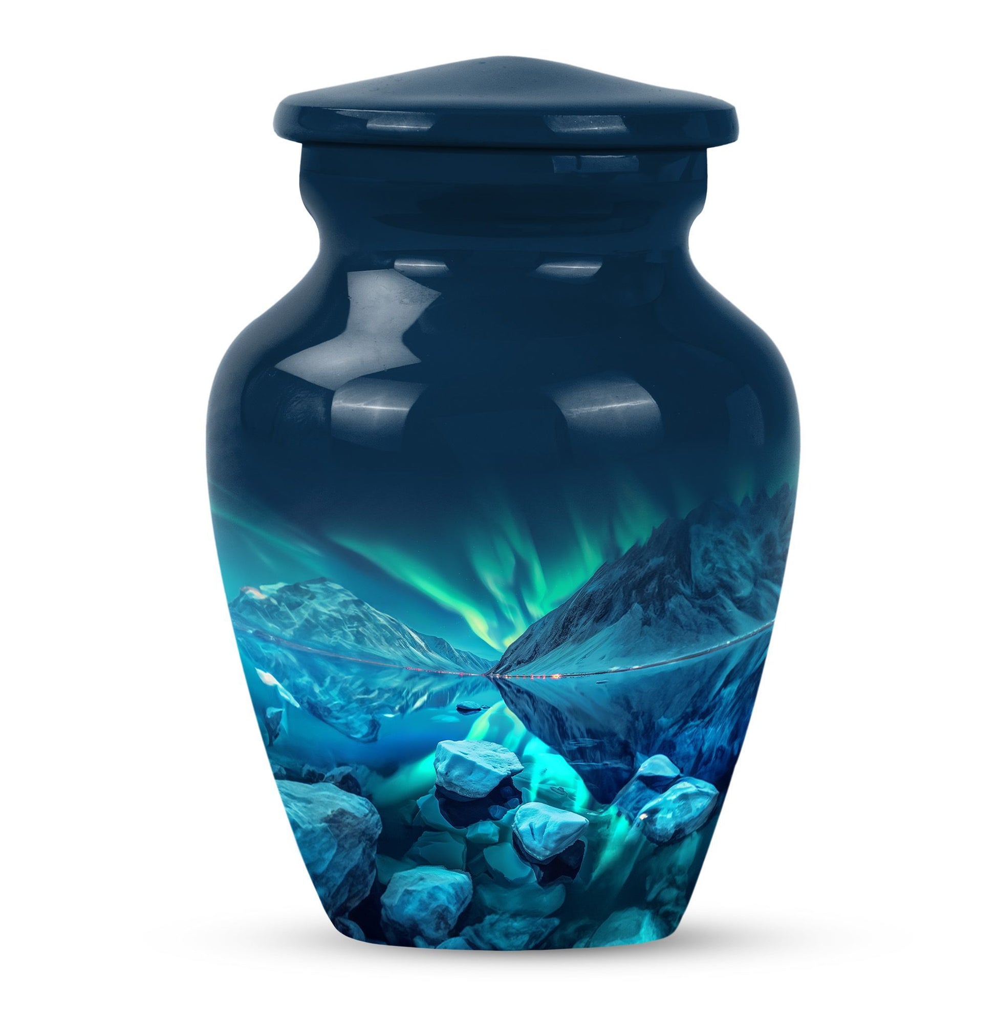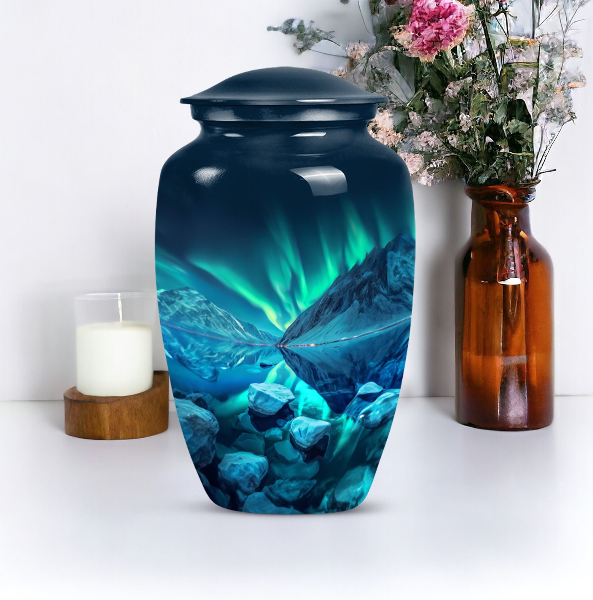 Introducing the AURORA Urn, an exemplar of a beautifully sculptured memorial medium urns for ashes. This religious and ceremonial urn tailored for adults and seniors is fashioned with an abstract theme and meticulously crafted from robust but lightweight aluminium. While it weighs only 3.3 pounds, its dimensions offer an ample capacity, standing at 10 inches with a volume to comfortably hold up to 200 cubic inches. Besides, AURORA has uniquely addressed personalization needs with a choice for engraved names, creating a tribute that is intimately personal. The cremation urn, included with a luxuriously soft velvet pouch, ensures respectful containment of ashes. The AURORA Urn; it's more than an urn for dad or a burial urn for human ashes adult. It's a touching, tangible reminder of your loved ones.