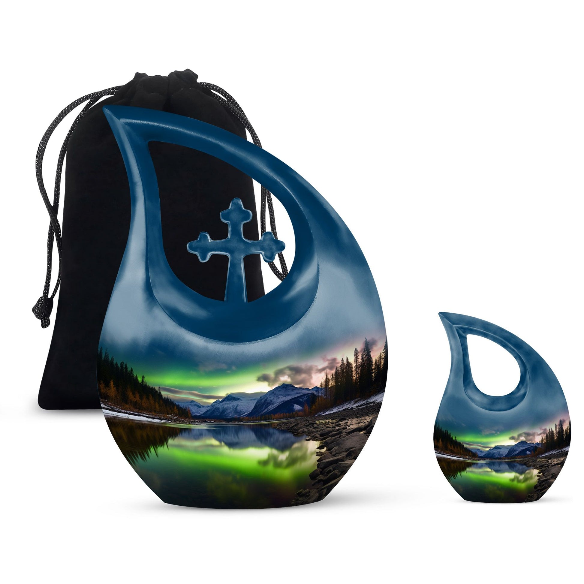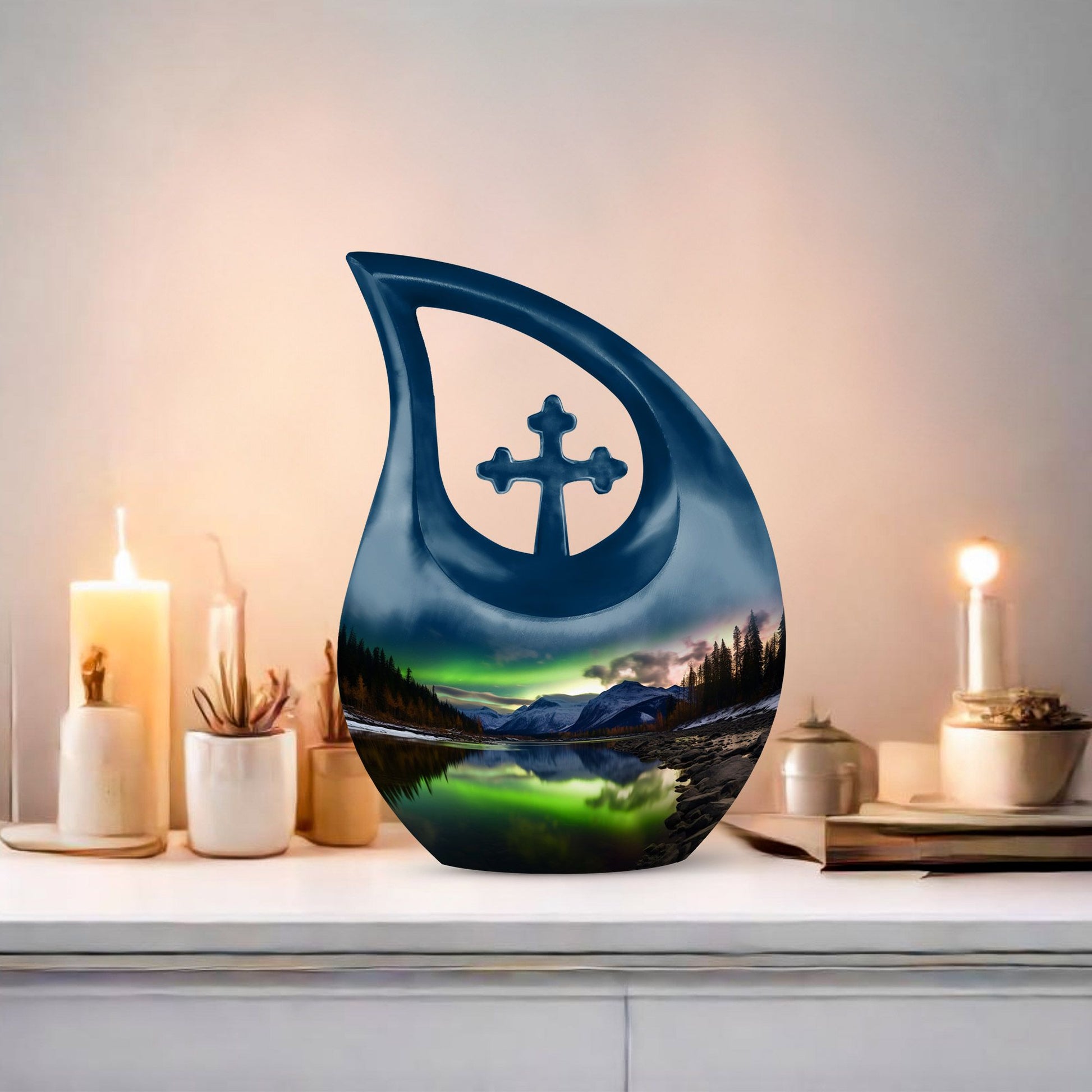 Crafted from premium aluminum, this urn adult cremation piece combines elegance and durability. The soft, scenic artwork portrays the harmony of nature — mountains, sky, and still waters — offering comfort and serenity. Suitable for cremation urn adult ash or cremation urn human ash, this urn provides a dignified resting place for loved ones. Families can also pair it with cremation keepsakes ashes or cremation urns adult women for smaller memorials and shared remembrance.