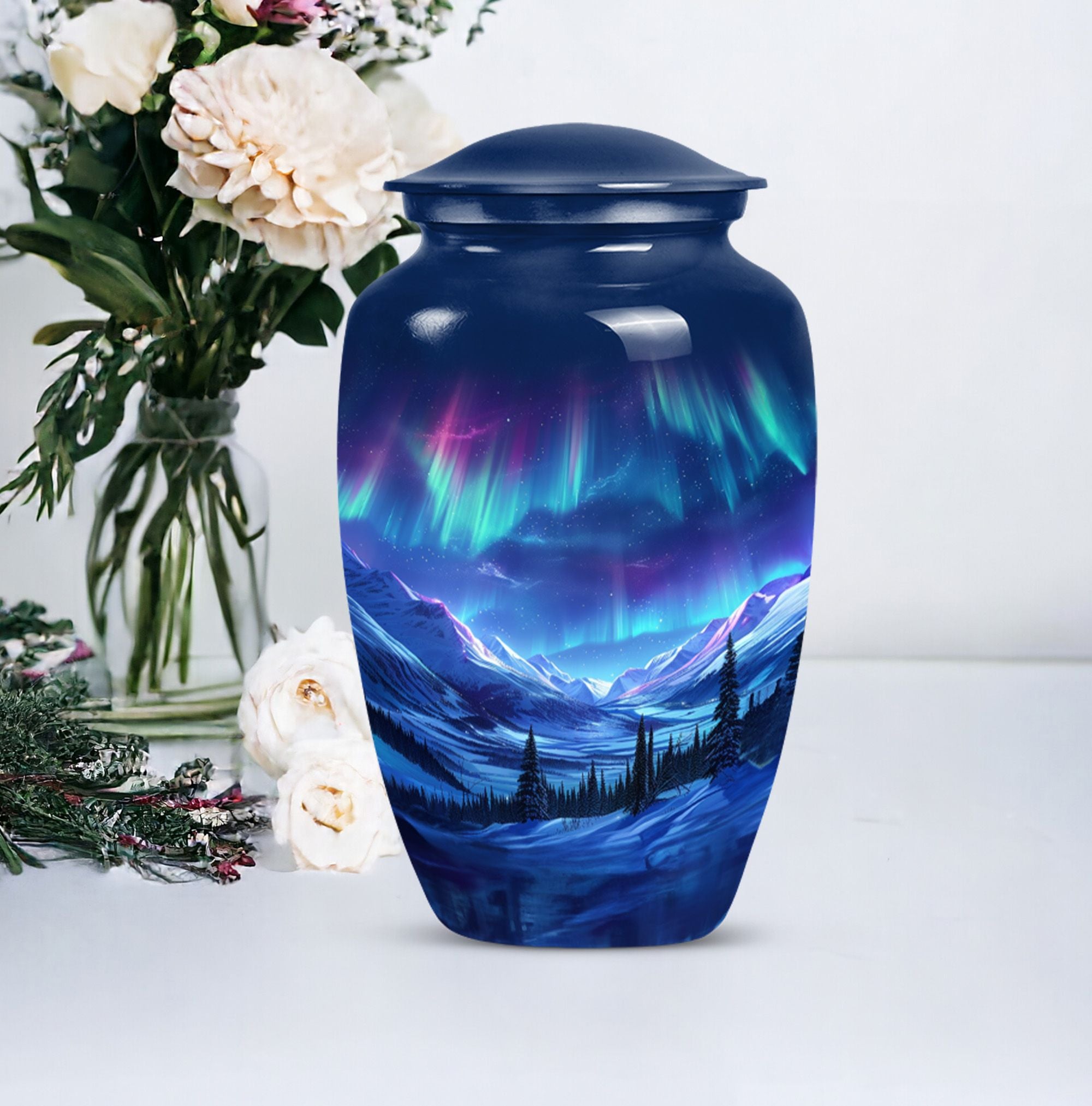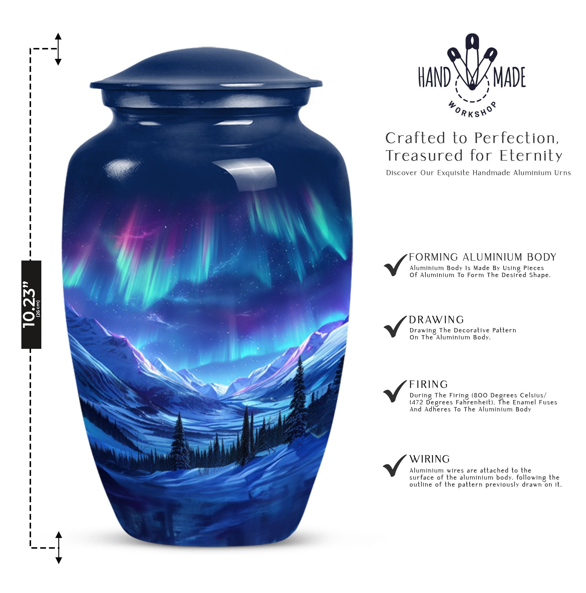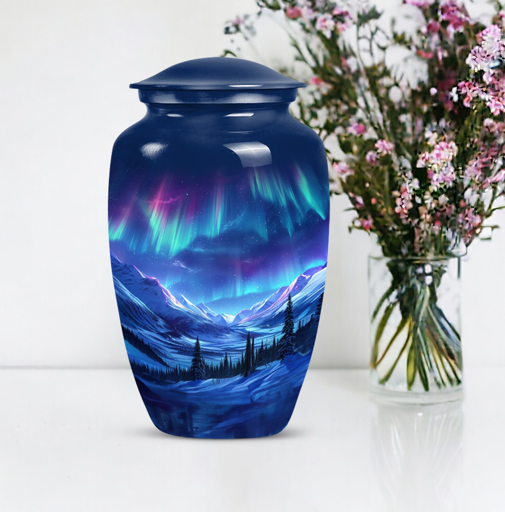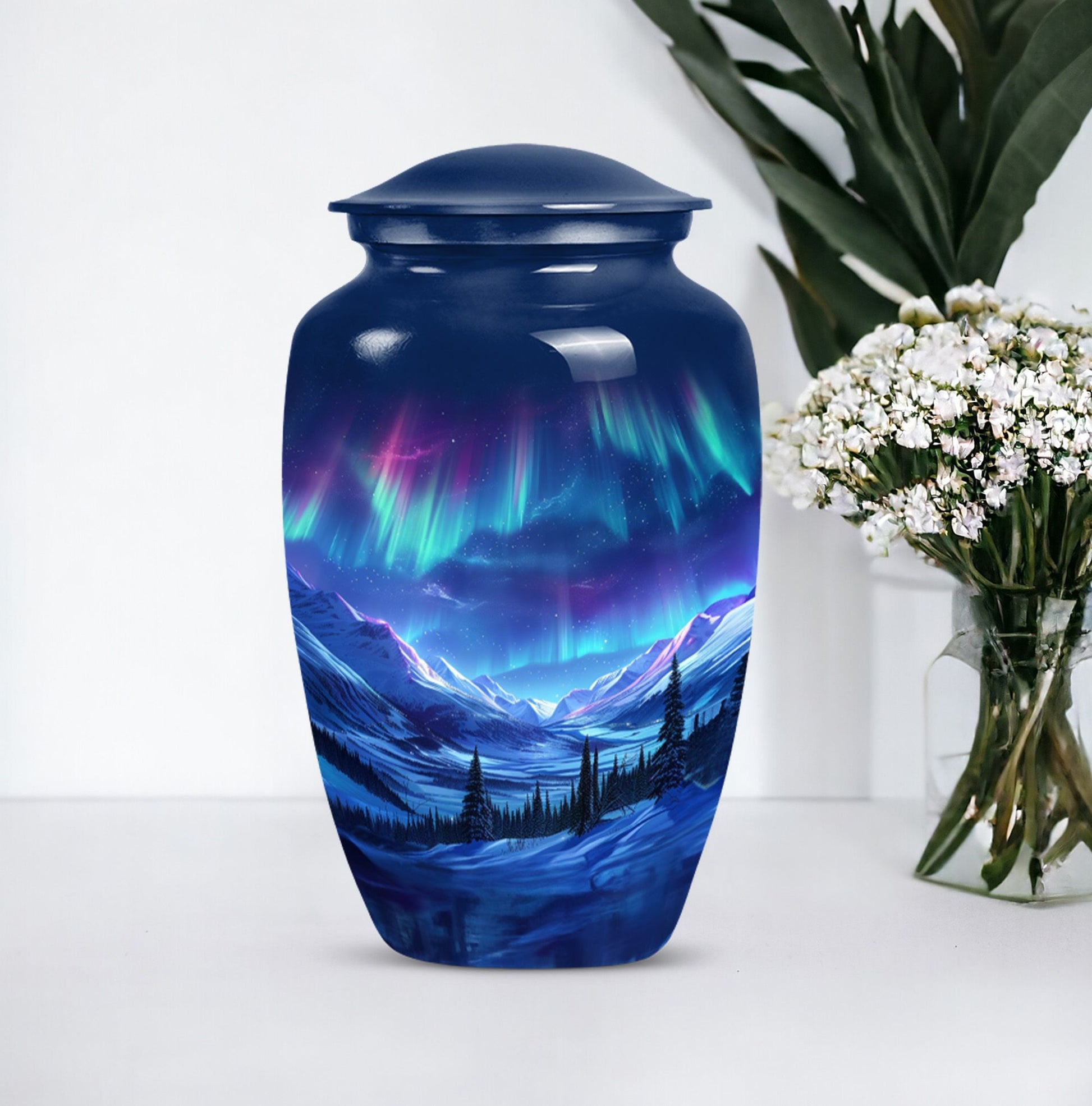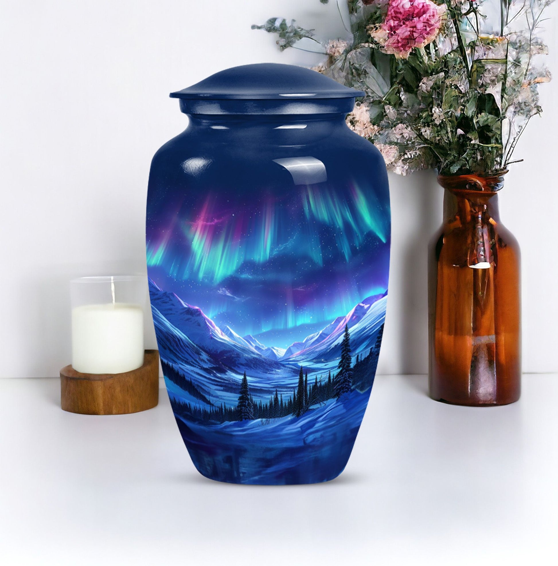 Experience serenity and peace with our AURORA Urn, a superior choice for those on the hunt for high-quality funeral medium-sized urns for human ashes. This 'Abstract' themed cremation urn offers a size of 10 inch, making it an impeccable option when searching for large urns. Made from robust and reliable aluminium, there is a comfort found in its solid weightiness of 3.3 pounds and compact dimensions of 10 inches in height. Boasting a capacity of 200 cubic inches, this urn promises ample space for ashes. The package also includes a gorgeously soft velvet pouch, specifically designed for the containment and protection of ashes, promising a respectful and secure solution. An added advantage of the AURORA urn, is the customization option where you can personalize the urn with engraved names, adding a touch of intimacy and connection. Perfect for memorial ceremonies, the urn harmoniously merges functionality and an elegant, timeless design, offering a comforting presence during times of grief. Notable keywords that amplify your search for this are 'memorial medium urn', 'urn human ash adult ash', 'urns for human ashes', and 'urns for cremation'. So, elevate your search with the AURORA urn, an exemplary blend of quality, respectfulness, and personal touch.