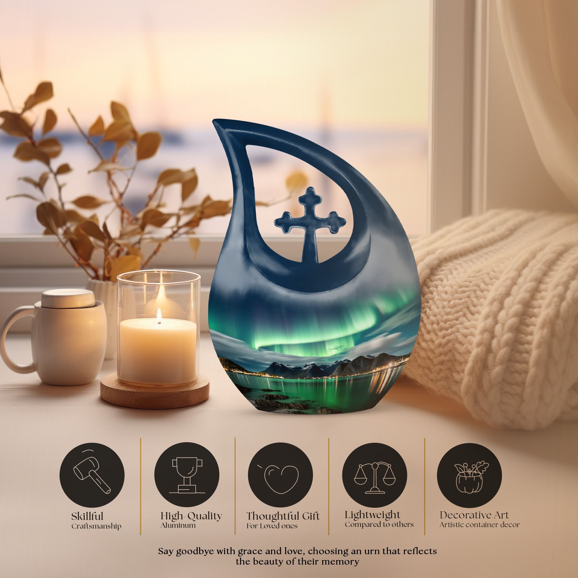 Expertly handcrafted, this large cremation urn is made from high-quality aluminum, offering durability and elegance. The deep hues and shimmering finish resemble the mesmerizing colors of the northern lights, making it one of the most large decorative urns available. Designed with care and detail, it ensures both functionality and artful presentation. Ideal for home display or memorial placement, this cremation urn large adult provides a safe and secure space for ashes with its screw-top lid.