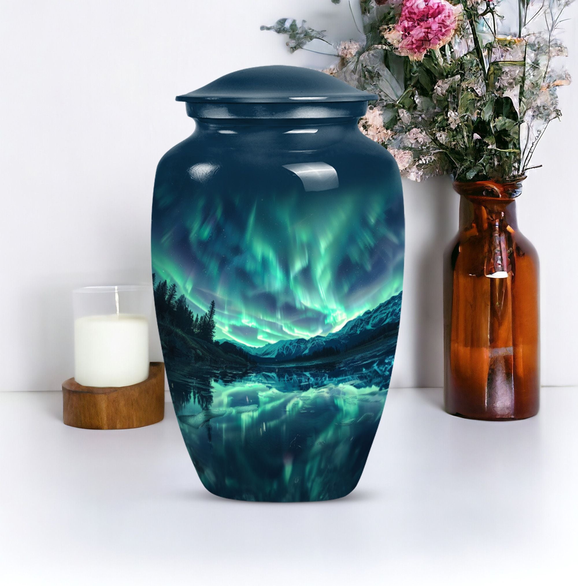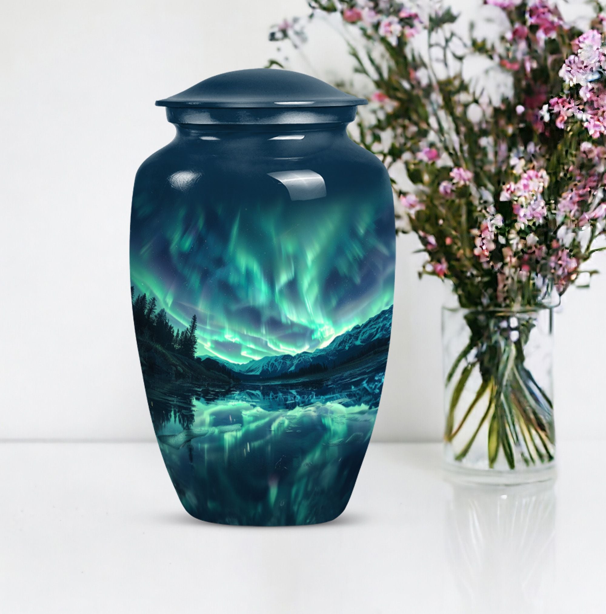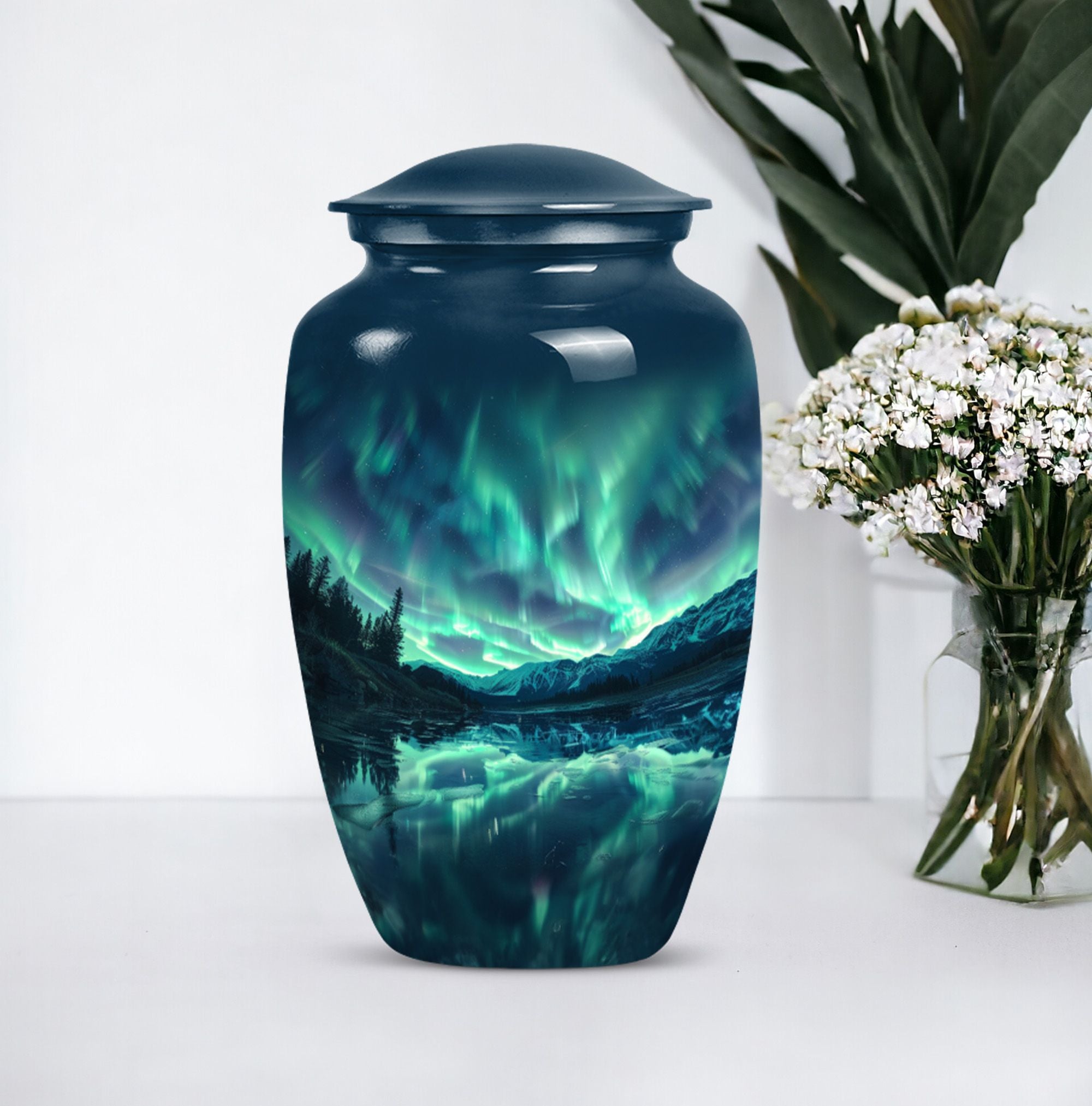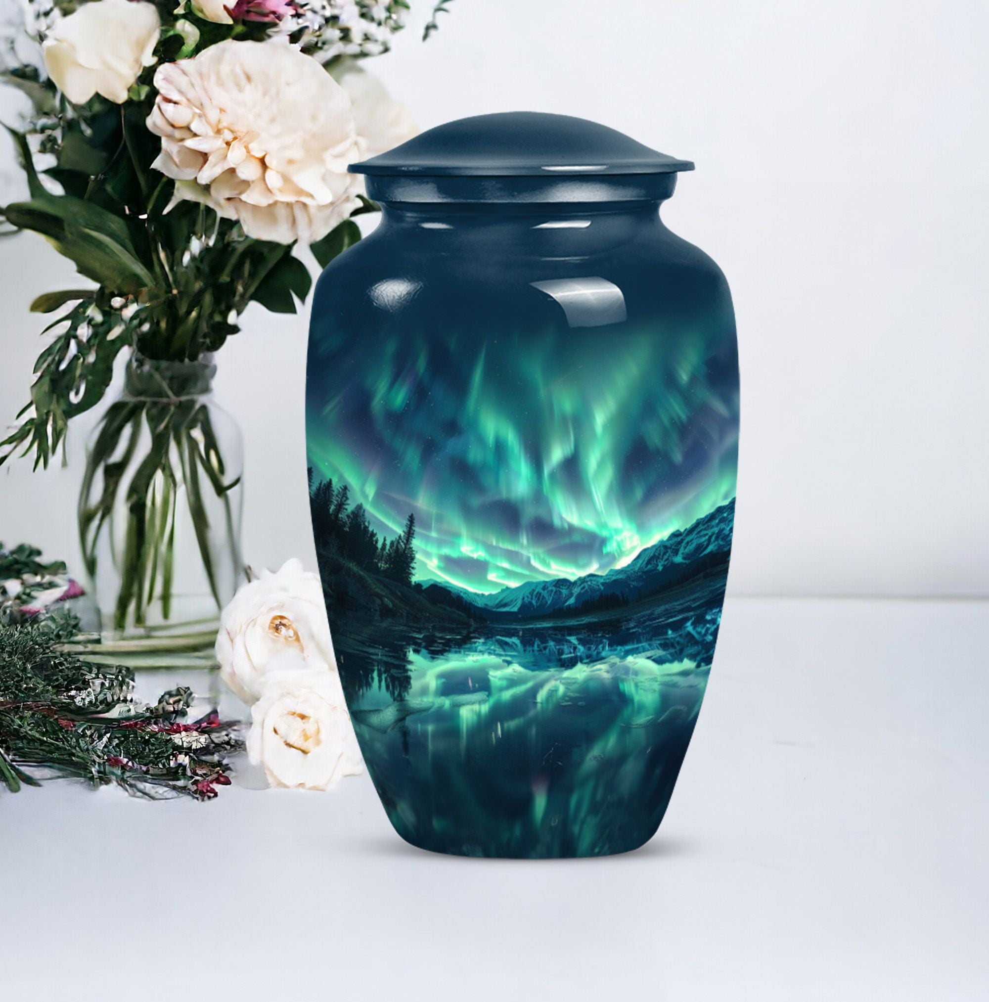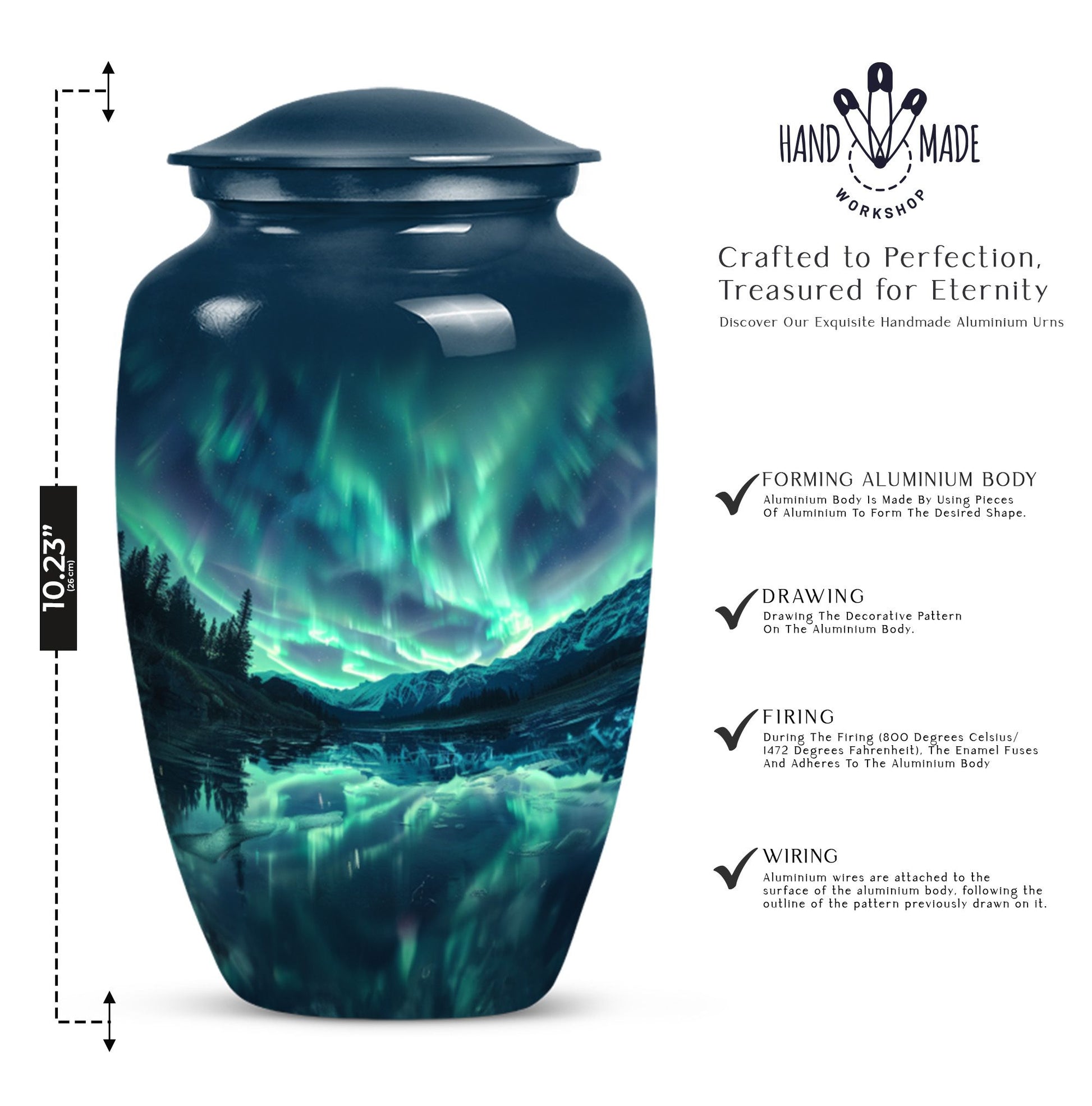 Honor your loved ones with the AURORA Urn, an exquisite representation of eternal tranquility. Designed exclusively for the memorial urns category, this cremation urn for dad is crafted using high-grade aluminium, promising durability for generations to come. The product measures 10 inches in height, weighing about 3.3 pounds, and has a thoughtful capacity of 200 cubic inches, sizable for any large urn requirement. Its smooth, abstract theme radiates a sense of peace, gifting comfort to the bereaved. It arrives in a velvet pouch ensuring safe containment of ashes, adding a touch of elegance to this heartfelt possession. Personalized customization is available with options for engraved names, making this urn for human ashes a truly unique memorial. The AURORA Urn surpasses others in its category, not just as a benign product but as a tranquil symbol of recall, respect, and reminiscence. Opt for the AURORA Urn and let the soothing memory of your loved ones be preserved with grace.