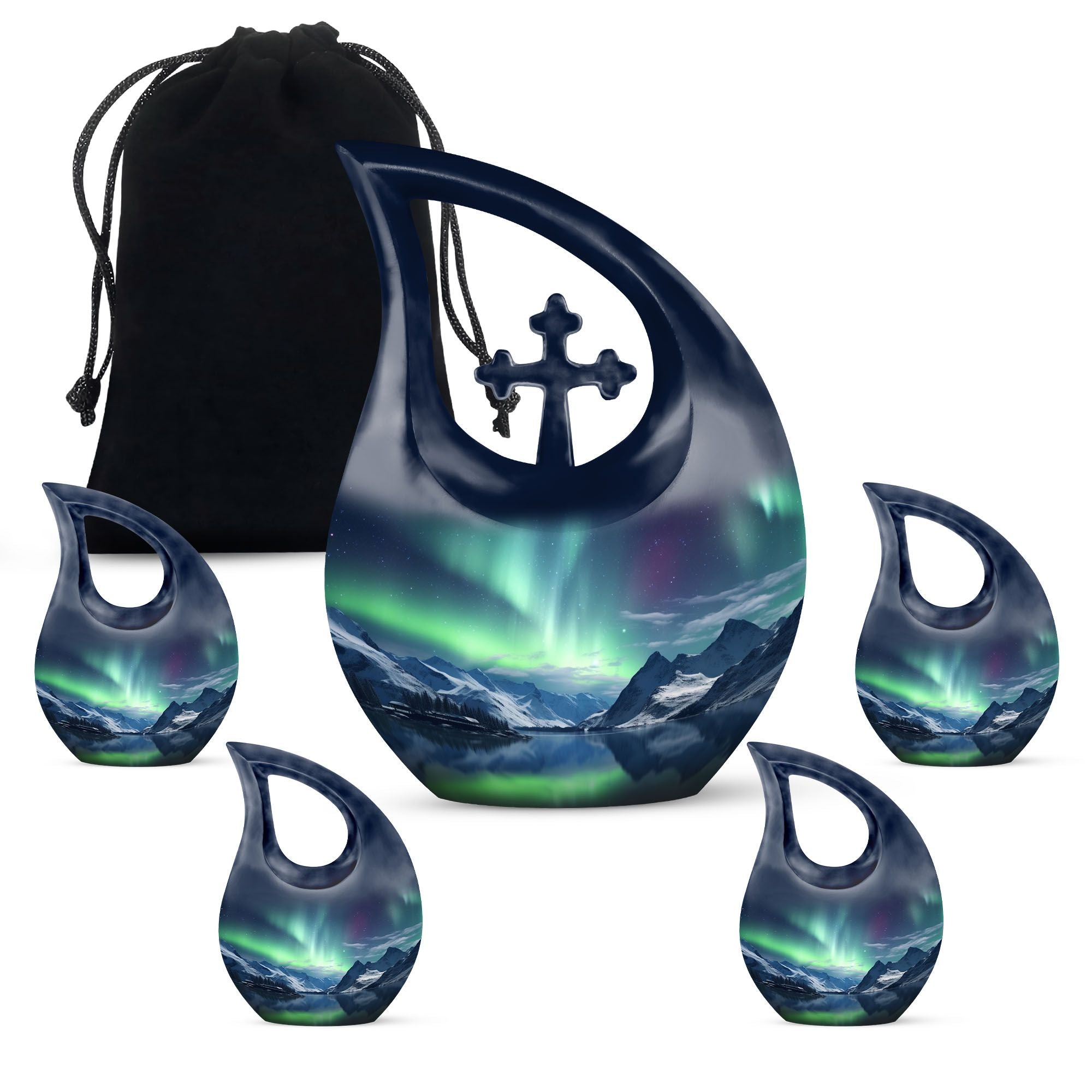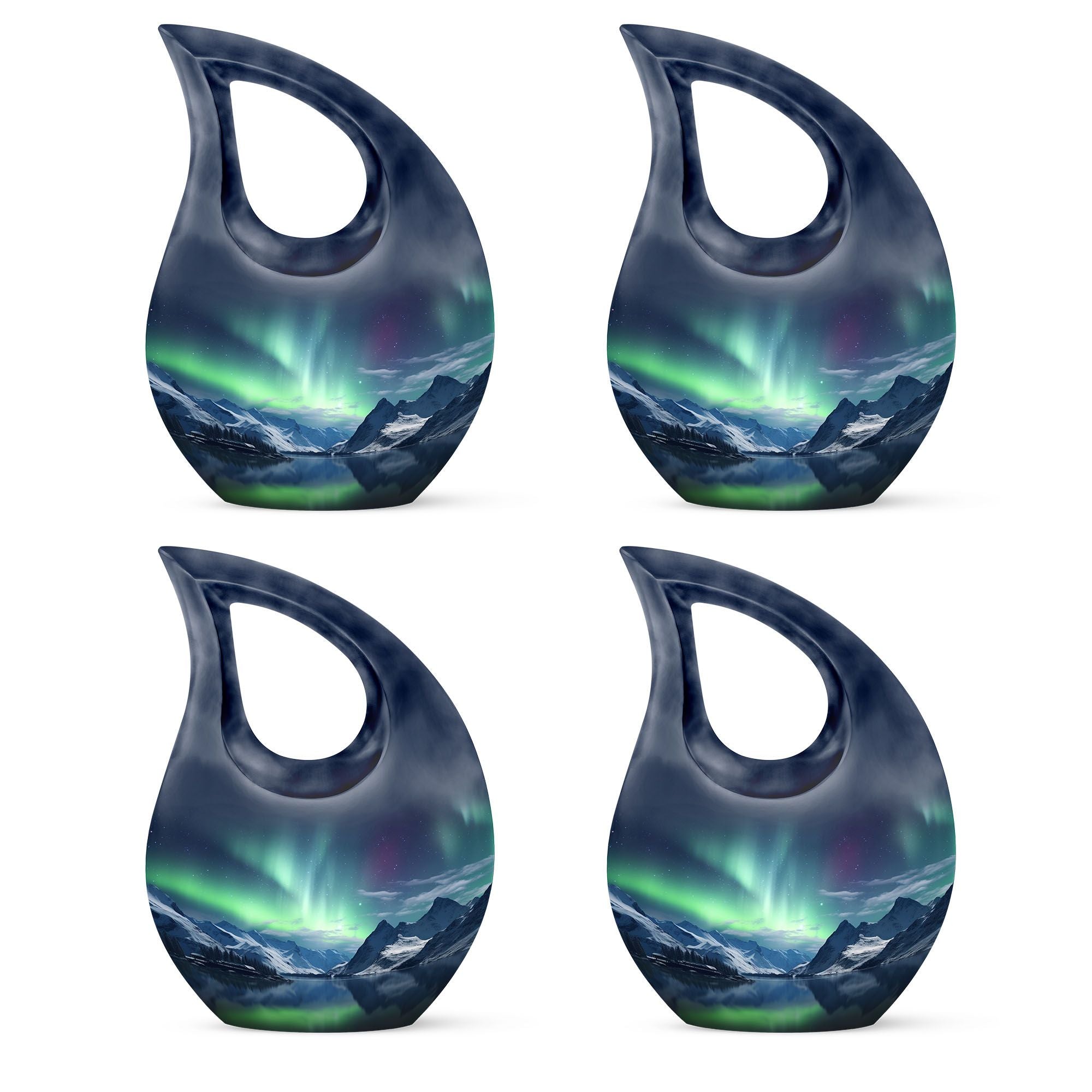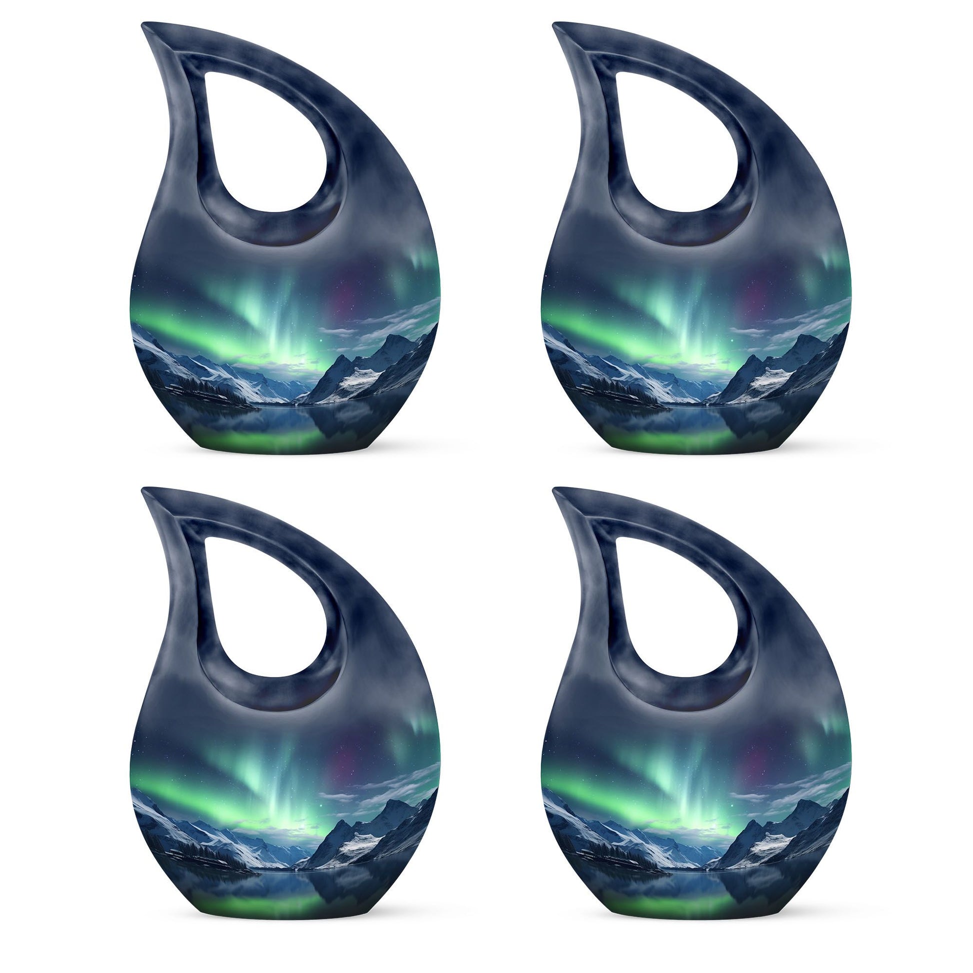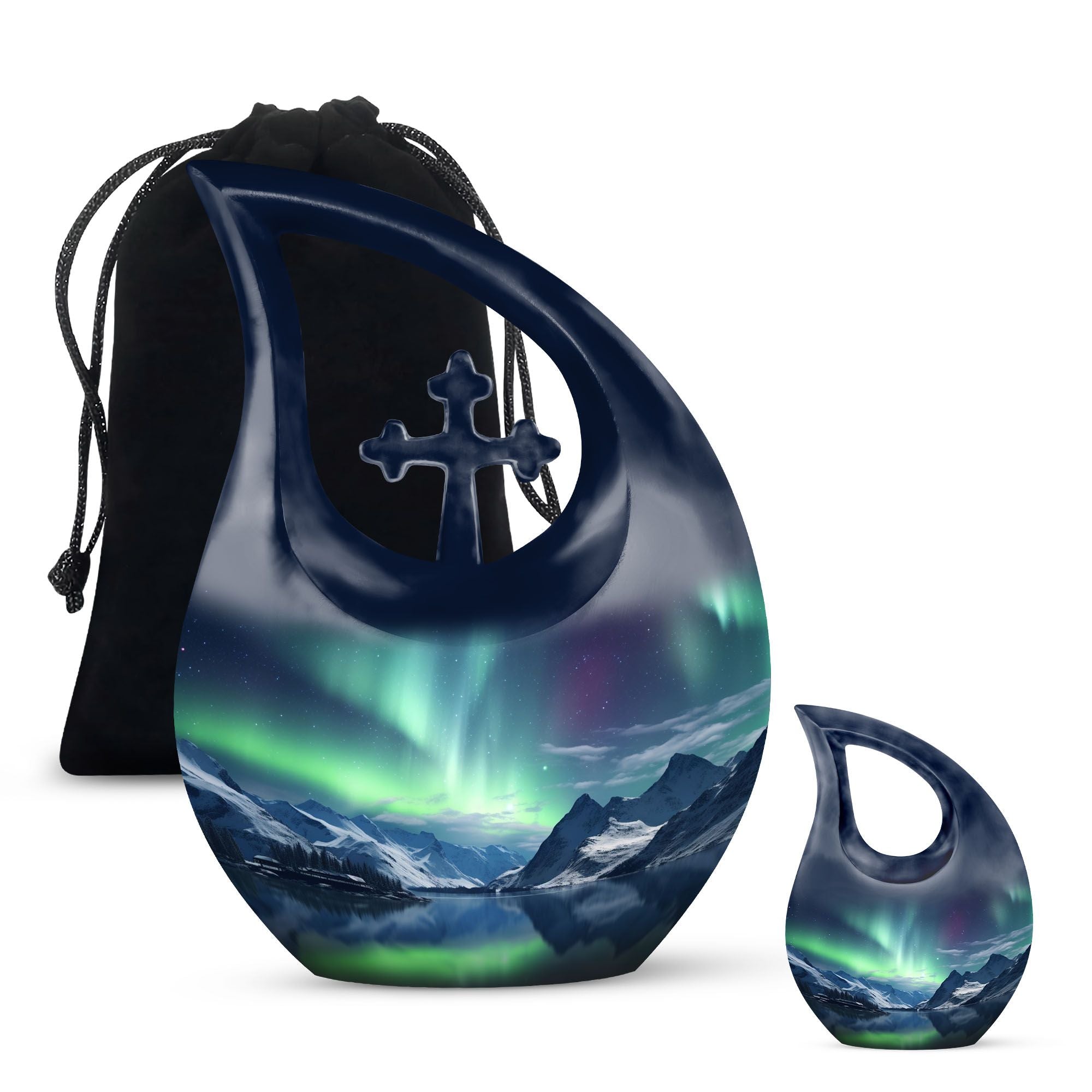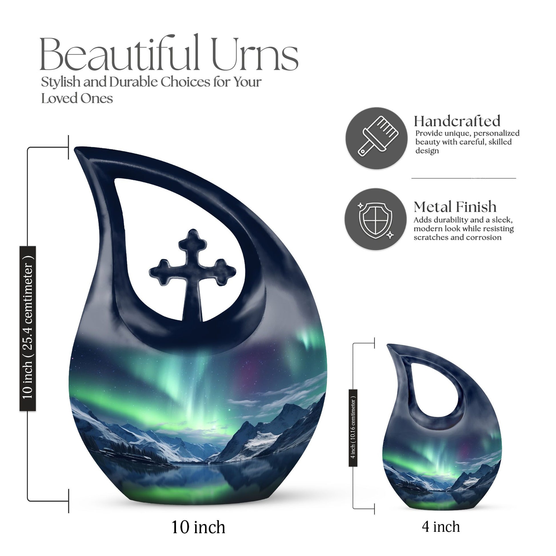 Crafted from durable, high-quality aluminum, this large decorative urn for human ashes features a vivid hand-painted mountain design illuminated by the colors of the northern lights. The glossy finish enhances its beauty while ensuring long-lasting preservation. Each urn human ashes large is carefully designed with a secure screw-top lid to keep ashes safe and undisturbed. Suitable as a large urn human ashes for men or an urn for ashes for women, it’s both elegant and versatile — ideal for home display or funeral ceremonies.