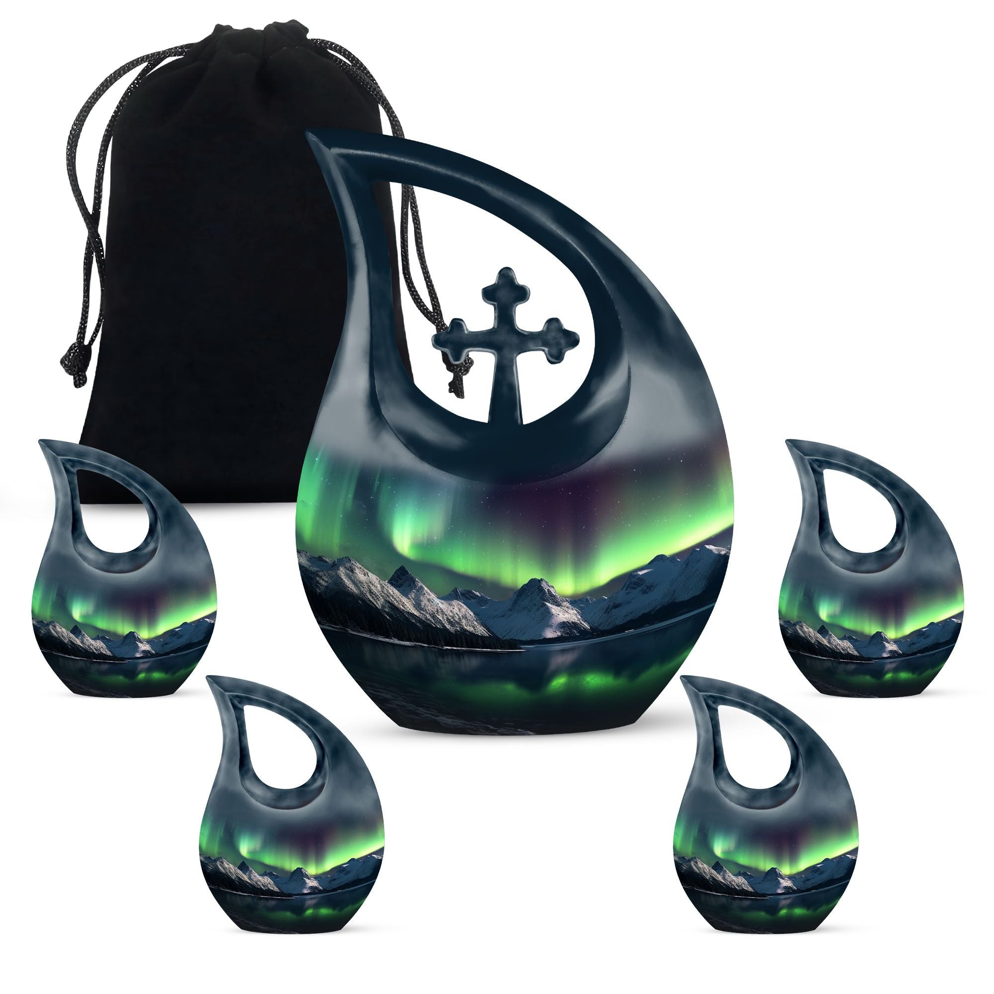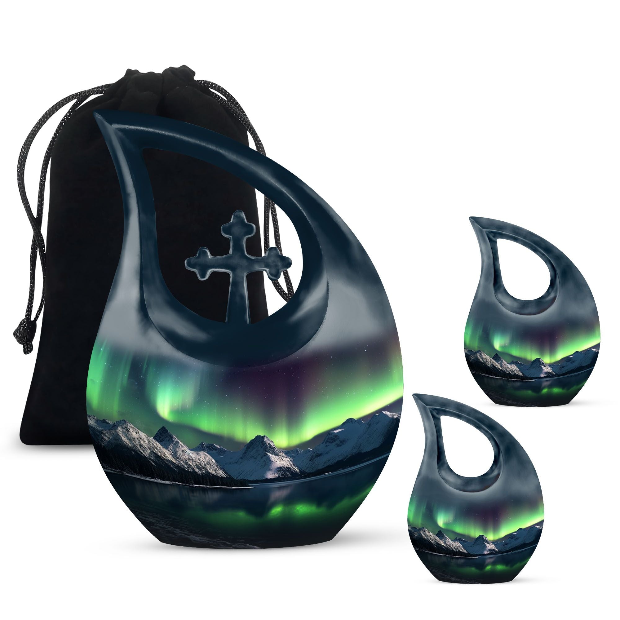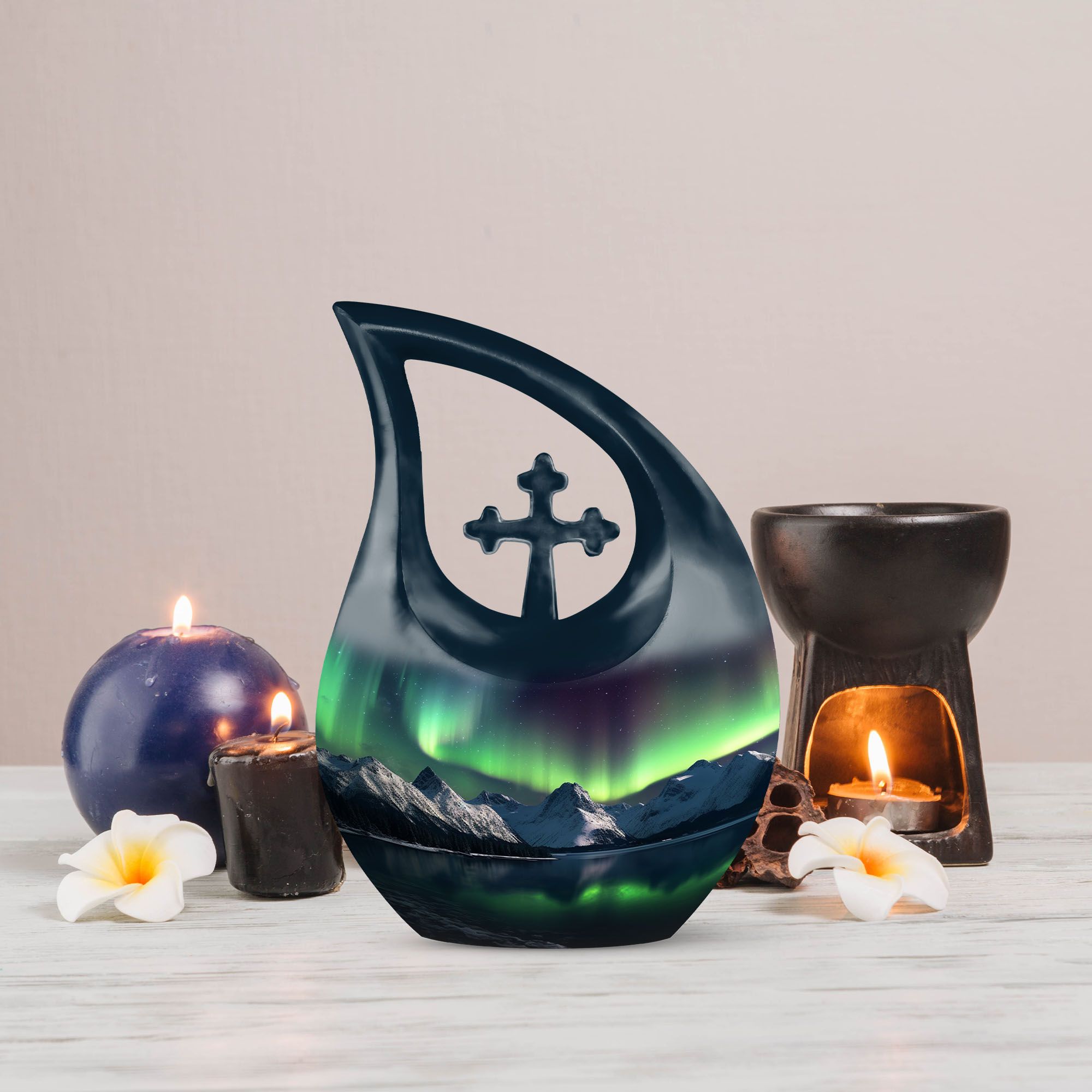 The Aurora Borealis Funeral Urn for Mother reflects the beauty of a soul forever remembered beneath the tranquil glow of the northern lights. Designed with compassion and care, this funeral urn for women serves as a graceful tribute to a beloved mother, wife, or friend. Its snowy mountain design and ethereal colors symbolize peace, love, and the eternal bond that continues to shine through cherished memories.