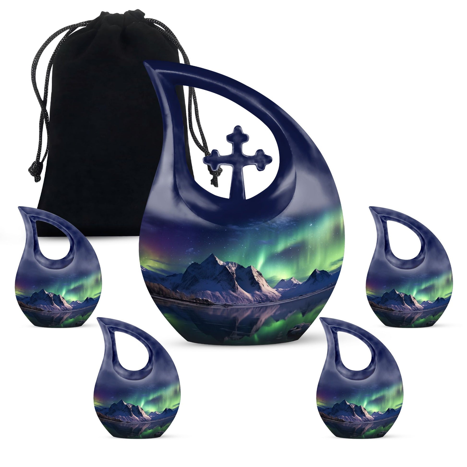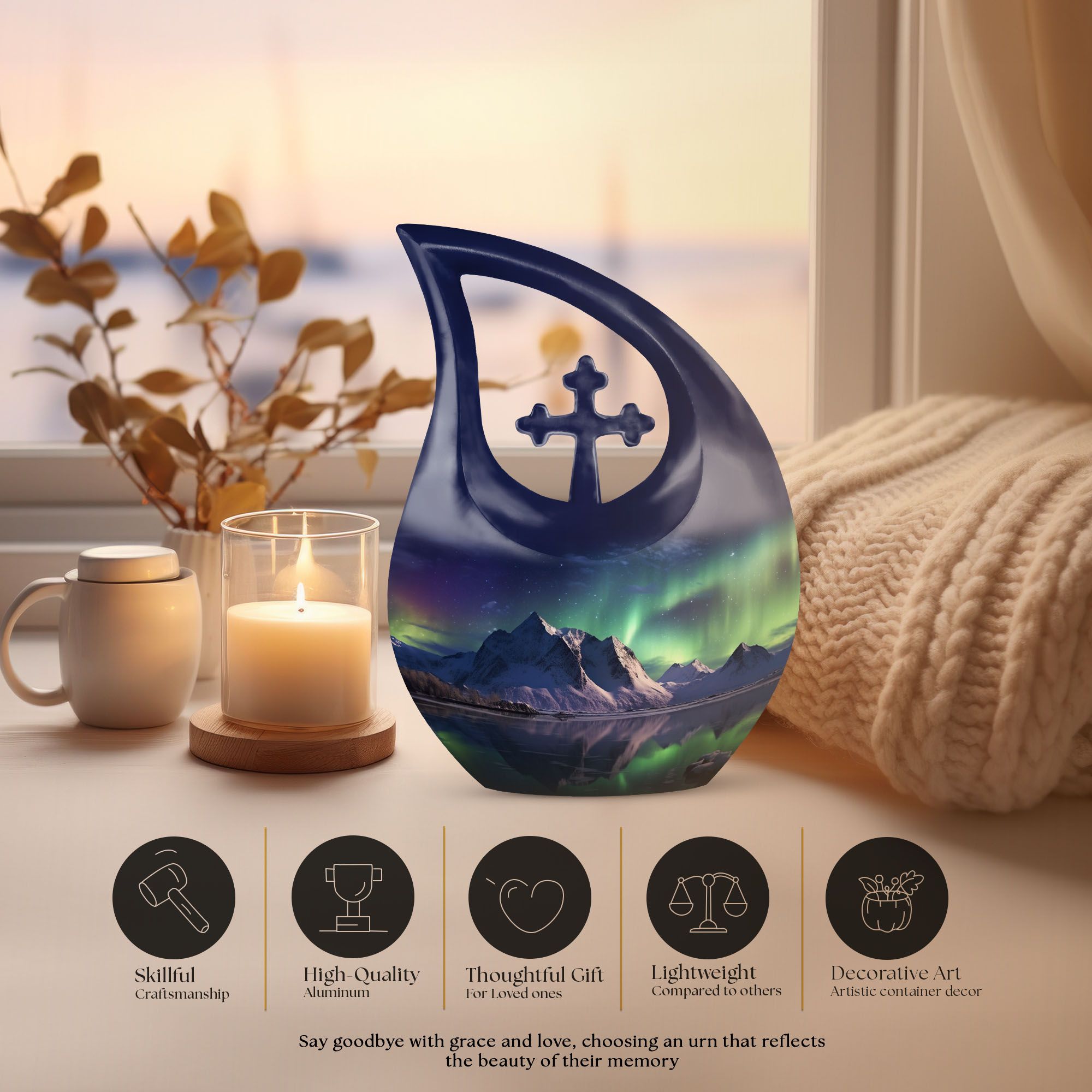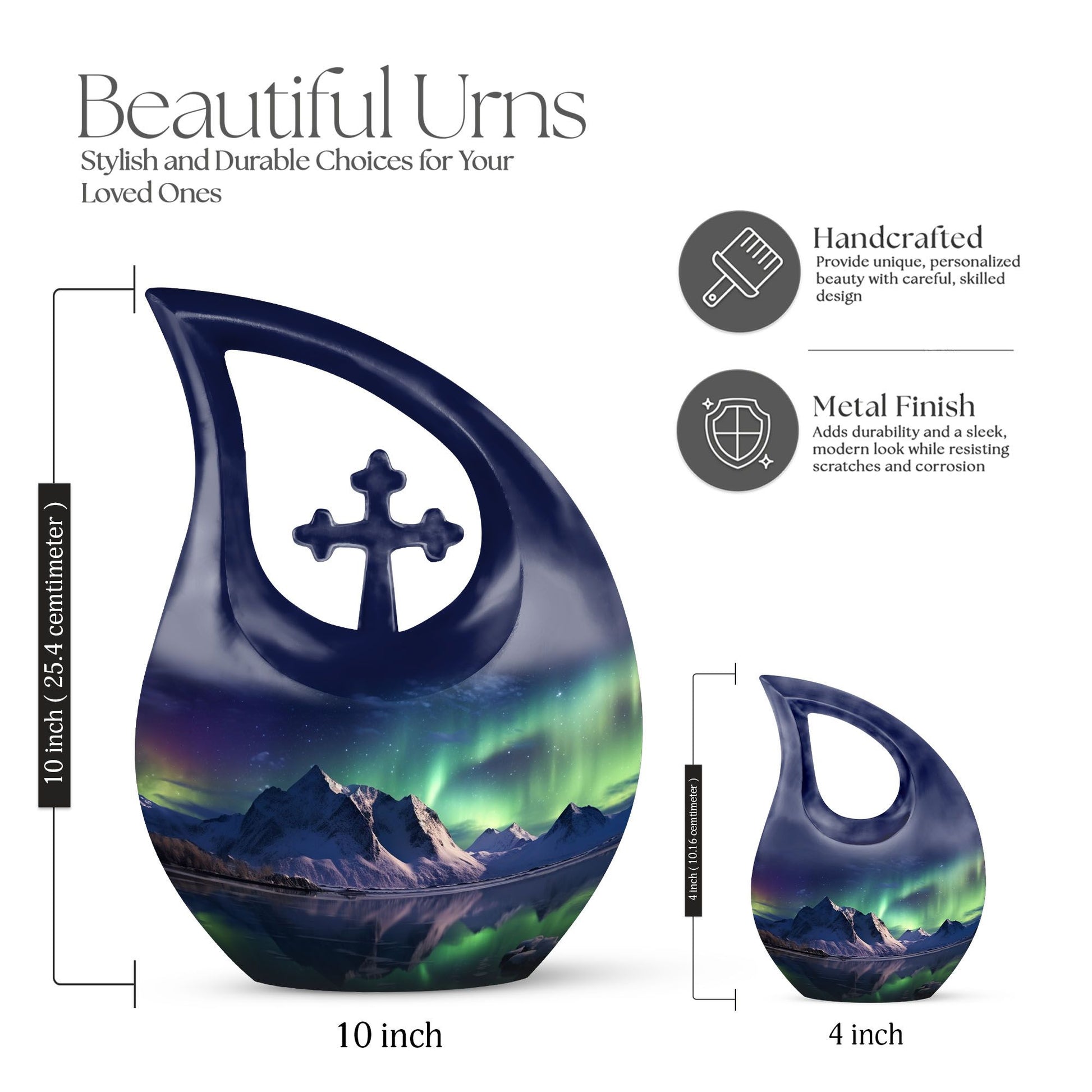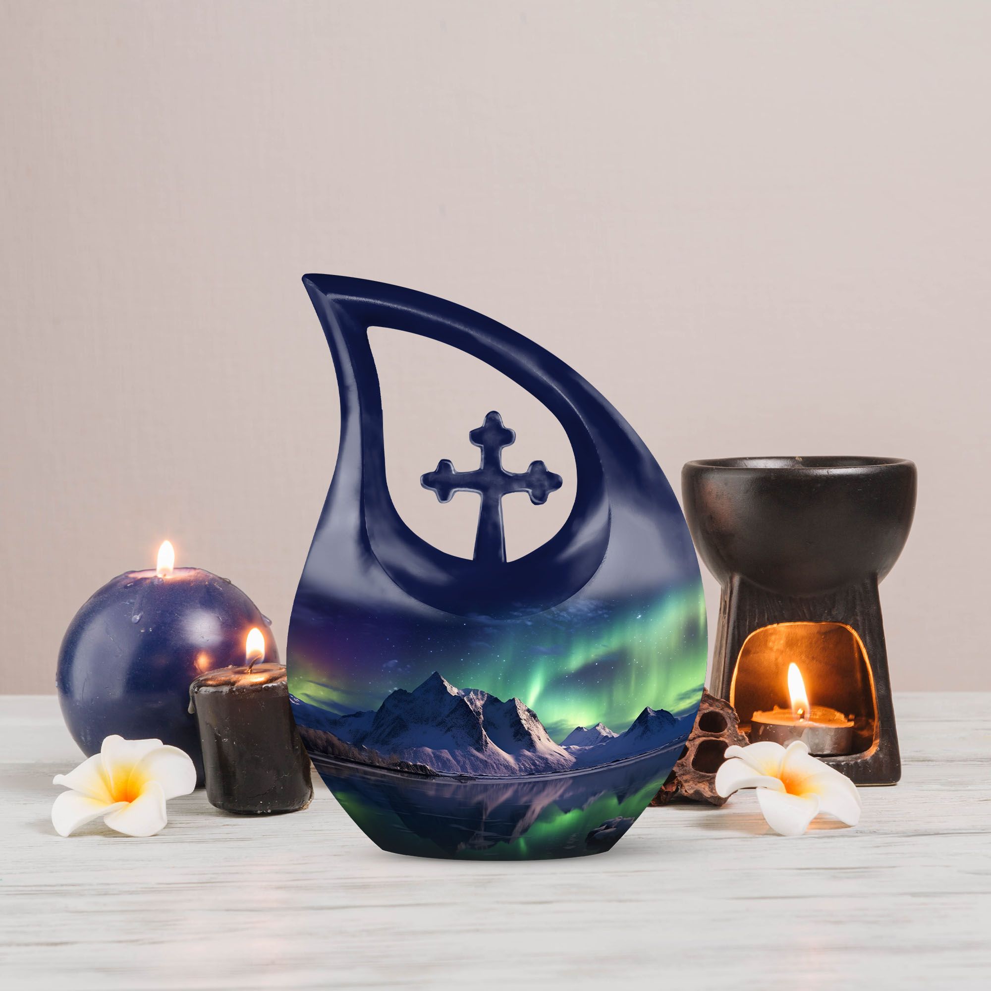 The Snowy Mountain Memorial Urn for Female captures the awe-inspiring beauty of the Aurora Borealis glimmering above tranquil mountain peaks. This stunning urn for cremation represents serenity, love, and everlasting remembrance — a heartfelt tribute to a soul that continues to shine bright beyond the horizon. Perfect for home memorials or burials, it provides families a comforting symbol of eternal light.