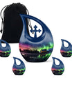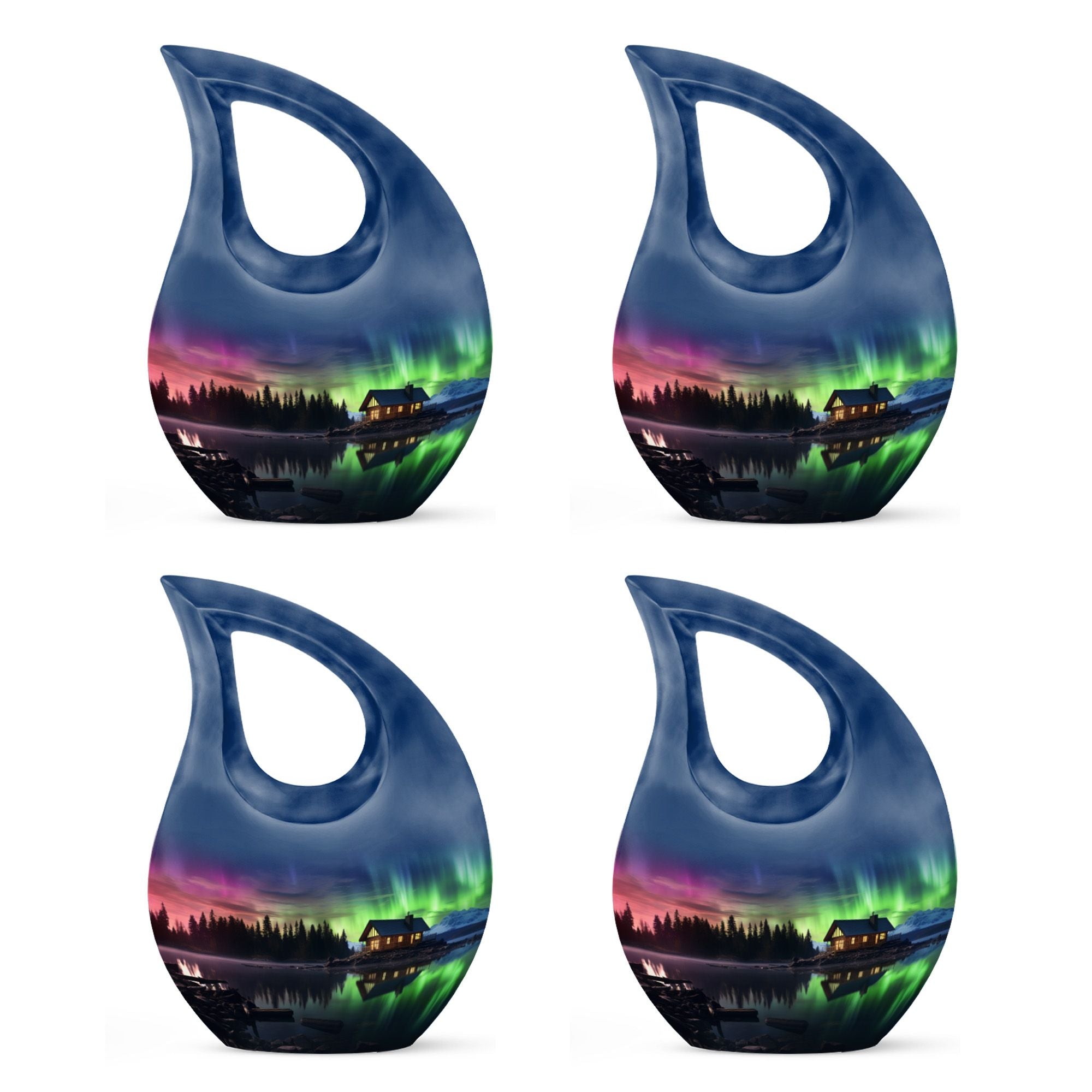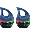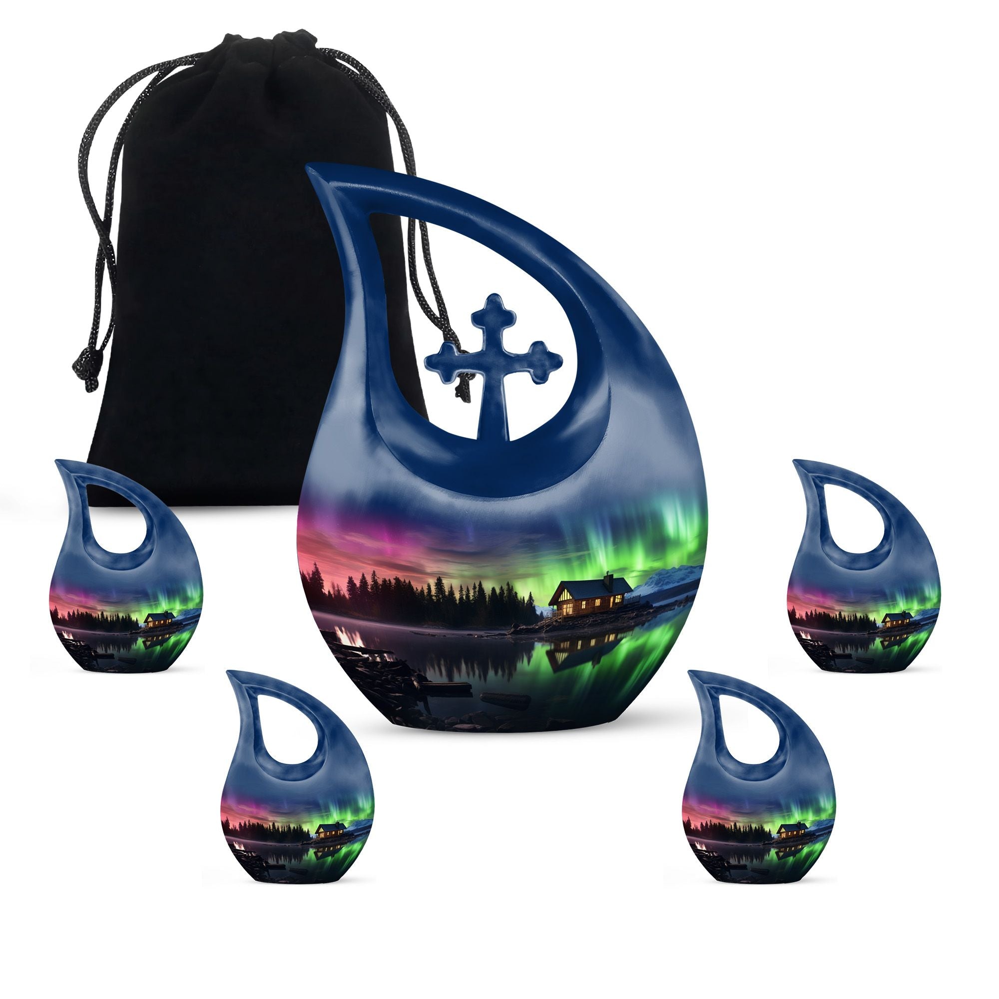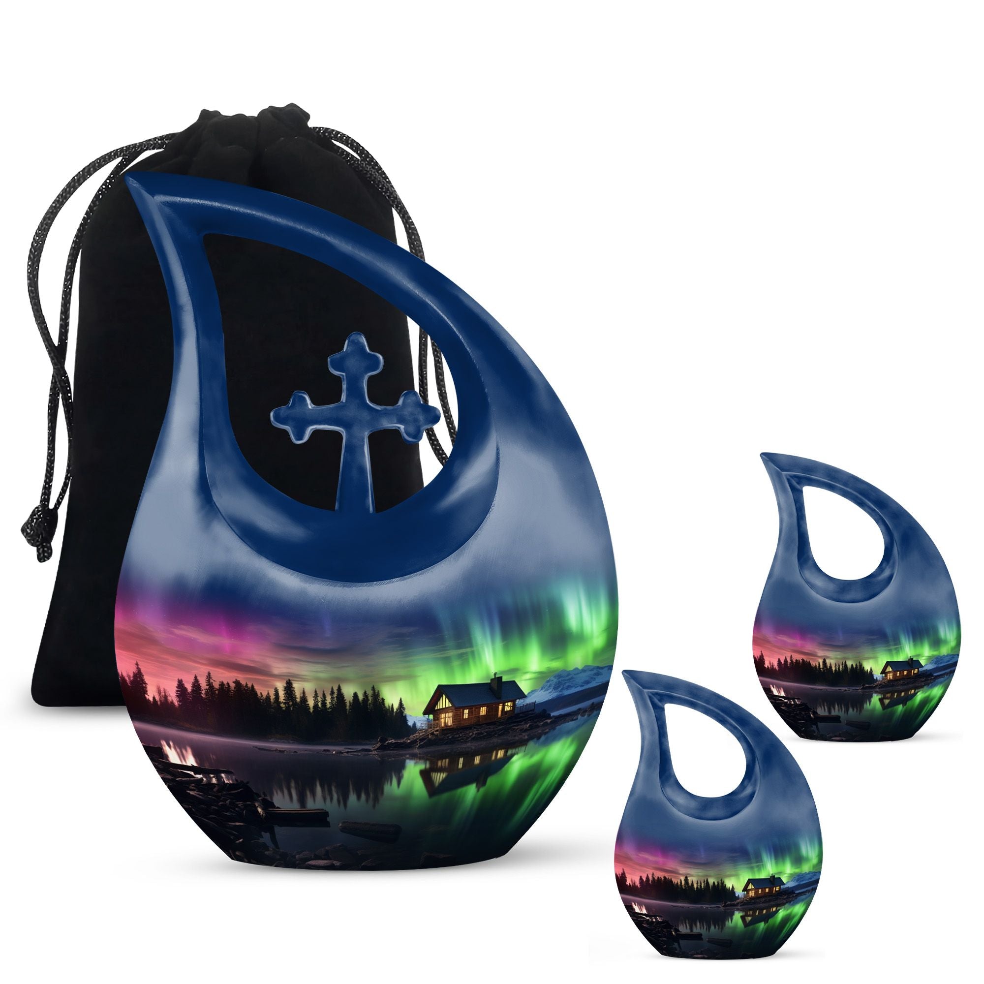Crafted from durable aluminum, this 10 inch urn features shimmering aurora hues dancing across a serene landscape, symbolizing peace, guidance, and enduring love. Its secure screw-top lid ensures long-lasting protection, making it suitable as a funeral urn, a funeral adult urn, or a classic funeral urn ashes display. This design also supports needs for cremation urns large & small combo sets or small funeral urns for shared remembrance. Families looking for funeral urns for human ashes small or funeral cremation options will appreciate the versatility and elegant appearance of this celestial memorial.