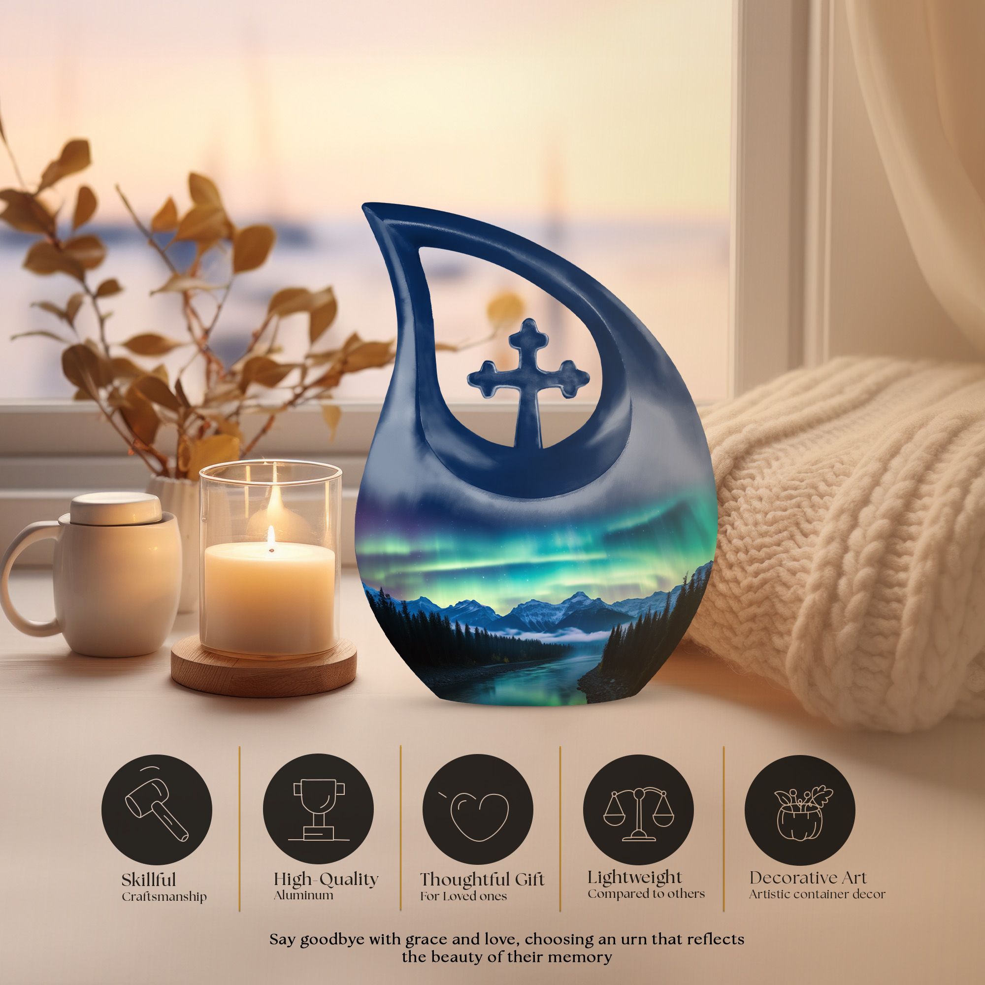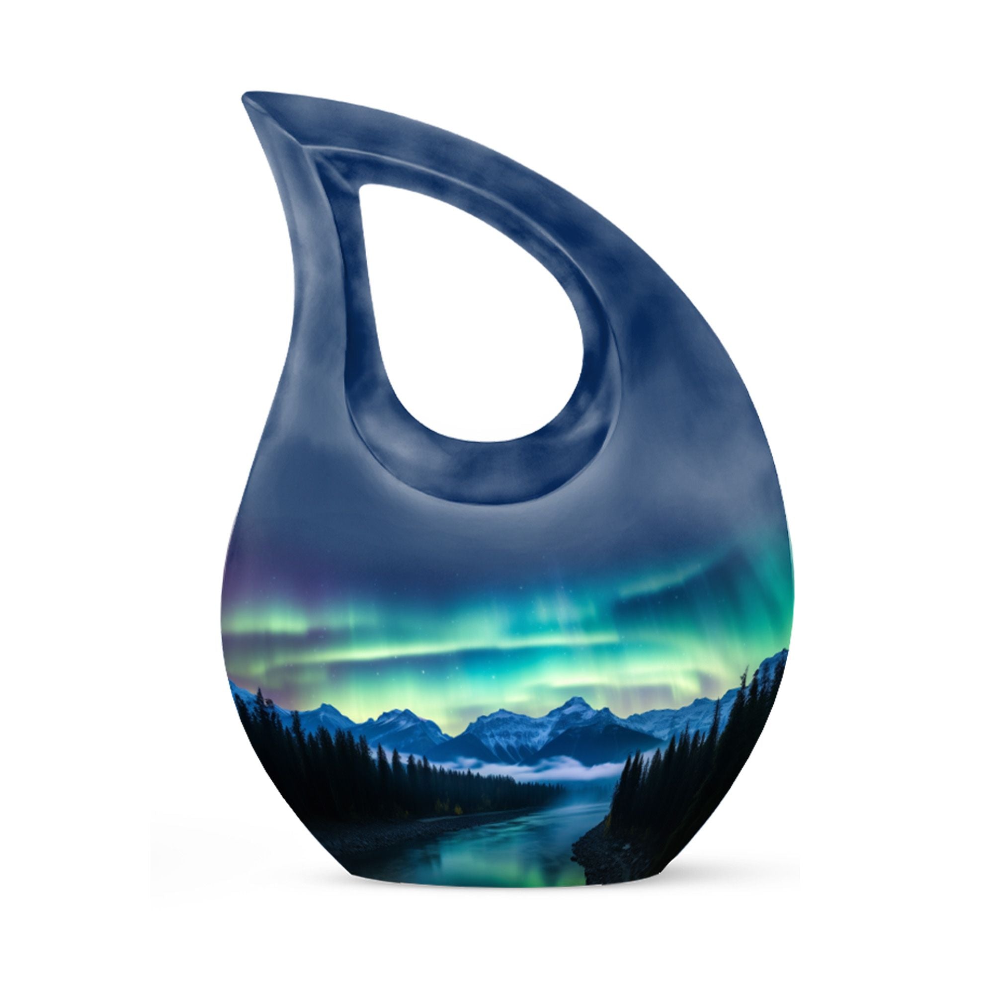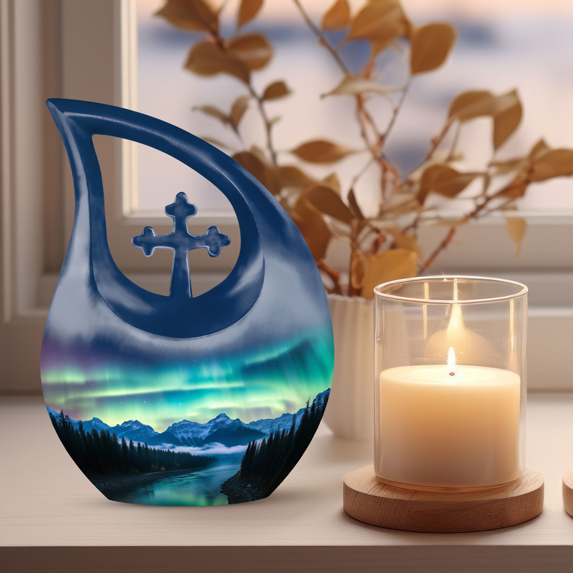 Honor your loved one with this Aurora Borealis Themed Urn, a forest-inspired memorial that blends natural beauty with the magic of the northern lights. Designed with compassion and dignity, it offers a meaningful resting place for families seeking a large urn human ashes option or a heartfelt urn for ashes for women.