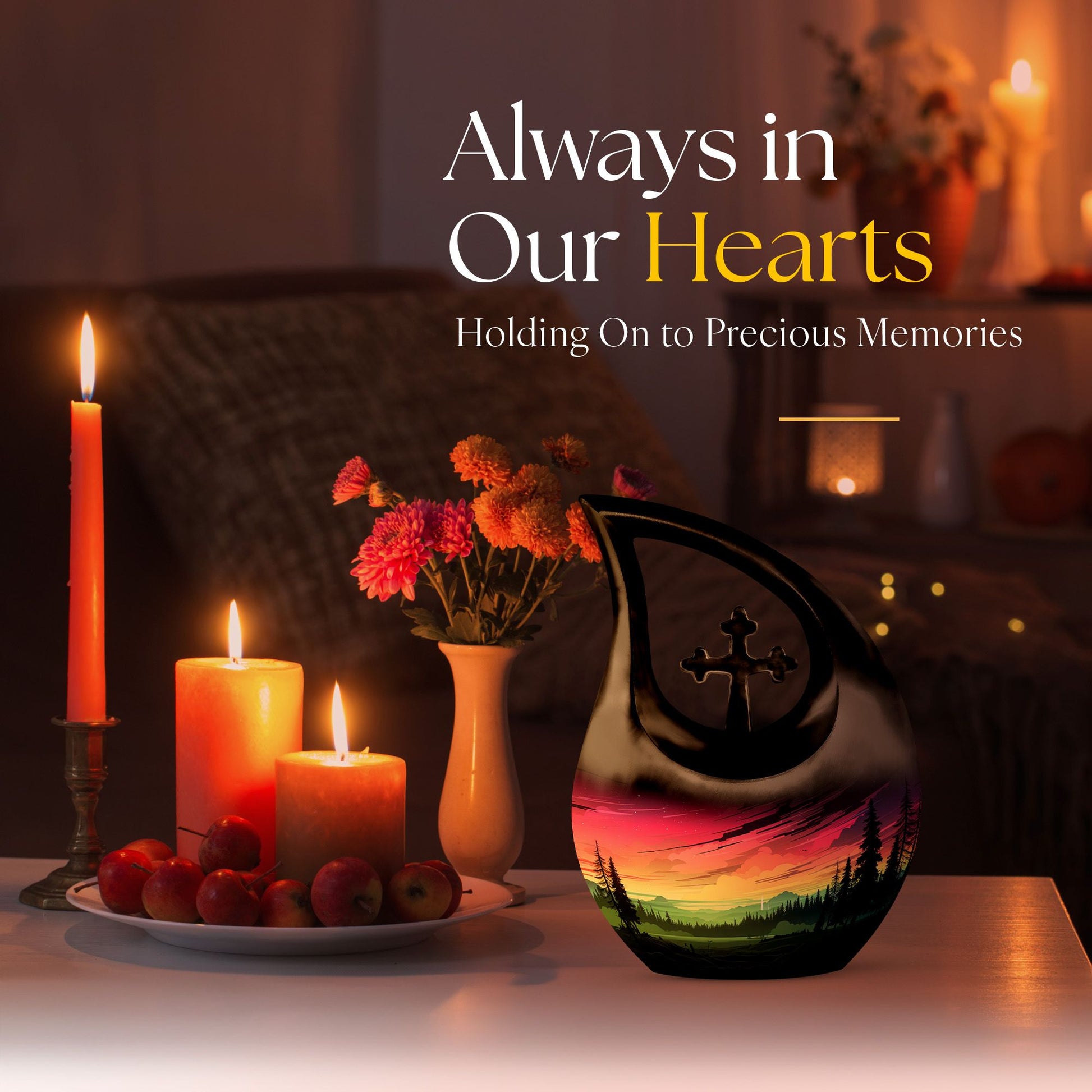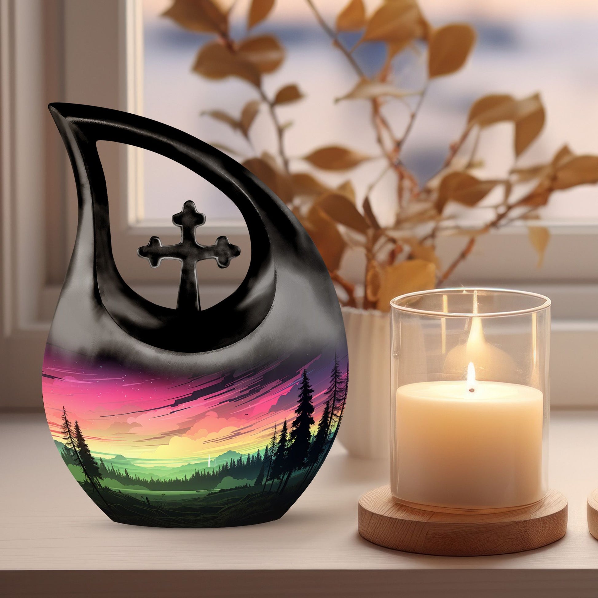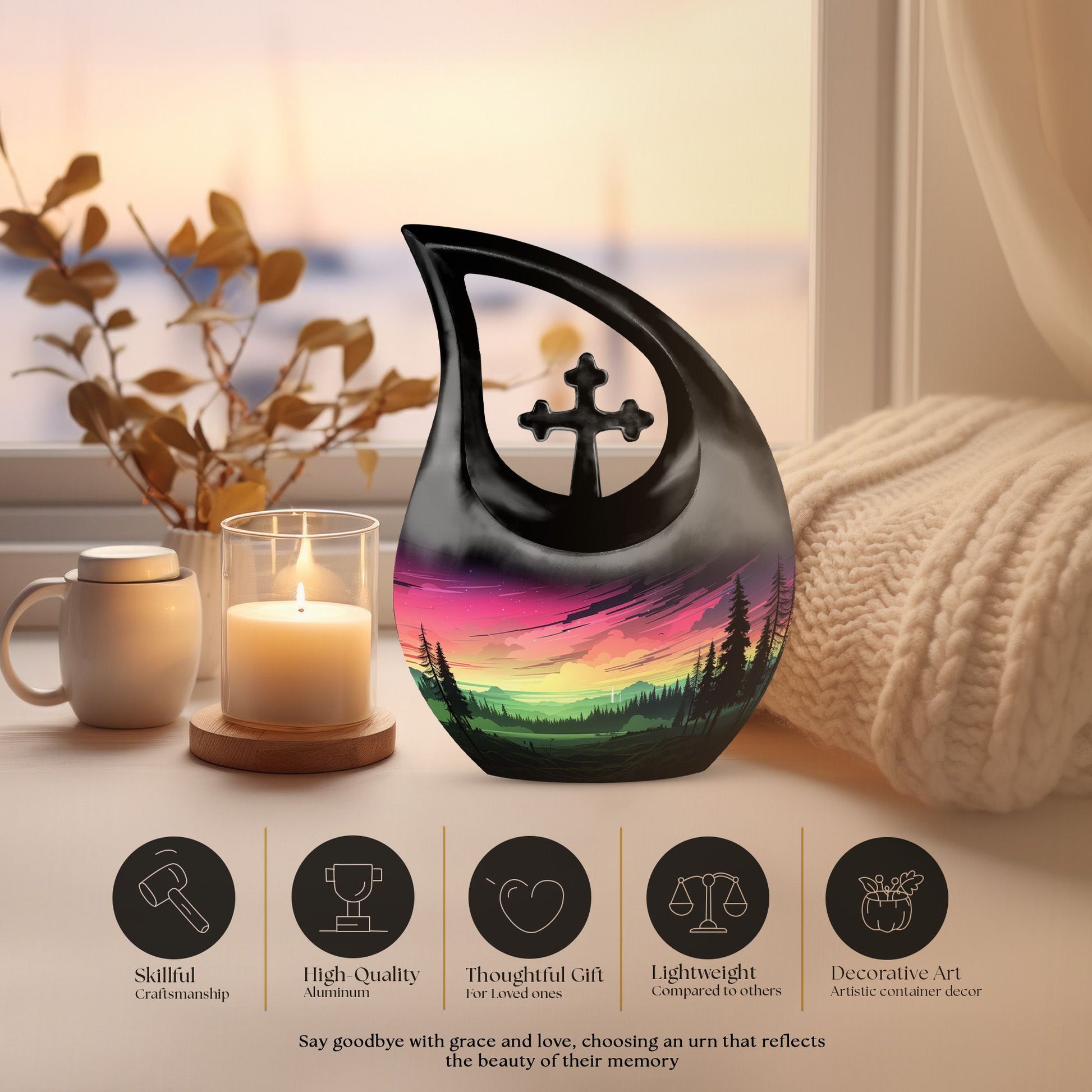 Keep the memory of your loved ones alive with the Aurora Urn, tastefully designed to honor and celebrate life. Crafted from high-quality aluminium, this large urn offers a substantial capacity of 200 cubic inches, making it suitable for housing ashes after cremation. The urn features a unique Cross Drop theme that evokes a sense of serenity and respect. This item measures 10 inches in height and weighs in at 3.3 pounds, demonstrating its solid, enduring nature. Personalize your urn with engraved names for that special touch. Our urn is not only an elegant memorial urn, but also a beautiful piece of home decor. It comes with a velvet pouch for containment of ashes, showing our attention to detail and concern for your comfort during this difficult time. Searching for designer urns for ashes often leads to Aurora Urn, a preferred choice of many. Ideal for giving your loved one a dignified last resting place, this urn truly encapsulates the spirit of love, memory, and peace.