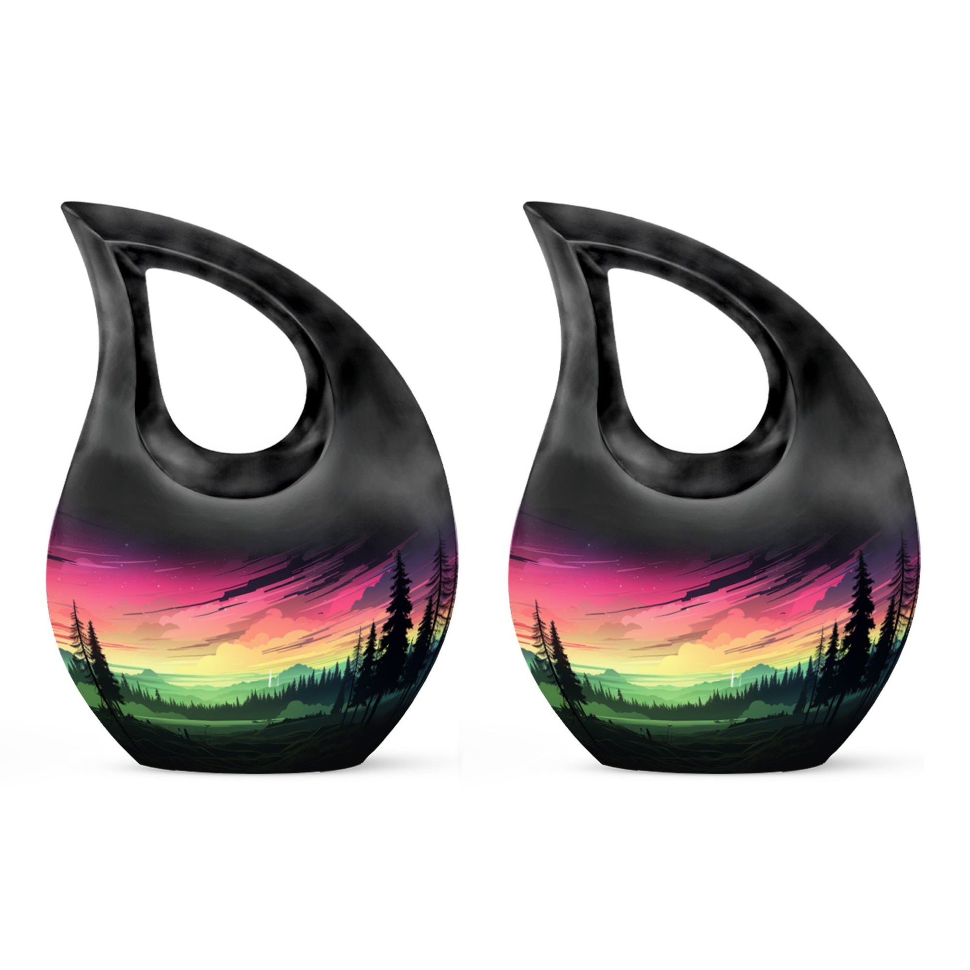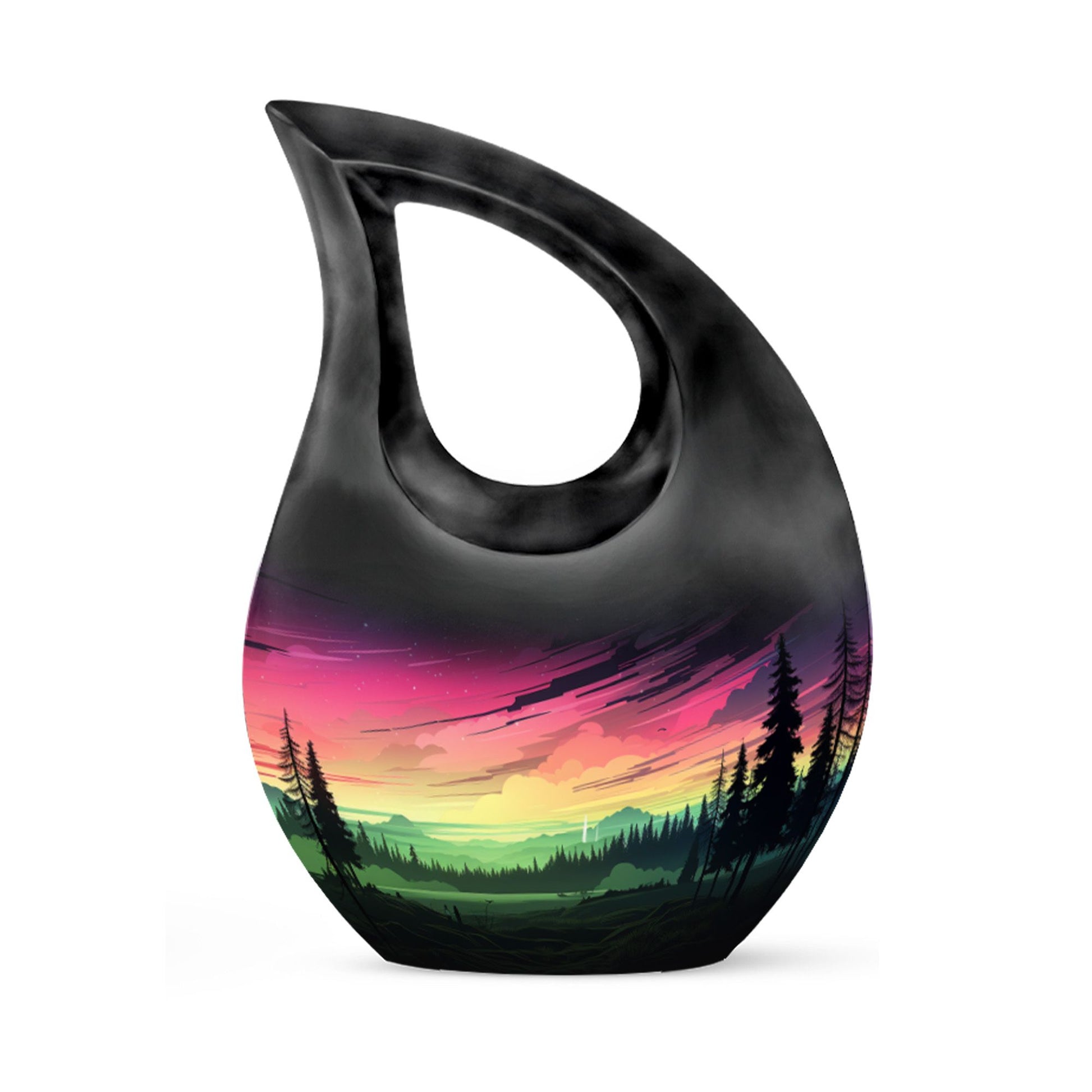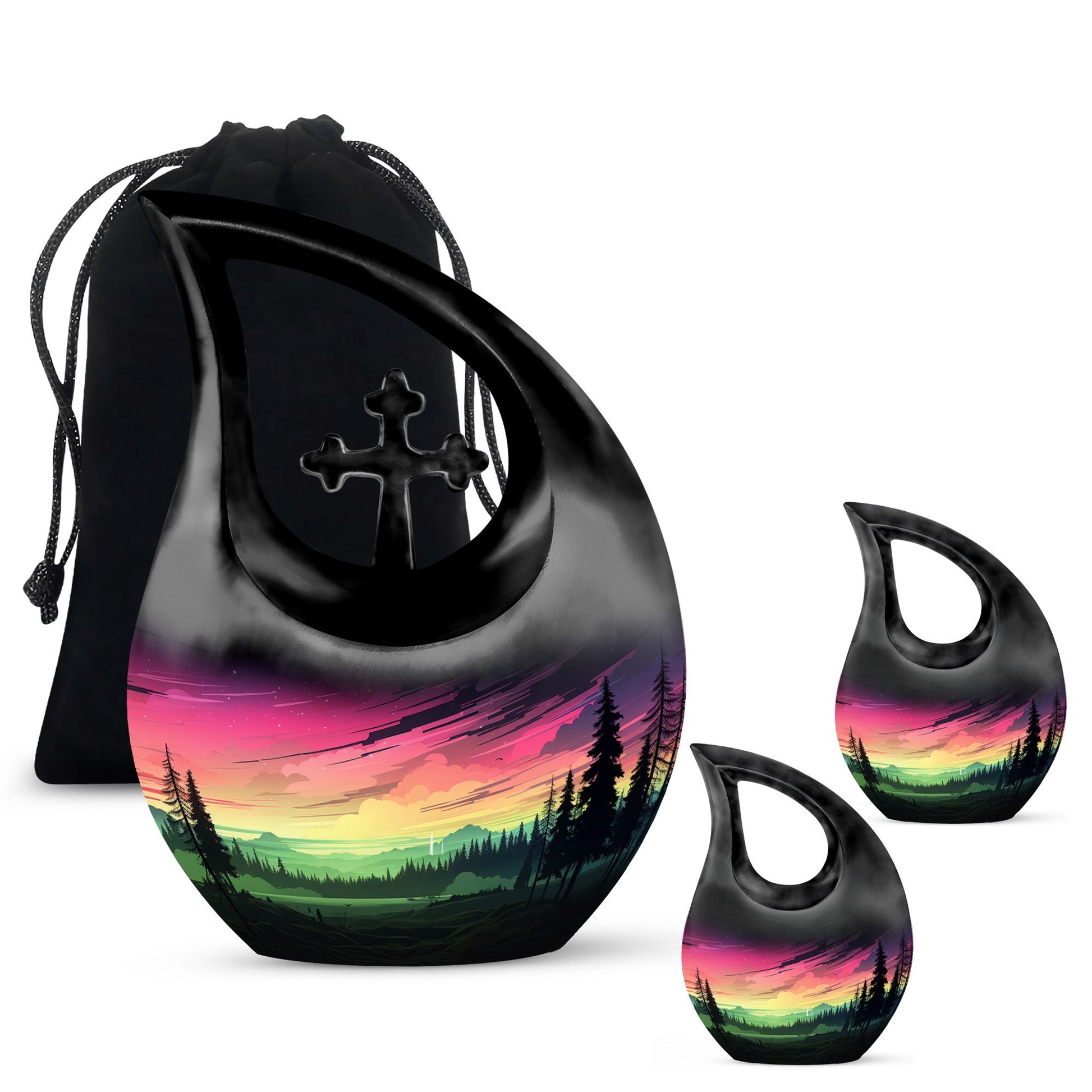Keep the memory of your loved ones alive with the Aurora Urn, tastefully designed to honor and celebrate life. Crafted from high-quality aluminium, this large urn offers a substantial capacity of 200 cubic inches, making it suitable for housing ashes after cremation. The urn features a unique Cross Drop theme that evokes a sense of serenity and respect. This item measures 10 inches in height and weighs in at 3.3 pounds, demonstrating its solid, enduring nature. Personalize your urn with engraved names for that special touch. Our urn is not only an elegant memorial urn, but also a beautiful piece of home decor. It comes with a velvet pouch for containment of ashes, showing our attention to detail and concern for your comfort during this difficult time. Searching for designer urns for ashes often leads to Aurora Urn, a preferred choice of many. Ideal for giving your loved one a dignified last resting place, this urn truly encapsulates the spirit of love, memory, and peace.