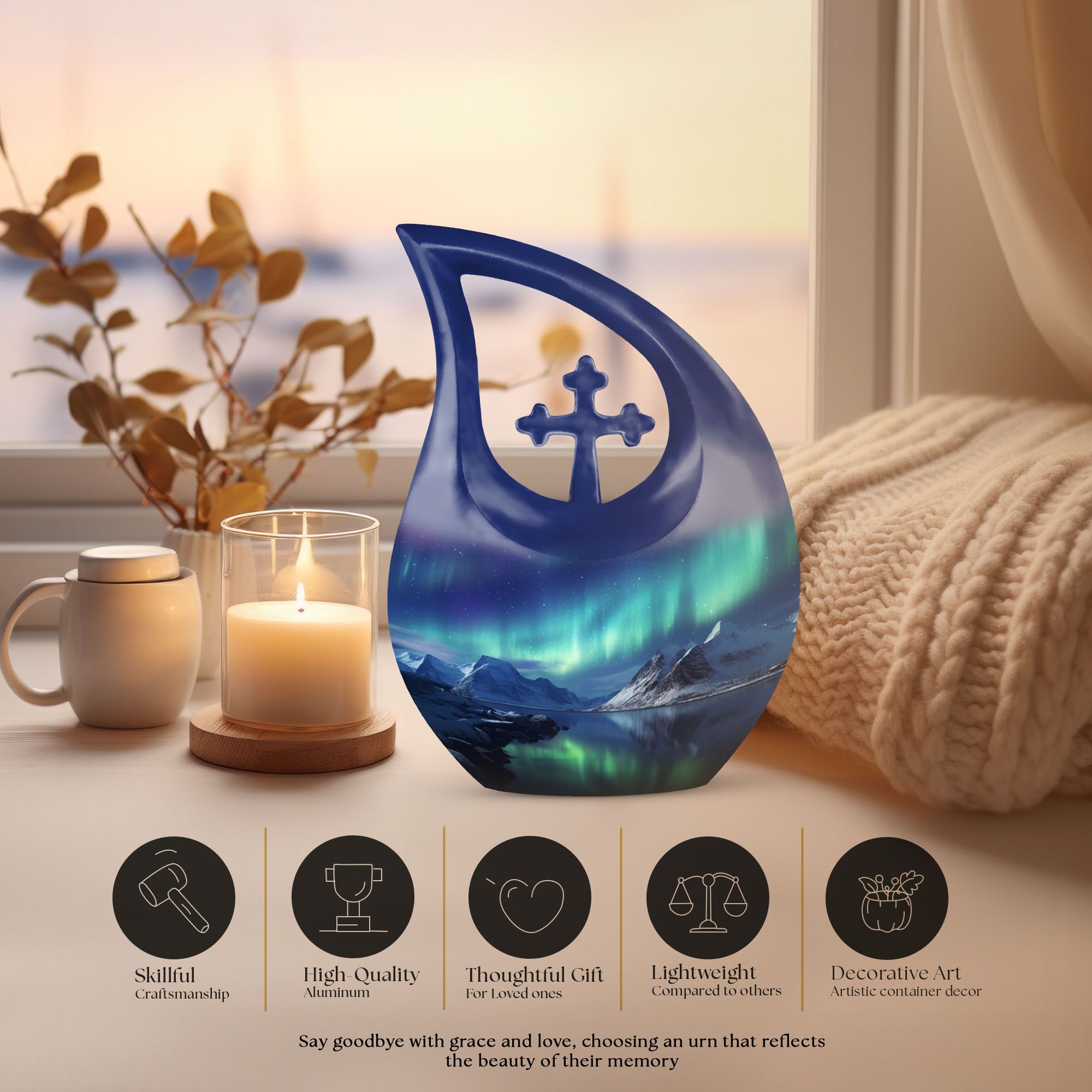 Handcrafted from durable aluminum, this adult funeral urn showcases a radiant depiction of the northern lights illuminating a peaceful mountain landscape. The design evokes stillness and connection, making it a perfect choice for display or burial. The secure screw-top lid ensures ashes are preserved safely. Whether used as a funeral ashes urn, urn for burial in ground, or displayed in your home, its artistry offers both comfort and elegance.