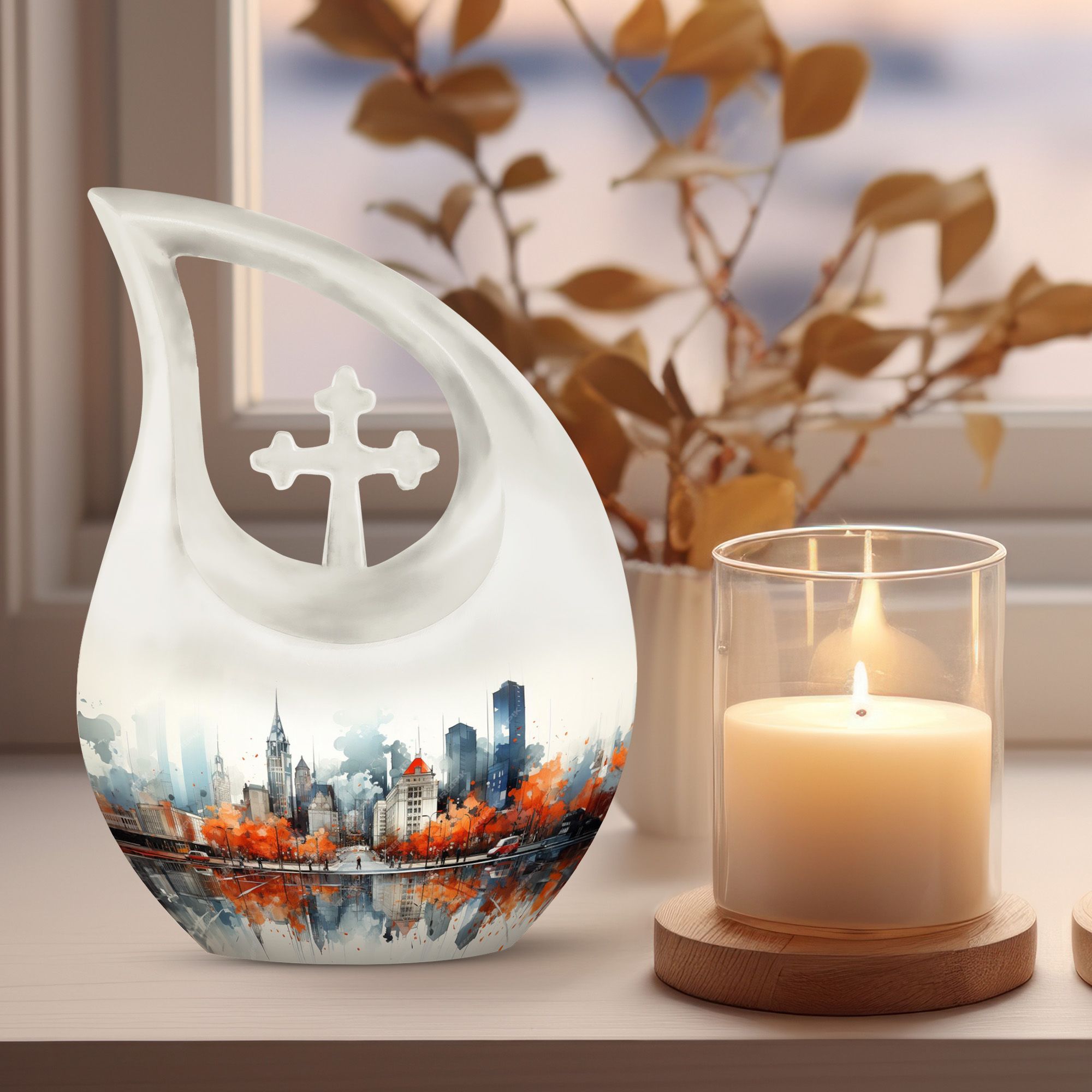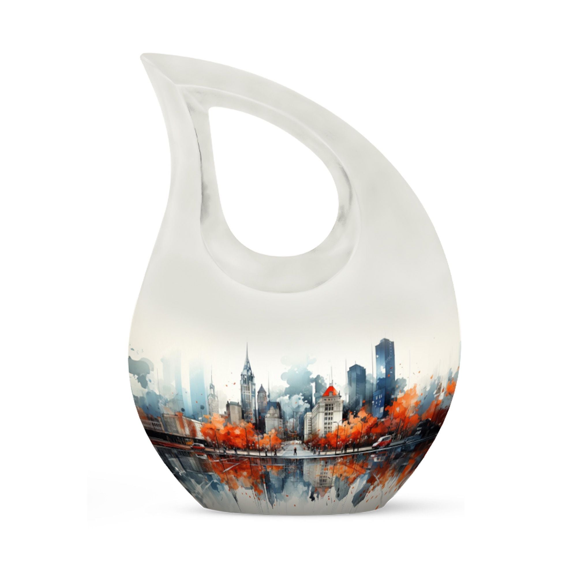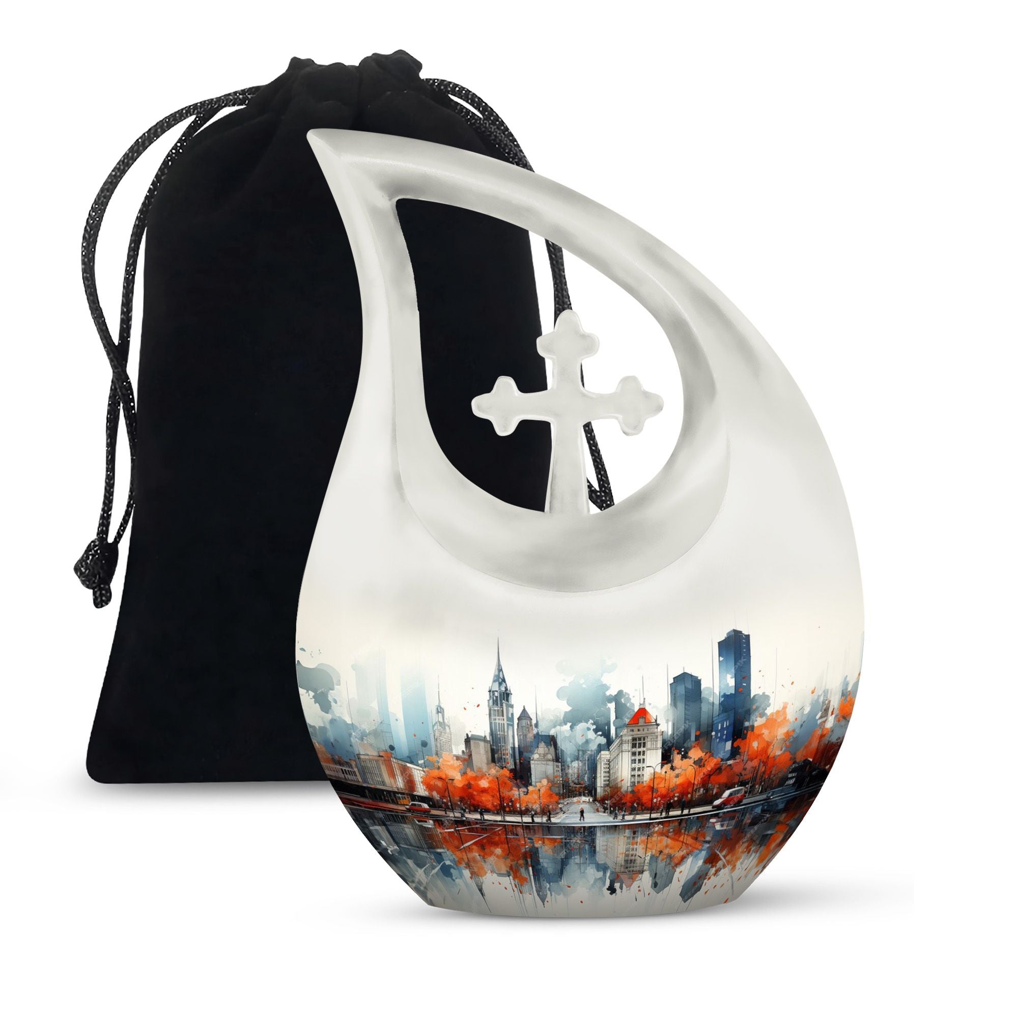 This City Artwork Themed Urn Memorial brings modern beauty and heartfelt remembrance together. Designed with bold urban-inspired art, it offers a meaningful tribute for families seeking an artistic urn for ashes for women or a dignified option suitable for men as well. Its contemporary design makes it a standout memorial piece filled with emotion and individuality.