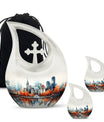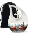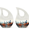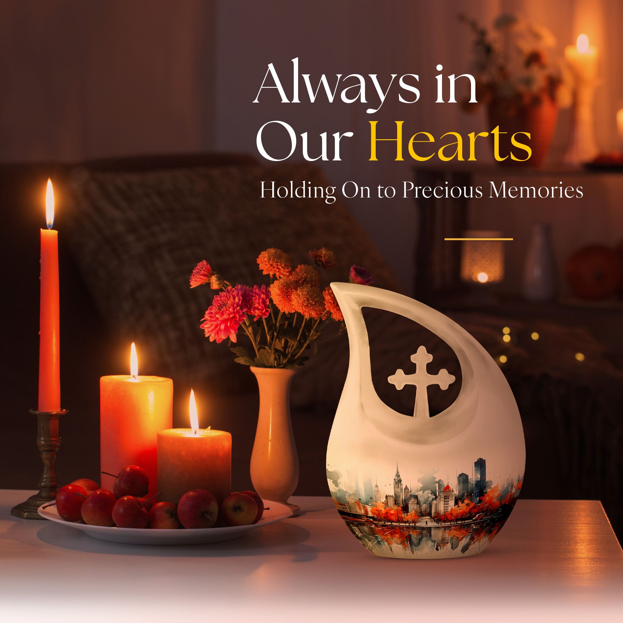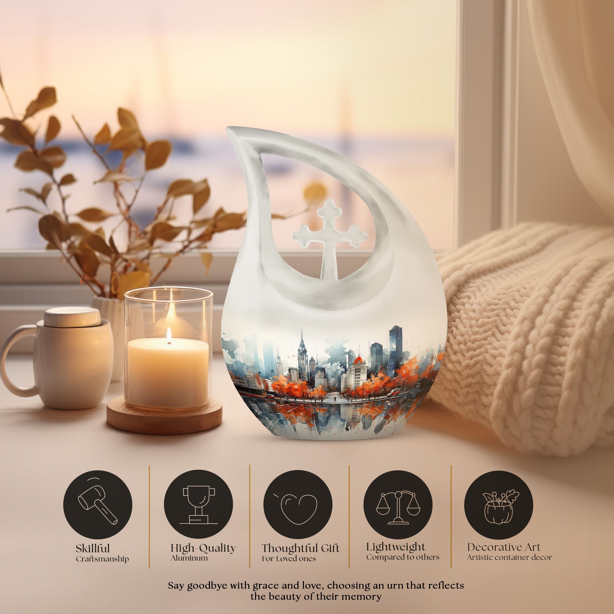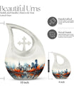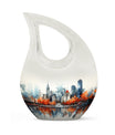 A city skyline represents connection, journey, and legacy—making this urn a heartfelt tribute to a life that touched many paths.
