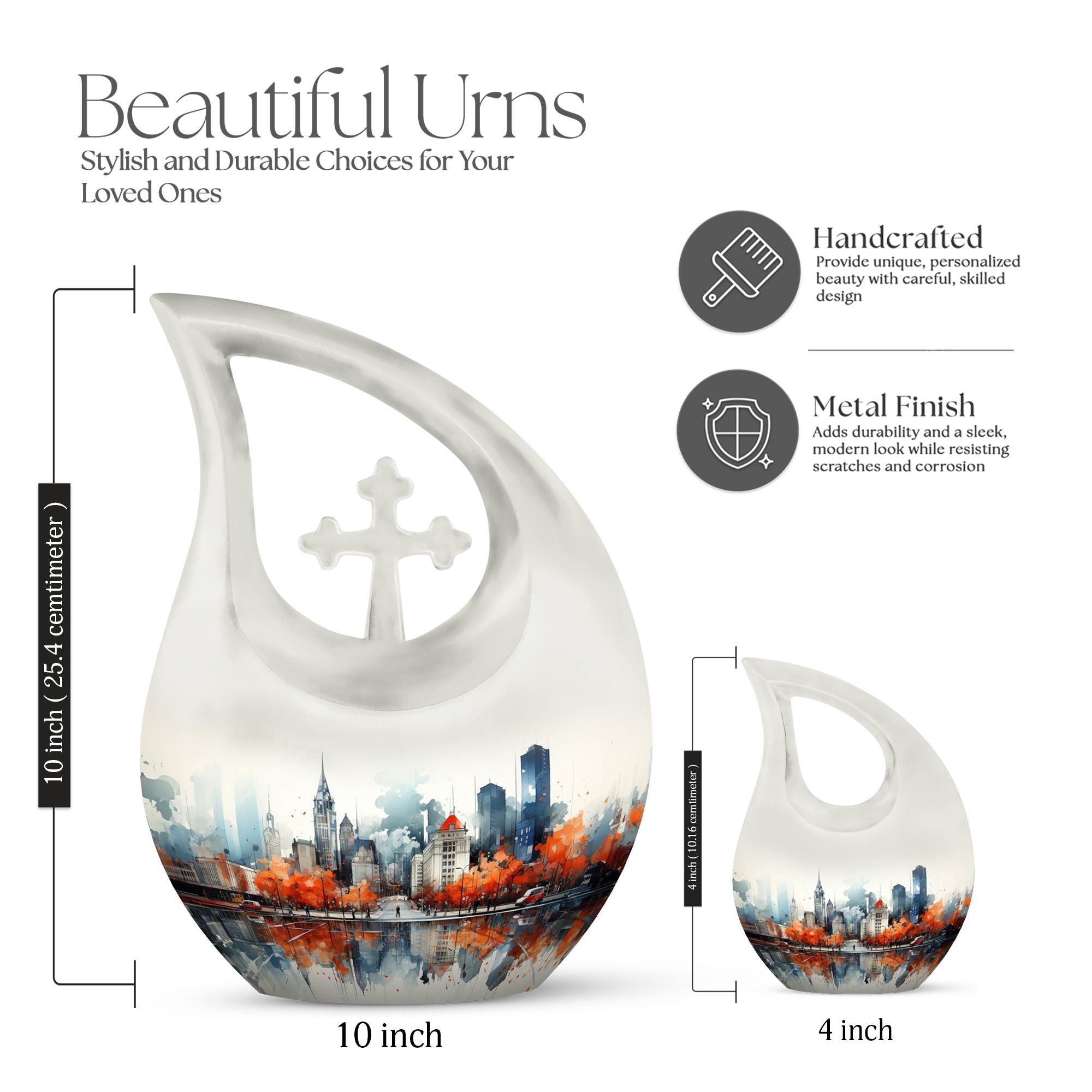 Crafted from durable aluminium, this 10 inch urn features vivid cityscape artwork that symbolizes life, movement, memory, and the journeys we share. The secure screw-top lid keeps ashes protected, making it a dependable choice for families looking for cremation urns for women, cremation urns for men, or expressive adult urns for human ashes women and adult urns for human ashes men. It also pairs well with coordinating keepsake urns for women, mini small urns for men, or any urn for ashes for women small companion pieces. This design fits seamlessly into memorial spaces while offering a contemporary tribute with meaningful style.