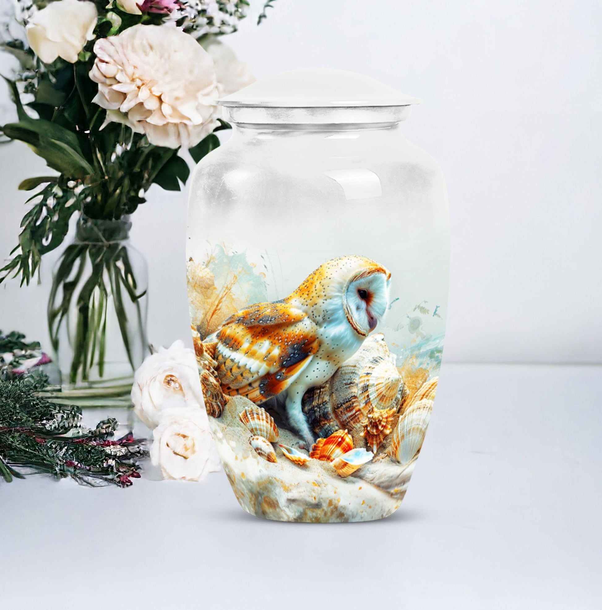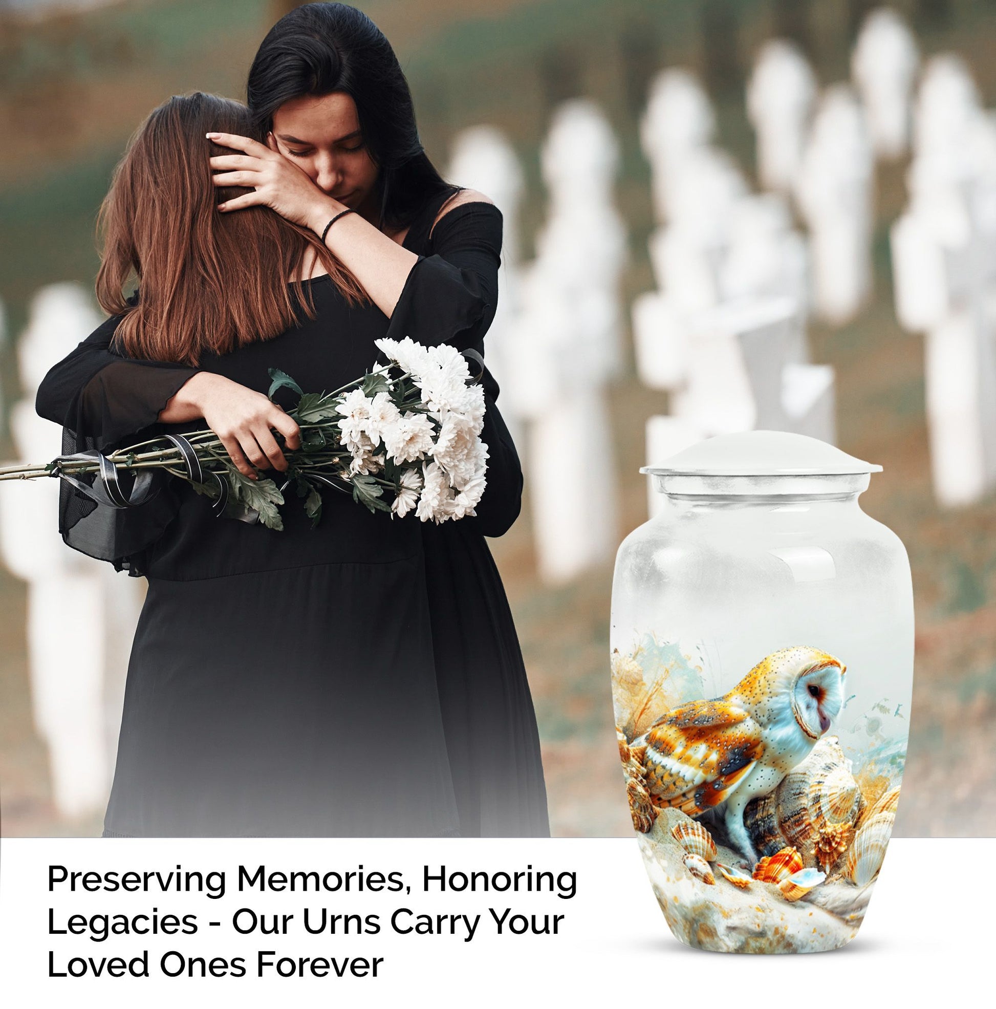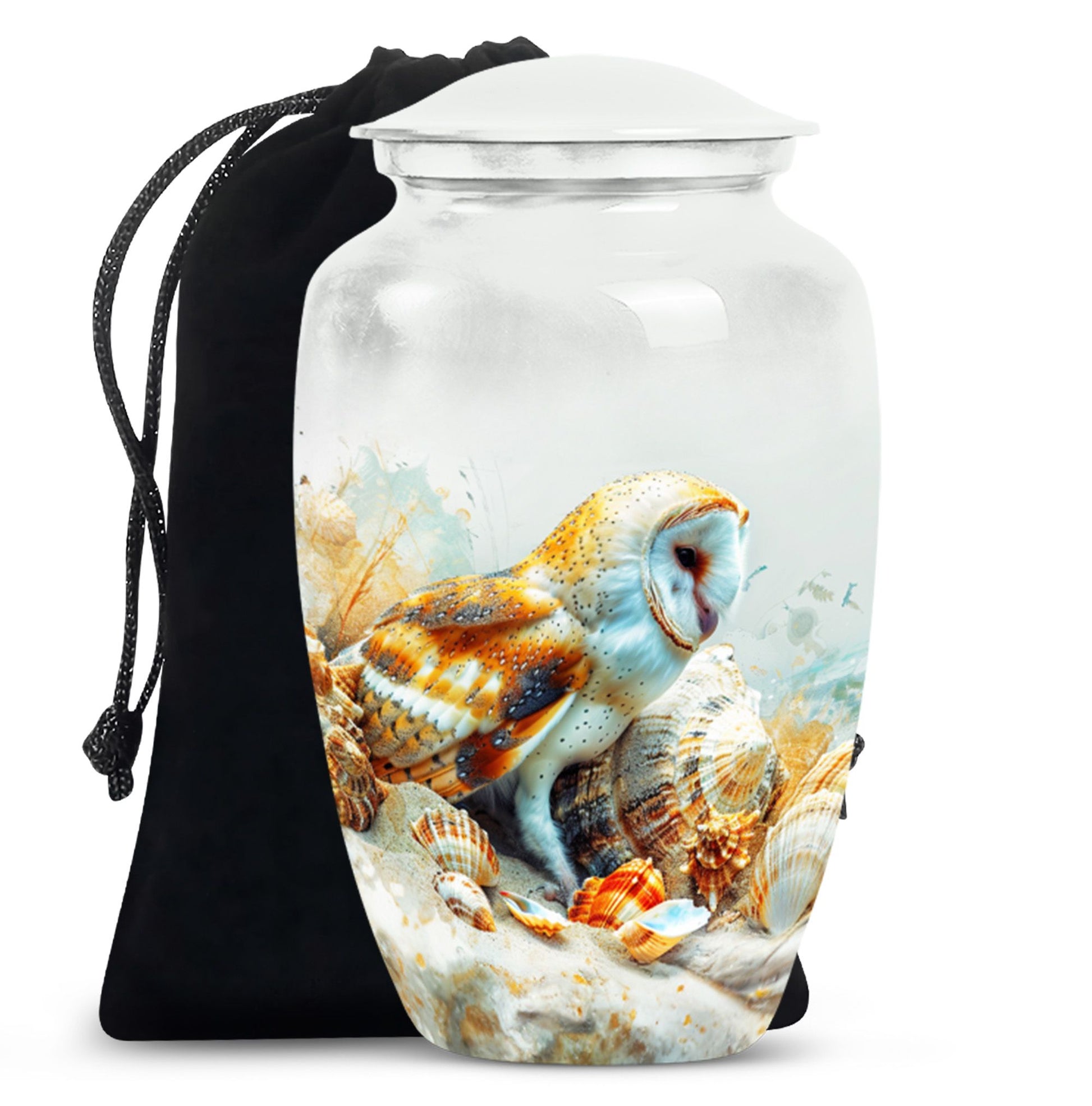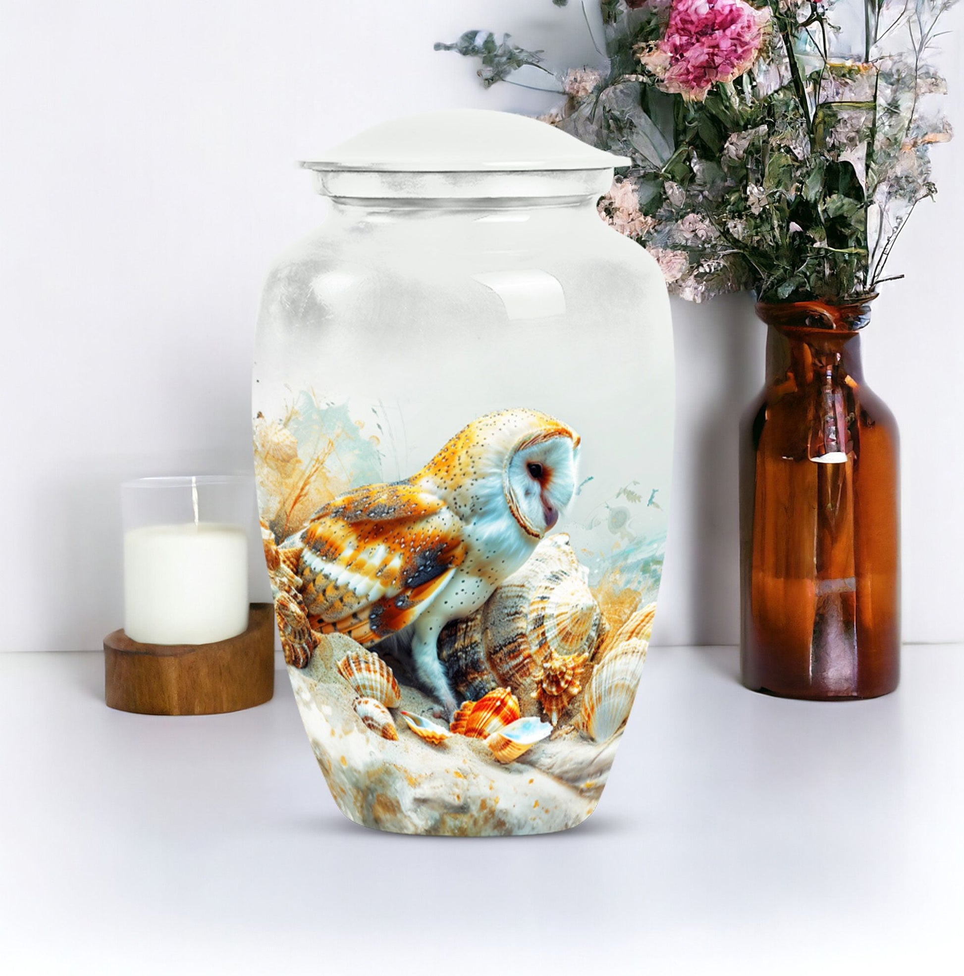 Cherish the precious memories of your loved ones with this exquisite barn owl memorial urn. This classic urn, not your everyday urn design, serves as a heartfelt memento, ideal for preserving the treasured traces of those we hold dear. Perfectly sized at 10 inches and weighing a sturdy 3.3 pounds, this urn is skillfully crafted from robust aluminium, resulting in a product of remarkable durability. Its capacity of 200 cubic inches abundantly accommodates human ashes, ensuring your cherished memories are safely kept. Even more, the package includes a soft velvet pouch for containment of ashes, an extra touch of care for those personal, delicate components. The urn shines not just in functionality but aesthetics as well - its abstract theme adds a touch of artistic allure, an acknowledgement of the unique spirit it houses. Moreover, it offers personalization options; you can engrave names, making it truly a special haven for your dearly departed. Whether you are seeking 'memorial urns for mom' or 'cremation personalized urns for human ashes adult', this large urn is a fitting choice, encapsulating love and remembrance in its very essence.