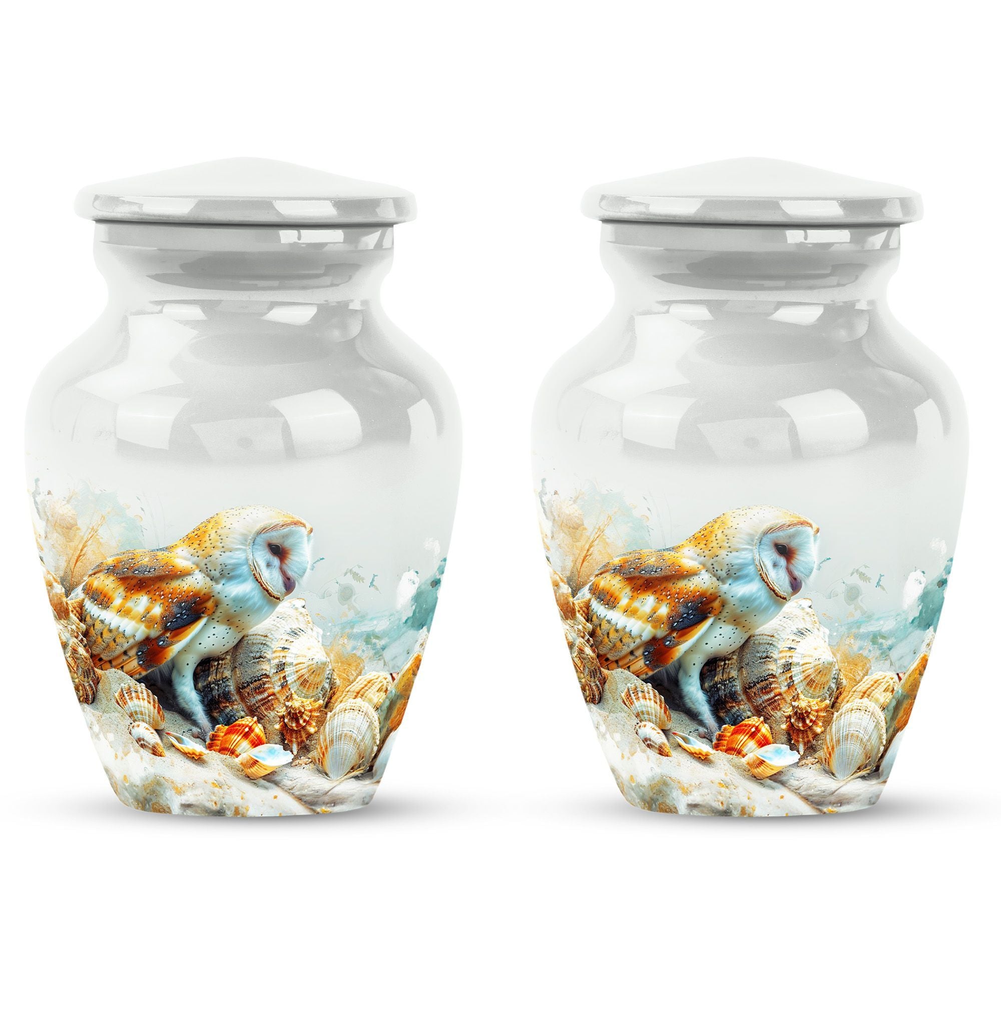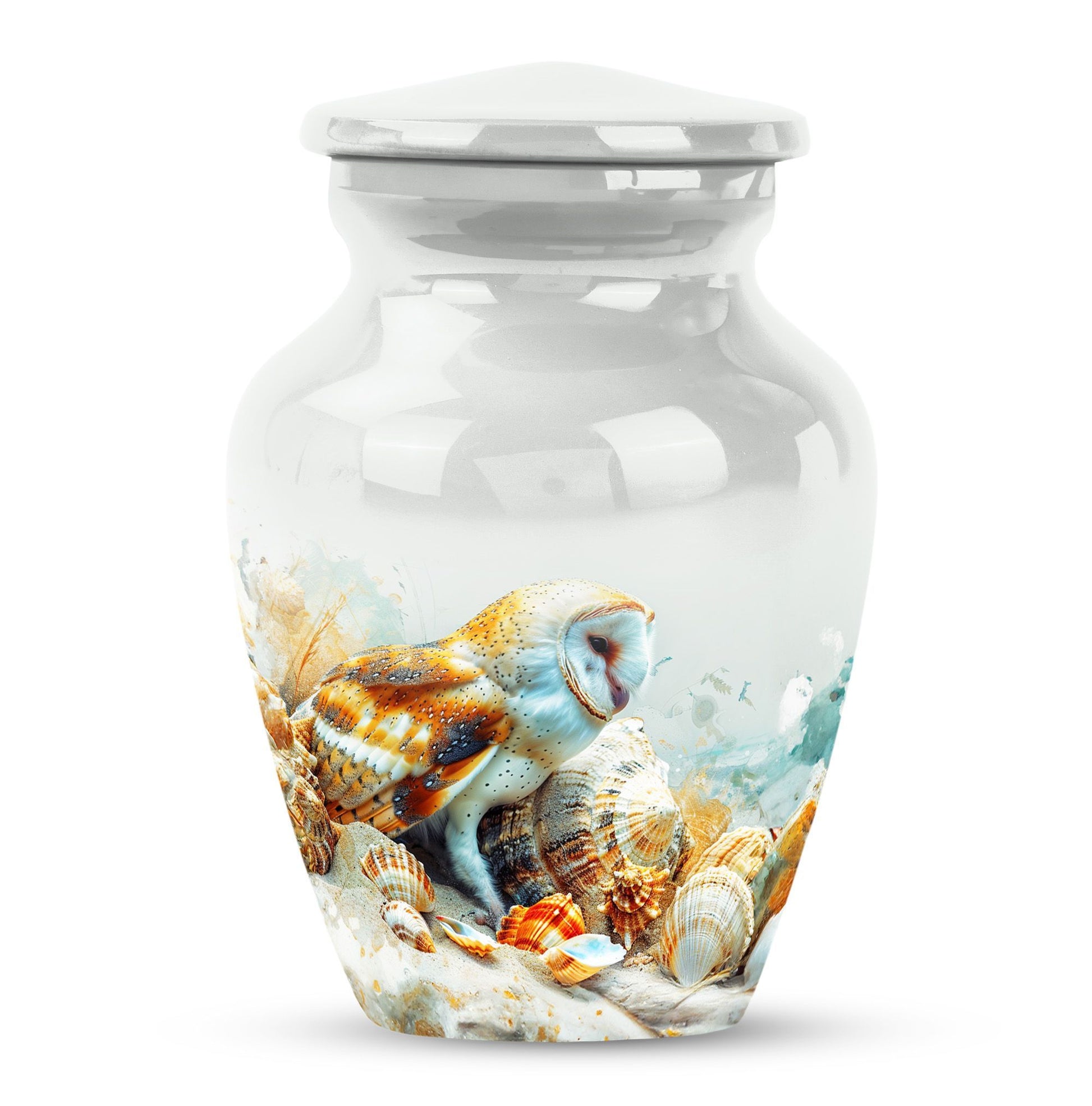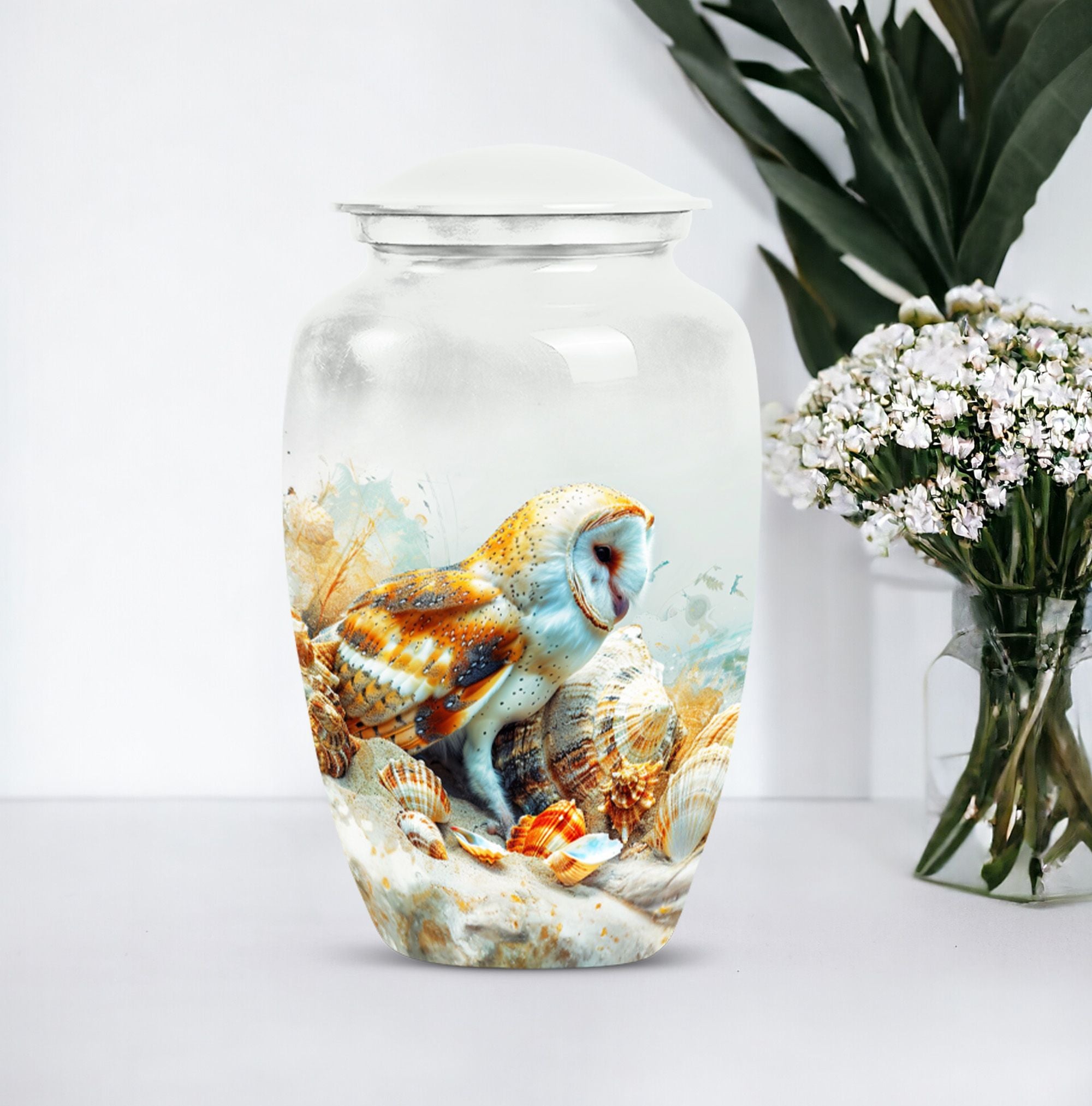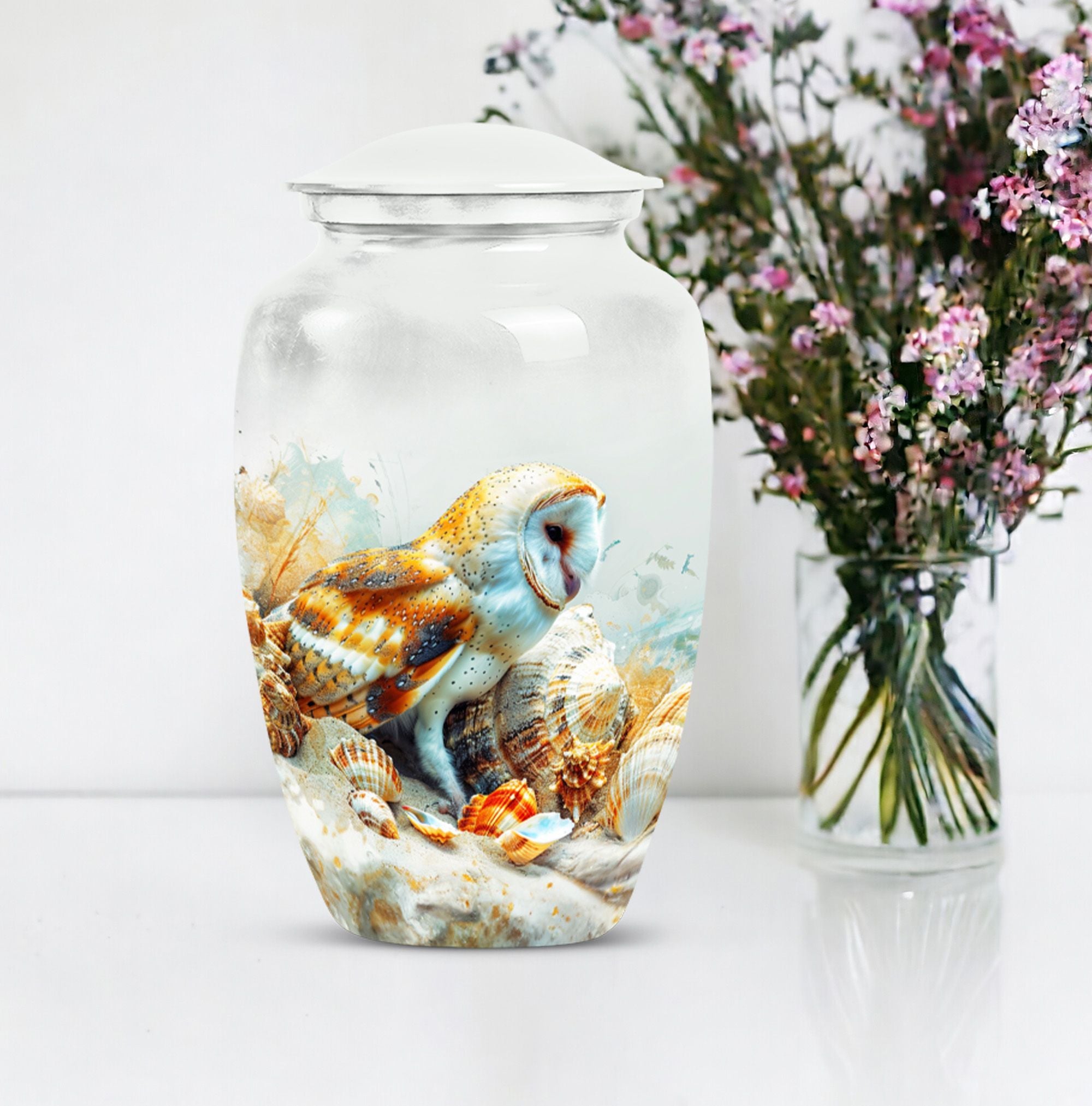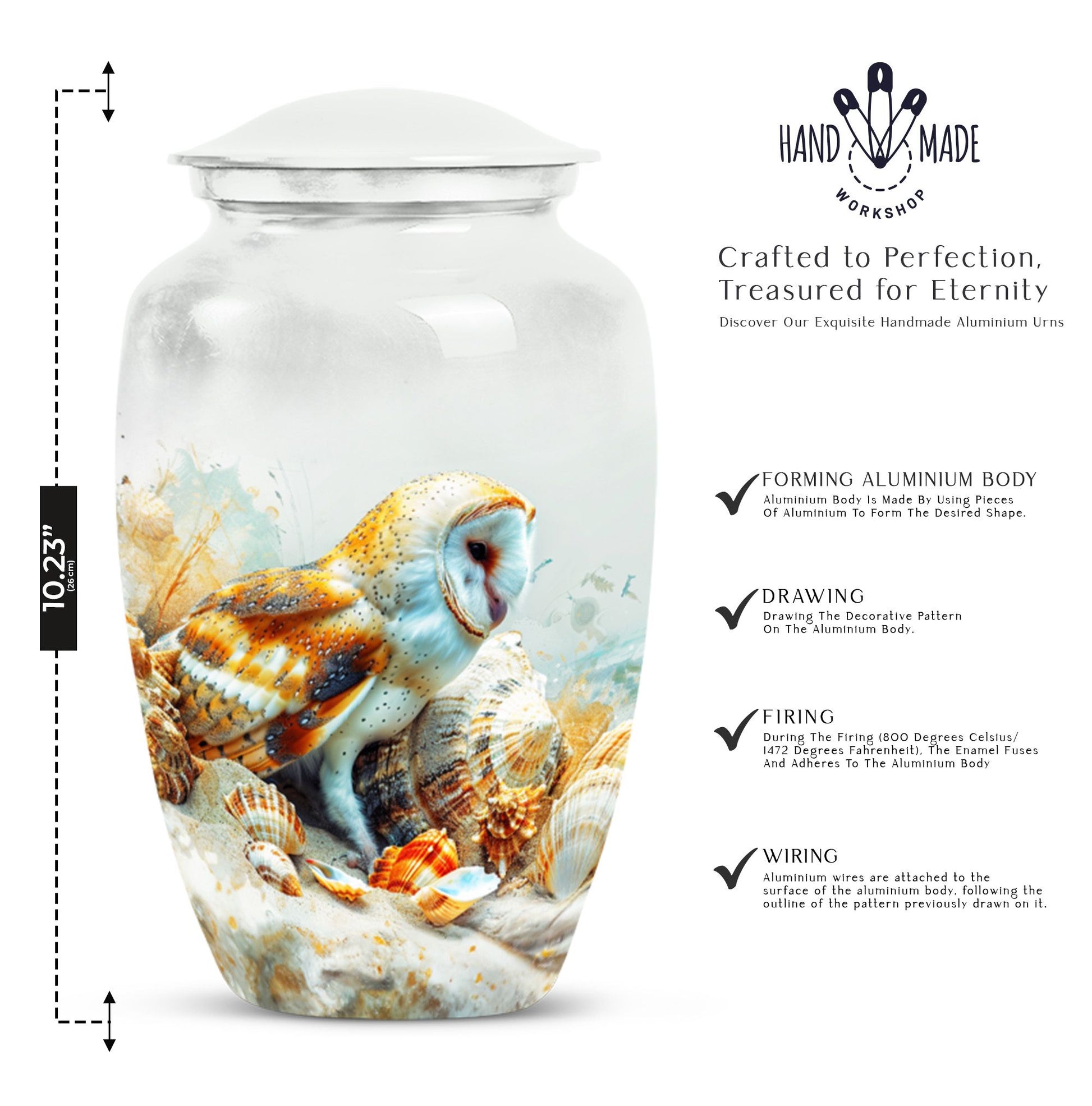 Cherish the precious memories of your loved ones with this exquisite barn owl memorial urn. This classic urn, not your everyday urn design, serves as a heartfelt memento, ideal for preserving the treasured traces of those we hold dear. Perfectly sized at 10 inches and weighing a sturdy 3.3 pounds, this urn is skillfully crafted from robust aluminium, resulting in a product of remarkable durability. Its capacity of 200 cubic inches abundantly accommodates human ashes, ensuring your cherished memories are safely kept. Even more, the package includes a soft velvet pouch for containment of ashes, an extra touch of care for those personal, delicate components. The urn shines not just in functionality but aesthetics as well - its abstract theme adds a touch of artistic allure, an acknowledgement of the unique spirit it houses. Moreover, it offers personalization options; you can engrave names, making it truly a special haven for your dearly departed. Whether you are seeking 'memorial urns for mom' or 'cremation personalized urns for human ashes adult', this large urn is a fitting choice, encapsulating love and remembrance in its very essence.