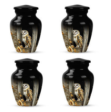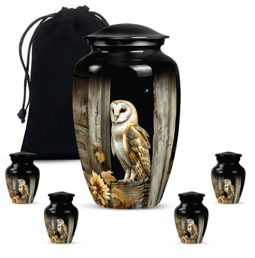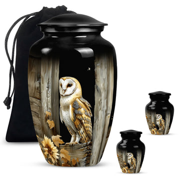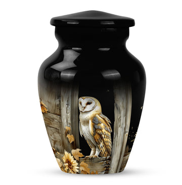Experience a profound sense of respect and peace with our Barn Owl Urn, a beautiful burial urn for ashes adult. This high-end cremation urn stands magnificently at a size of 10 inch, offering a stylish abode for your loved one's eternal rest. Crafted from durable aluminium, it is meticulously designed in a classic urn style emphasizing abstract themes, adding a unique touch to its elegance. It's spacious, boasting a capacity of 200 cubic inches and is quite sturdy with a weight of 3.3 pounds. Your package includes a plush velvet pouch for containment of ashes. Further enhance the value of this rich tribute to your dear one with our customization services that allow you to personalize with engraved names. Perfect for large urns requirements, this memorial adult urn showcases the perfect blend of aesthetics and sentiment, making it ideal for adult burial or as a loving cremation urn for dad. This unique urn certainly stands out from common cremation urns for ashes for adult humans.