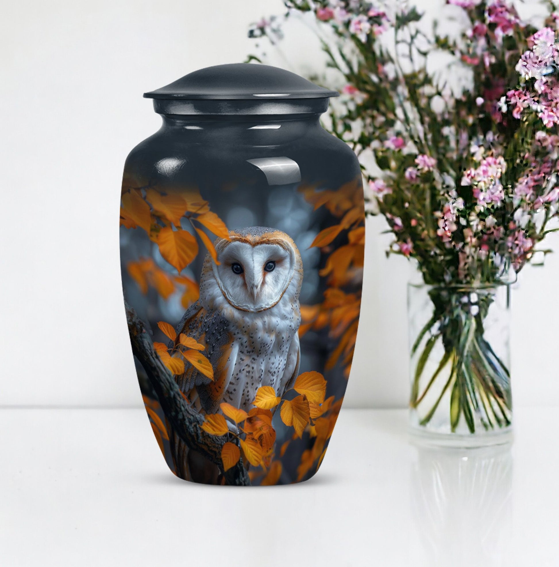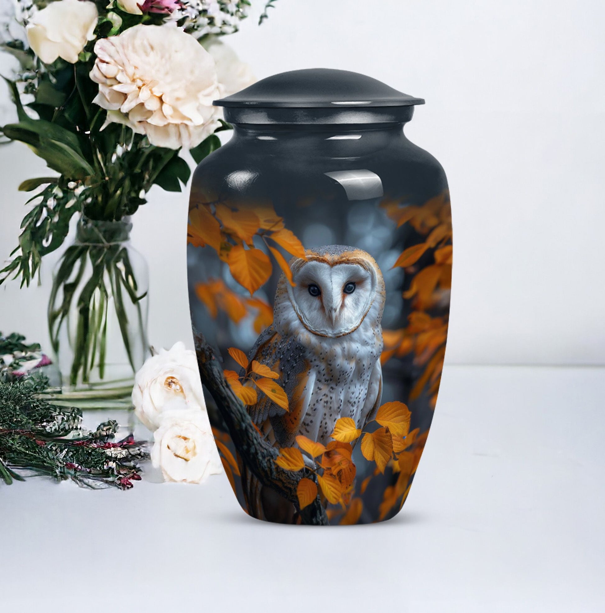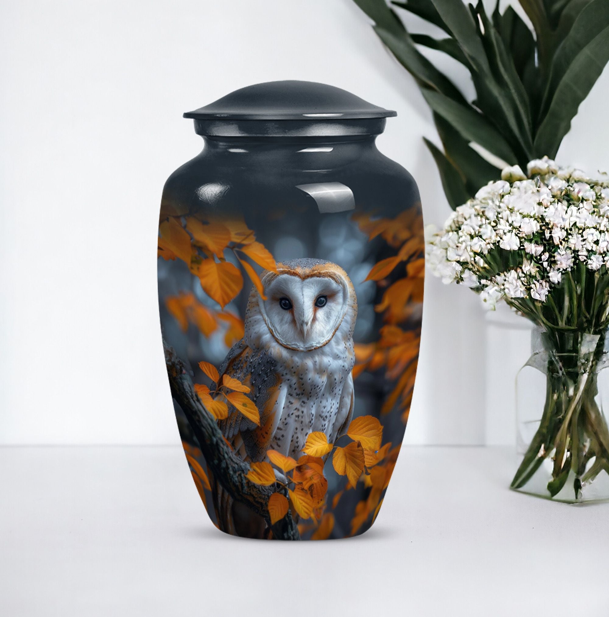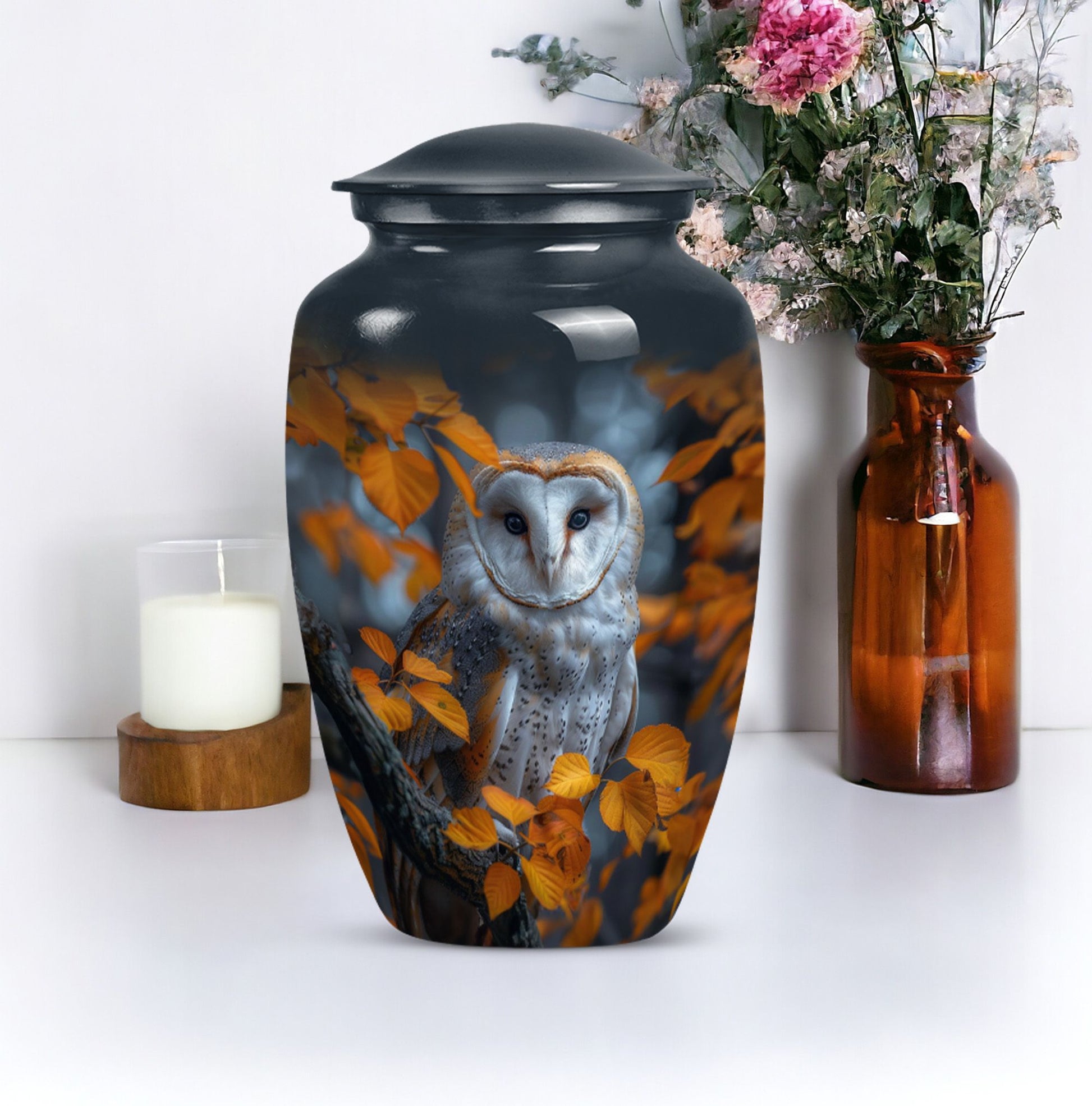 Celebrate and commemorate a loved one's memory with the Barn Owl Urn, a meaningful selection from our memorial urns category. Carefully crafted in a 10-inch format from durable aluminium, this large urn weighs a solid 3.3 pounds and is uniquely tailored to hold up to 200 cubic inches of ashes. The classic urn design features an abstract theme, blending tradition with a modern twist. Expertly personalized with engraved names, this creation adds a touch of sentimentality, making it an ideal choice for adult ashes, especially for women. The package includes a velvet pouch for secure containment of ashes, underlining the attention to detail. This burial funeral urn acts as a tangible reminiscence of your beloved, providing a dignified and respectful way to keep them close. With its distinct style, it eliminates the need for a generic cremation box. Ideal for human ashes, a serene final resting place is guaranteed with this captivating urn.