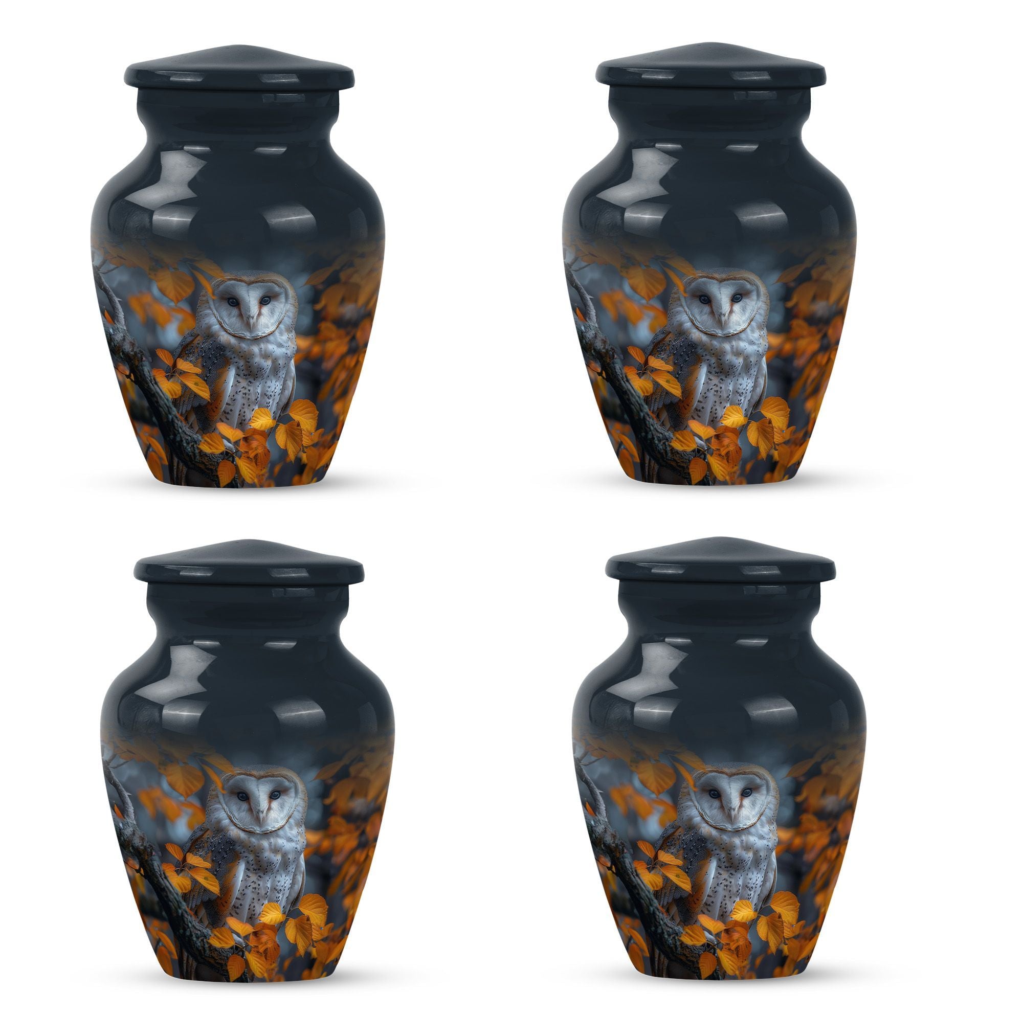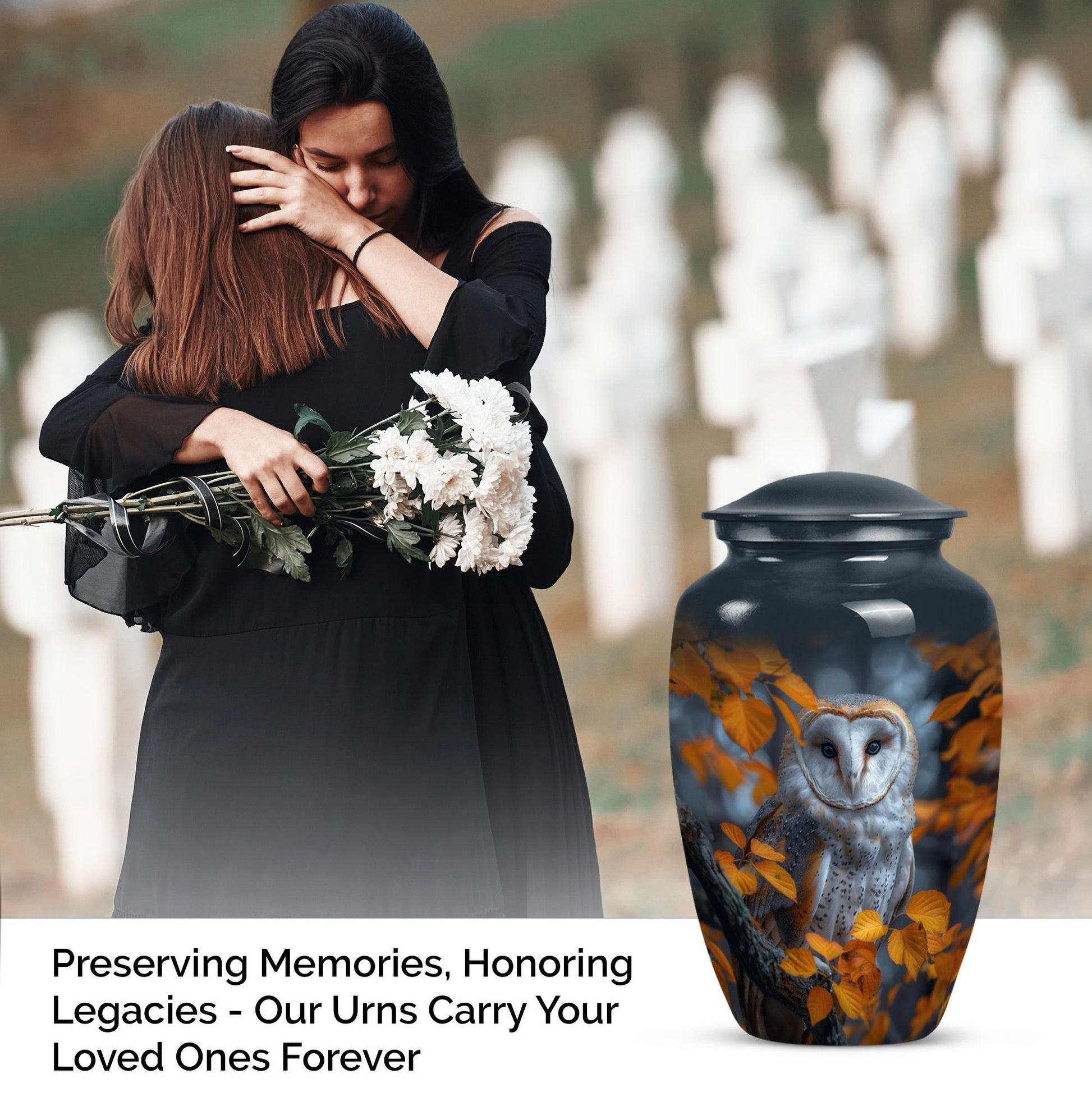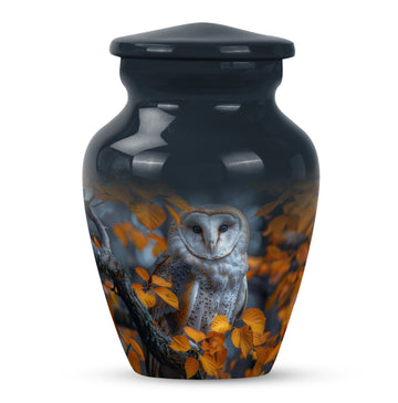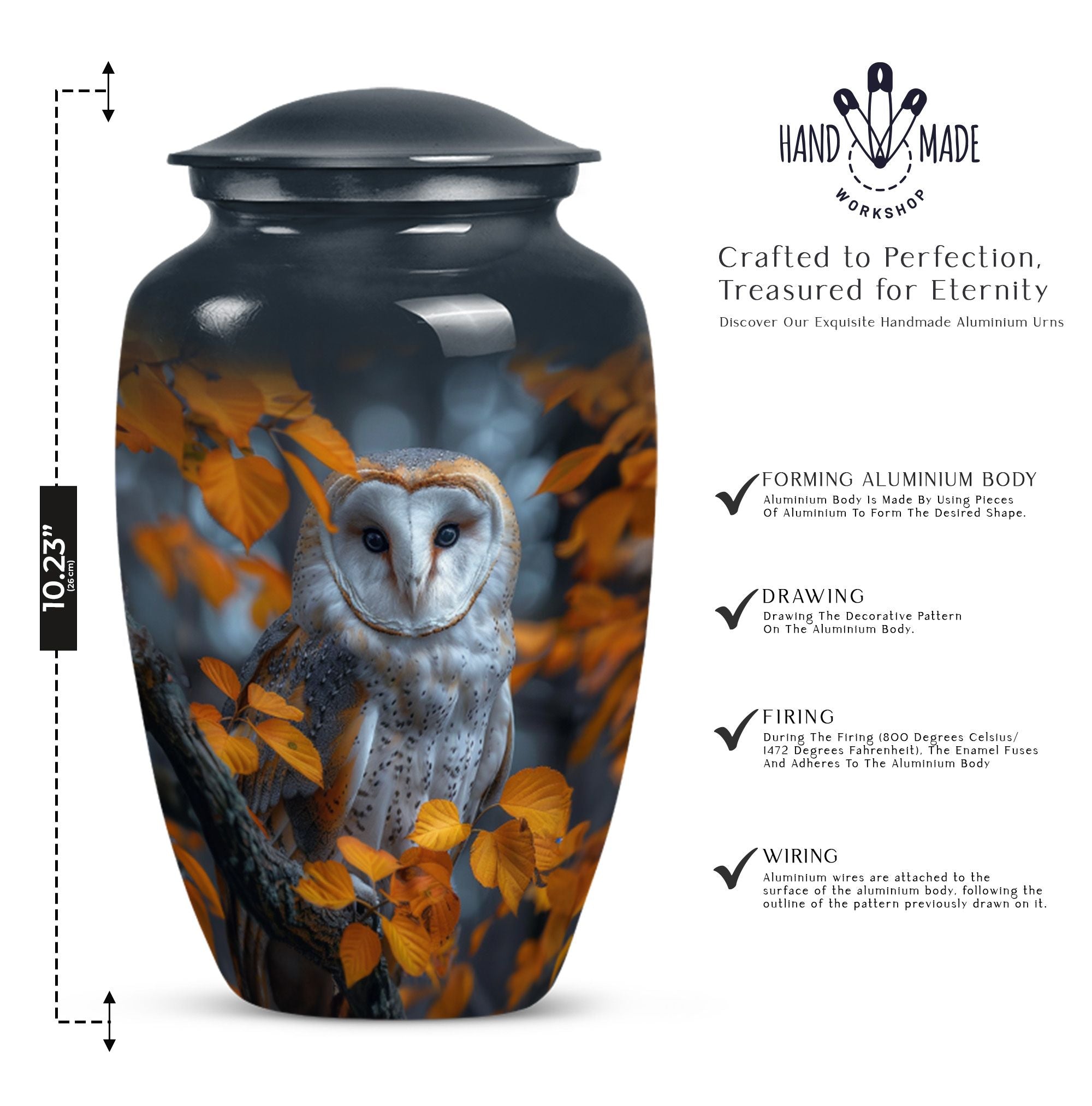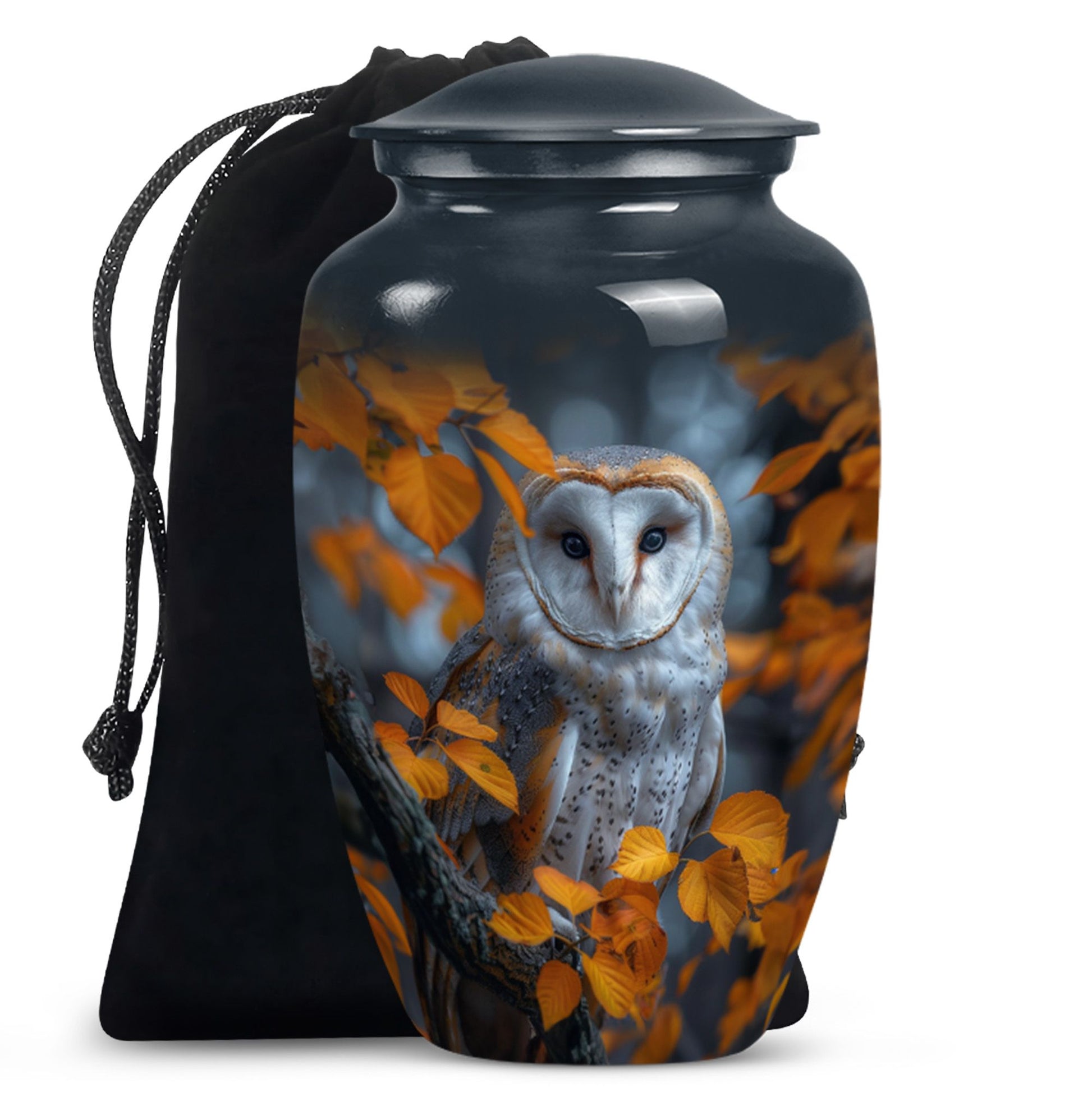 Celebrate and commemorate a loved one's memory with the Barn Owl Urn, a meaningful selection from our memorial urns category. Carefully crafted in a 10-inch format from durable aluminium, this large urn weighs a solid 3.3 pounds and is uniquely tailored to hold up to 200 cubic inches of ashes. The classic urn design features an abstract theme, blending tradition with a modern twist. Expertly personalized with engraved names, this creation adds a touch of sentimentality, making it an ideal choice for adult ashes, especially for women. The package includes a velvet pouch for secure containment of ashes, underlining the attention to detail. This burial funeral urn acts as a tangible reminiscence of your beloved, providing a dignified and respectful way to keep them close. With its distinct style, it eliminates the need for a generic cremation box. Ideal for human ashes, a serene final resting place is guaranteed with this captivating urn.