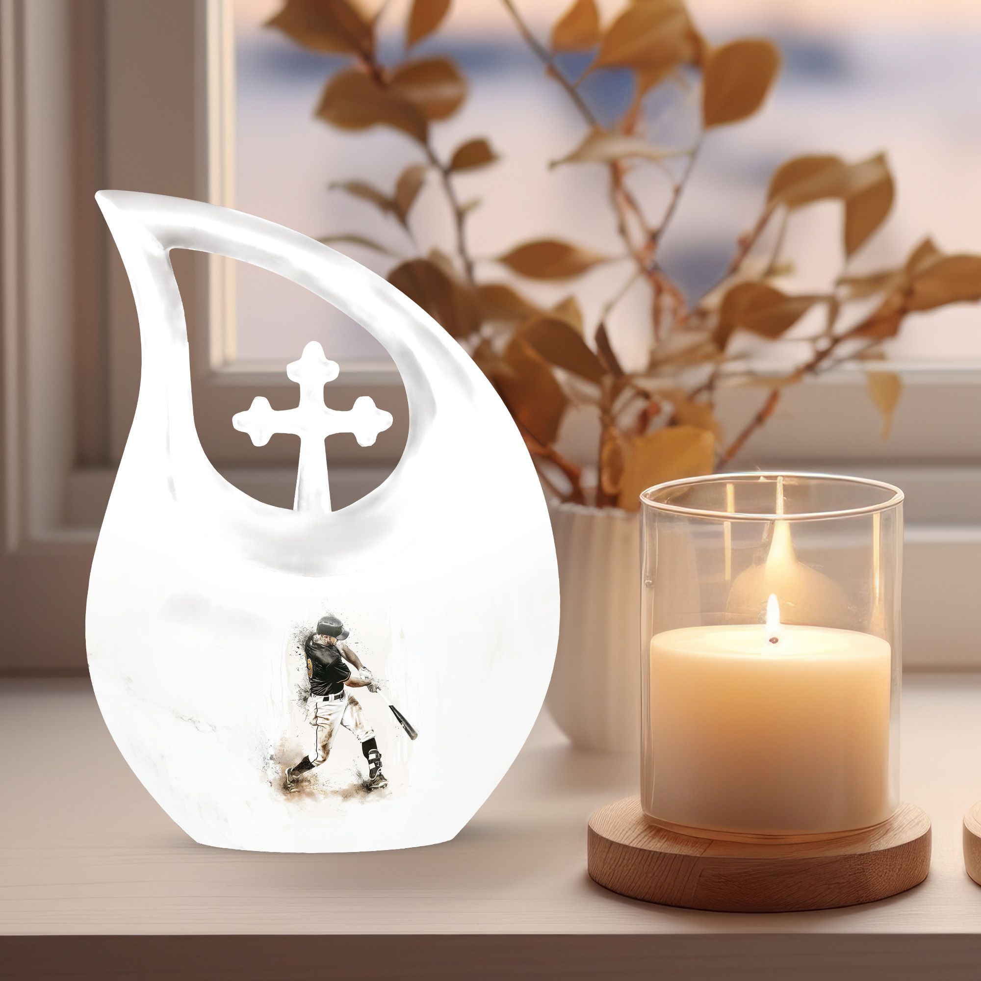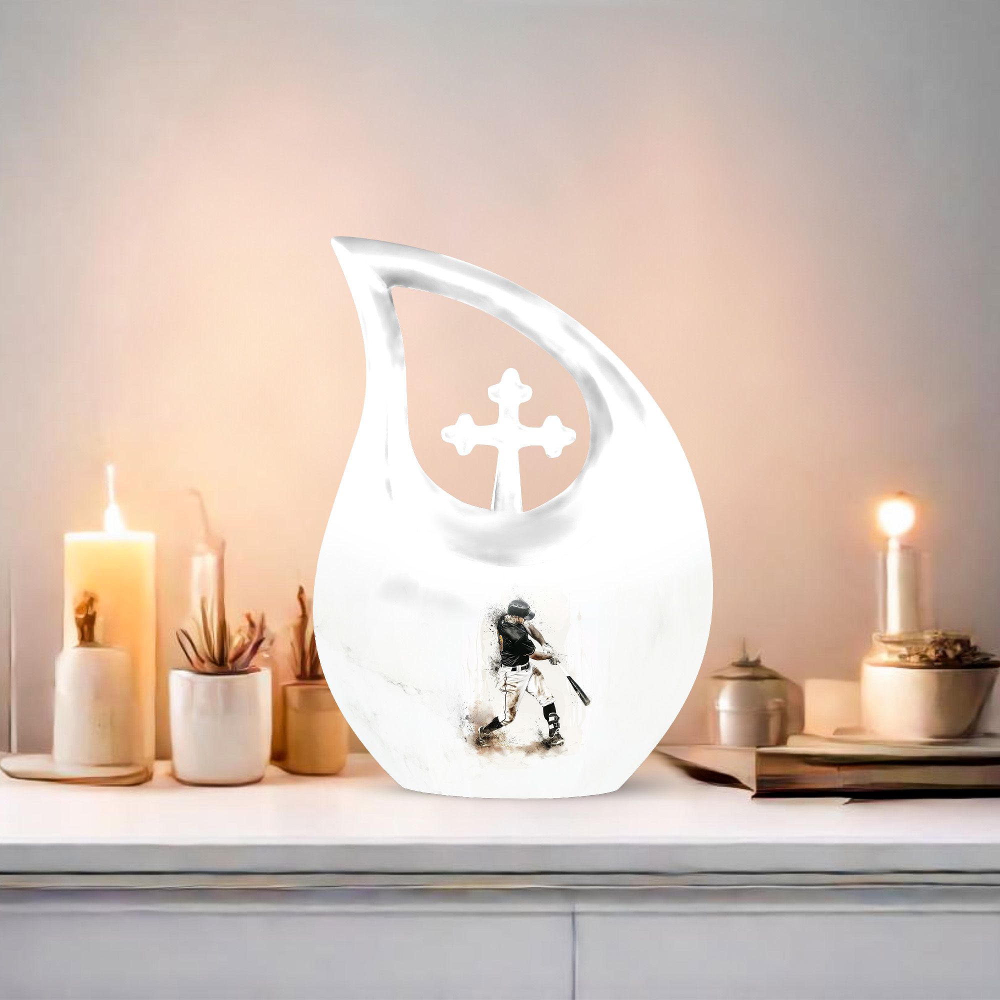 Say farewell to your loved one with dignity and respect using our Medium Size Baseball Urn. This standout memorial piece carries the unique theme of baseball, resonating with the sport enthusiasts and creating a heartfelt tribute to the departed. Crafted from superior-quality aluminium, this urn weighs 3.3 pounds, offering excellent stability and longevity. At 10 inches in height with a 200 cubic inch capacity, this large urn has the space to securely hold the remains. The standout 'Cross Drop' URN DESIGN not only enhances the overall appearance but also brings in a spiritual touch to the final resting place of your dear one. Our package not only includes this exquisite urn but also a velvet pouch for containment and storage of ashes. Looking for a personal touch? We offer customization! You can personalize with engraved names, adding to the intimacy of the tribute. Our Baseball Urn is more than just a medium size urn; it is a personalized keepsake for ashes for a man that stands as a symbol of their loved life. Collectively, our customized urns for adults offer a truly fitting memorial for your loved one.