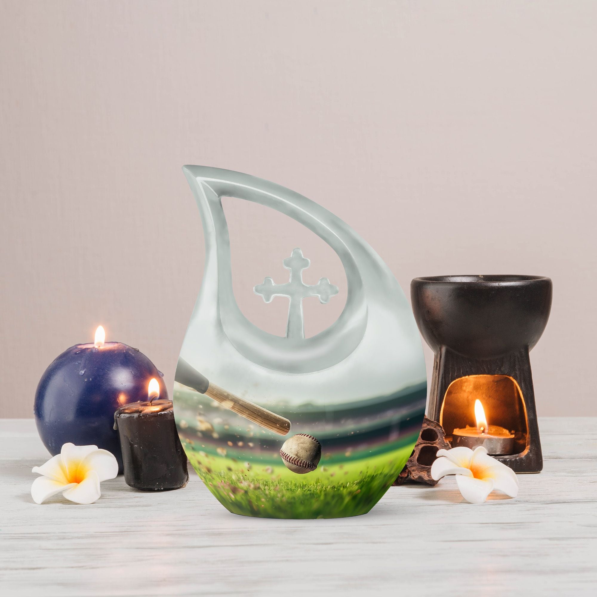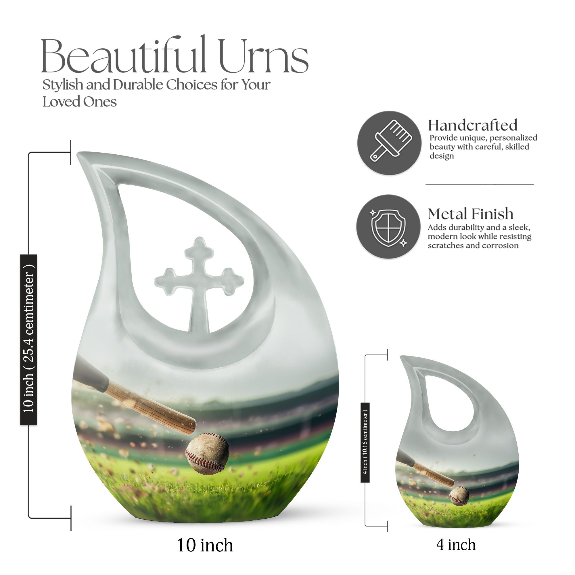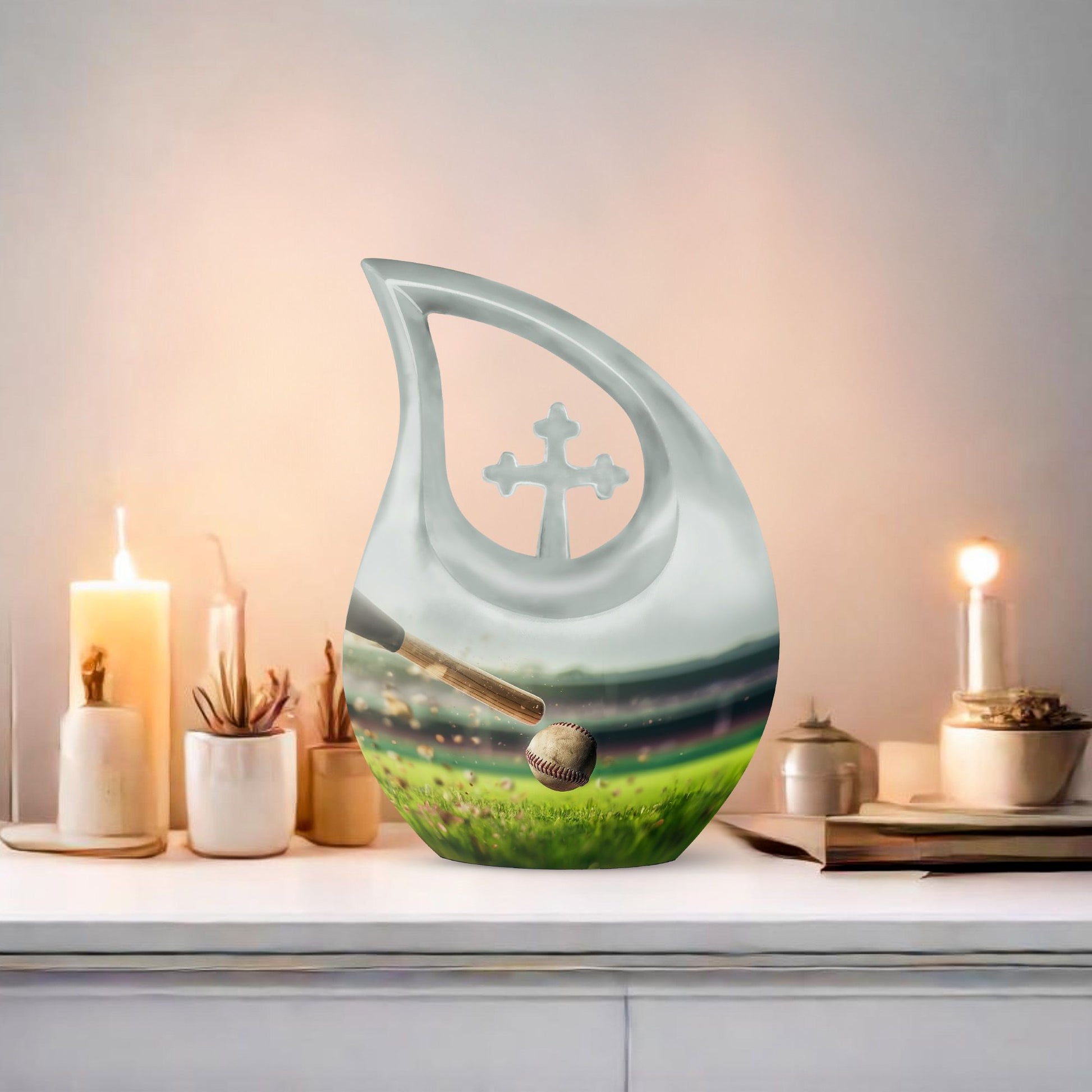Preserve the memory of your loved one with our bespoke Cross Drop Baseball Urn, an affordable yet dignified choice for a cremation urn. Crafted from high-quality aluminium, this large urn stands 10 inches tall and weighs in at 3.3 pounds. With a generous capacity of 200 cubic inches, it comfortably contains the ashes of an adult. This urn's baseball theme adds a poignant personal touch, making it an ideal choice for sports enthusiasts or fans. Each urn comes with a velvet pouch, providing a secure place for the containment of the ashes. What's more, you can further personalize this urn with engraved names, allowing you to keep your loved one's memory alive in a special and unique way. Purchase this low-cost cremation urn that beautifully merges functionality and sentiment to honor your dear one's life lived and their love for baseball.