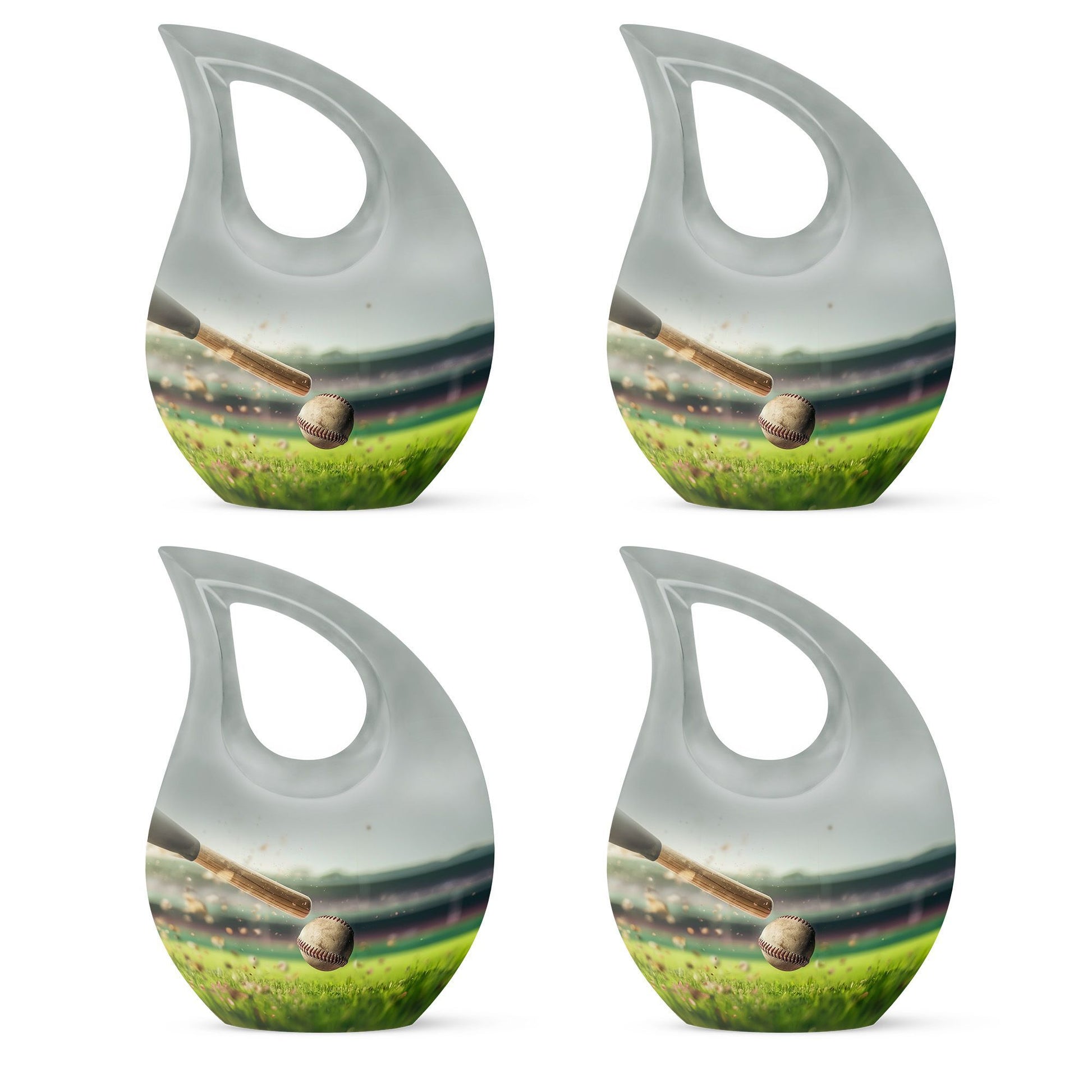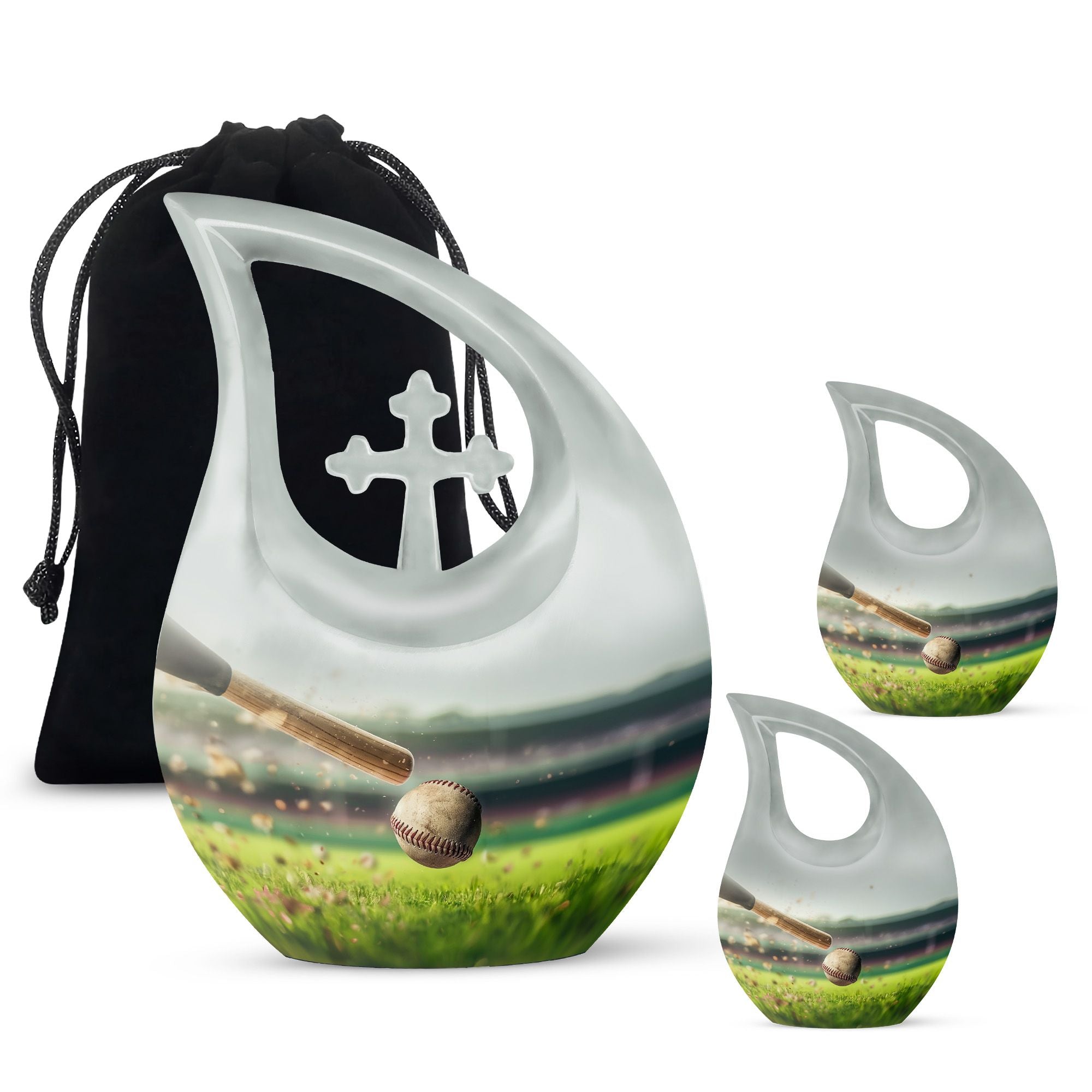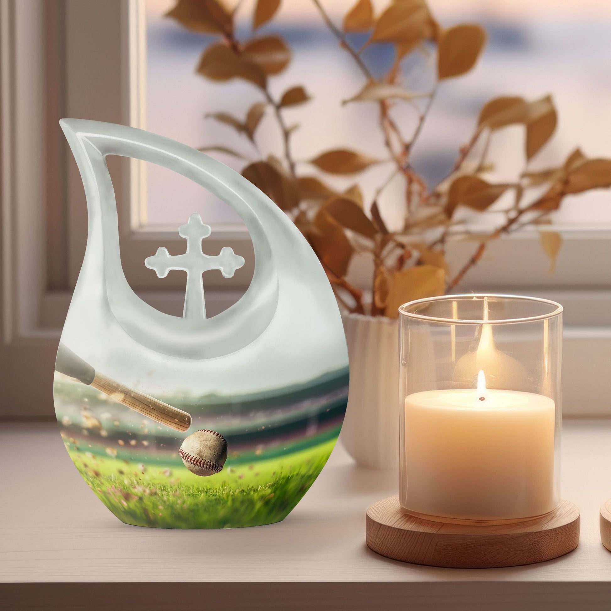 Preserve the memory of your loved one with our bespoke Cross Drop Baseball Urn, an affordable yet dignified choice for a cremation urn. Crafted from high-quality aluminium, this large urn stands 10 inches tall and weighs in at 3.3 pounds. With a generous capacity of 200 cubic inches, it comfortably contains the ashes of an adult. This urn's baseball theme adds a poignant personal touch, making it an ideal choice for sports enthusiasts or fans. Each urn comes with a velvet pouch, providing a secure place for the containment of the ashes. What's more, you can further personalize this urn with engraved names, allowing you to keep your loved one's memory alive in a special and unique way. Purchase this low-cost cremation urn that beautifully merges functionality and sentiment to honor your dear one's life lived and their love for baseball.