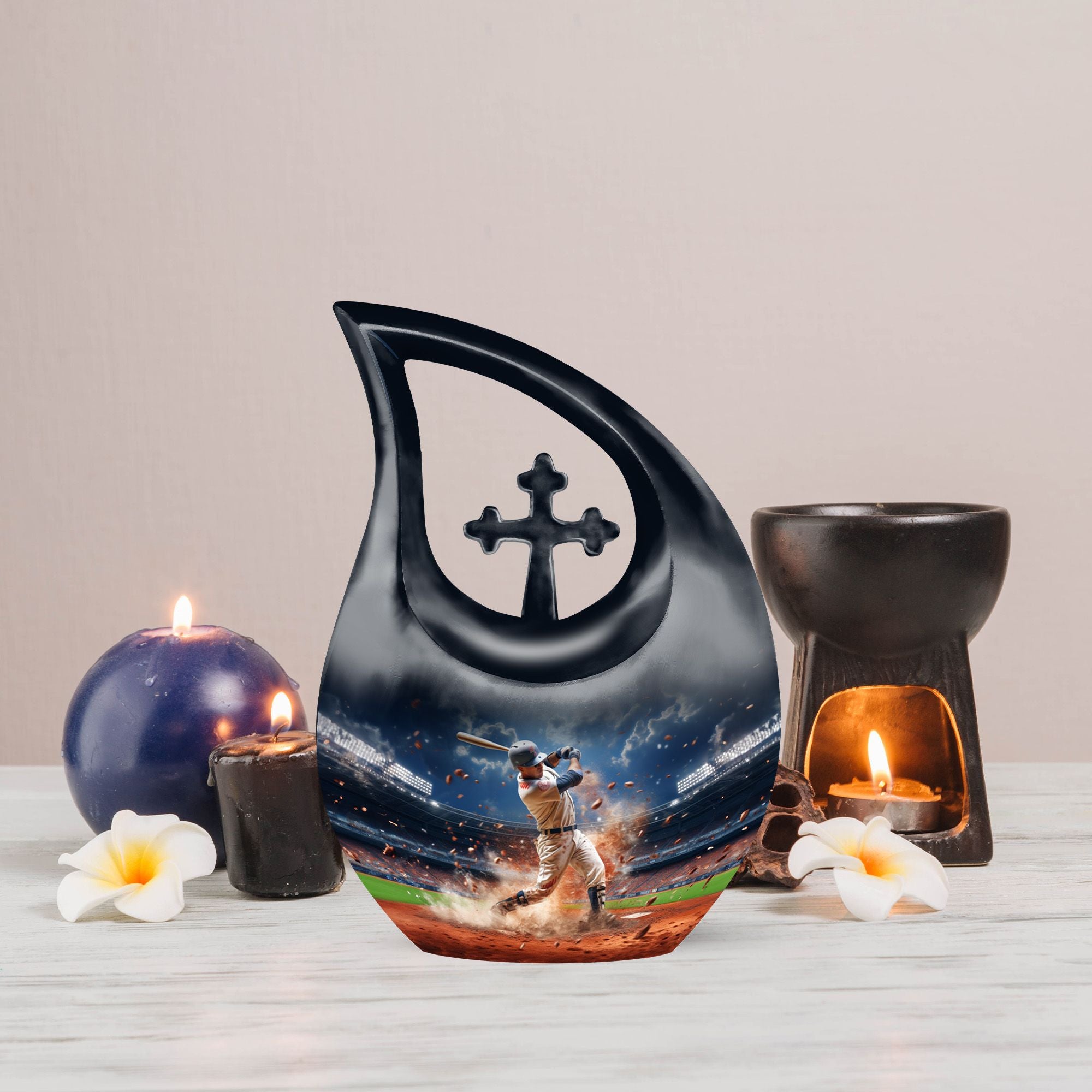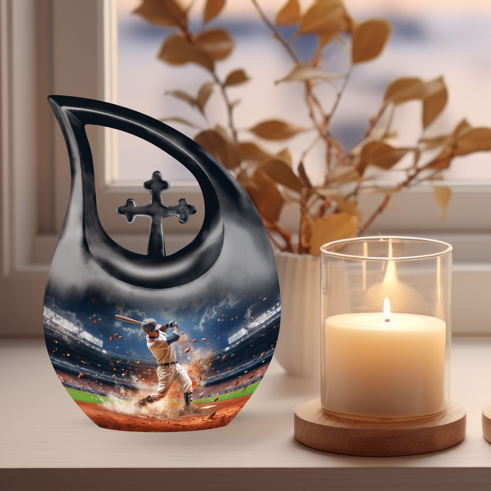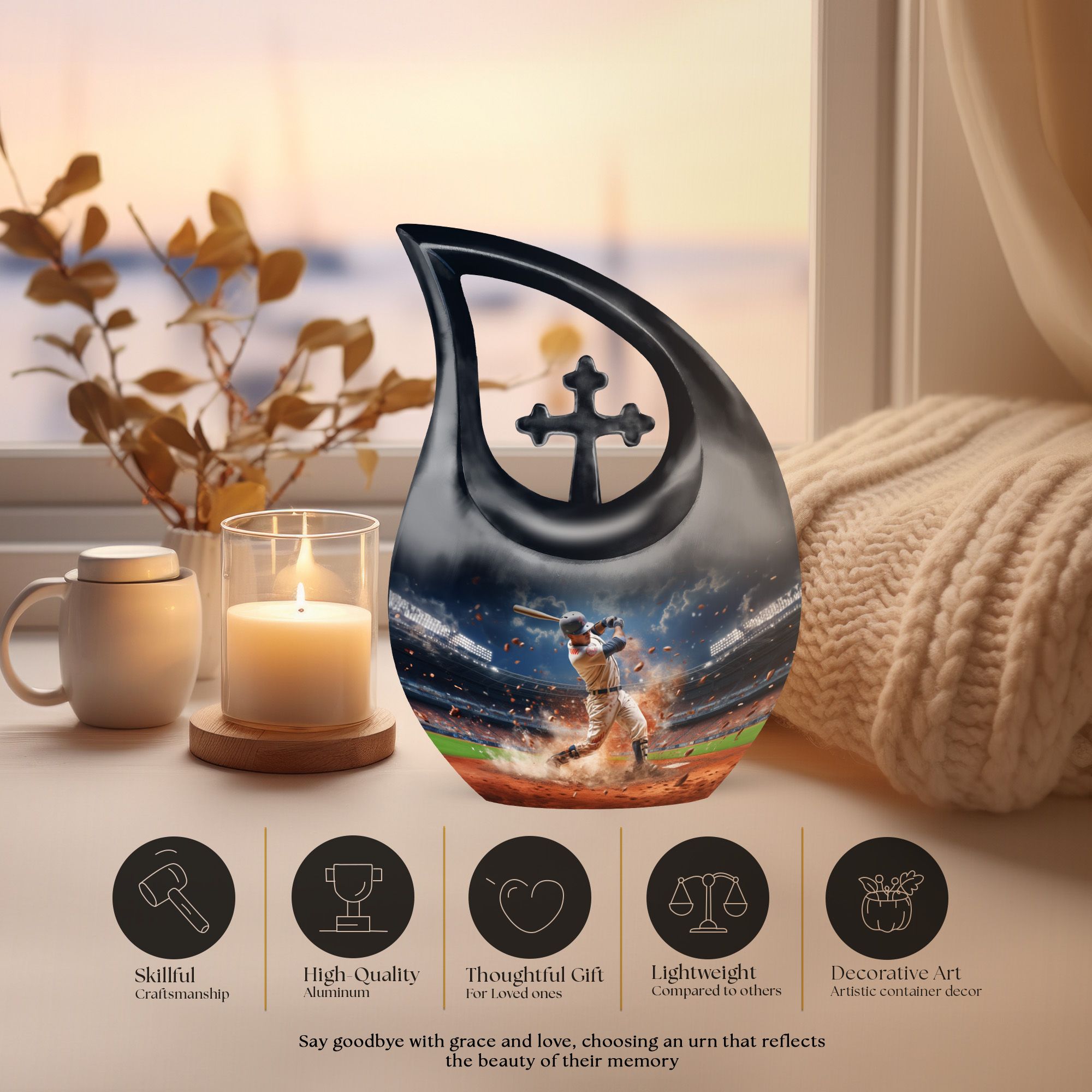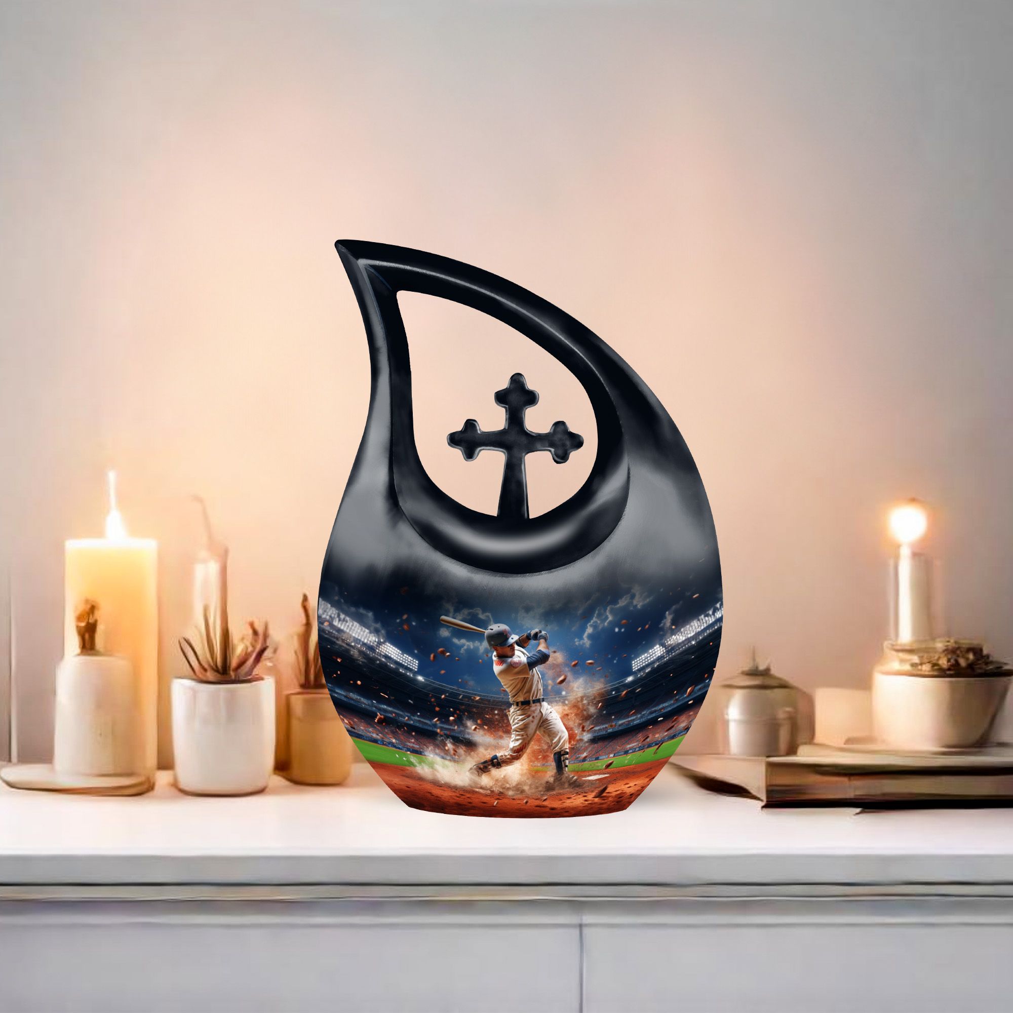 Crafted with durable aluminum, this urn features detailed baseball artwork symbolizing dedication, teamwork, and treasured moments. Standing 10 inches tall and holding 200 cubic inches of ashes, it is suitable for families needing unique urns for ashes, cremation urns for burial, burial urns for ashes, or even outdoor placement such as urn for burial in ground. The secure screw-top lid ensures ashes remain safely protected, while the design allows for memorial display or cemetery interment. It is also ideal for burial needs including burial urns for ground, urns for burial in ground, burial urns for human ashes, and burial urns for humans.