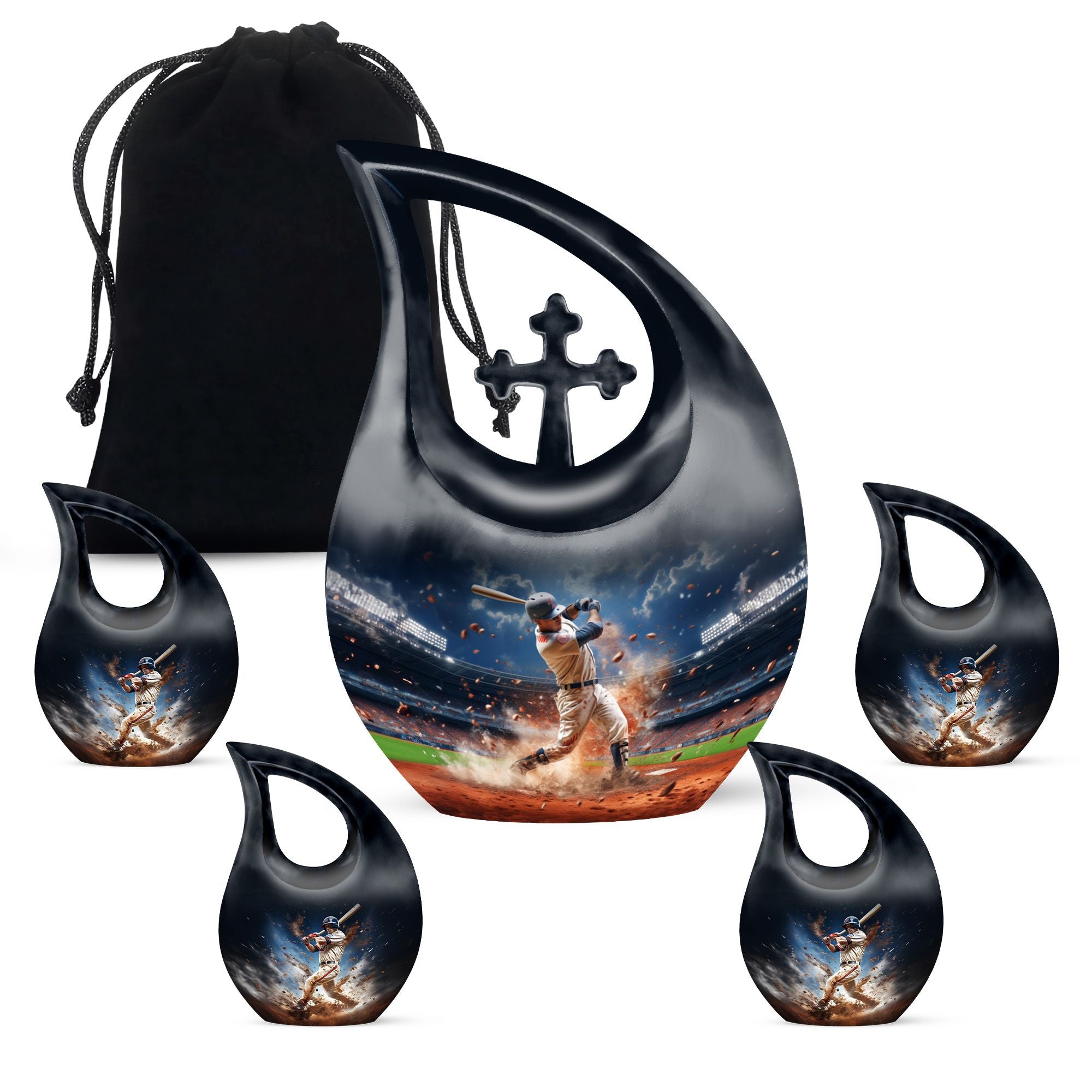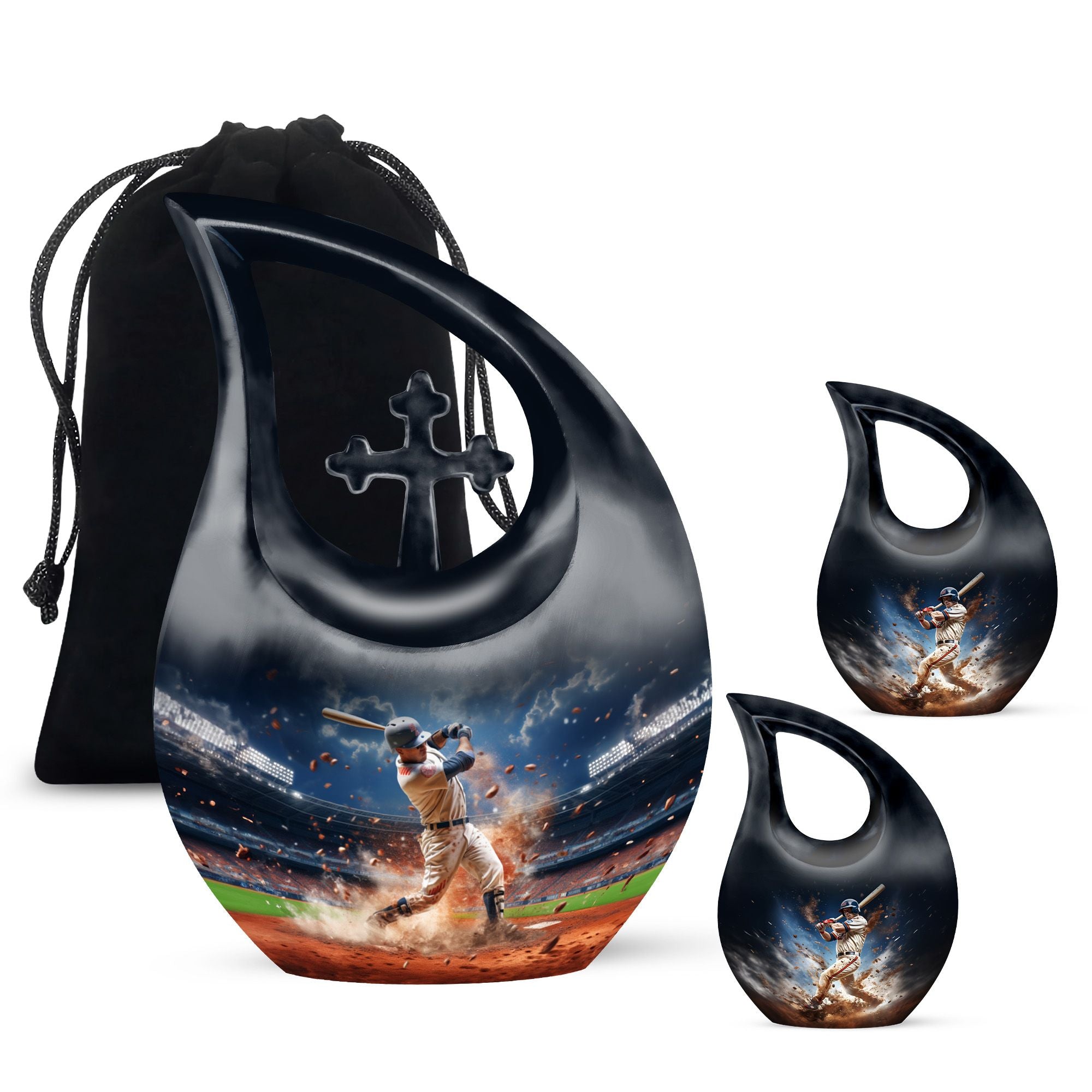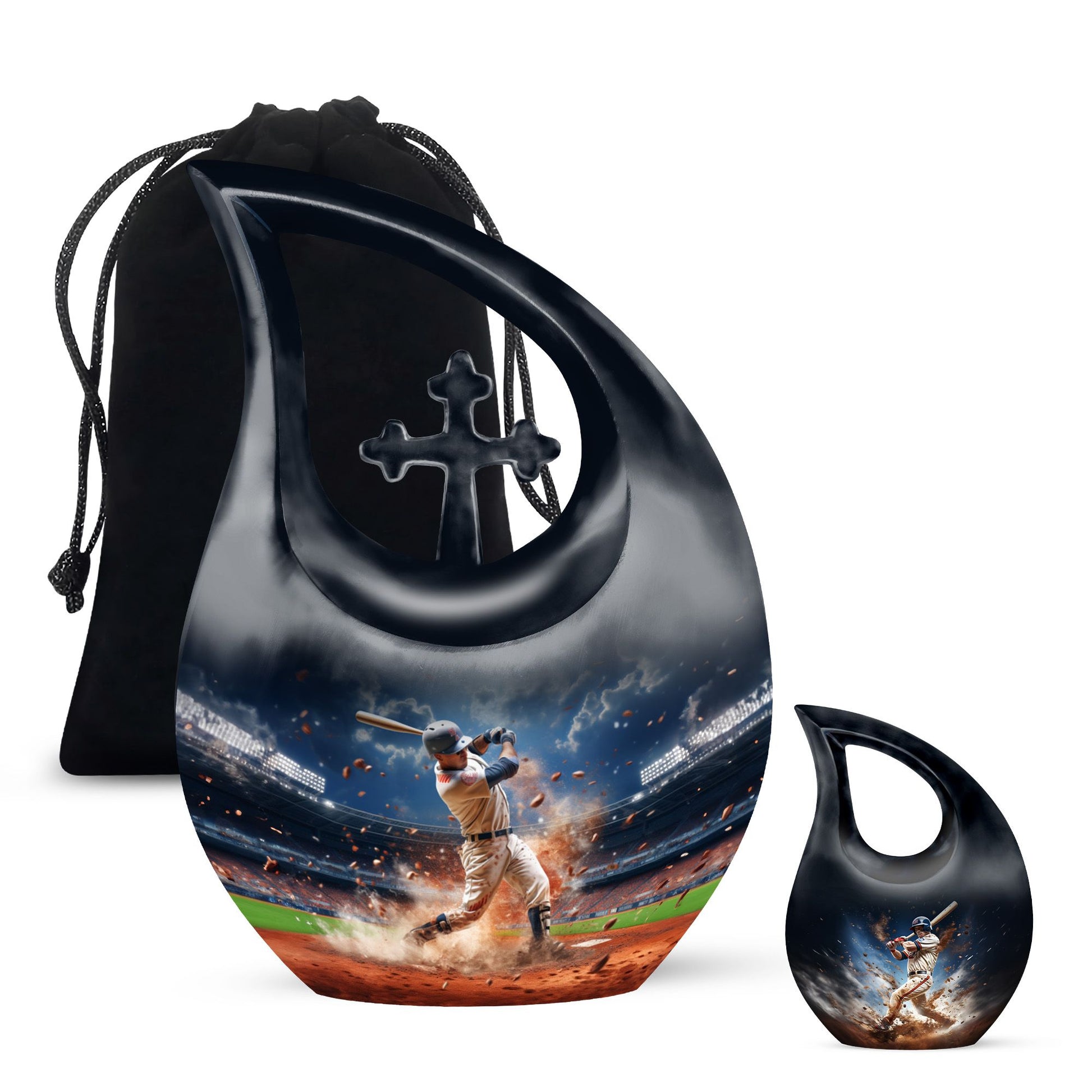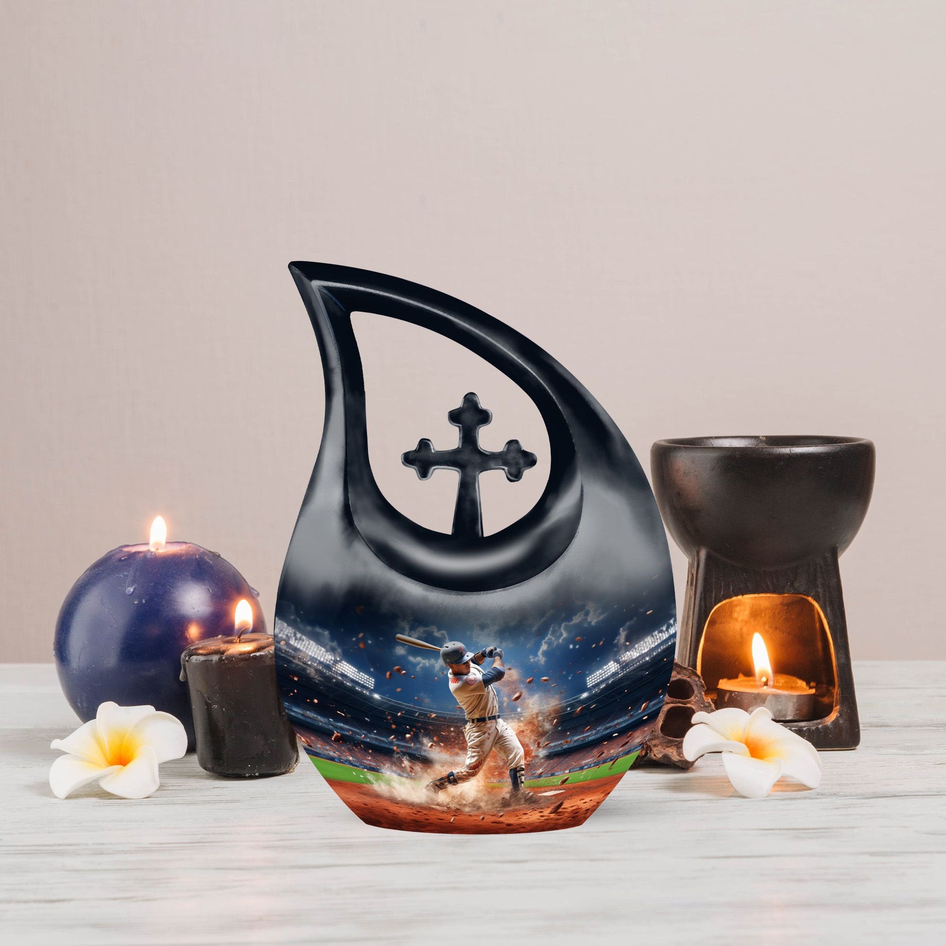 Crafted with durable aluminum, this urn features detailed baseball artwork symbolizing dedication, teamwork, and treasured moments. Standing 10 inches tall and holding 200 cubic inches of ashes, it is suitable for families needing unique urns for ashes, cremation urns for burial, burial urns for ashes, or even outdoor placement such as urn for burial in ground. The secure screw-top lid ensures ashes remain safely protected, while the design allows for memorial display or cemetery interment. It is also ideal for burial needs including burial urns for ground, urns for burial in ground, burial urns for human ashes, and burial urns for humans.
