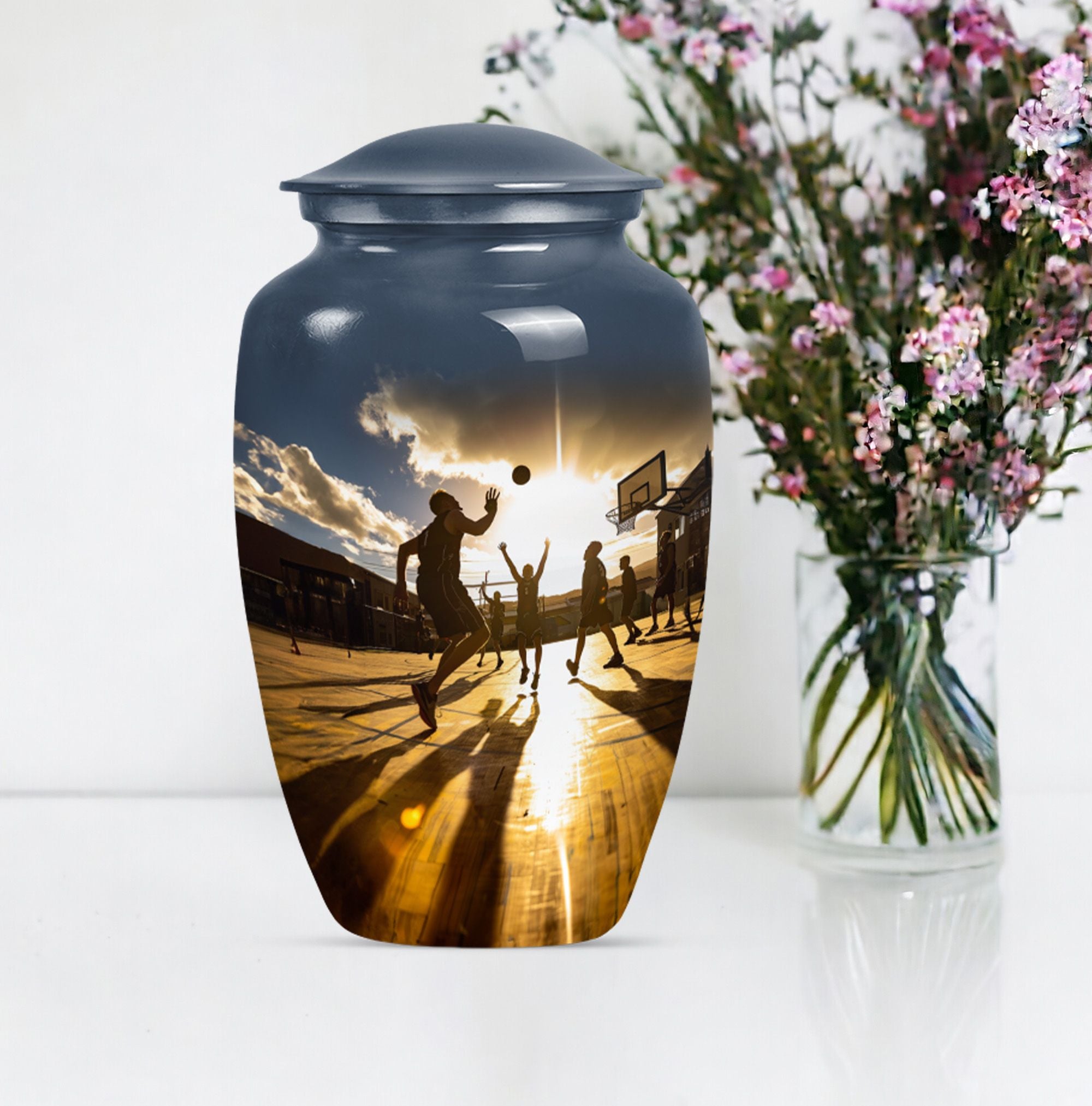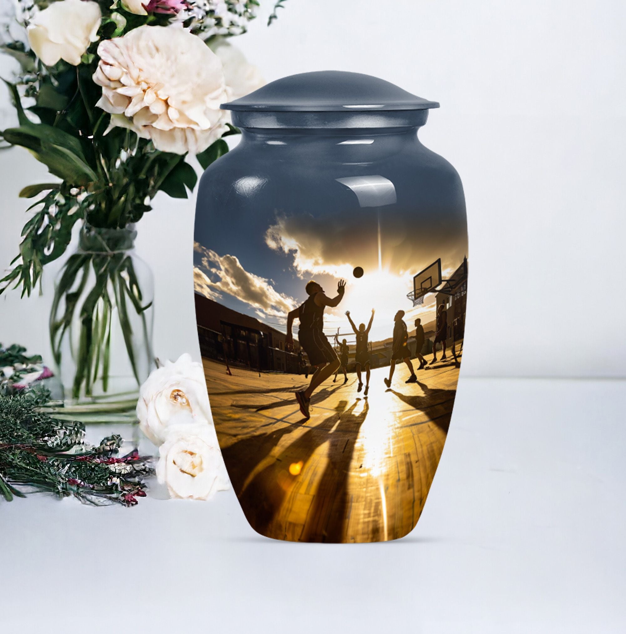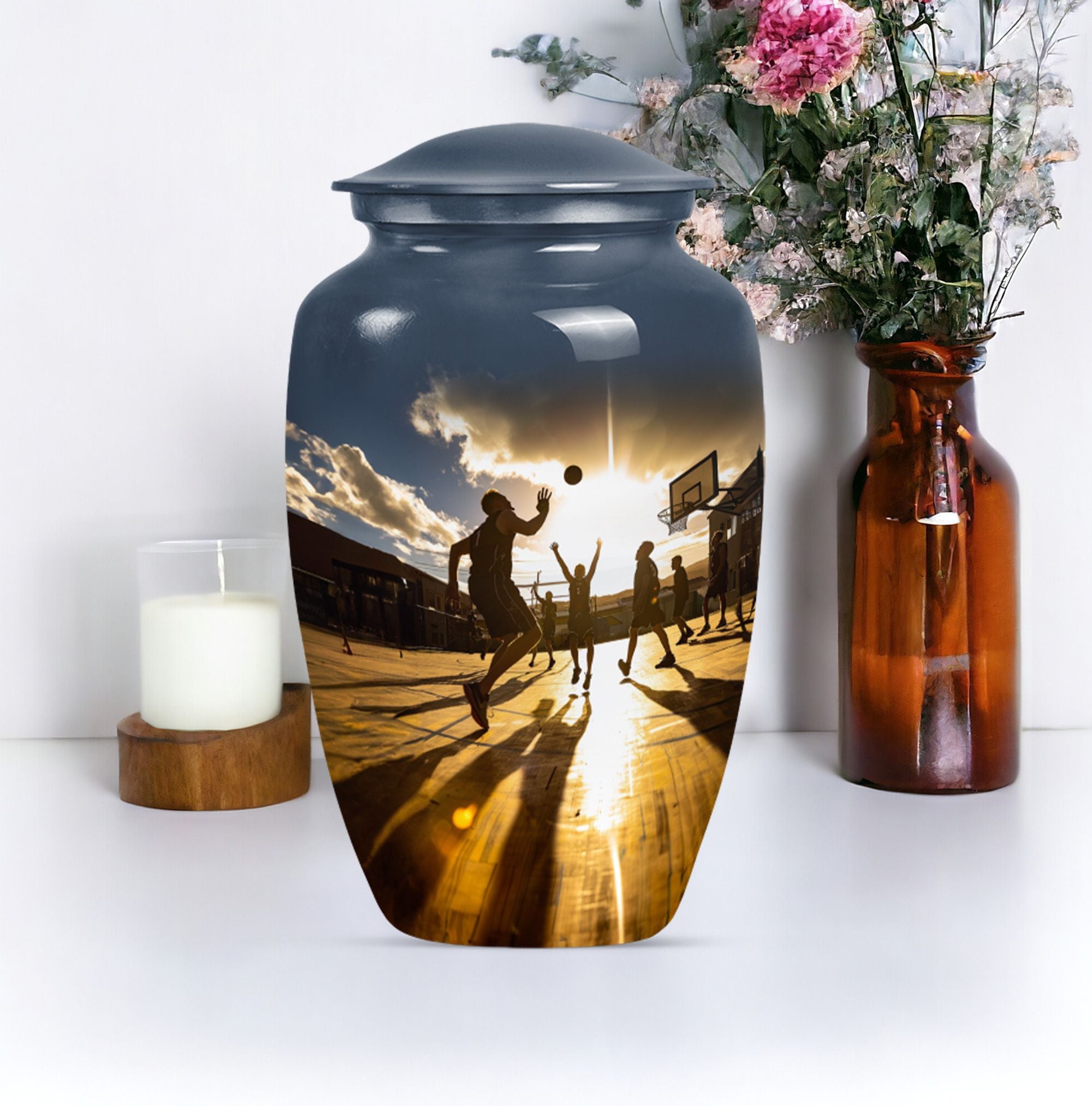 Introducing our 'Abstract Theme' Large Urn, an exquisite memorial tribute tailored for your precious loved ones. Crafted from sturdy, high-quality Aluminium, this urn is designed to stand the test of time. It measures a considerable 10 inches in height and can accommodate up to 200 cubic inches, making it ideal for storing adult female ashes. The 'Classic Urn' design instils a sense of calm and peace, while the weight of 3.3 pounds assures its robustness. Our unique basketball Urn comes with a velvet pouch, providing a dignified containment for the ashes. This product allows for personal touches with engraved names, adding a heartfelt touch to commemorate your departed. This urn gracefully fulfills the need for 'memorial urns for women' and is apt for ground burial as well. Uncommonly termed as 'women urns,' or 'metal urns for human ashes adult female', is a tasteful conclusion to your search for 'urns for human ashes.'