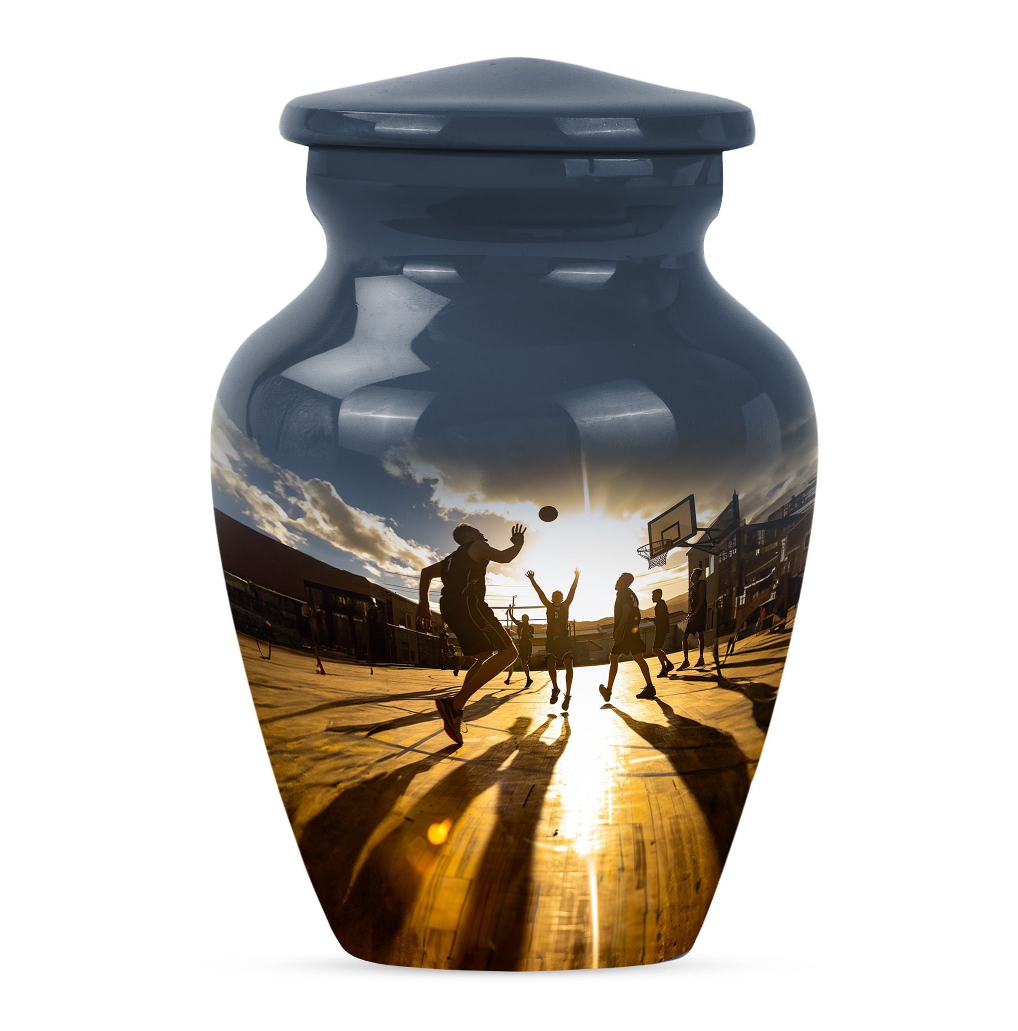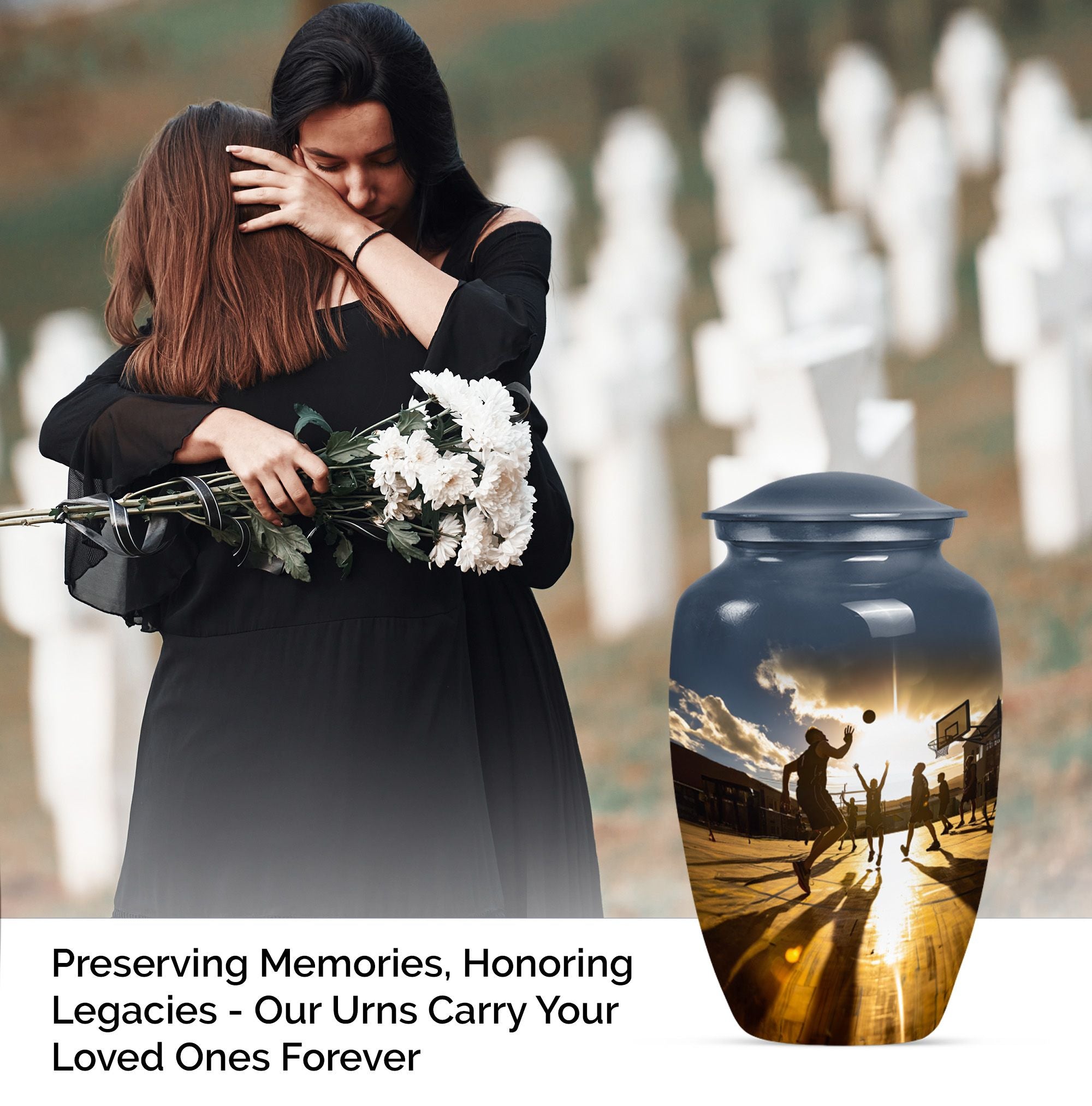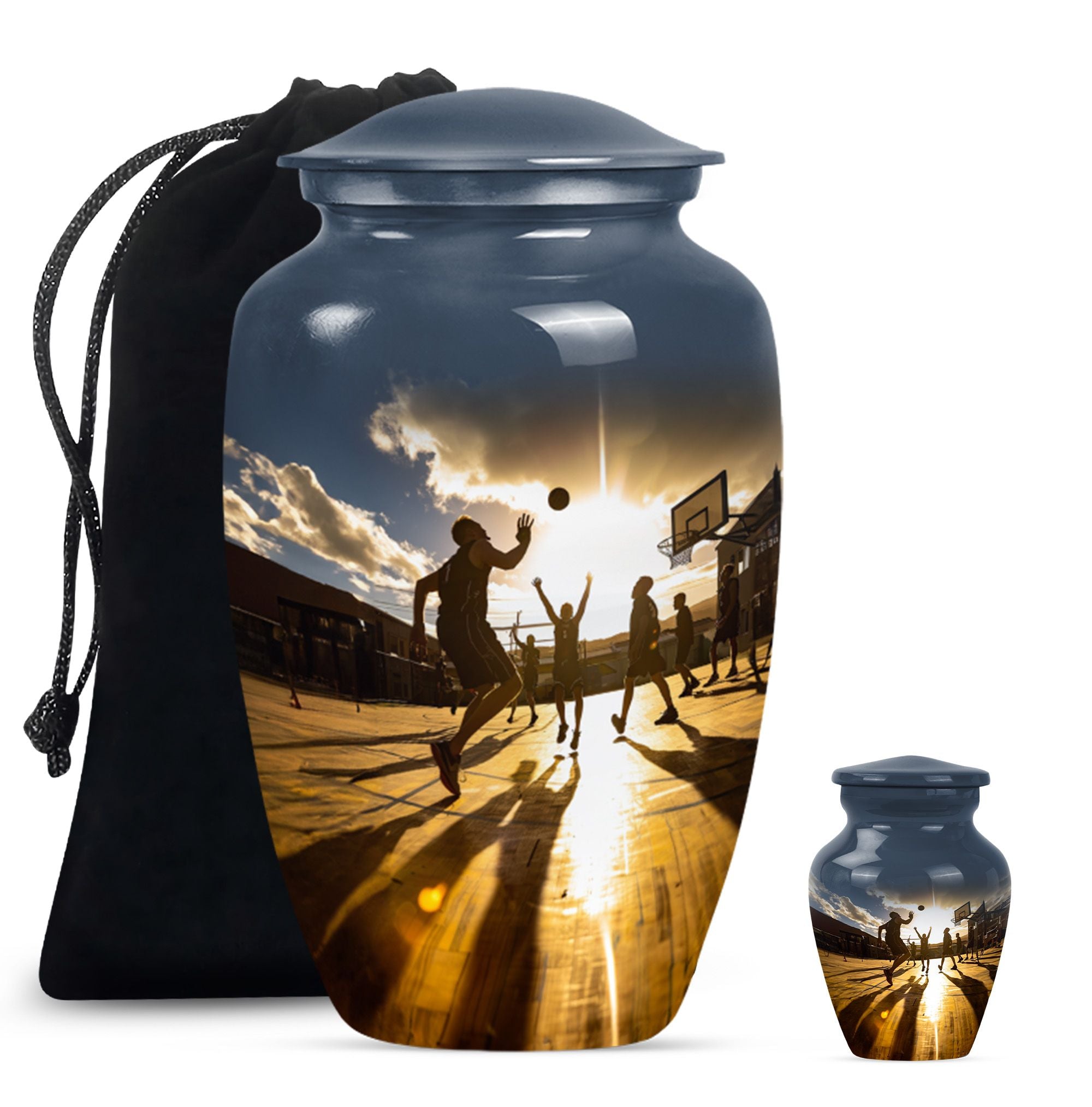 Introducing our 'Abstract Theme' Large Urn, an exquisite memorial tribute tailored for your precious loved ones. Crafted from sturdy, high-quality Aluminium, this urn is designed to stand the test of time. It measures a considerable 10 inches in height and can accommodate up to 200 cubic inches, making it ideal for storing adult female ashes. The 'Classic Urn' design instils a sense of calm and peace, while the weight of 3.3 pounds assures its robustness. Our unique basketball Urn comes with a velvet pouch, providing a dignified containment for the ashes. This product allows for personal touches with engraved names, adding a heartfelt touch to commemorate your departed. This urn gracefully fulfills the need for 'memorial urns for women' and is apt for ground burial as well. Uncommonly termed as 'women urns,' or 'metal urns for human ashes adult female', is a tasteful conclusion to your search for 'urns for human ashes.'