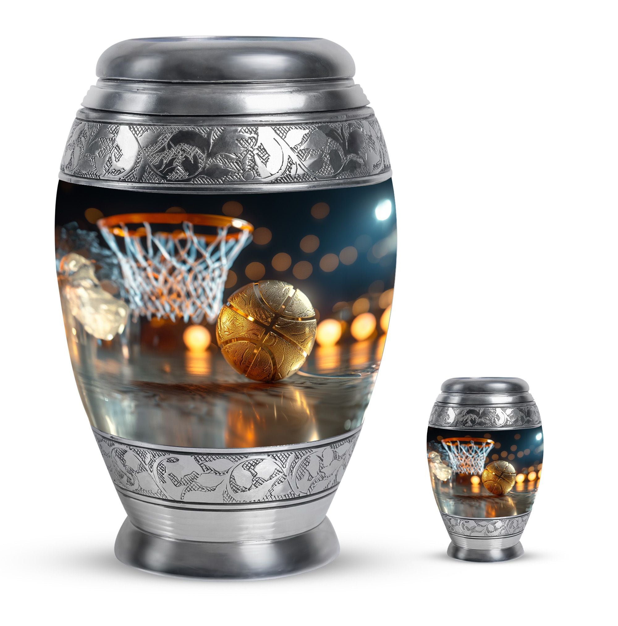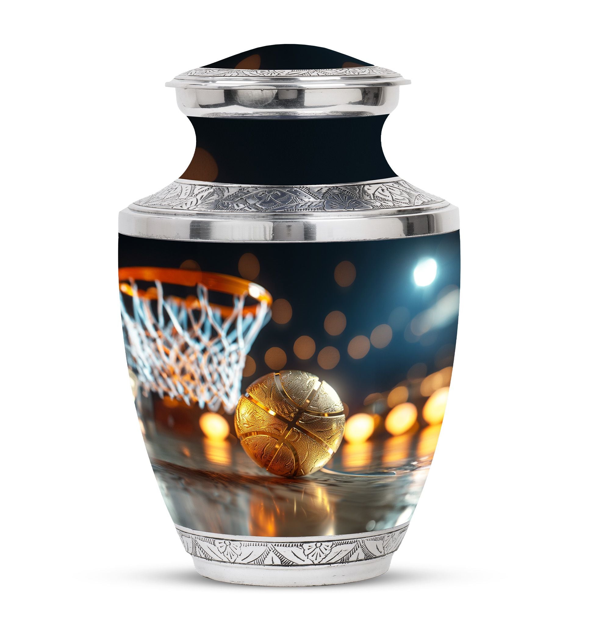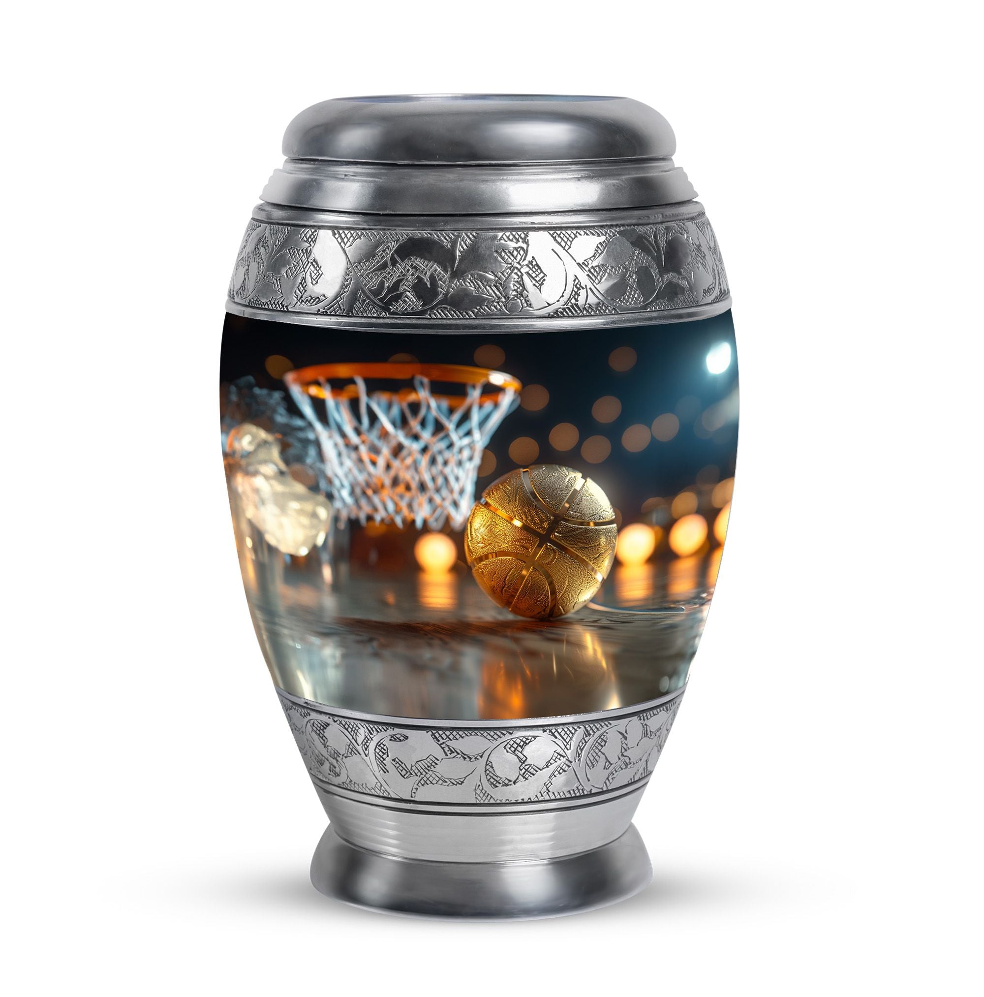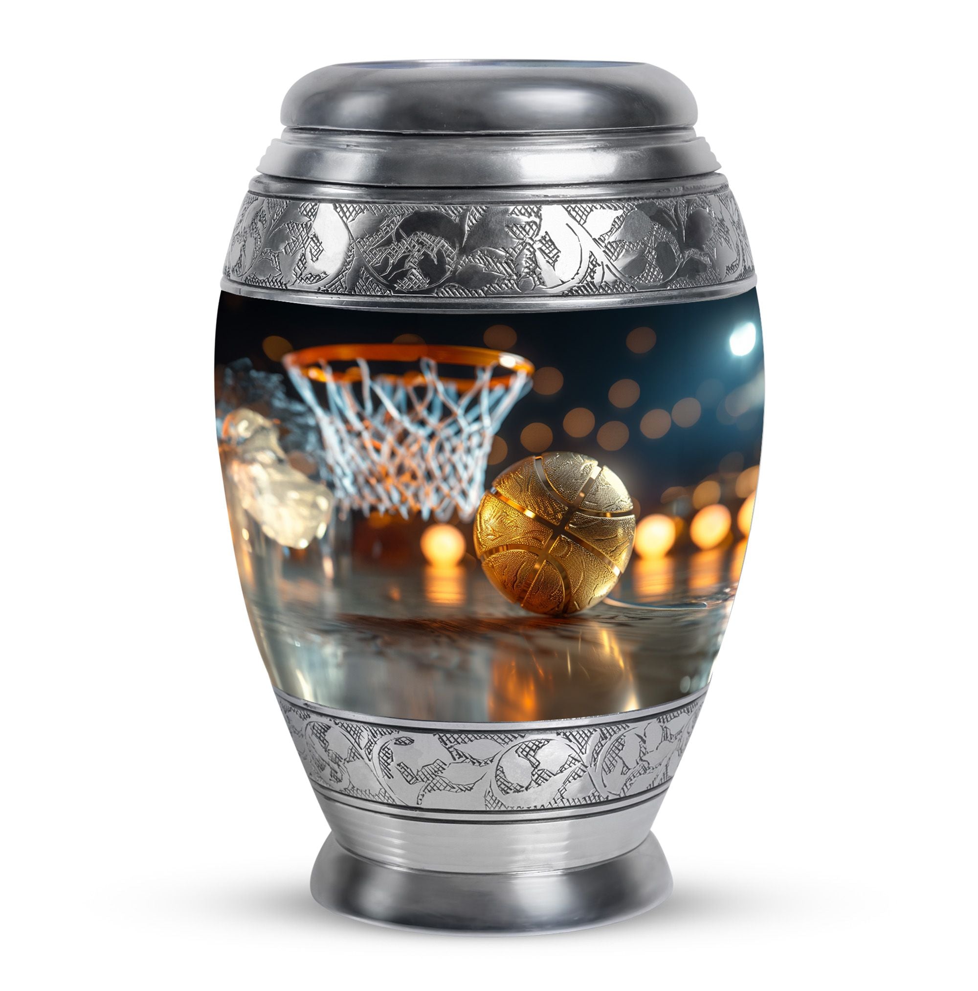 Expertly crafted from high-quality aluminum, this urn features a bold basketball design that captures the spirit of the game. Its polished finish provides timeless elegance, while the secure screw-top lid ensures ashes are safely contained. As one of the most versatile large cremation urns, it serves beautifully for home display, memorial ceremonies, or burial. Families looking for urns for ashes adult male large or urns for human ashes large adult female will find this design both unique and meaningful.