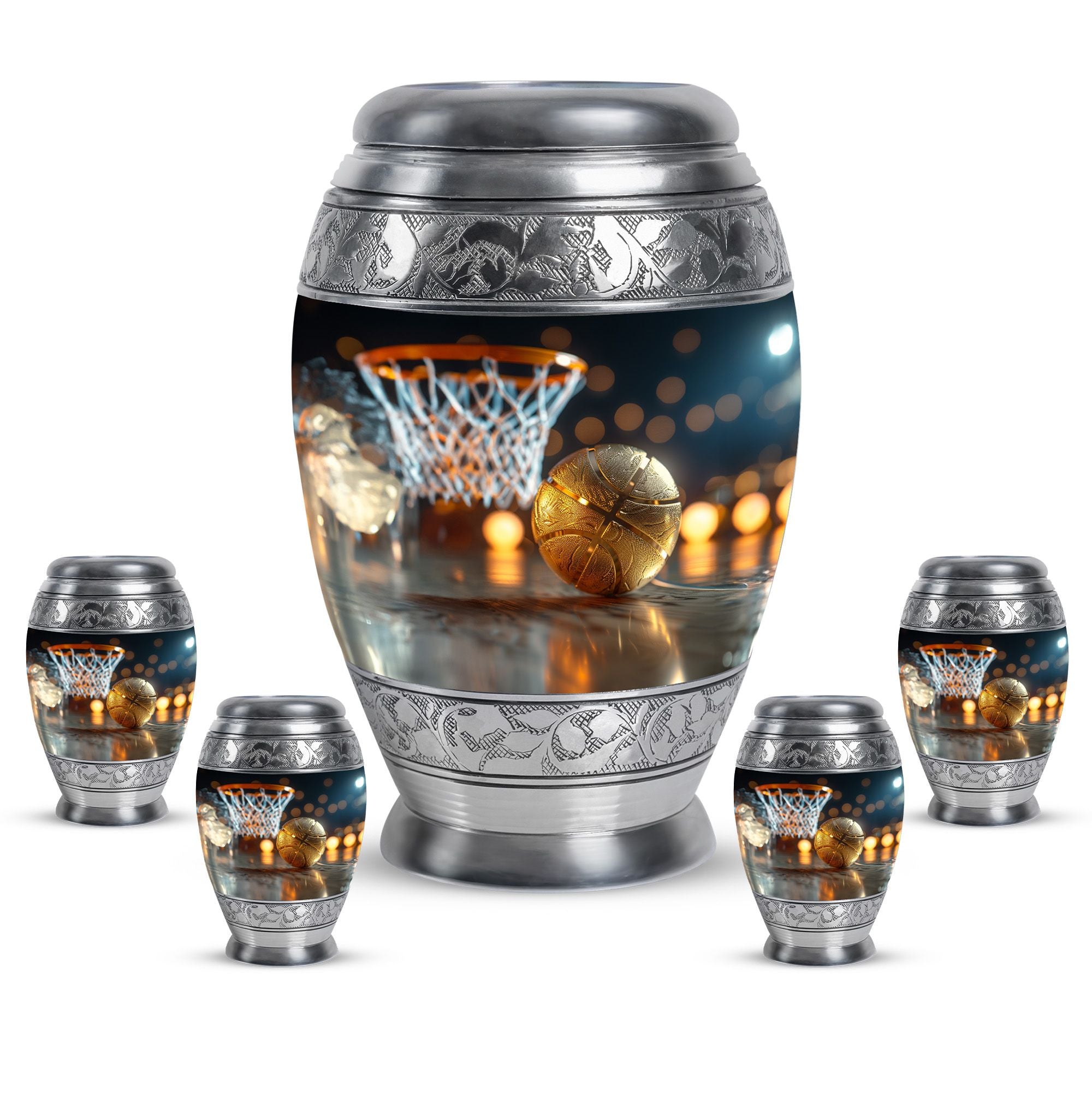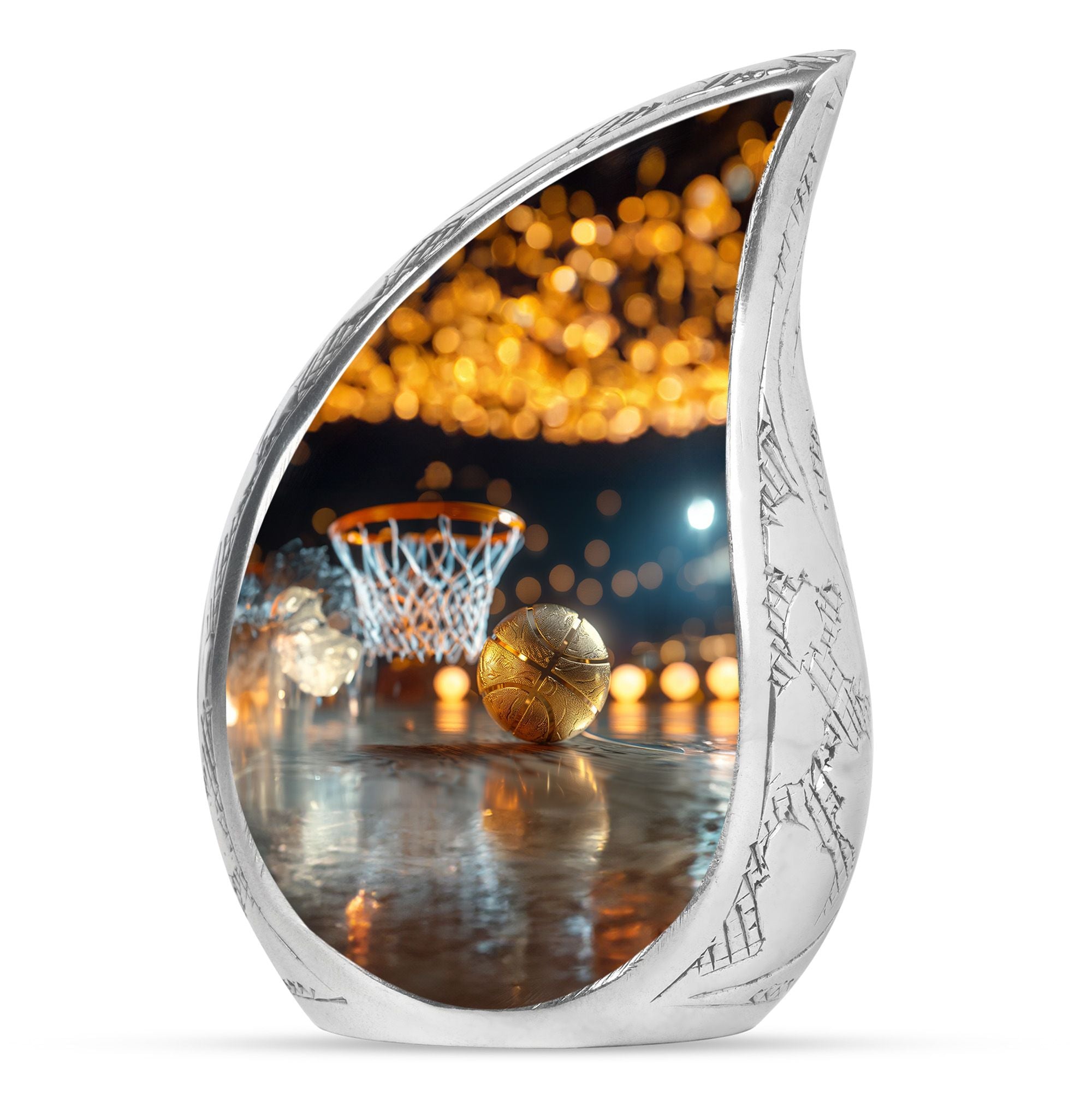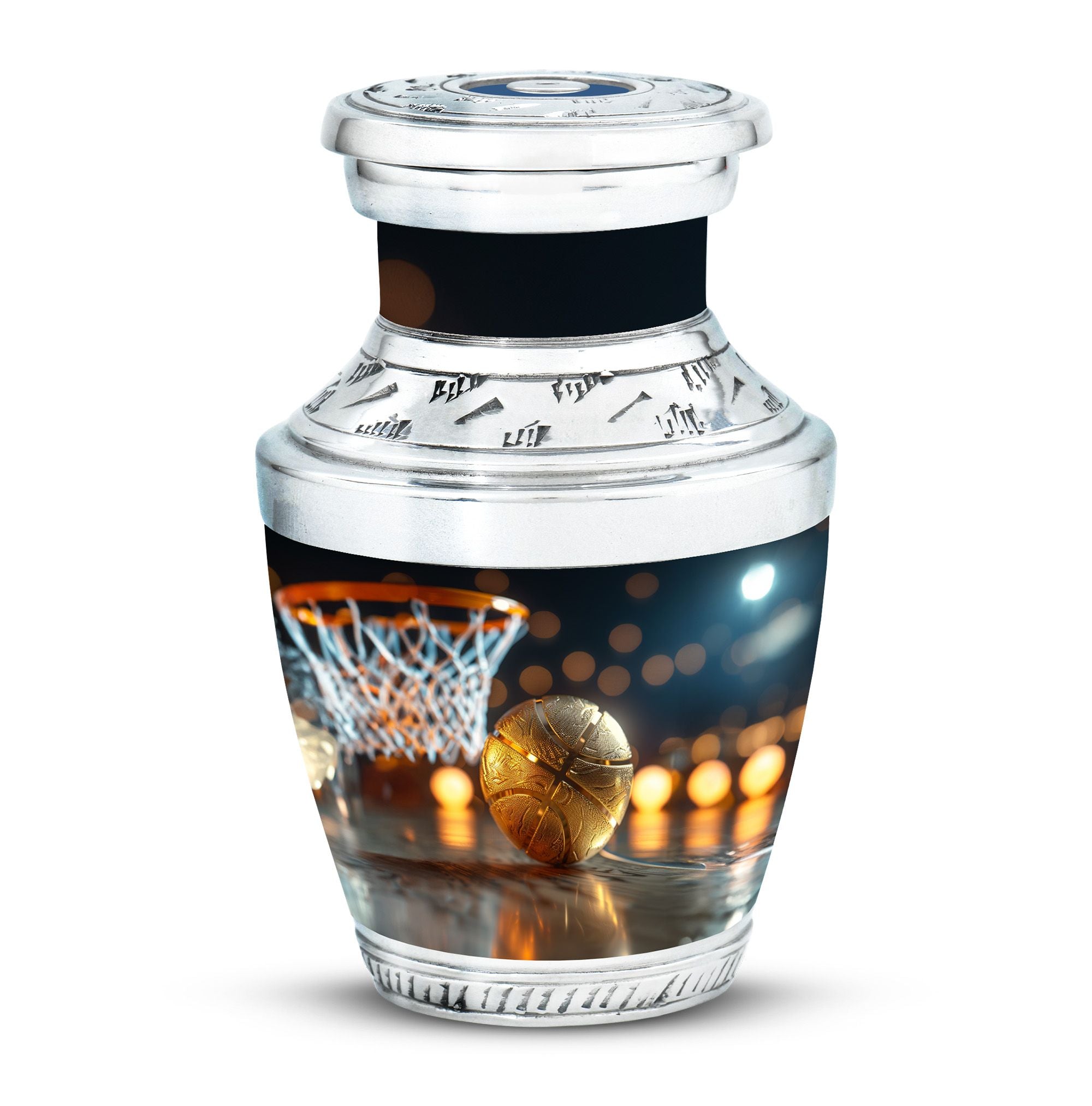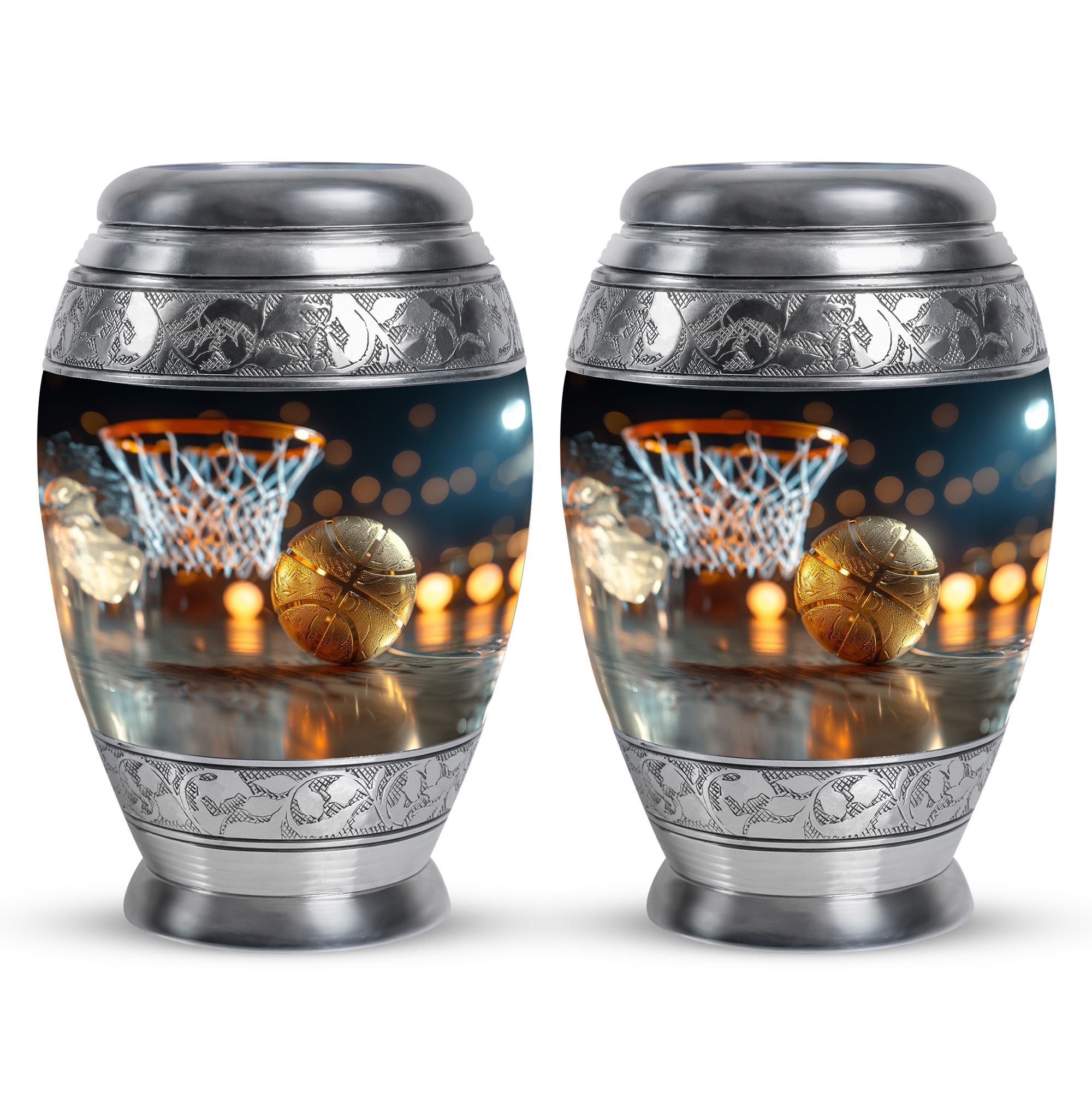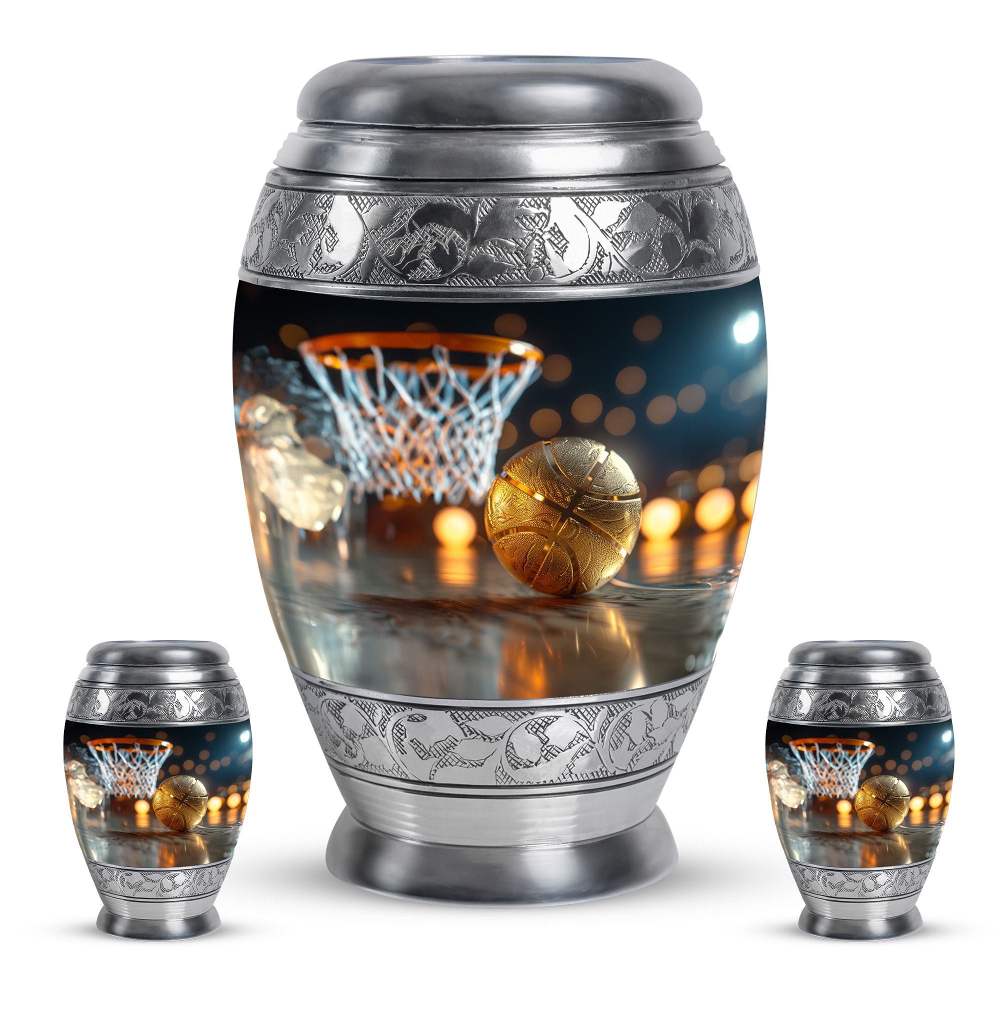 Expertly crafted from high-quality aluminum, this urn features a bold basketball design that captures the spirit of the game. Its polished finish provides timeless elegance, while the secure screw-top lid ensures ashes are safely contained. As one of the most versatile large cremation urns, it serves beautifully for home display, memorial ceremonies, or burial. Families looking for urns for ashes adult male large or urns for human ashes large adult female will find this design both unique and meaningful.