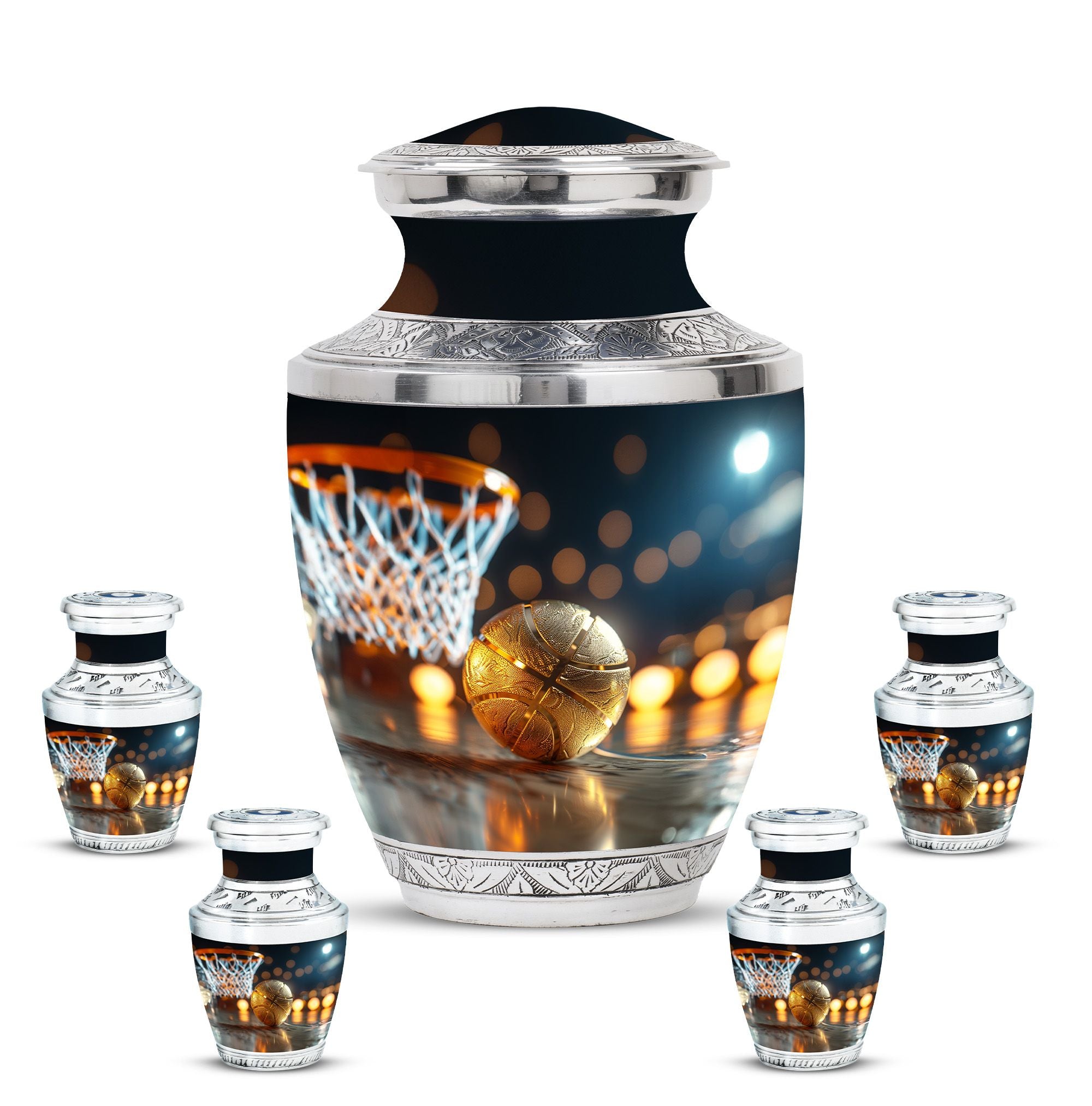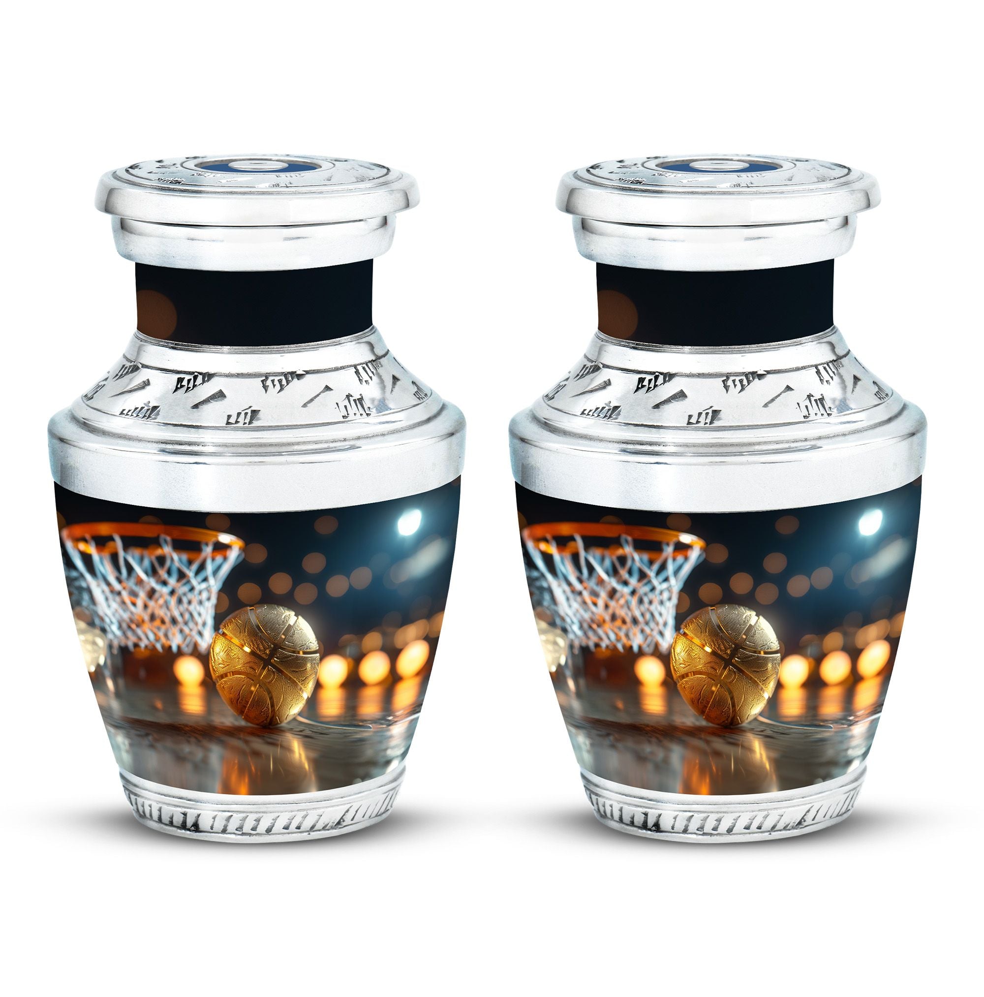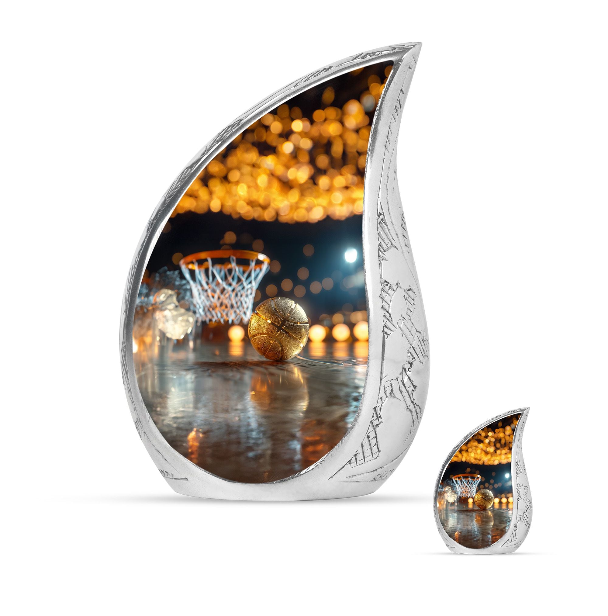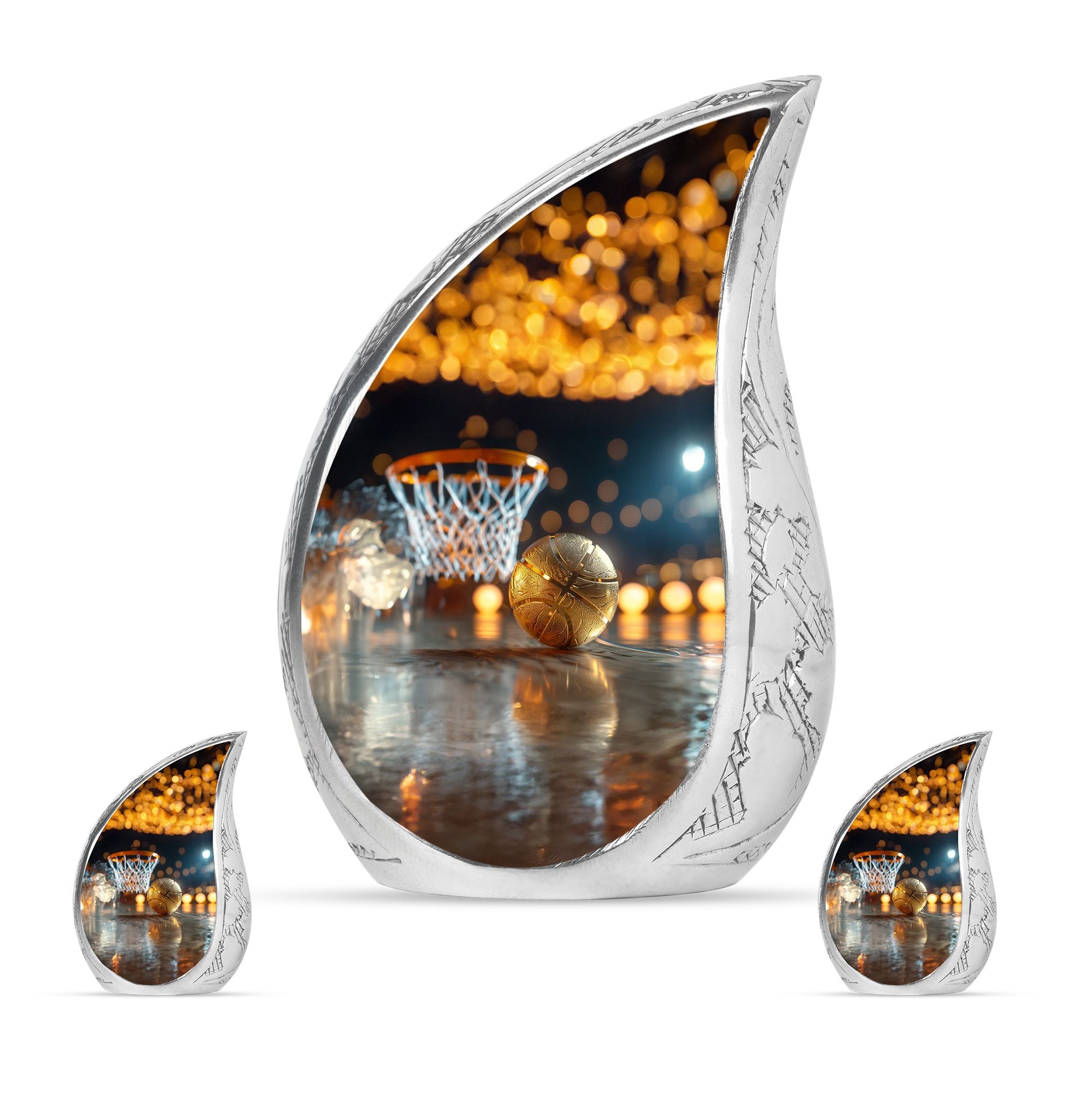 Expertly crafted from high-quality aluminum, this urn features a bold basketball design that captures the spirit of the game. Its polished finish provides timeless elegance, while the secure screw-top lid ensures ashes are safely contained. As one of the most versatile large cremation urns, it serves beautifully for home display, memorial ceremonies, or burial. Families looking for urns for ashes adult male large or urns for human ashes large adult female will find this design both unique and meaningful.