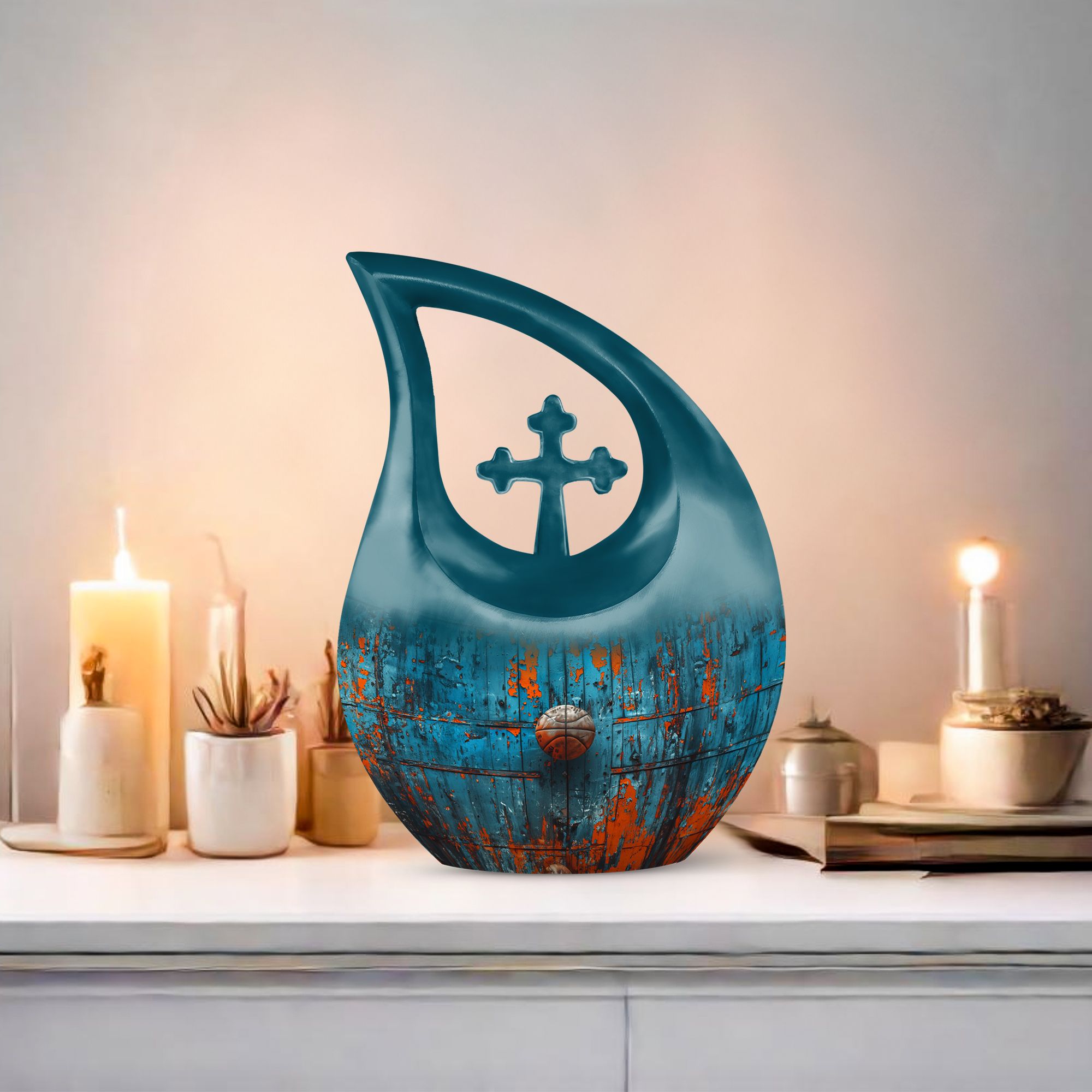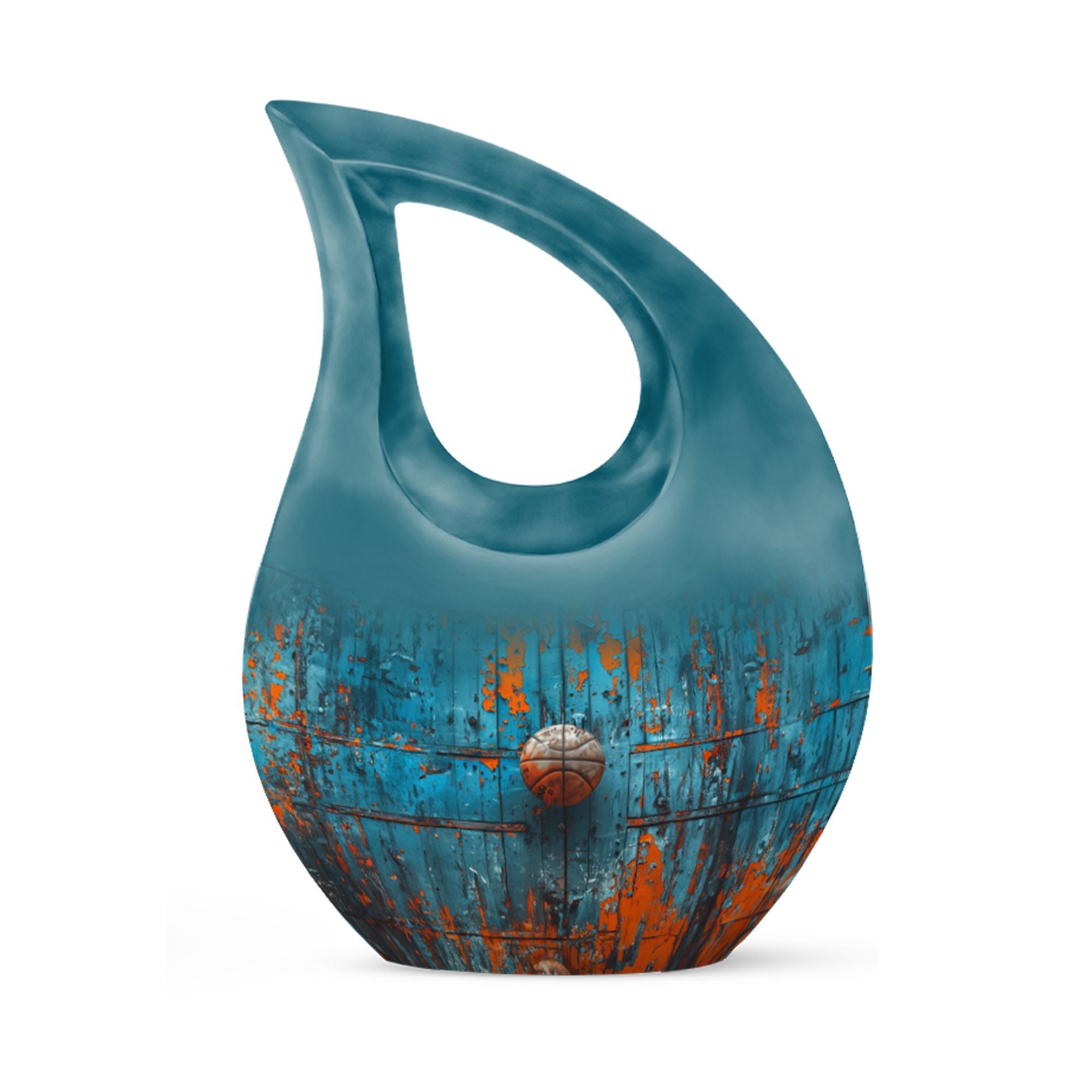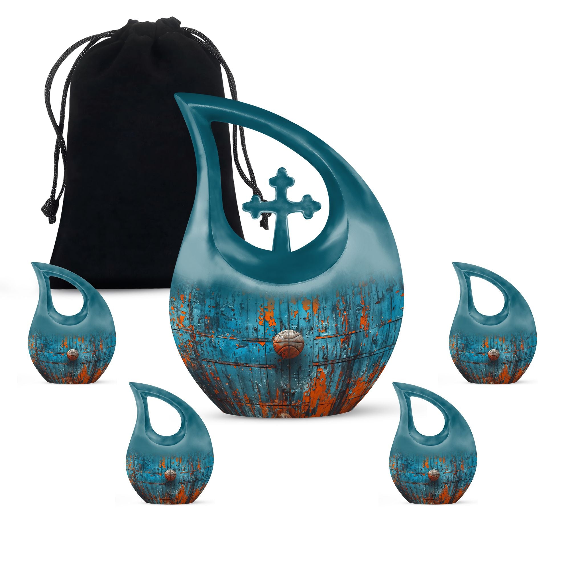Honoring your dearly departed's love for basketball and the Christian faith has never been more dignified with our Cross Drop Basketball Urn. This stately memorial urn is handcrafted from high-quality aluminium and stands at 10 inches tall, embodying a refined balance of elegance and strength. It possesses an impressive 200 cubic inches capacity, making it suitable for large urn needs. Included in your purchase is a sumptuous velvet pouch, providing a respectful containment for ashes. Despite the impeccable quality, this urn remains affordable, adhering to our belief that commemorating a loved one should not weigh heavily on your budget. In addition, we offer the ability to personalize this urn with engraved names, allowing you to add that much-needed touch of intimacy and remembrance. Whether you are seeking a basketball urn or simply require a cost-effective solution, our Cross Drop urn is an ideal choice that promises not to disappoint.