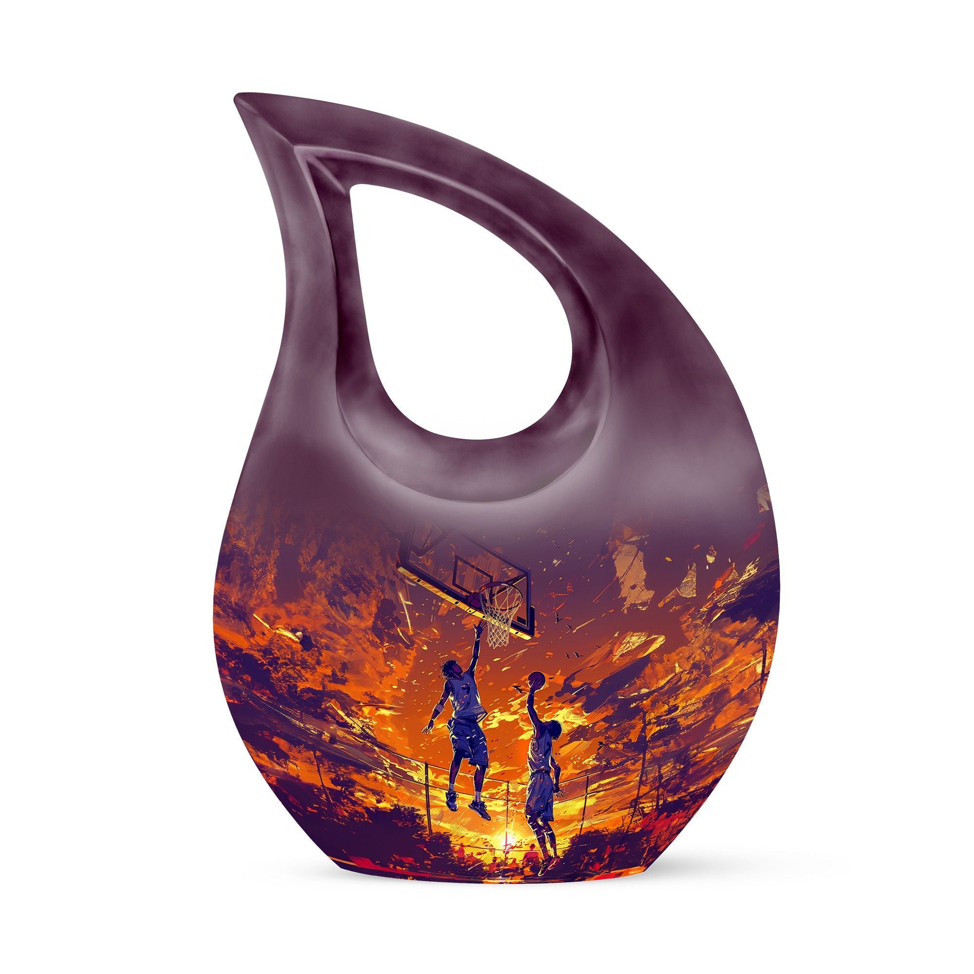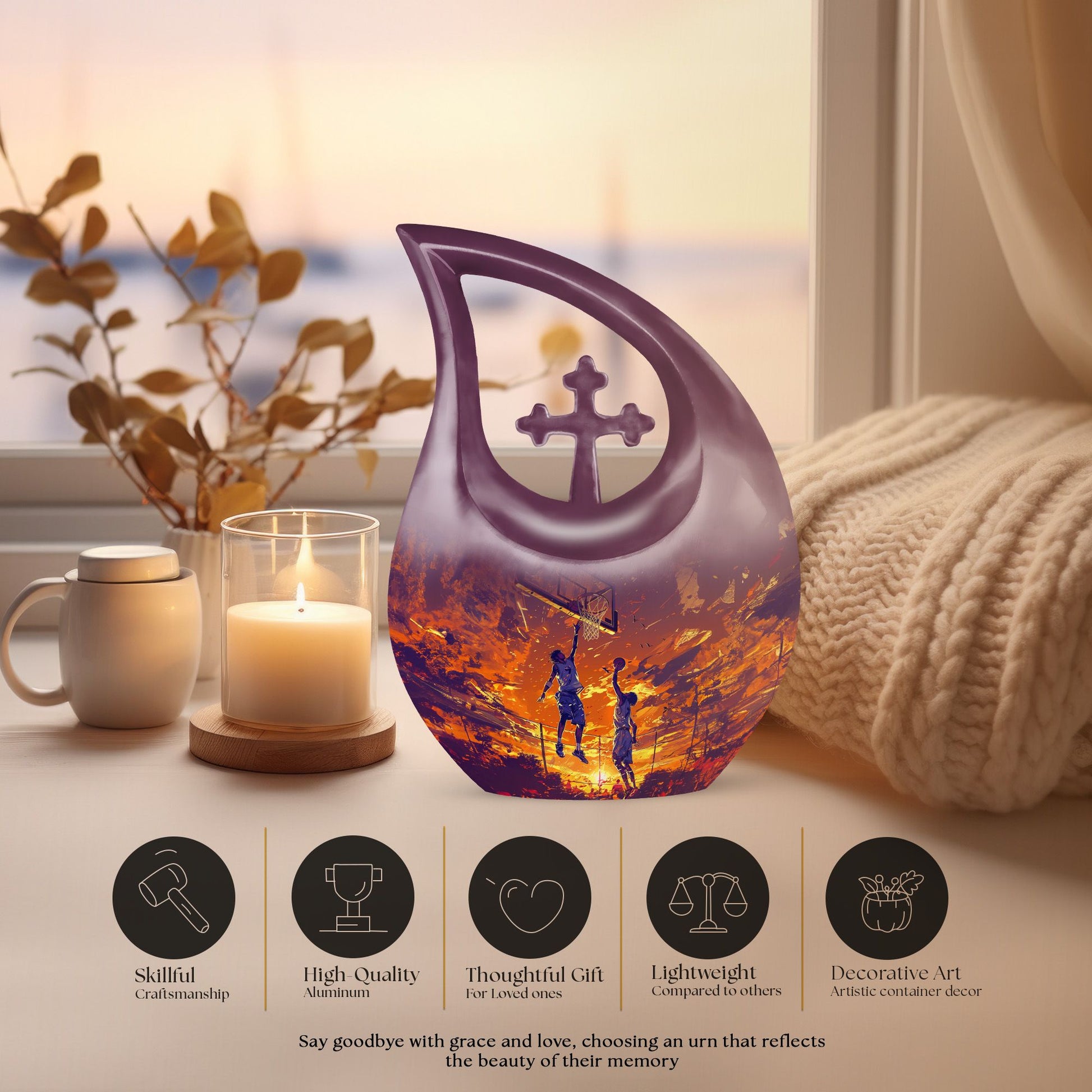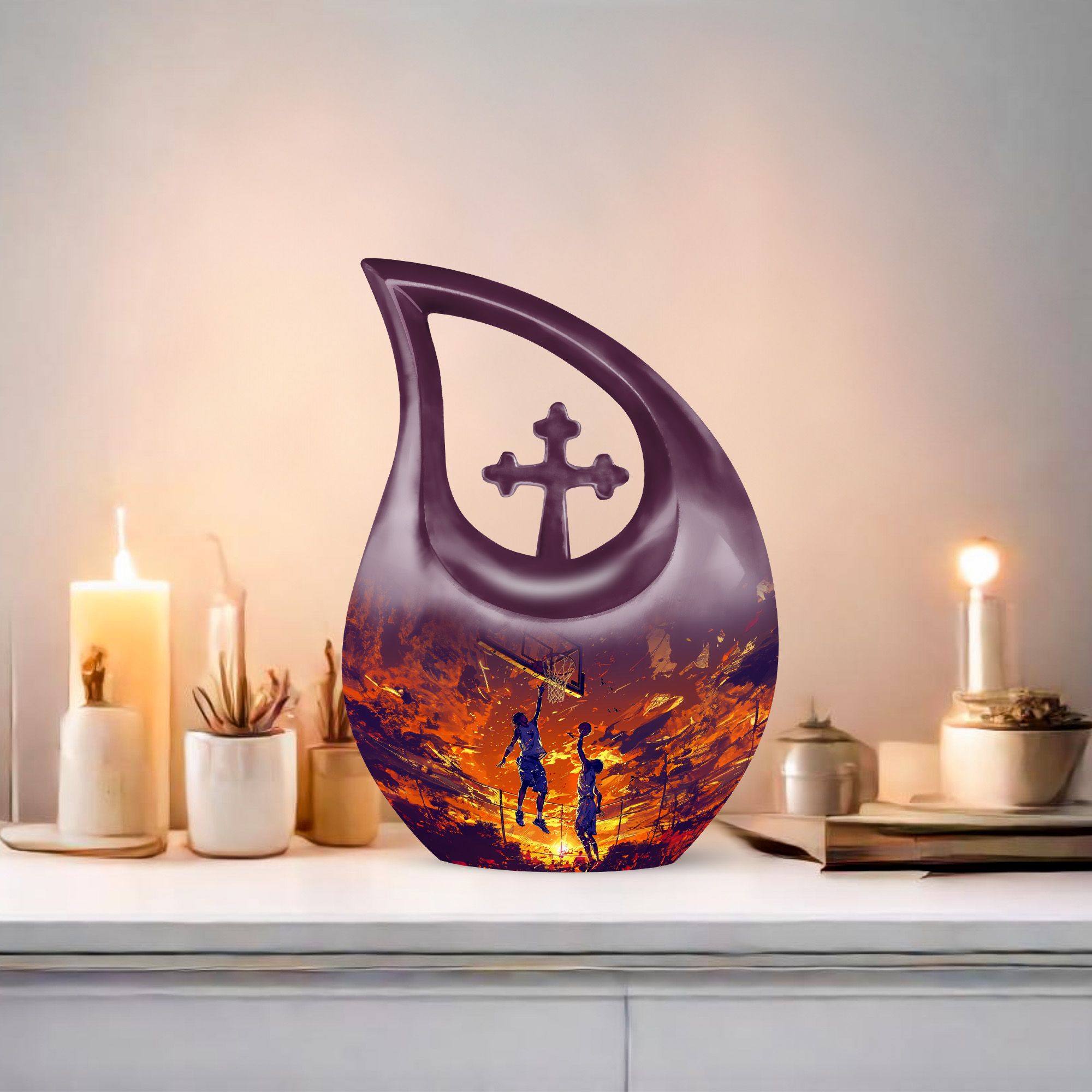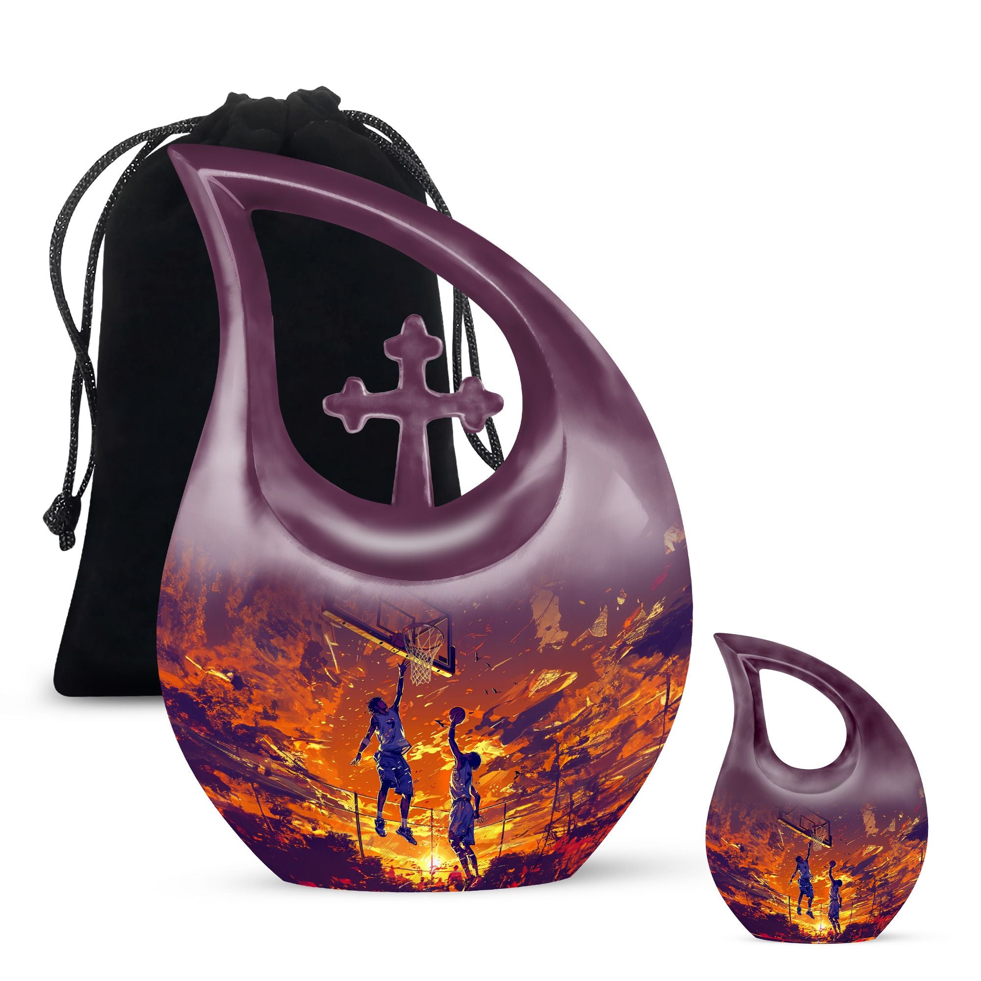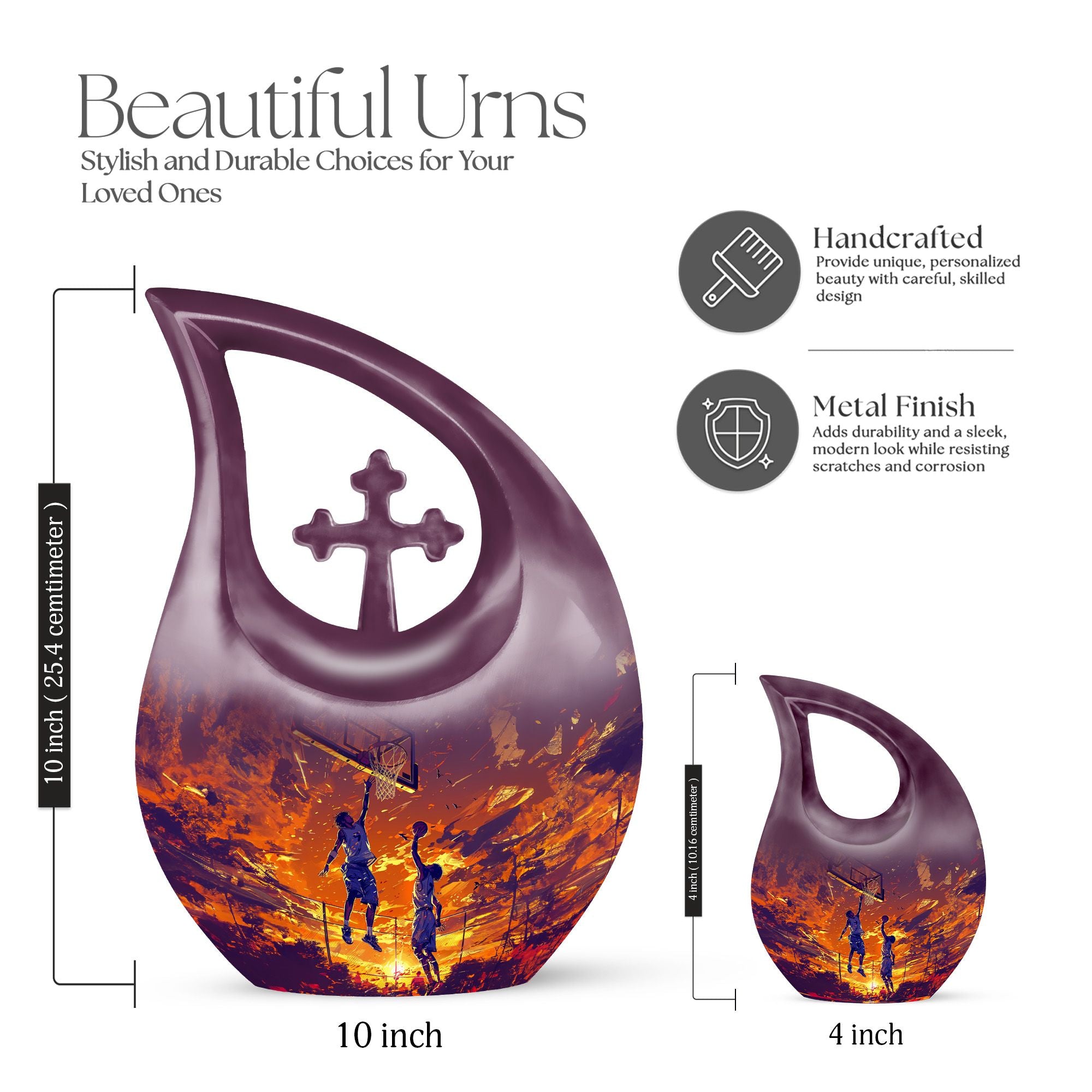 Honoring a departed loved one can be challenging yet essential; our 10-inch Basketball Urn provides a beautiful blend of sentiment, individuality, and passion for all basketball enthusiasts. Expertly handcrafted from durable aluminium material, this urn weighs 3.3 pounds, displaying a unique yet poignant 'Cross Drop' design. The urn's generous capacity allows for the containment of 200 cubic inches of ashes, reflecting a thoughtful acknowledgement of an individual's earthly journey. Each urn comes with a velvety pouch, providing a respectful containment of the ashes. Add a personal touch and cement the memories of your loved ones by engraving their names on the urn. Words such as 'Memorial Urns For Human Ashes', 'Personal Urns', 'Customized Urns For Ashes For Adults', and 'Unique Urns For Dad' make this urn an ideal option for seniors looking for distinct and delicately crafted memorial ceremony supplies. Note: This is an extra large urn, distinguishing it from other urns in its category in terms of size and stature.