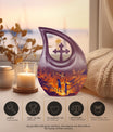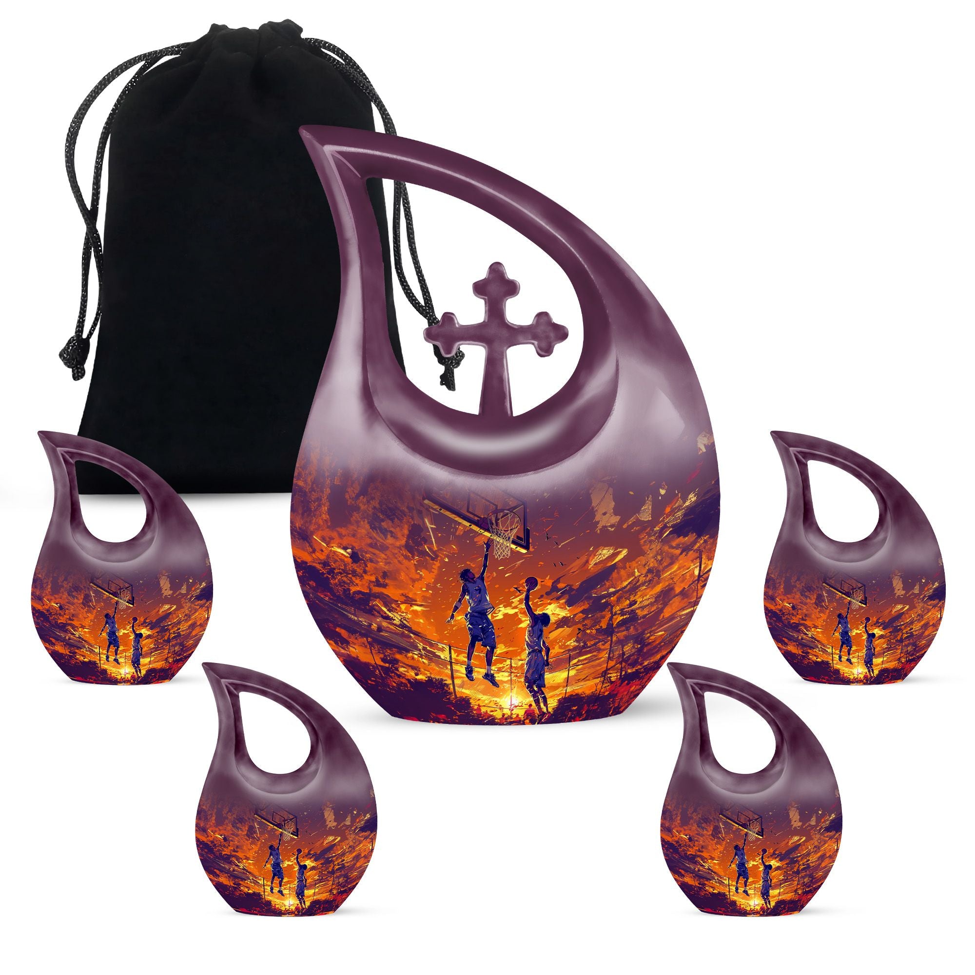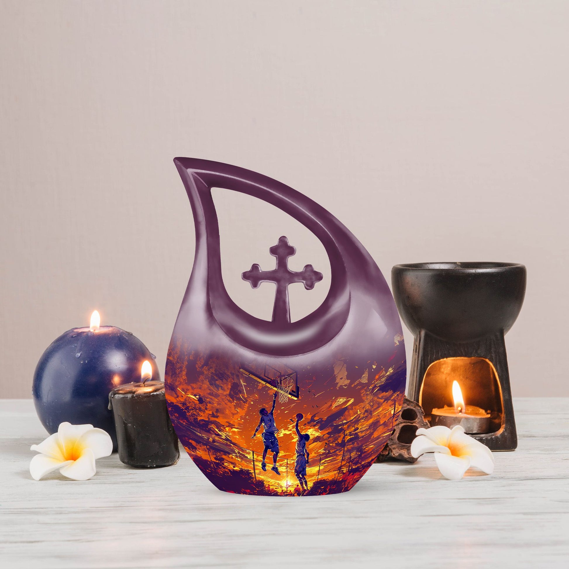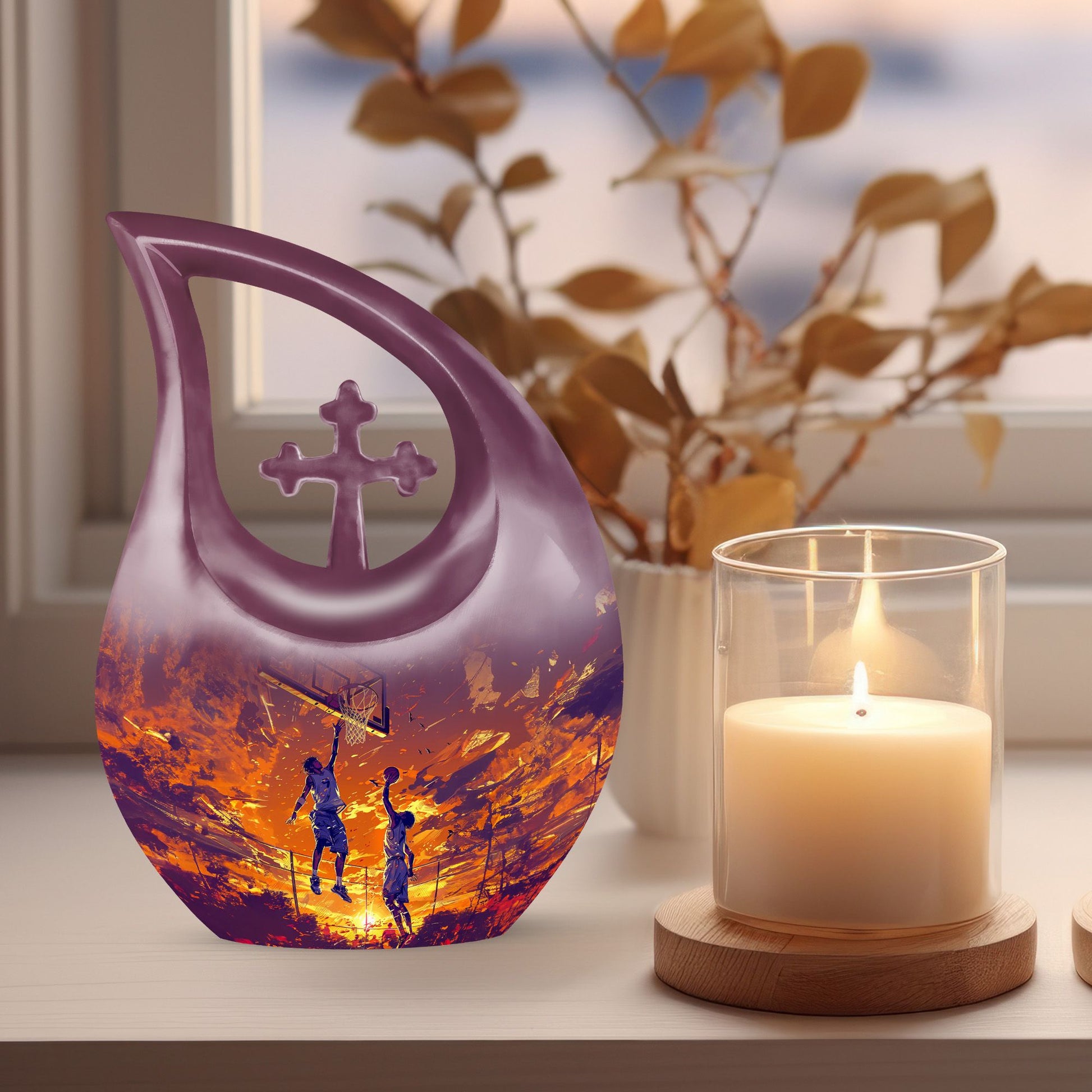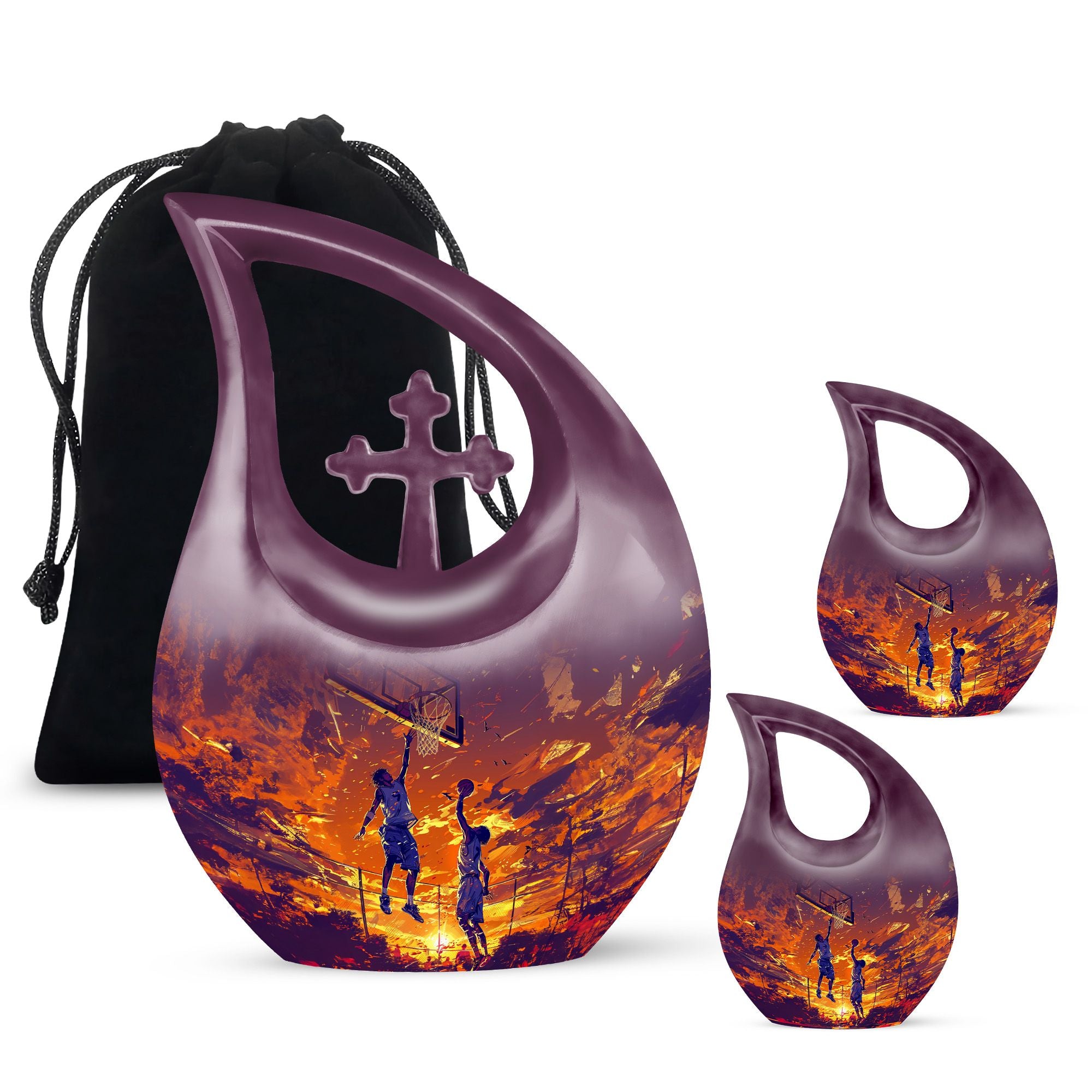 Honoring a departed loved one can be challenging yet essential; our 10-inch Basketball Urn provides a beautiful blend of sentiment, individuality, and passion for all basketball enthusiasts. Expertly handcrafted from durable aluminium material, this urn weighs 3.3 pounds, displaying a unique yet poignant 'Cross Drop' design. The urn's generous capacity allows for the containment of 200 cubic inches of ashes, reflecting a thoughtful acknowledgement of an individual's earthly journey. Each urn comes with a velvety pouch, providing a respectful containment of the ashes. Add a personal touch and cement the memories of your loved ones by engraving their names on the urn. Words such as 'Memorial Urns For Human Ashes', 'Personal Urns', 'Customized Urns For Ashes For Adults', and 'Unique Urns For Dad' make this urn an ideal option for seniors looking for distinct and delicately crafted memorial ceremony supplies. Note: This is an extra large urn, distinguishing it from other urns in its category in terms of size and stature.