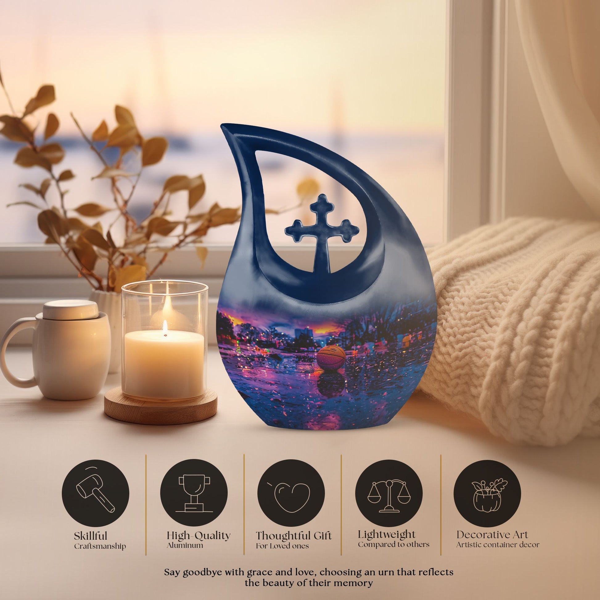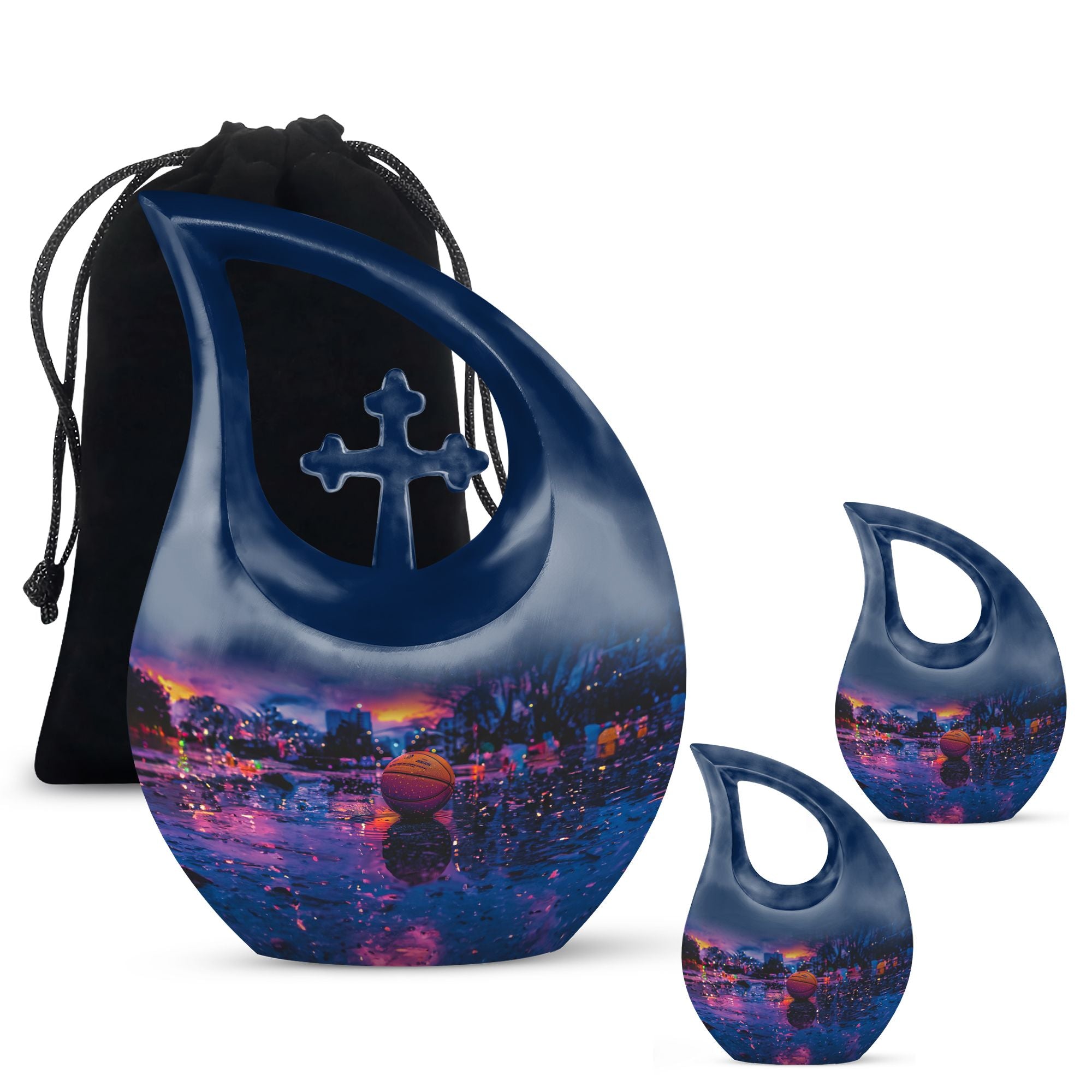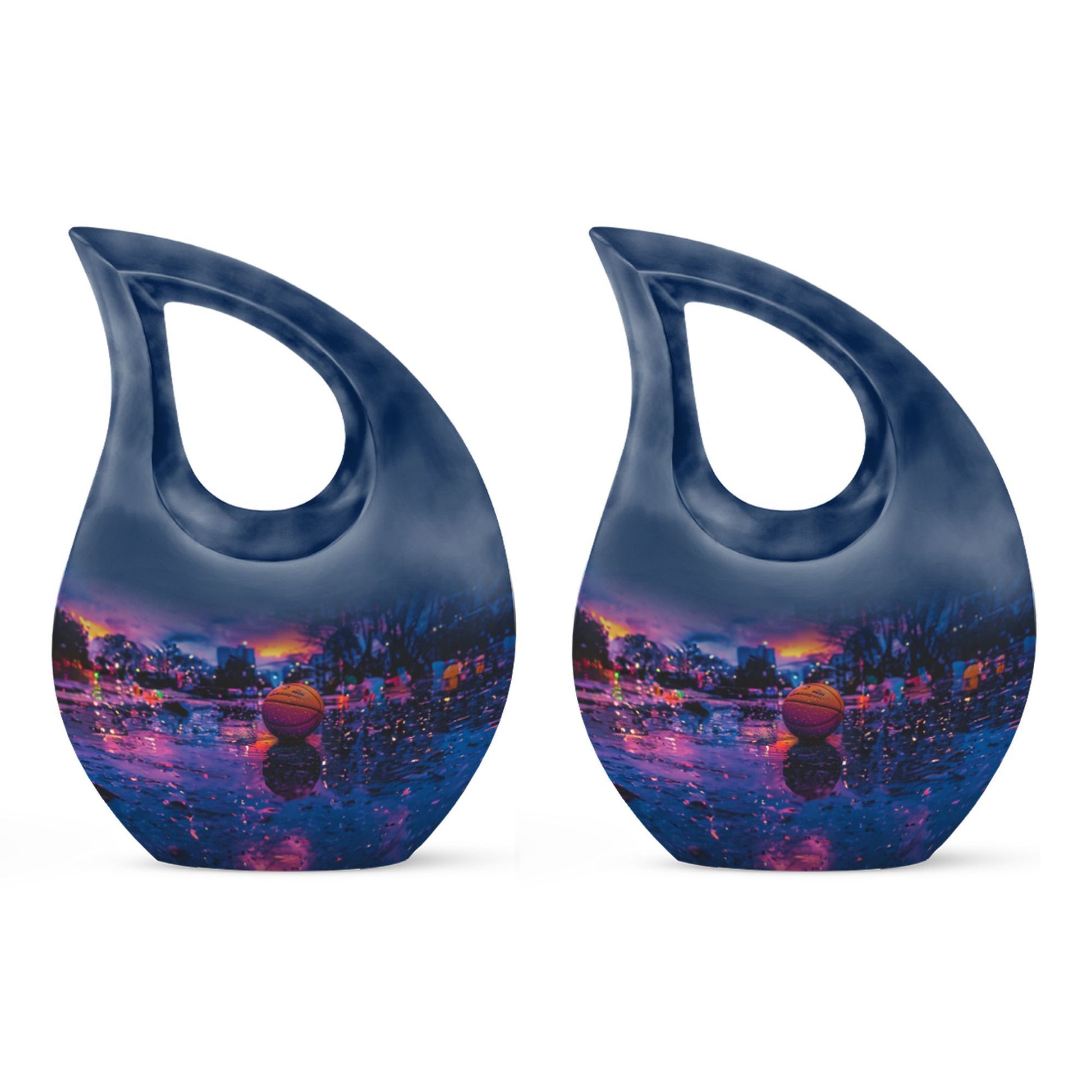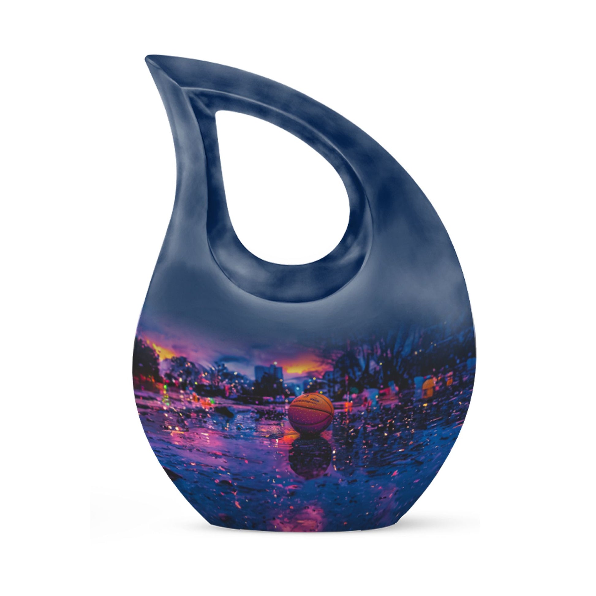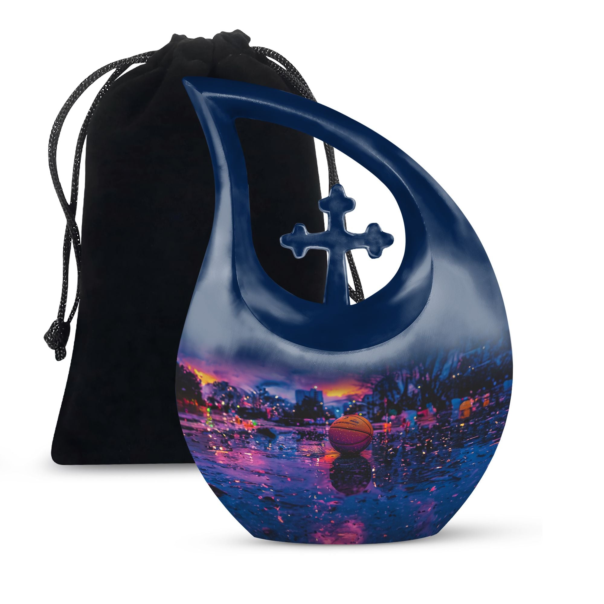 Looking for a unique way to memorialize your loved one who was a devout basketball enthusiast? Our notable 'Basketball Urn' is an exceptional choice. Small yet dignified, this aluminum urn measures 10 inches in height and can accommodate up to 200 cubic inches of cremation ashes. Our special 'Cross Drop' theme signifies divine solace and peace, making this quality urn a fitting tribute. The hefty weight of 3.3 pounds ensures stability and robustness, speaking to the everlasting bond you share. You can personalize this urn with engraved names, making it a more intimate and heartwarming keepsake. It arrives with a velvet pouch to securely hold the ashes, exuding a touch of elegance. Perfect for those in search of 'Keepsake Urns For Human Ashes' or 'Urns For Cremation Ashes'. Remember, it is not just an urn; it’s a regal dwelling for cherished memories that transcends time. Note: This soaring 'Basketball Urn' comes in a subtle shade of majestic purple, presenting an alternative for those seeking a ‘Purple Urn’ or even a 'Biodegradable Urn'.
